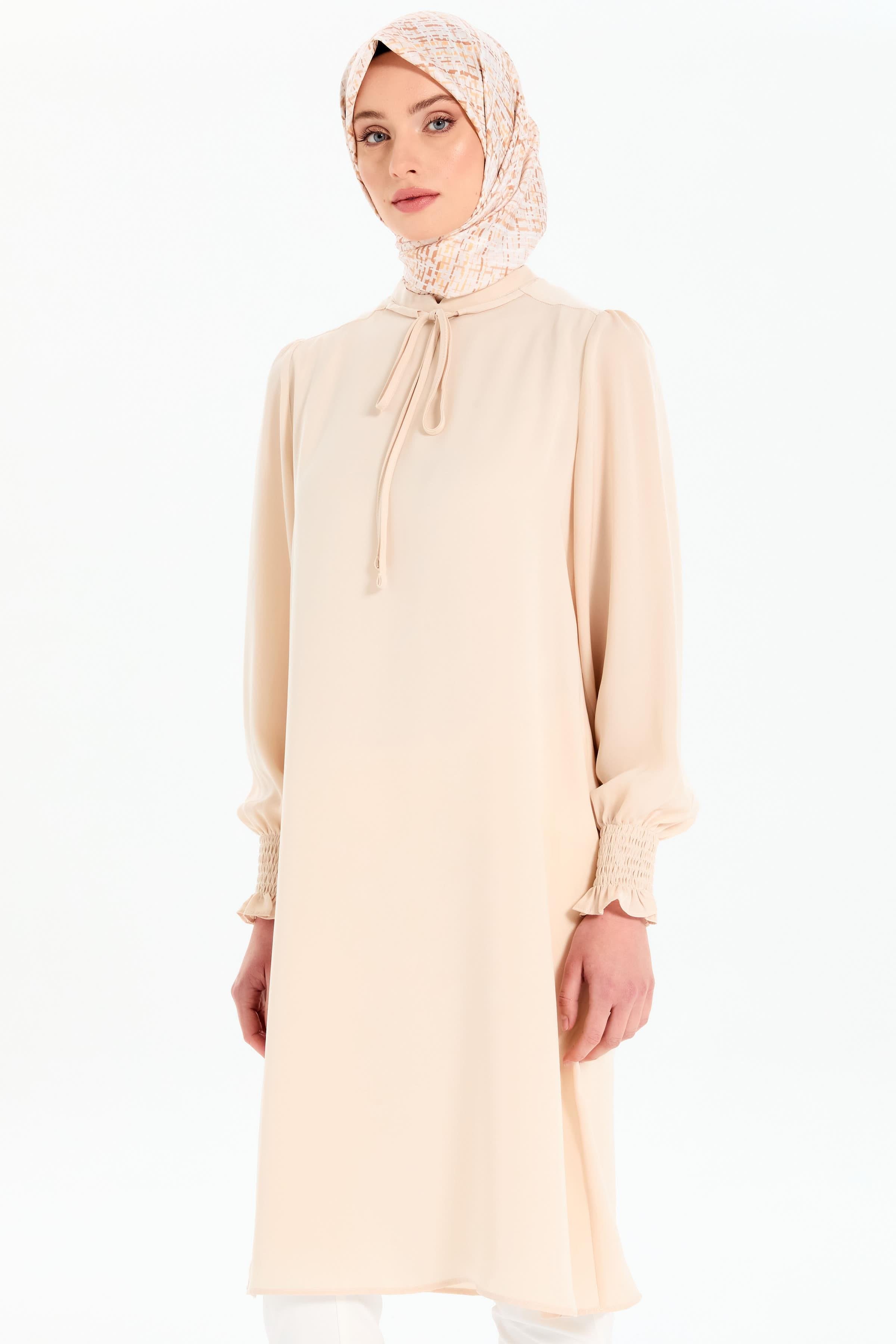 Yaka Bağcık Detaylı Kolları Lastikli Tunik - Bej