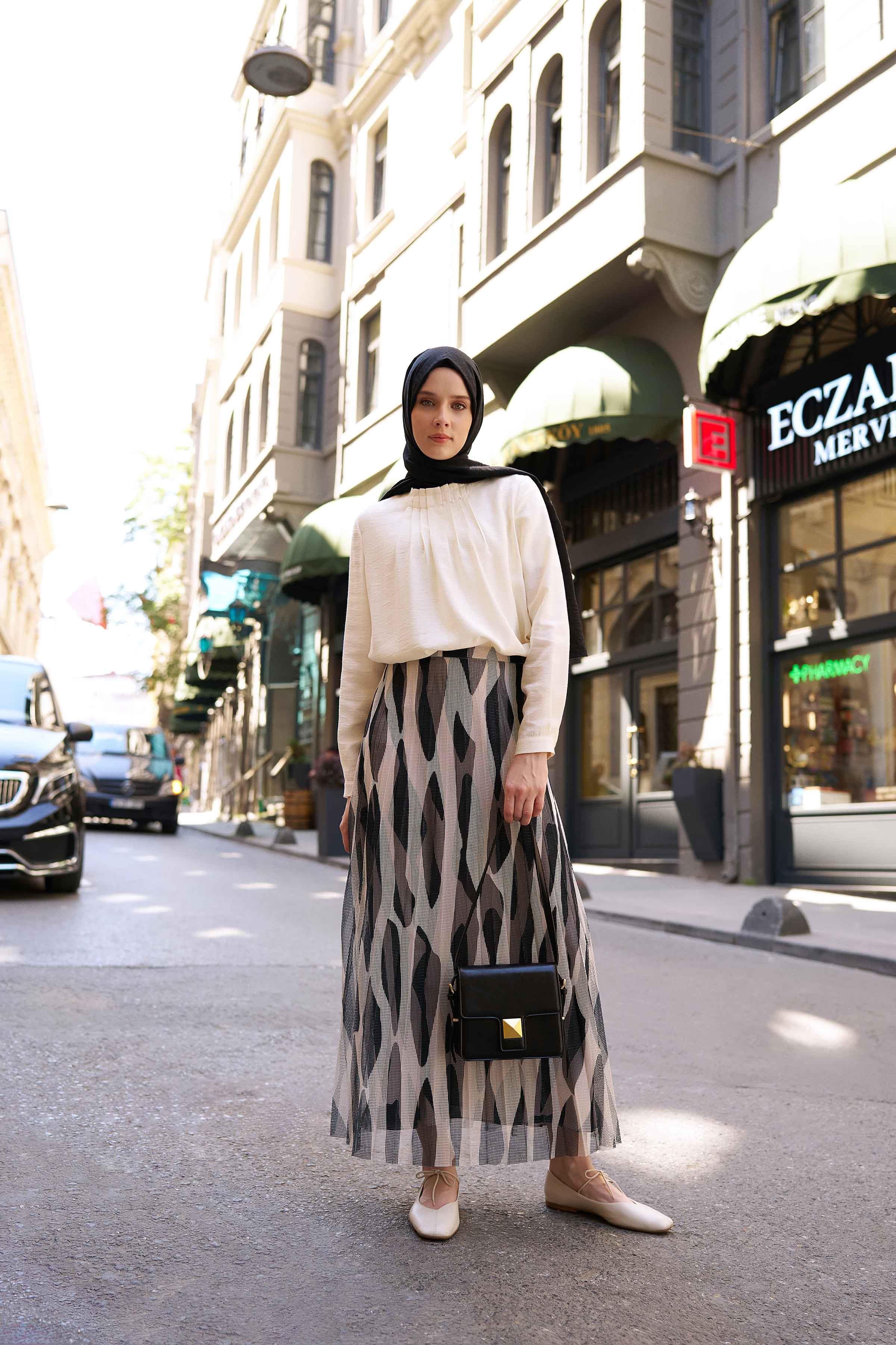 Yakadaki pileler, bluzun genel tasarımına zarif bir dokunuş katarken, boncuk işlemeleri ise lüks ve dikkat çekici bir görünüm sunar.