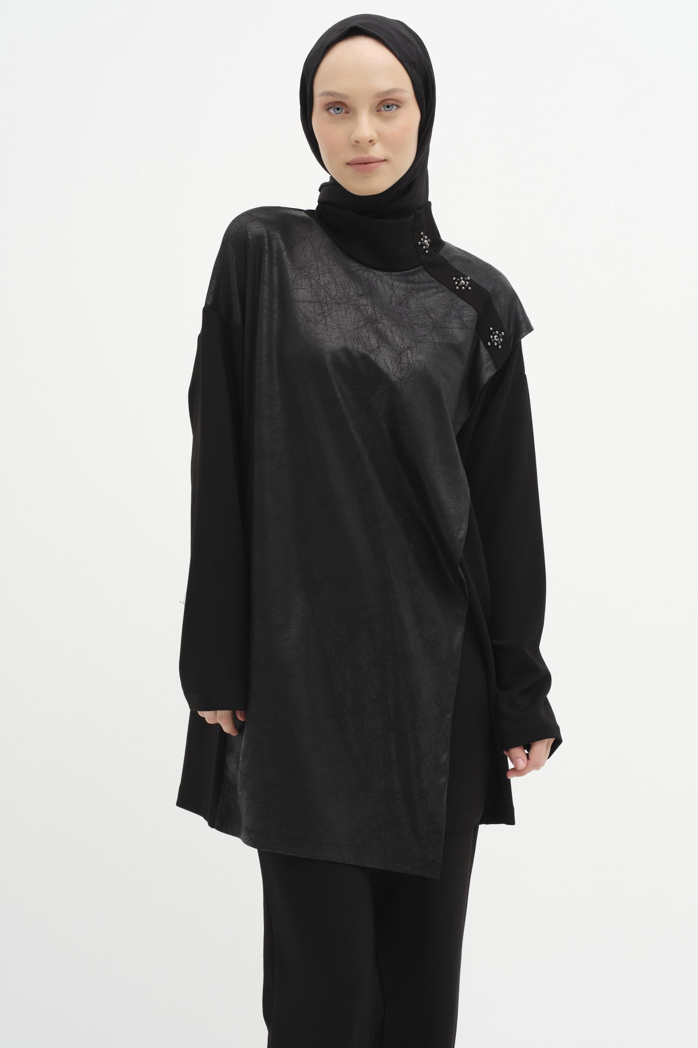 The stone details on the shoulders strikingly highlight the minimalist design of the tunic, while the embellishments offer a relaxed style. The soft knit fabric ensures all-day comfort.