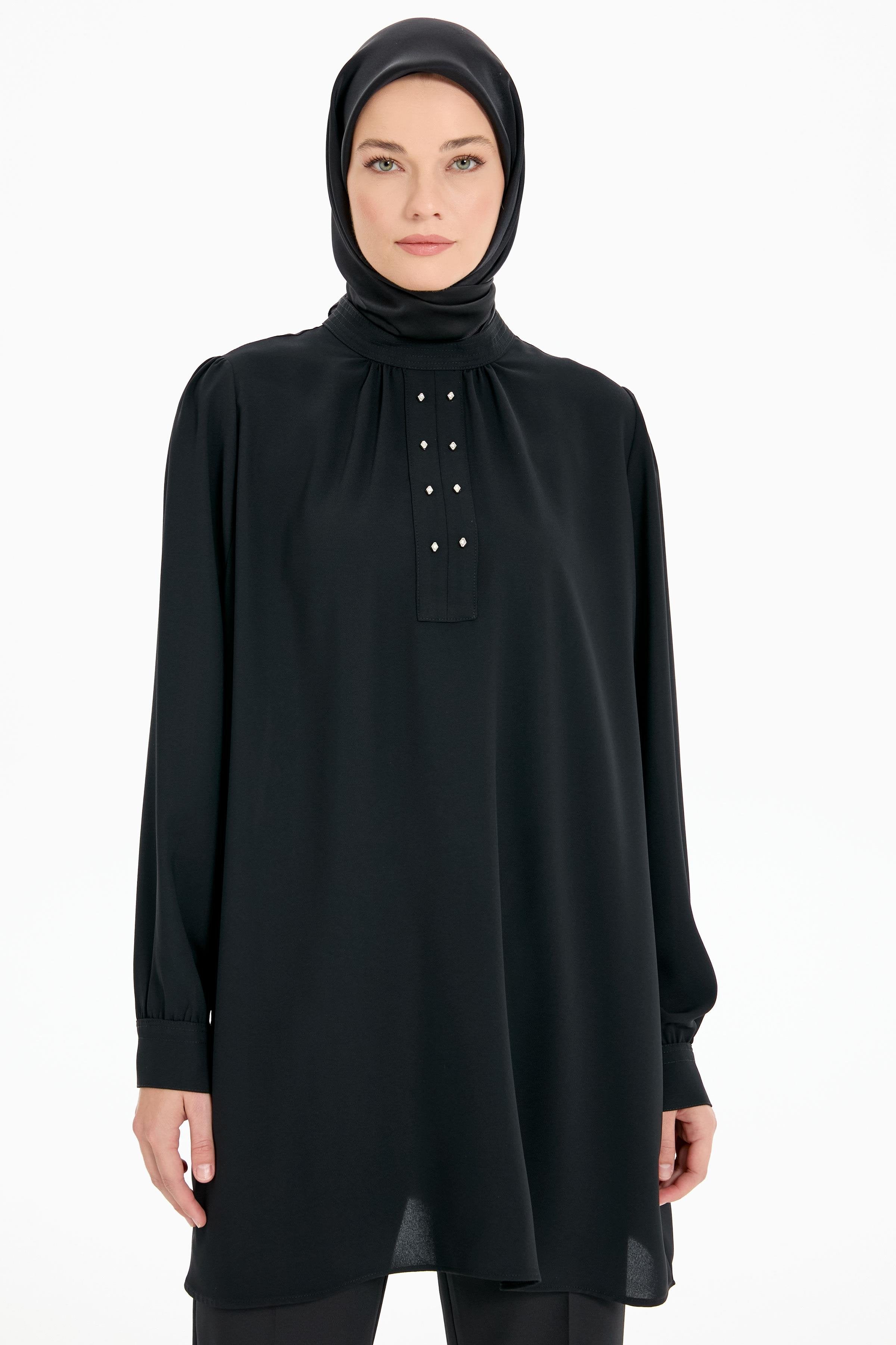 Büzgü Detaylı Yaka Dikişli Tunik - Siyah