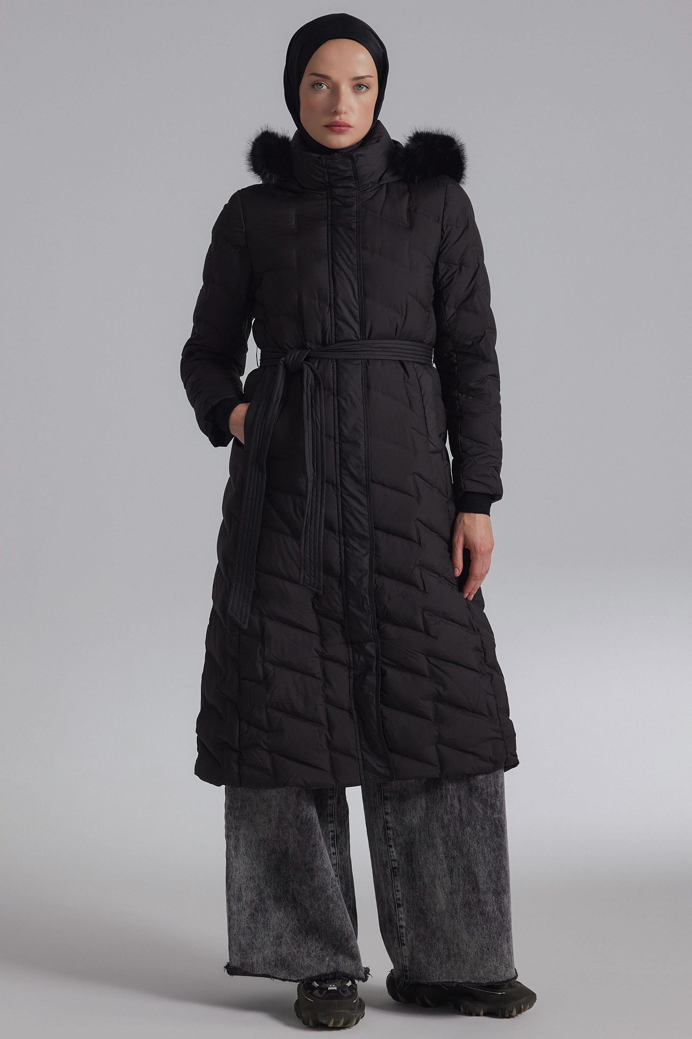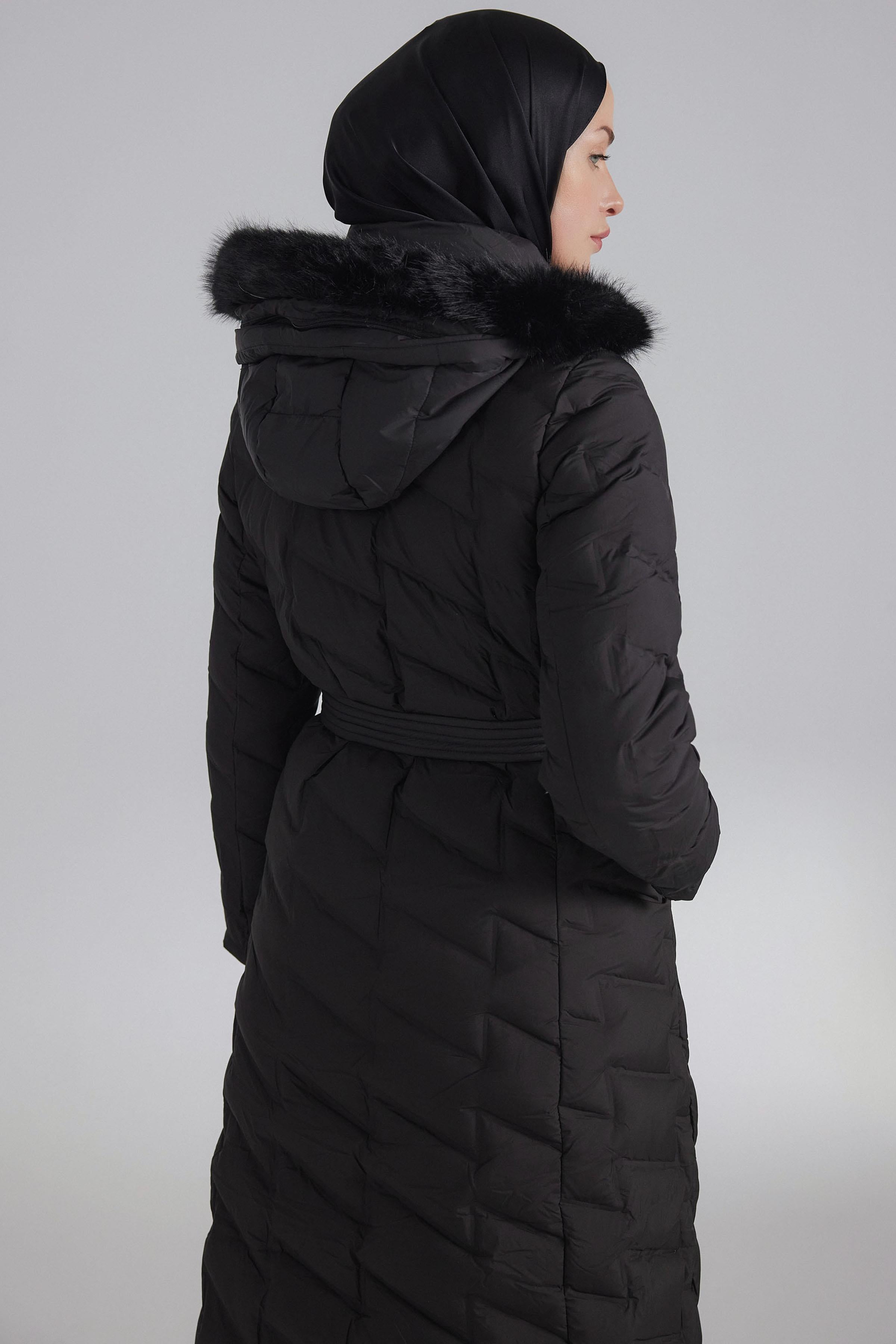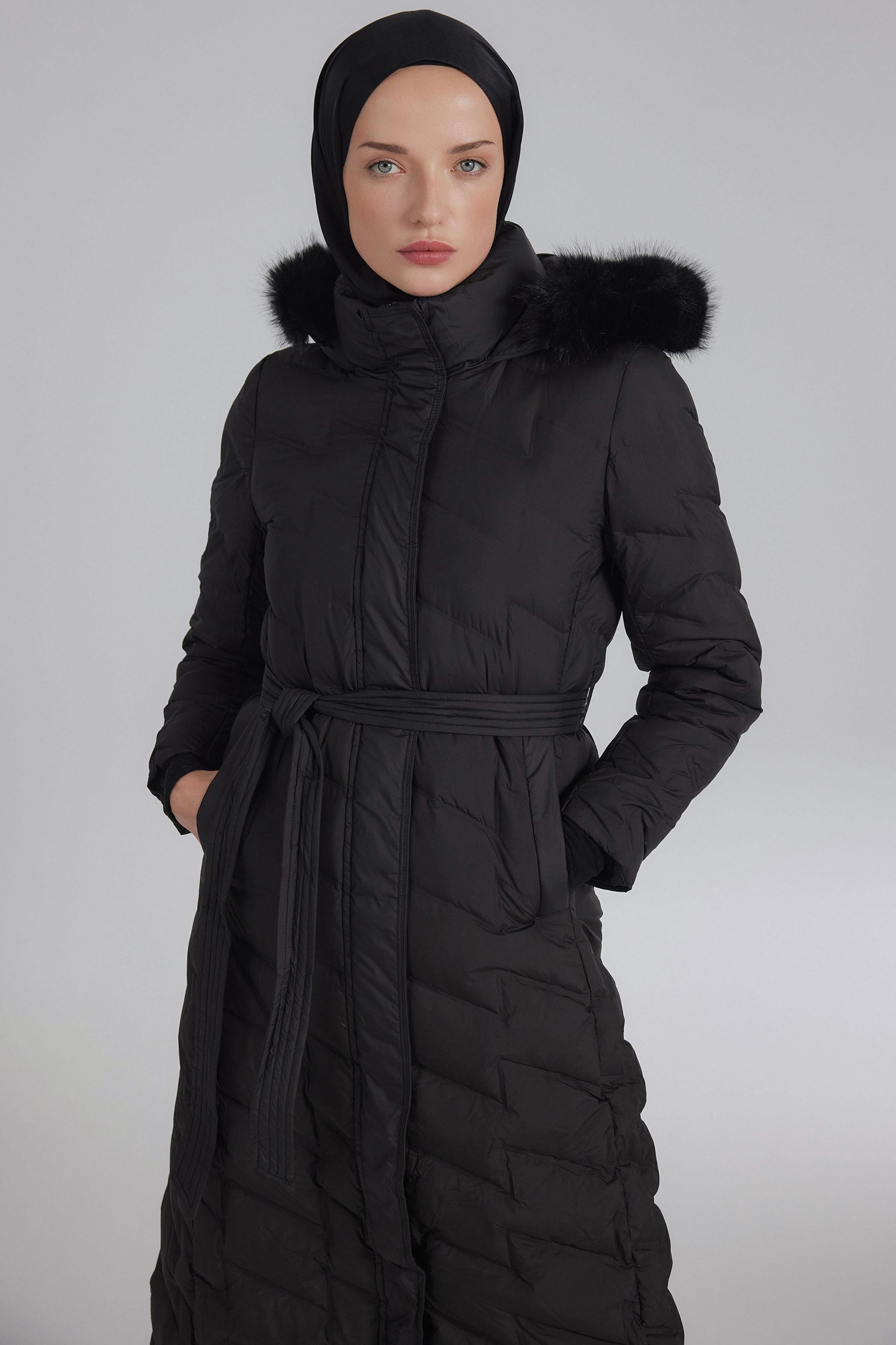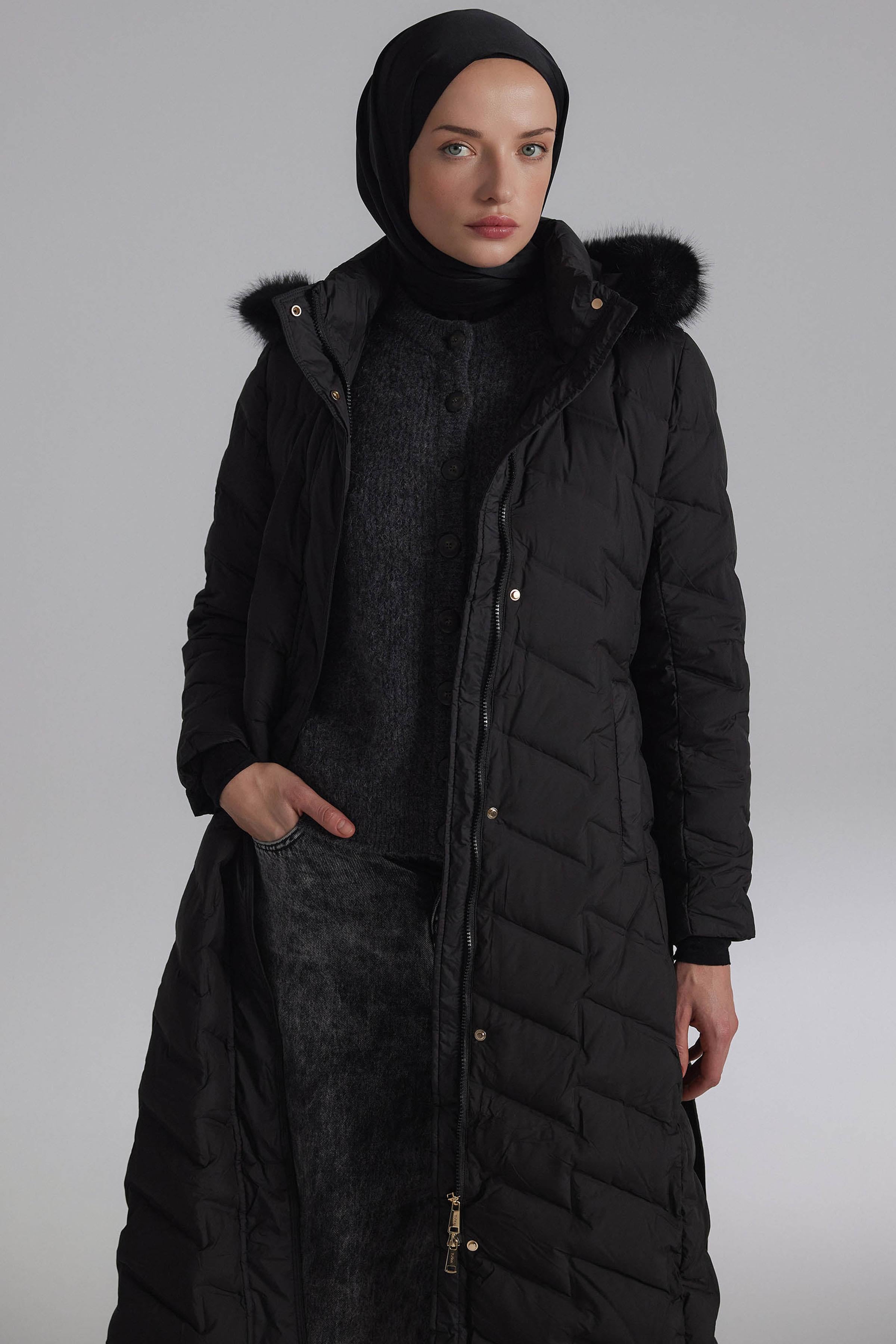 Blok Desenli Kaz Tüyü Kaban - Siyah