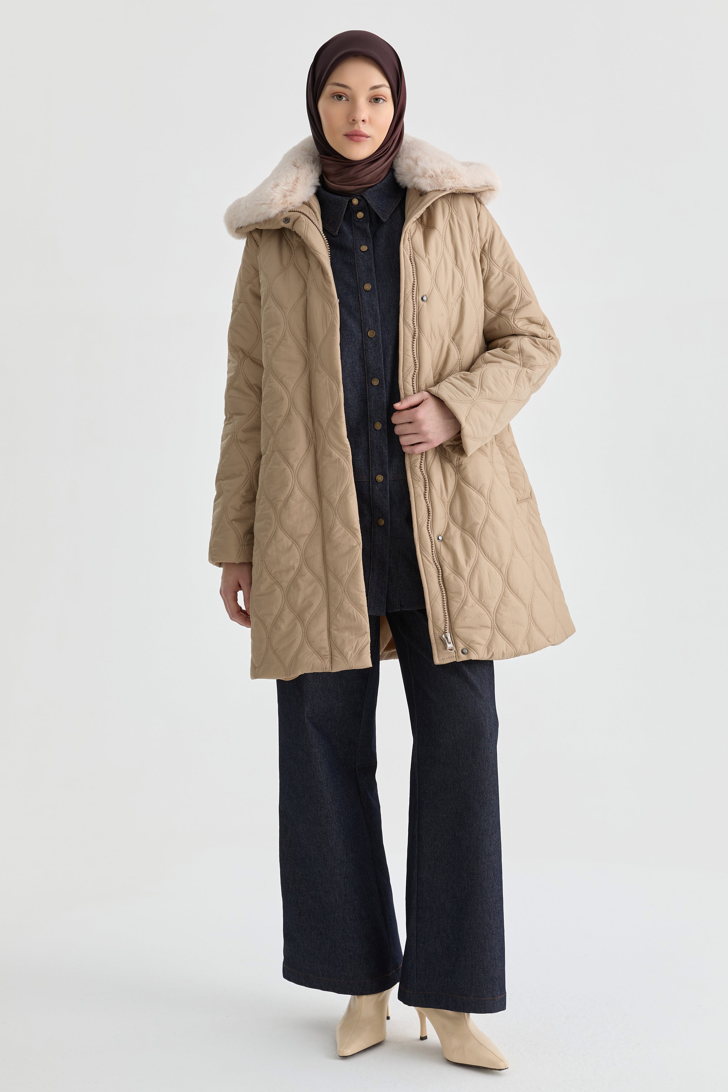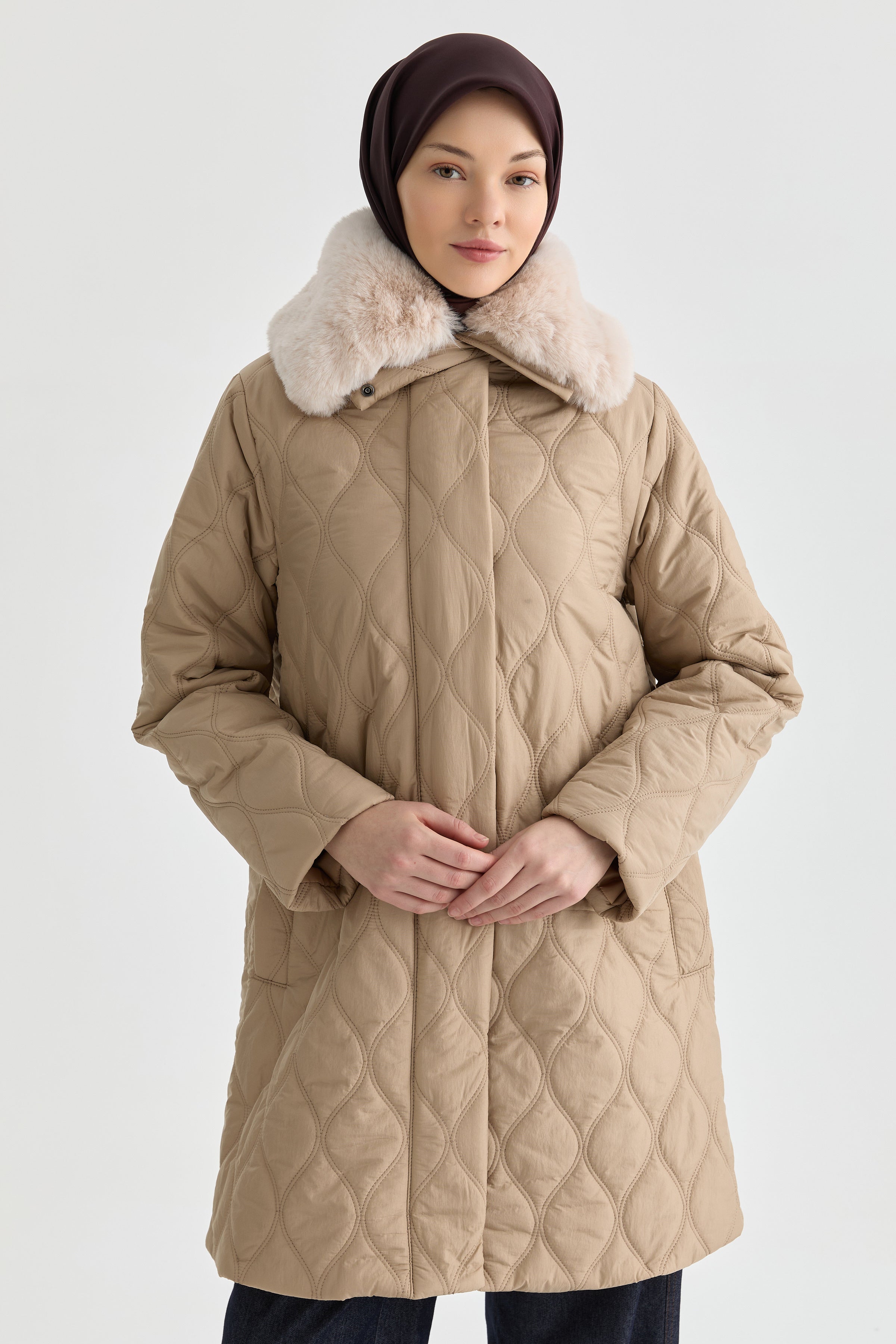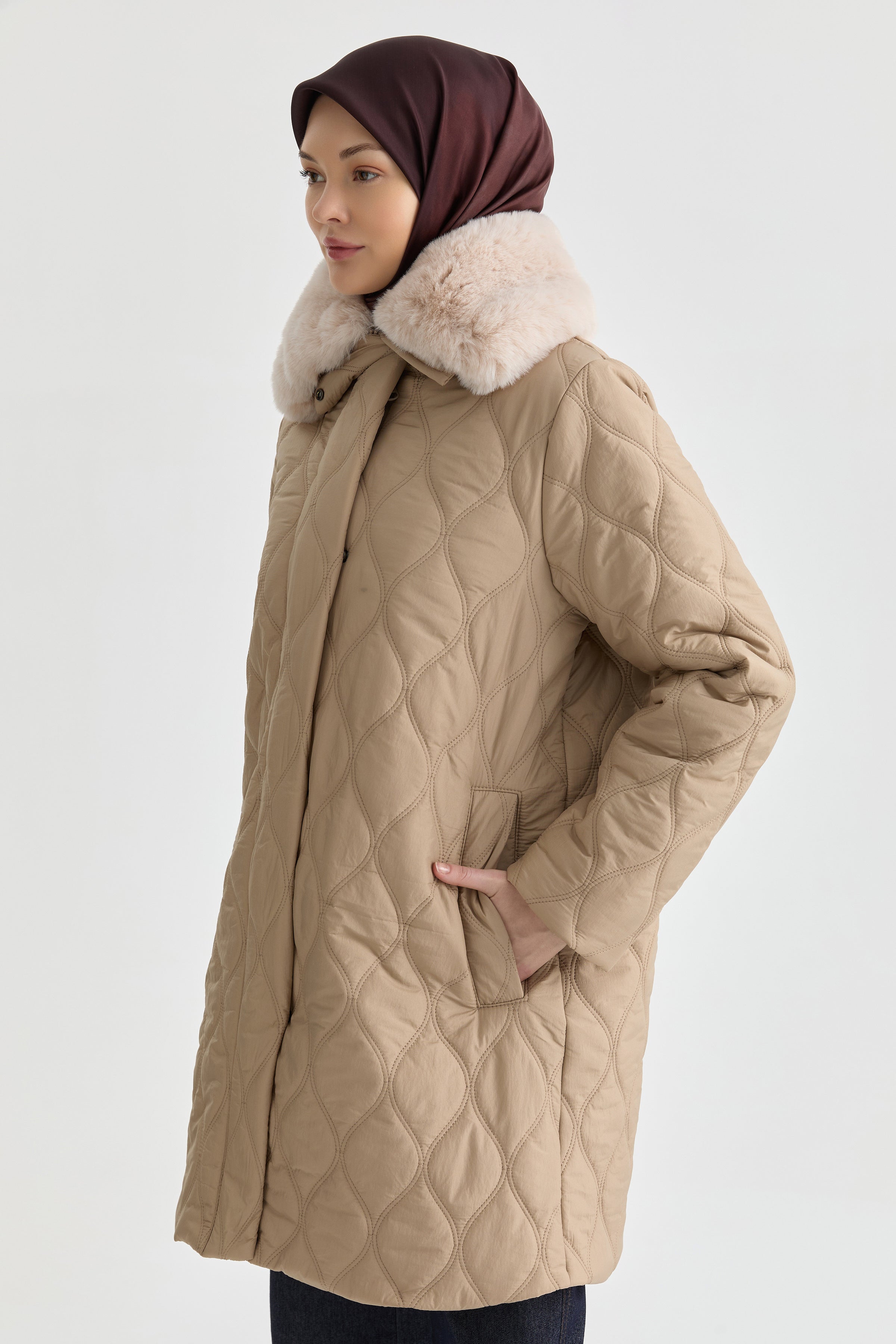 Yakası Kürk Detaylı Kaban - Taş