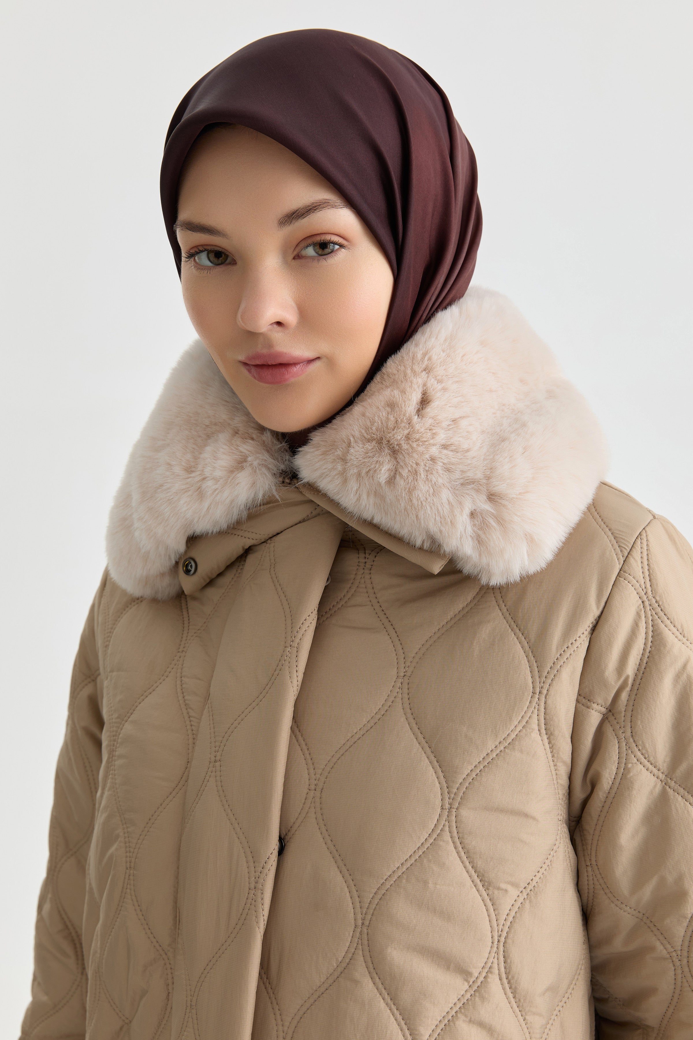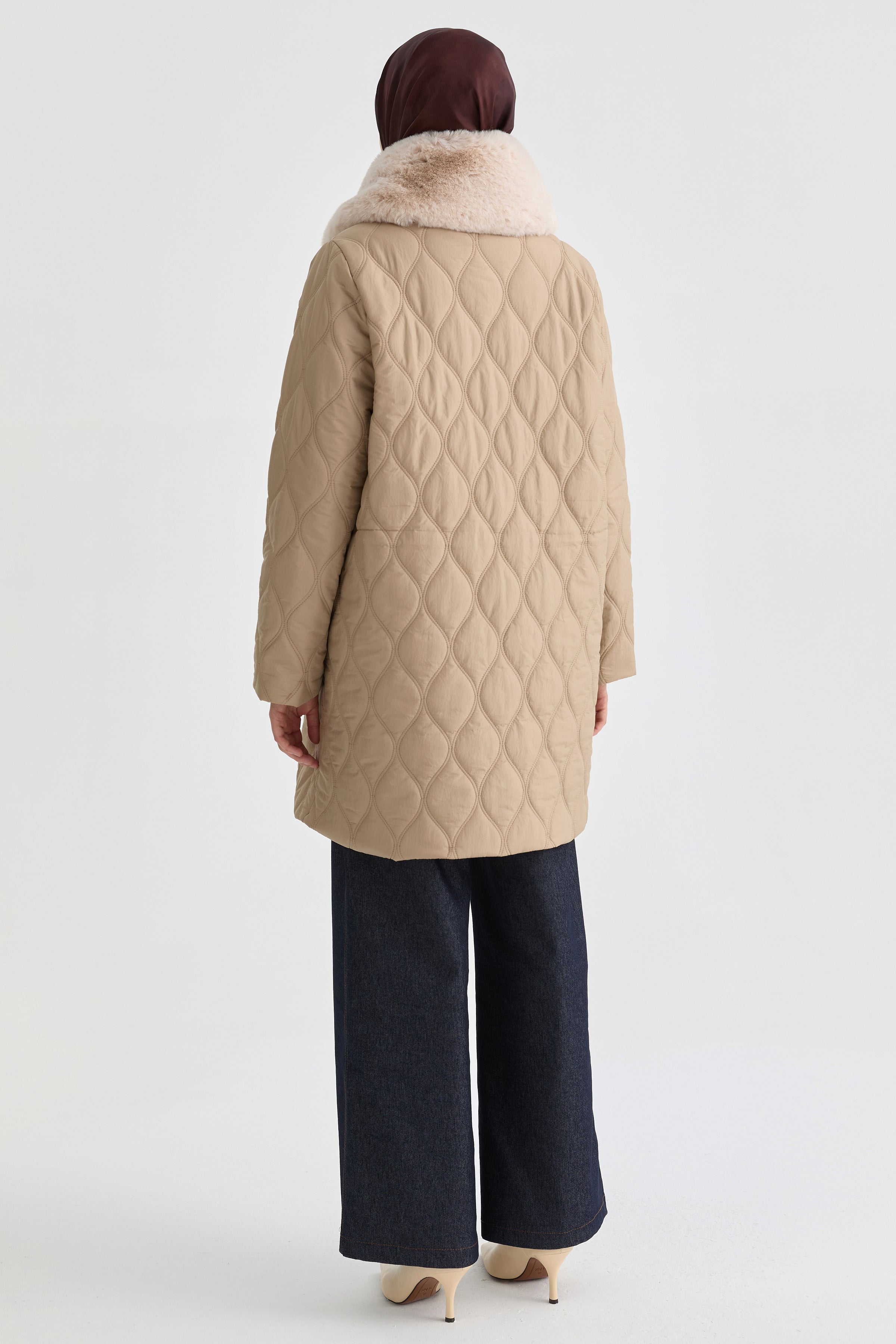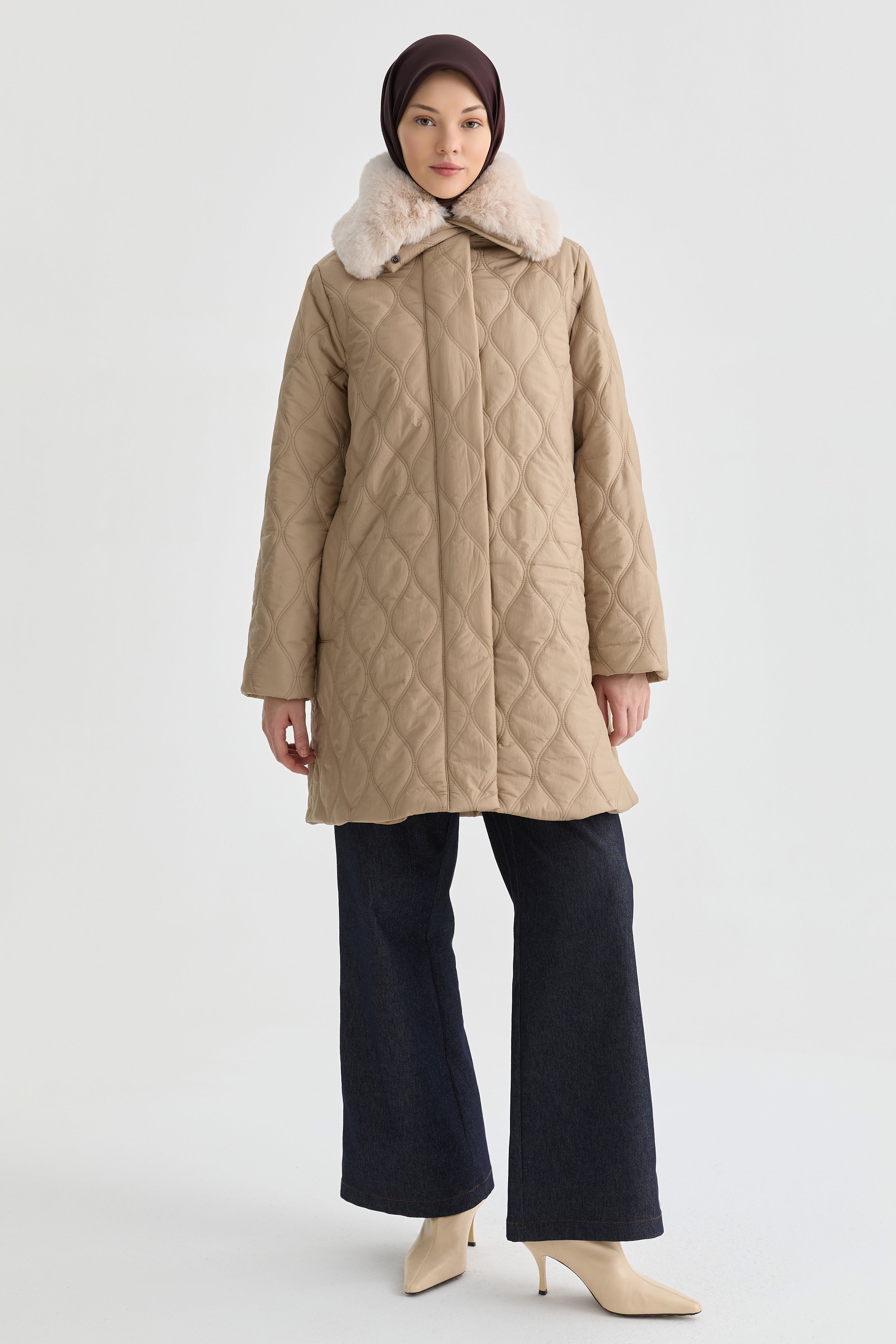 Yakası Kürk Detaylı Kaban - Taş