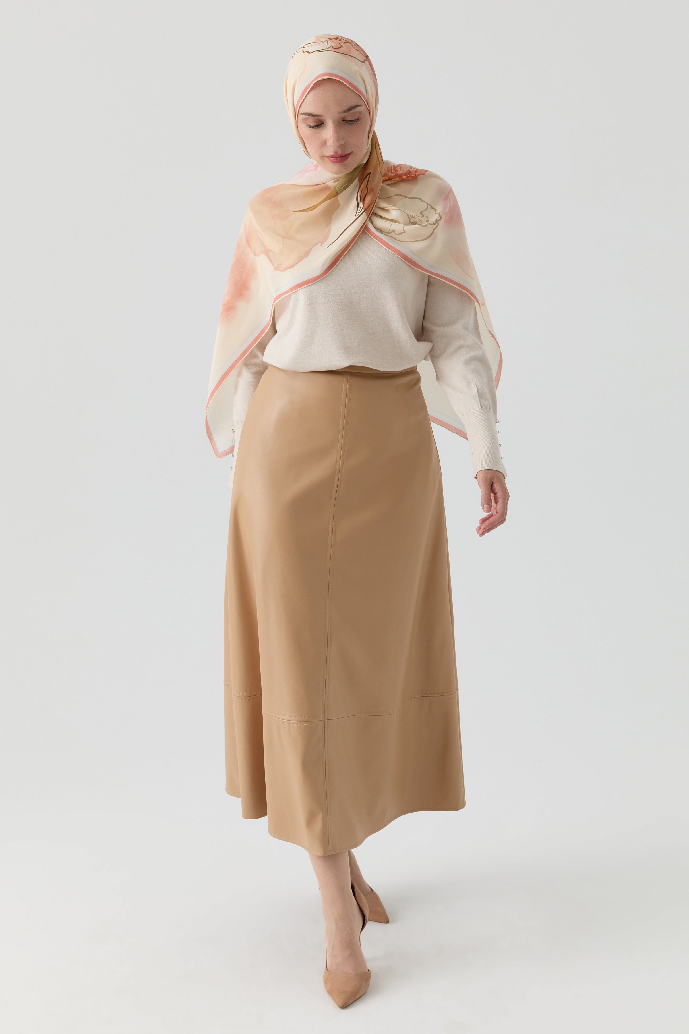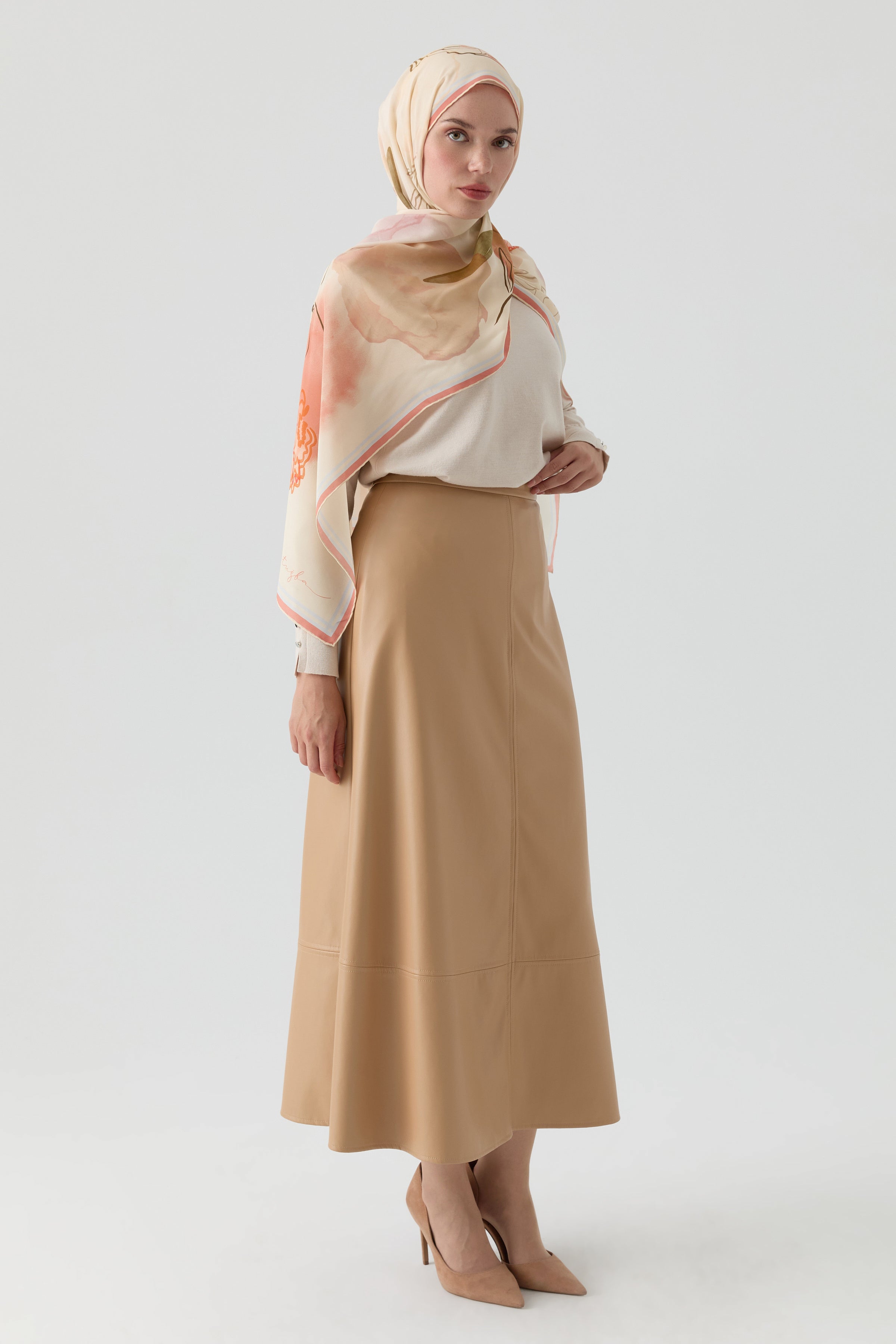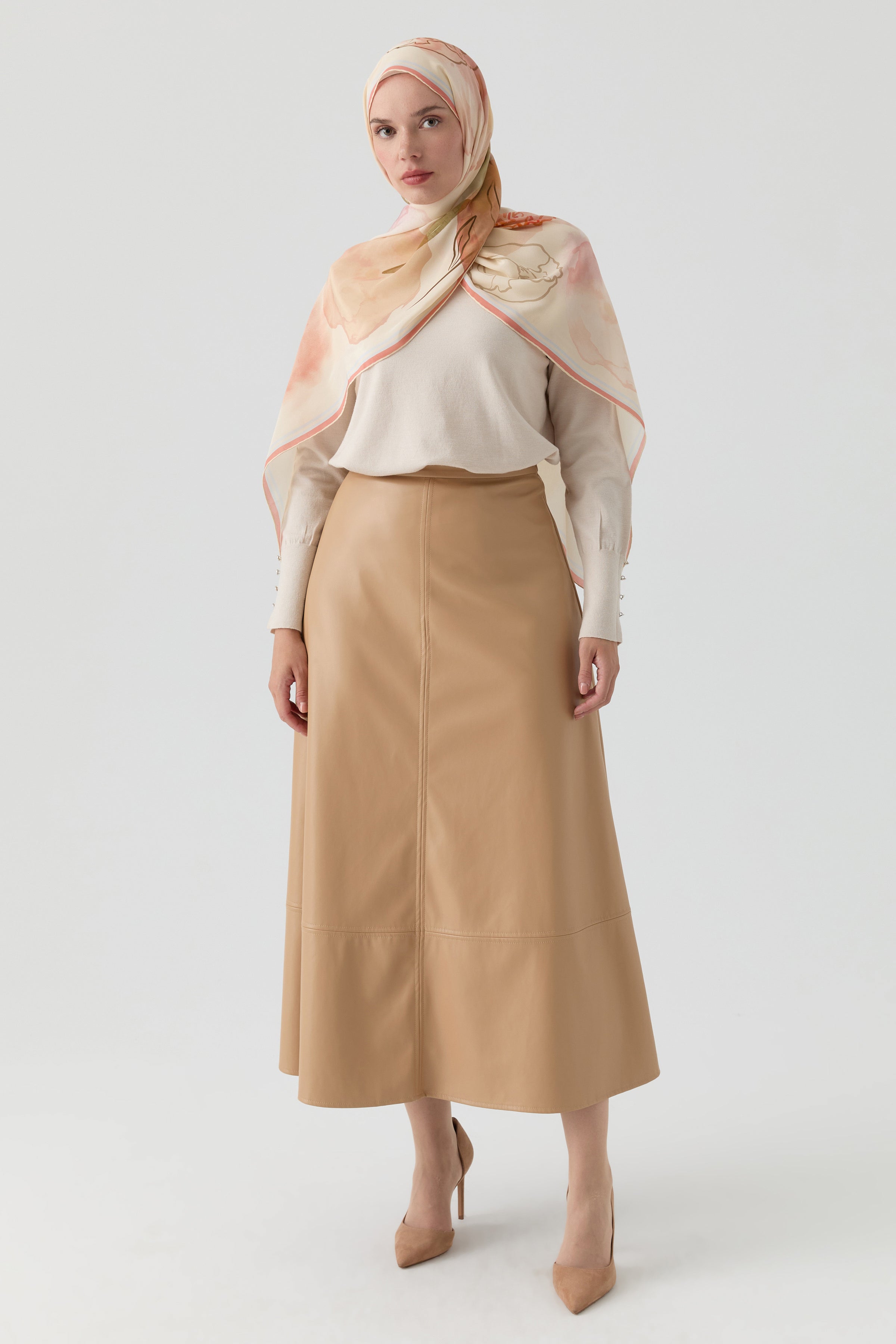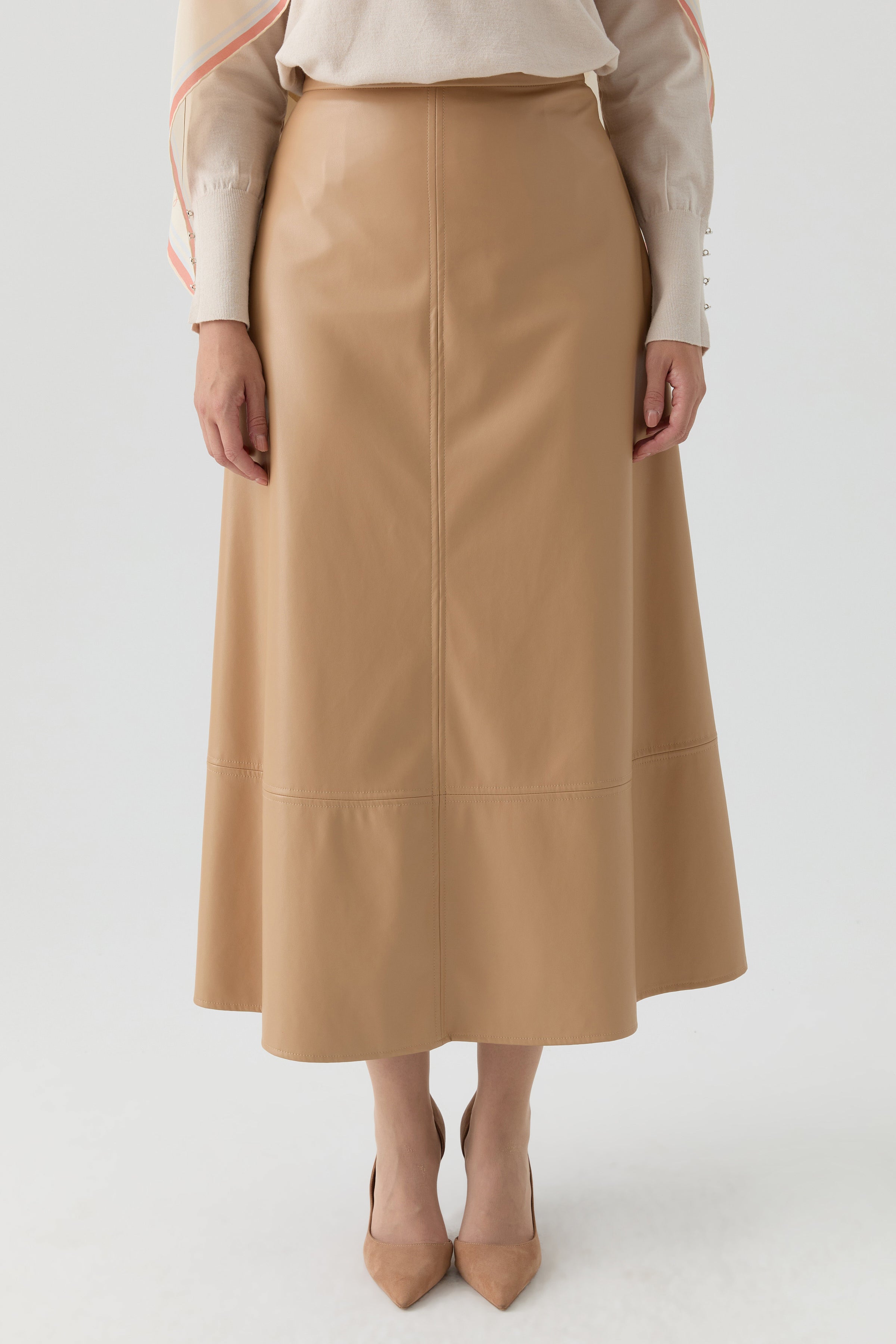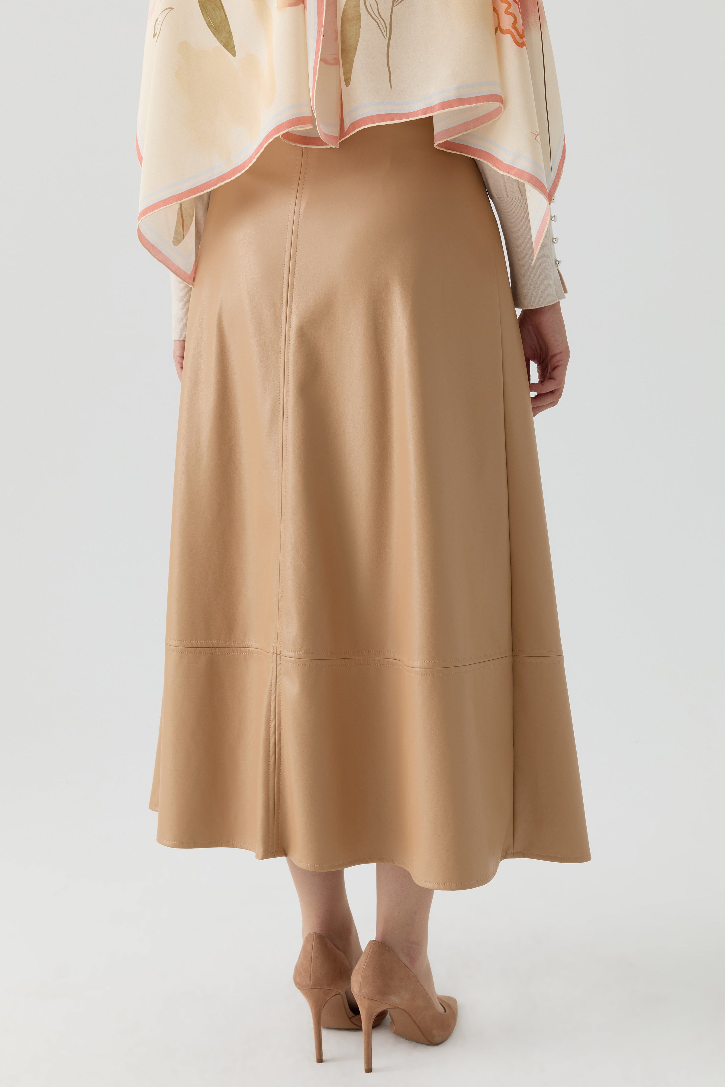 Kesik Detaylı Suni Deri Çan Etek - Bej