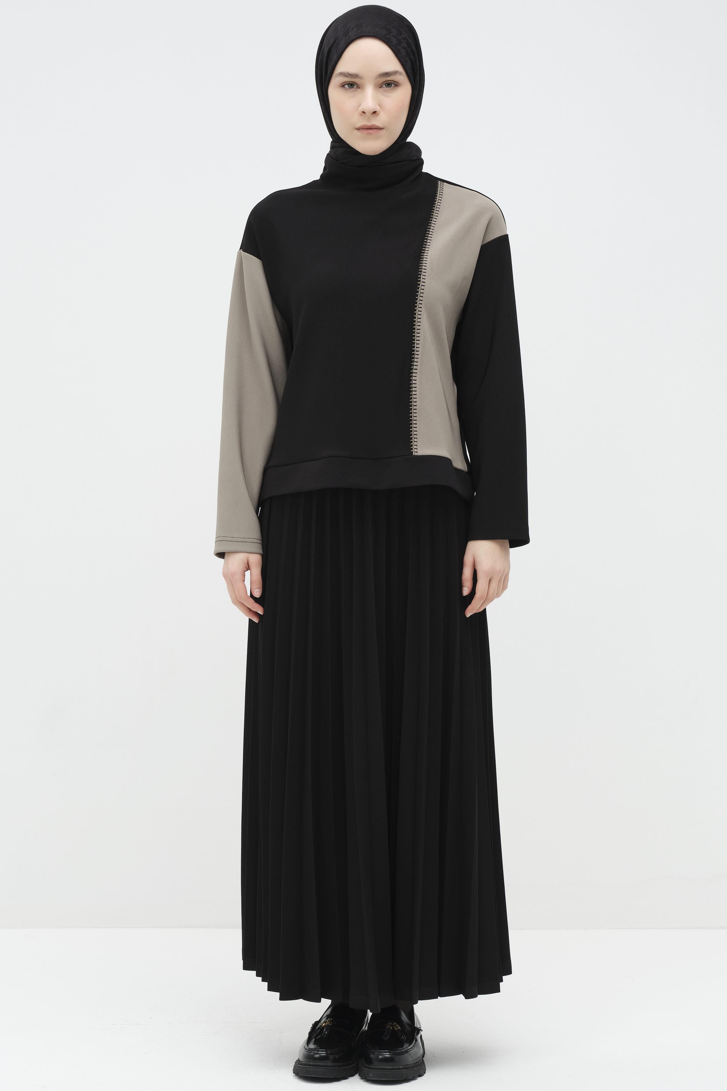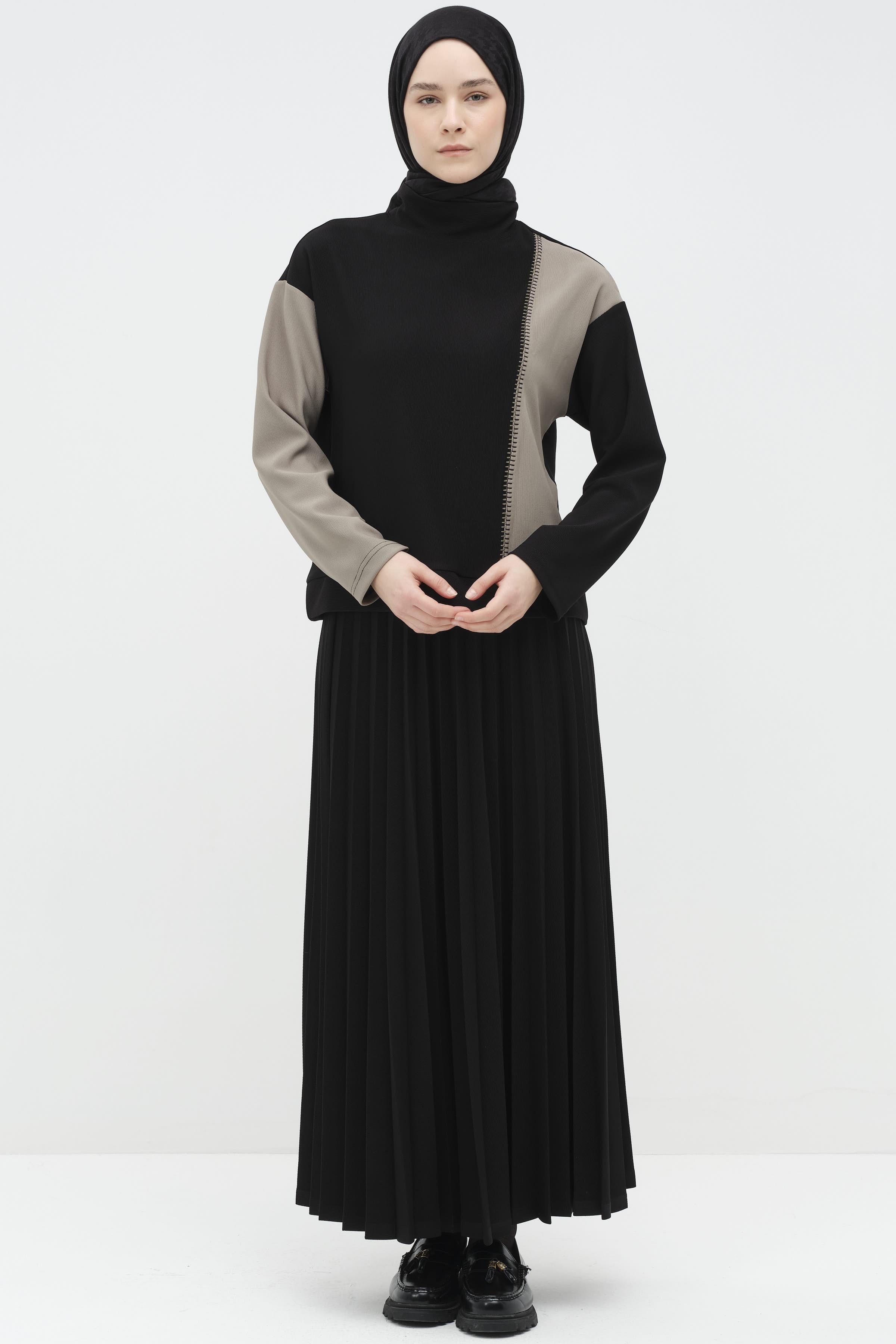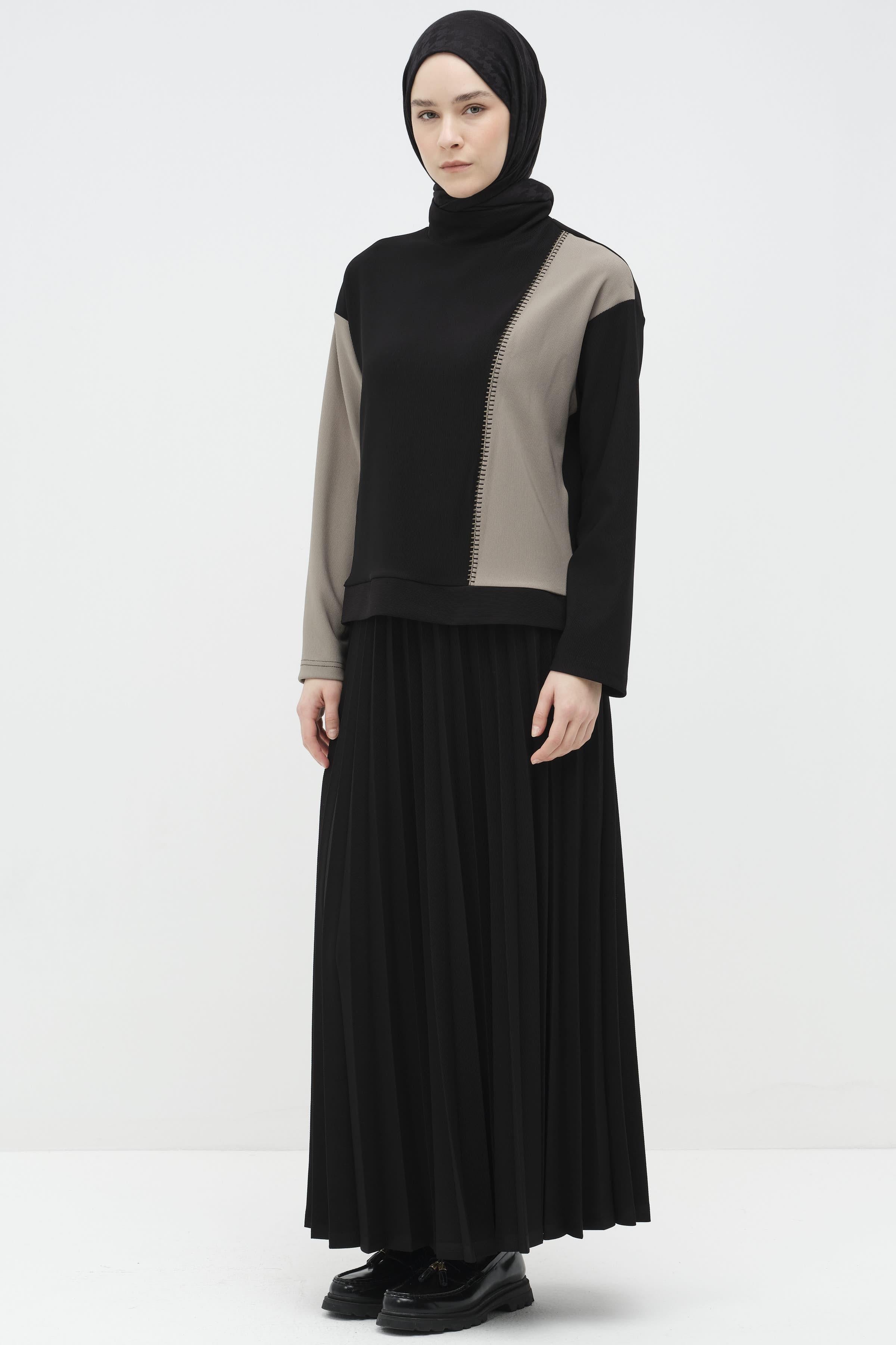 Modern ve şık bir tasarım sunan bu takım, garnili dikiş detaylarıyla hareket kazanan etek ve bluzdan oluşuyor. Yumuşak örme kumaşıyla rahatlık sağlarken, zarif çizgileriyle hem günlük kullanımda hem de özel anlarda stilinizi tamamlar.