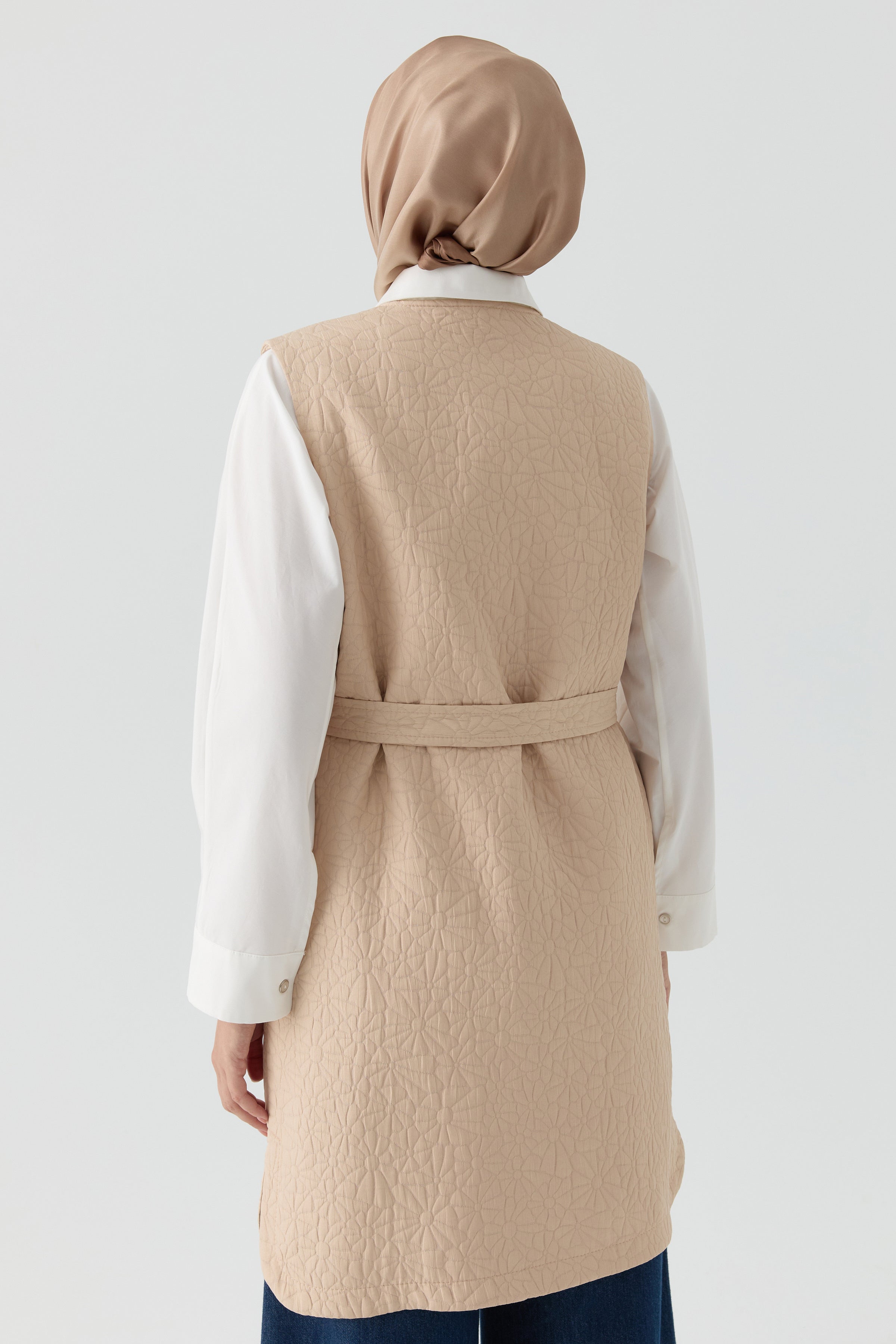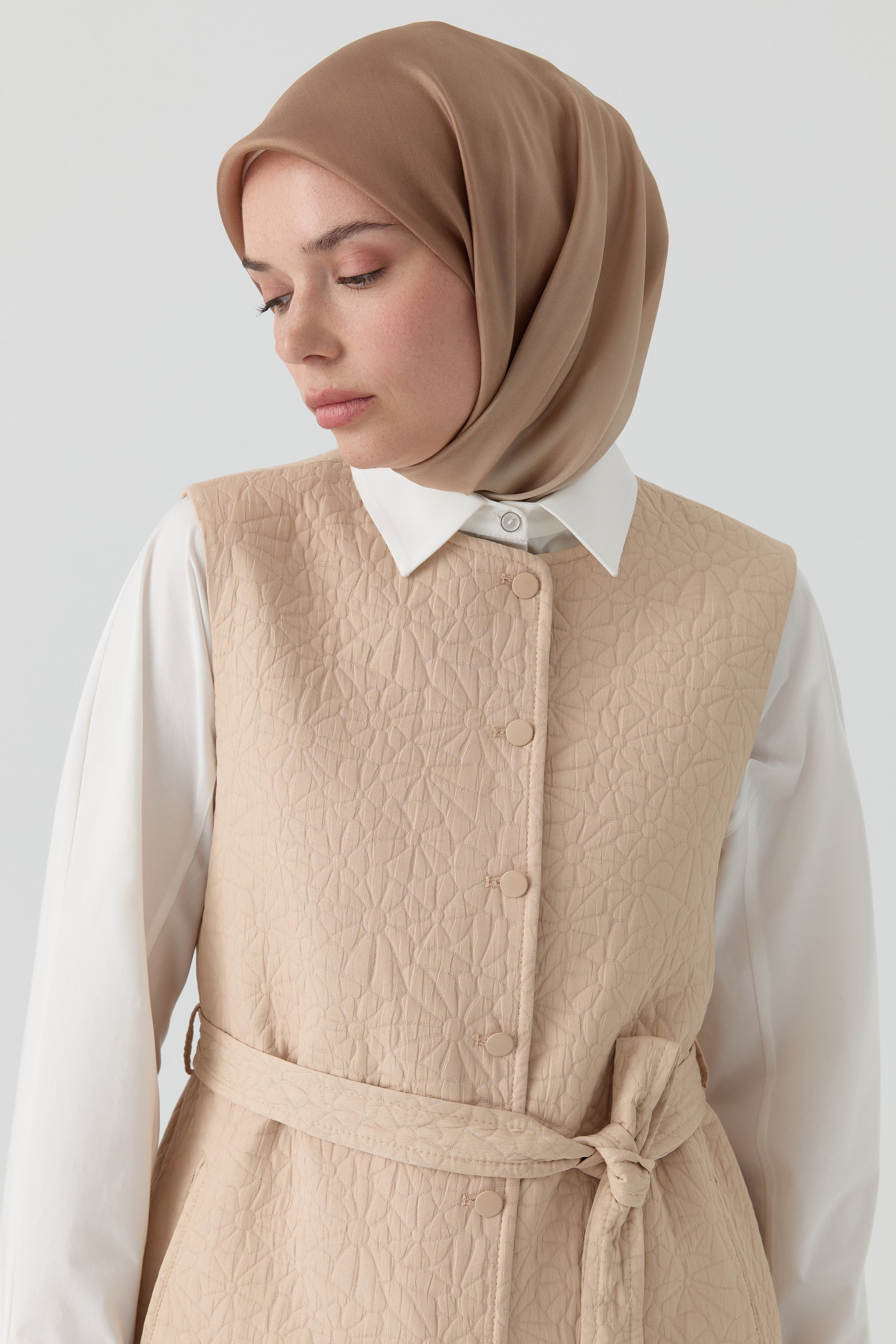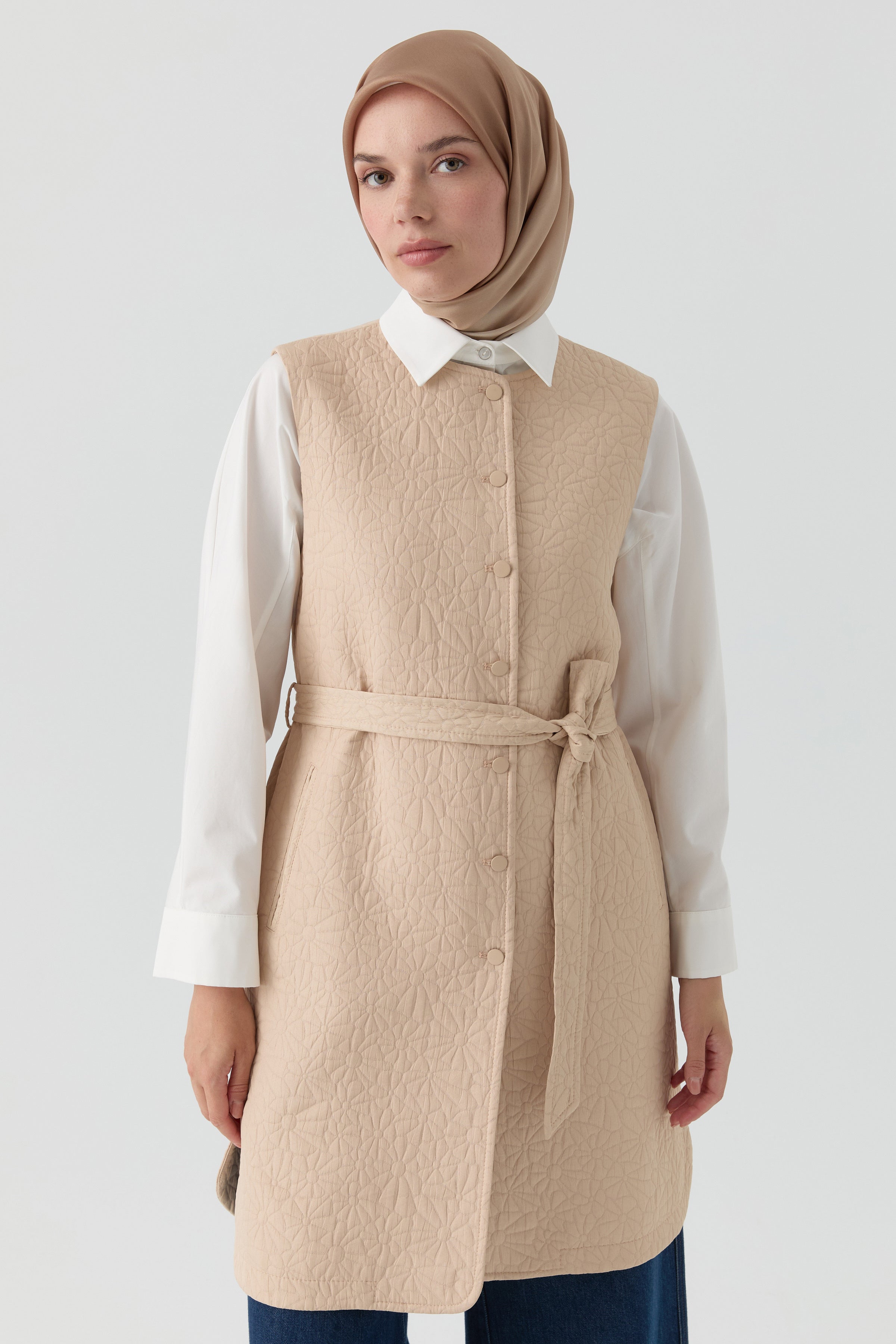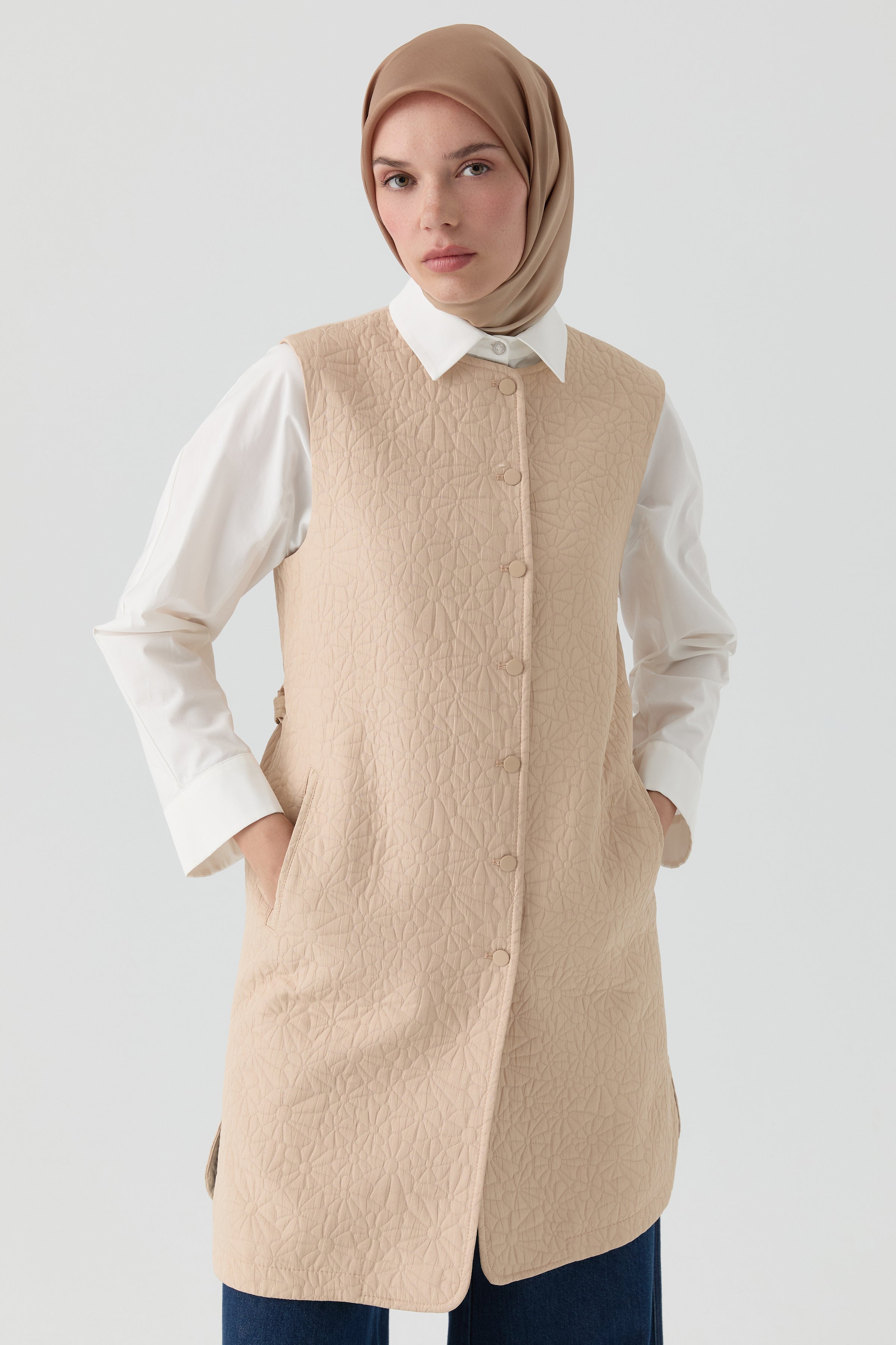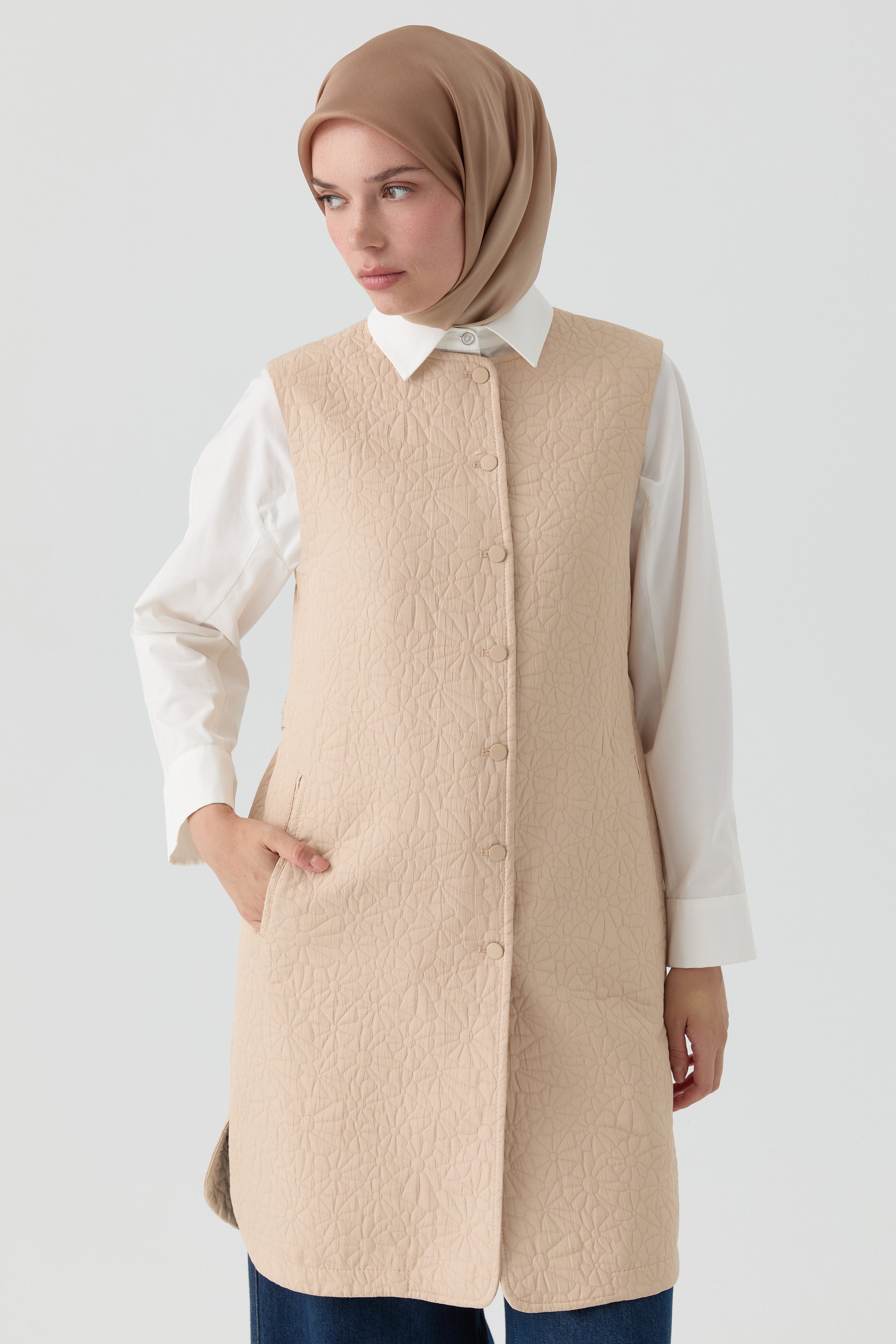 Sıfır yaka tasarımıyla modern bir görünüm kazanan bu kapitone yelek, hafif yapısıyla mevsim geçişlerinde ideal bir kullanım sunar. Rahat kalıbı ve pratik tasarımı sayesinde günlük kombinlerinize kolayca uyum sağlar.