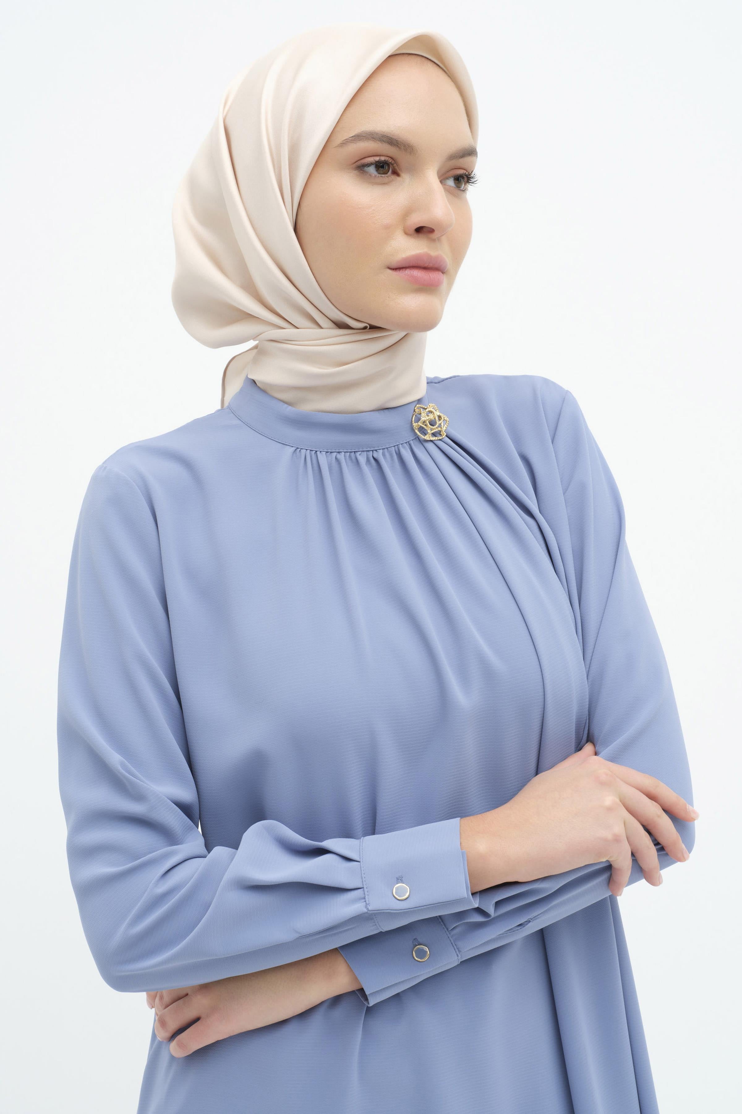 Genellikle yanlarda veya bel kısmında bulunan büzgüler, tuniğin vücuda daha zarif bir şekilde oturmasını sağlar. Broş detayı ise şık ve zarif bir aksesuar olarak öne çıkar, tuniğe sofistike bir hava katar.