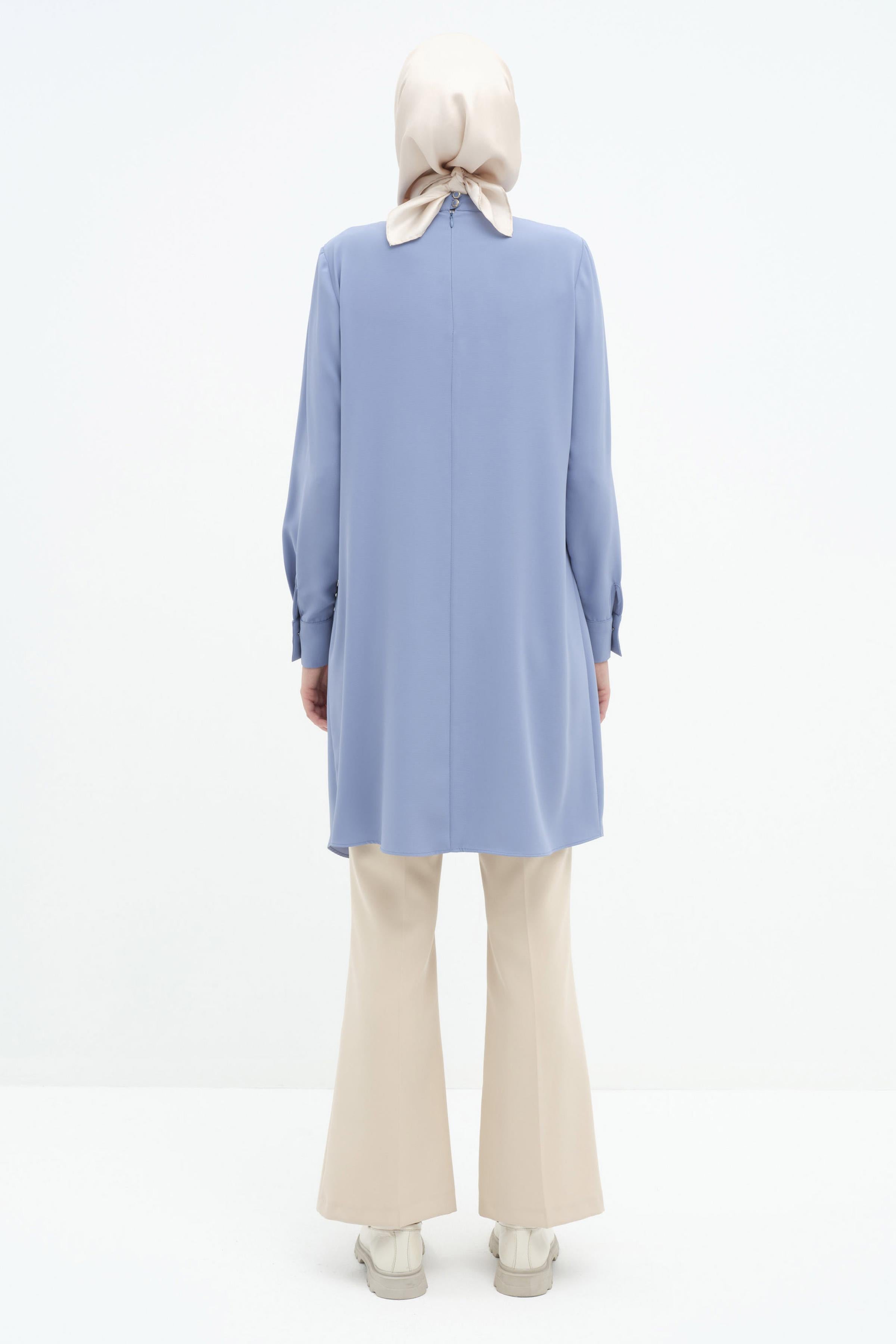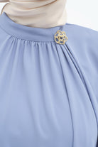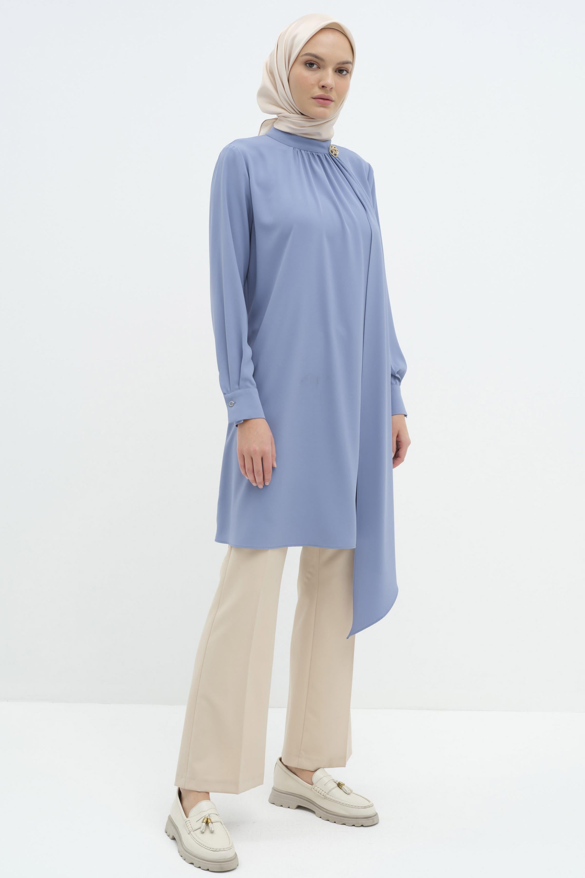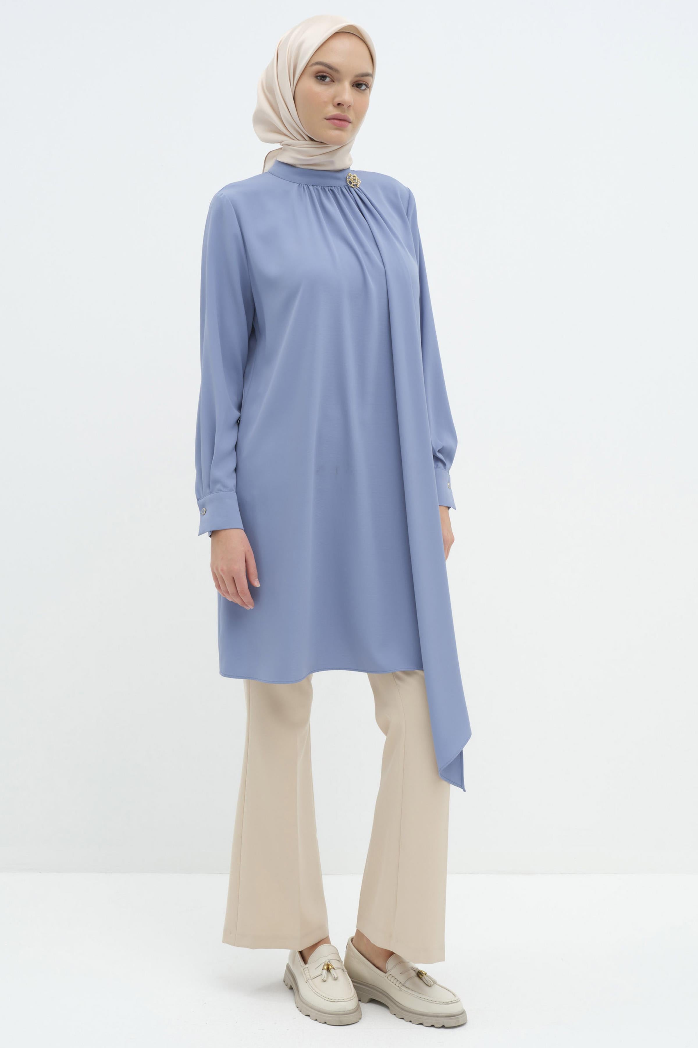 Büzgülü Broş Detaylı Asimetrik Tunik - Mavi
