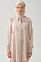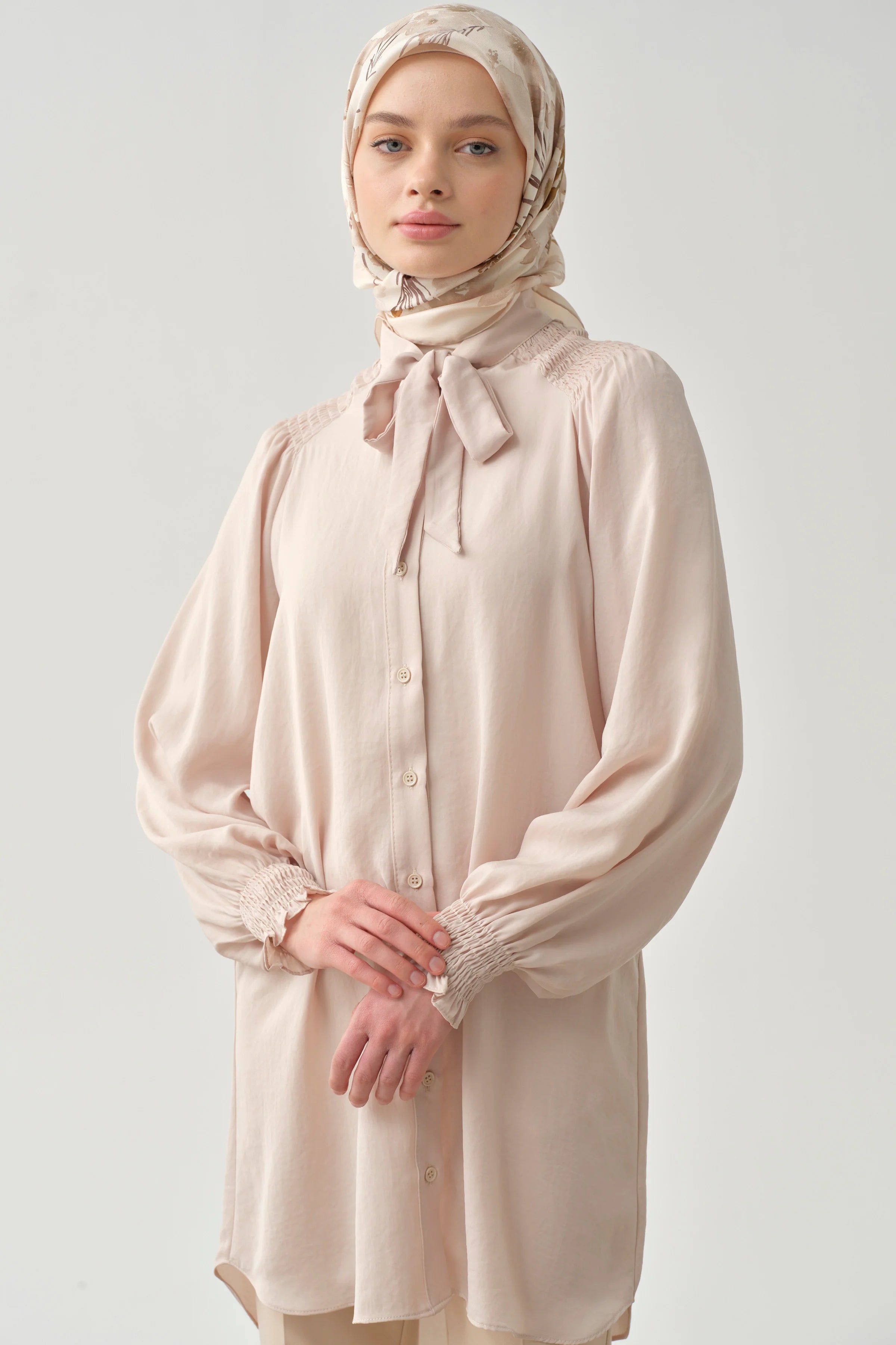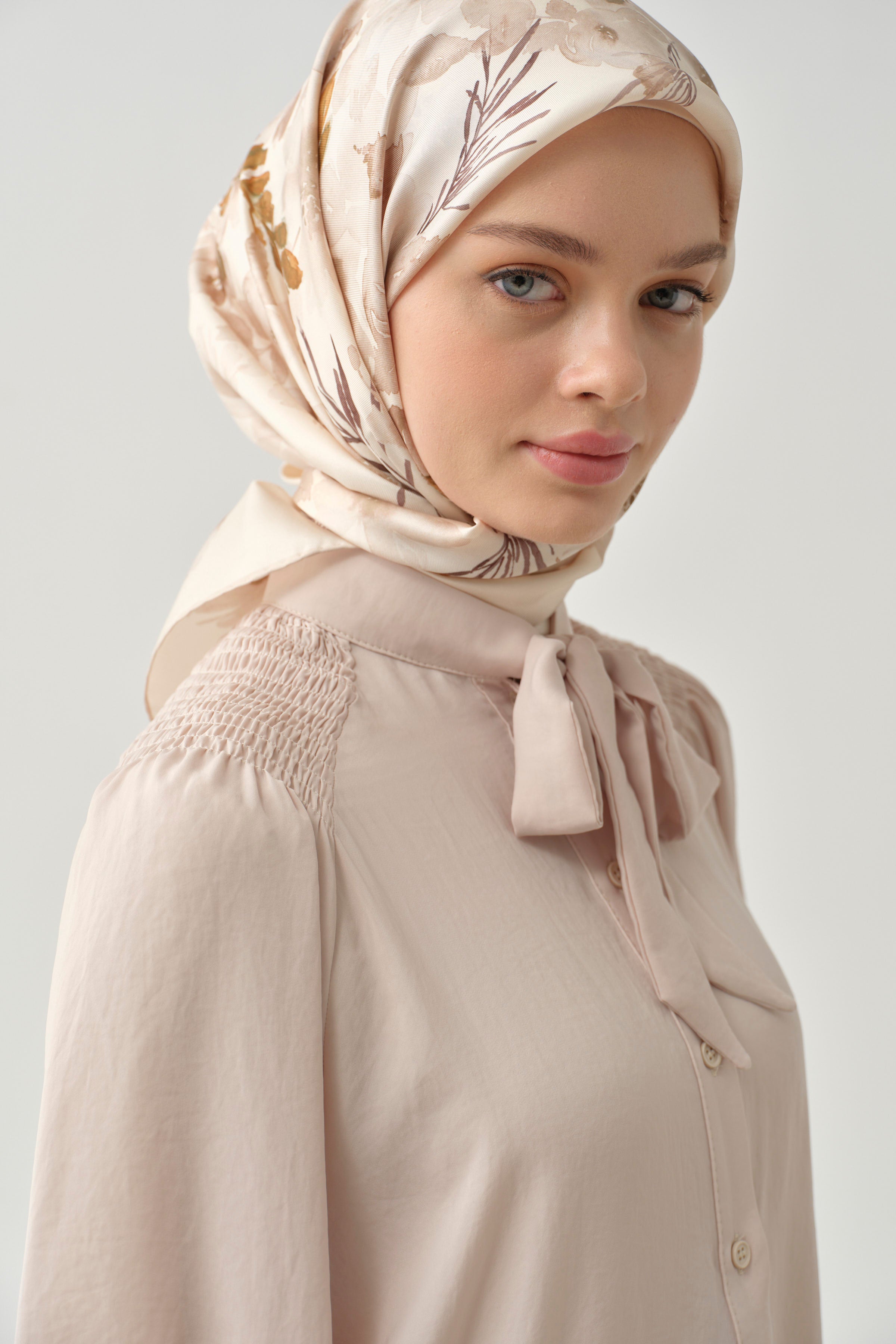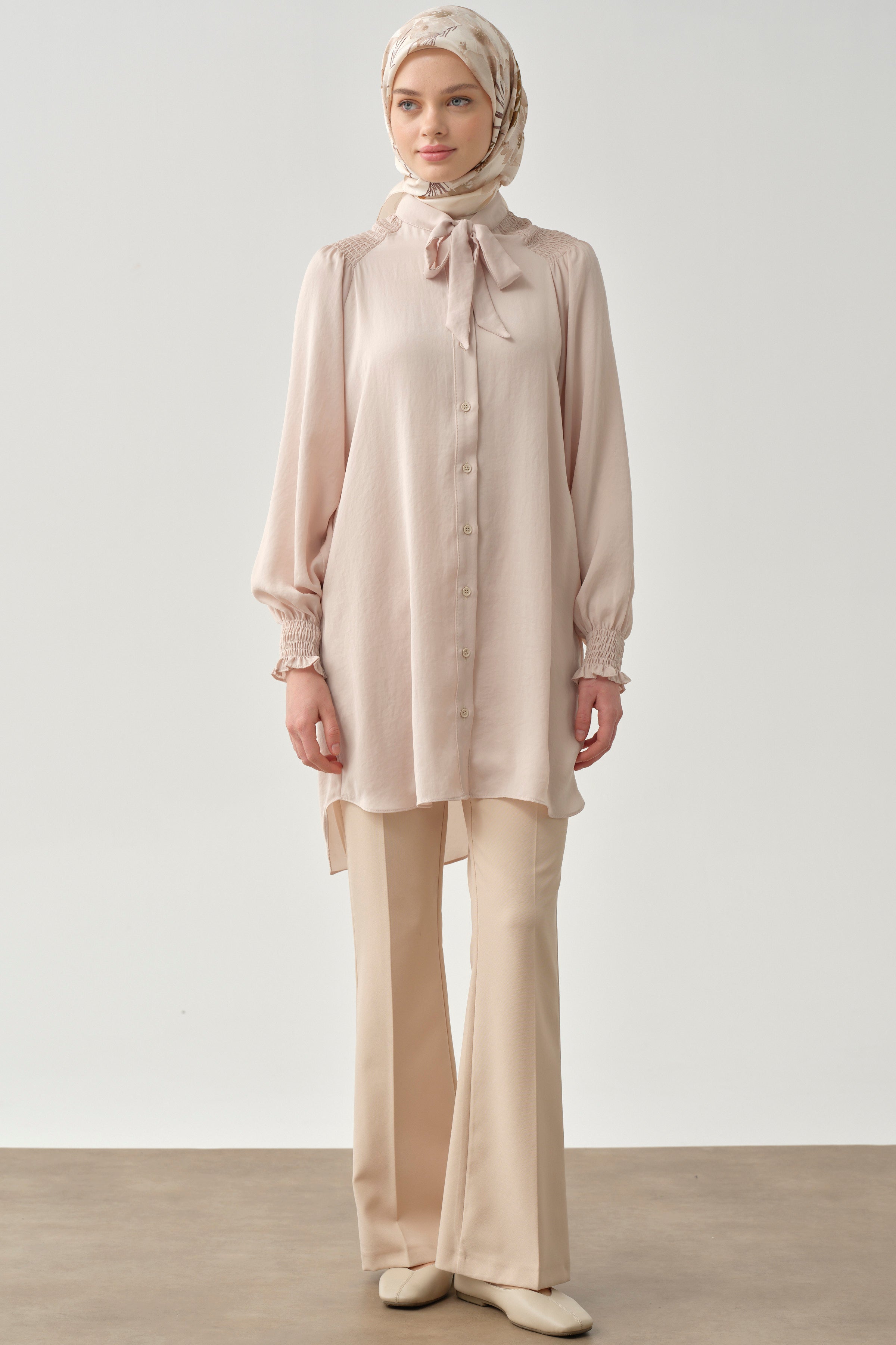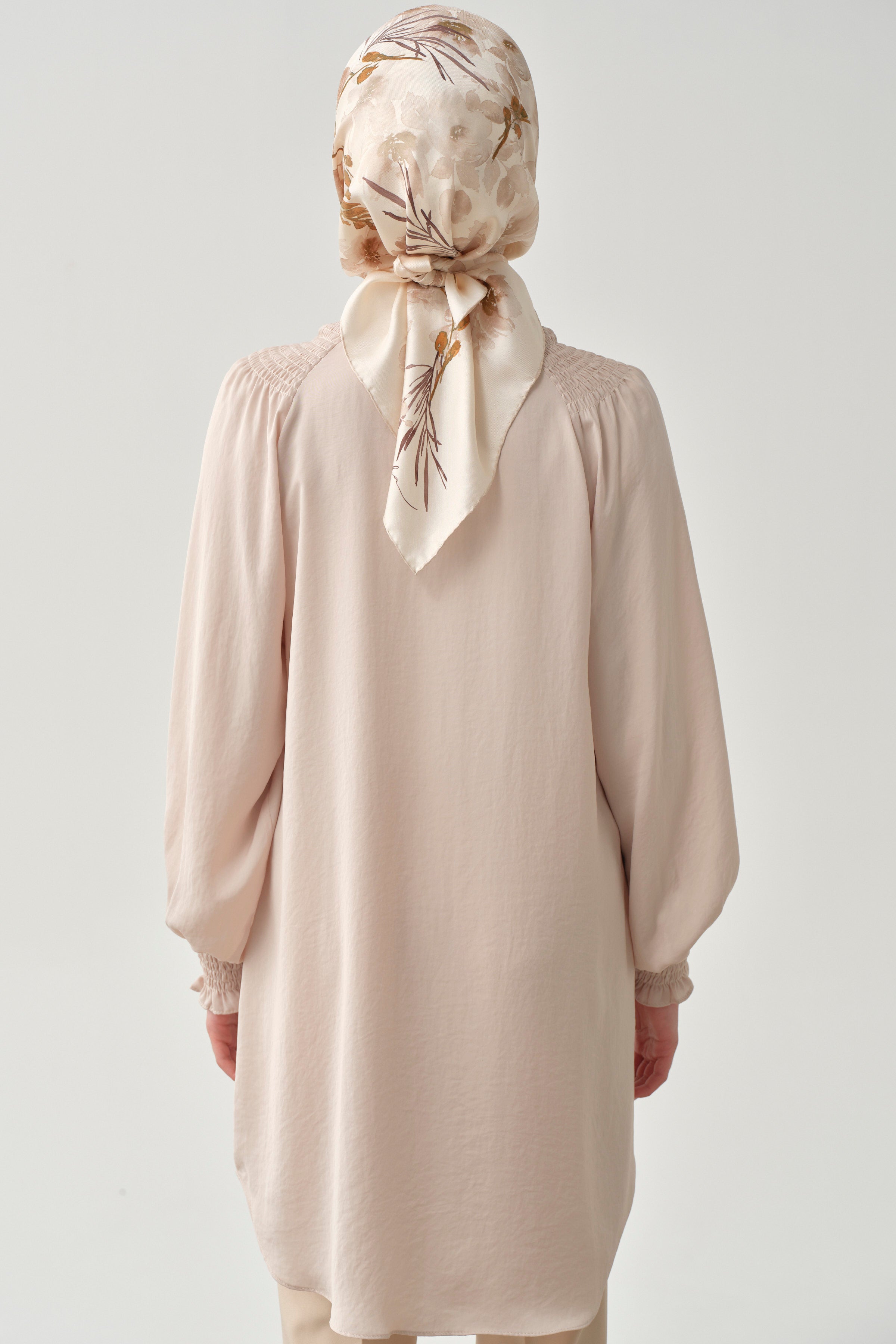 Fular yaka ve büzgü detaylarıyla zarif bir dokunuş sunan bu tunik, feminen ve şık bir siluet oluşturuyor. Akıcı kesimi sayesinde konforlu bir kullanım sağlarken, fular detayı kombininize sofistike bir hava katıyor.