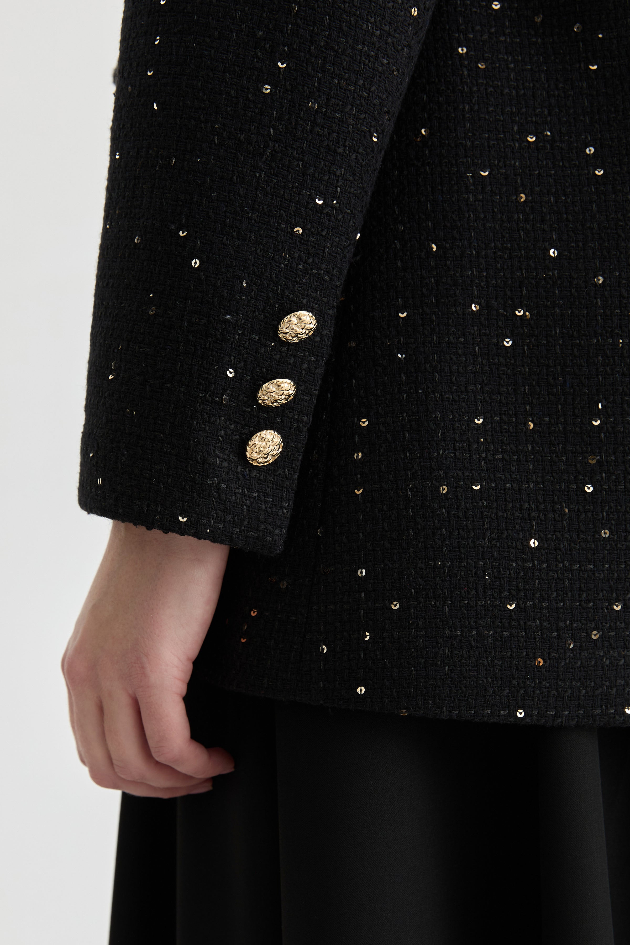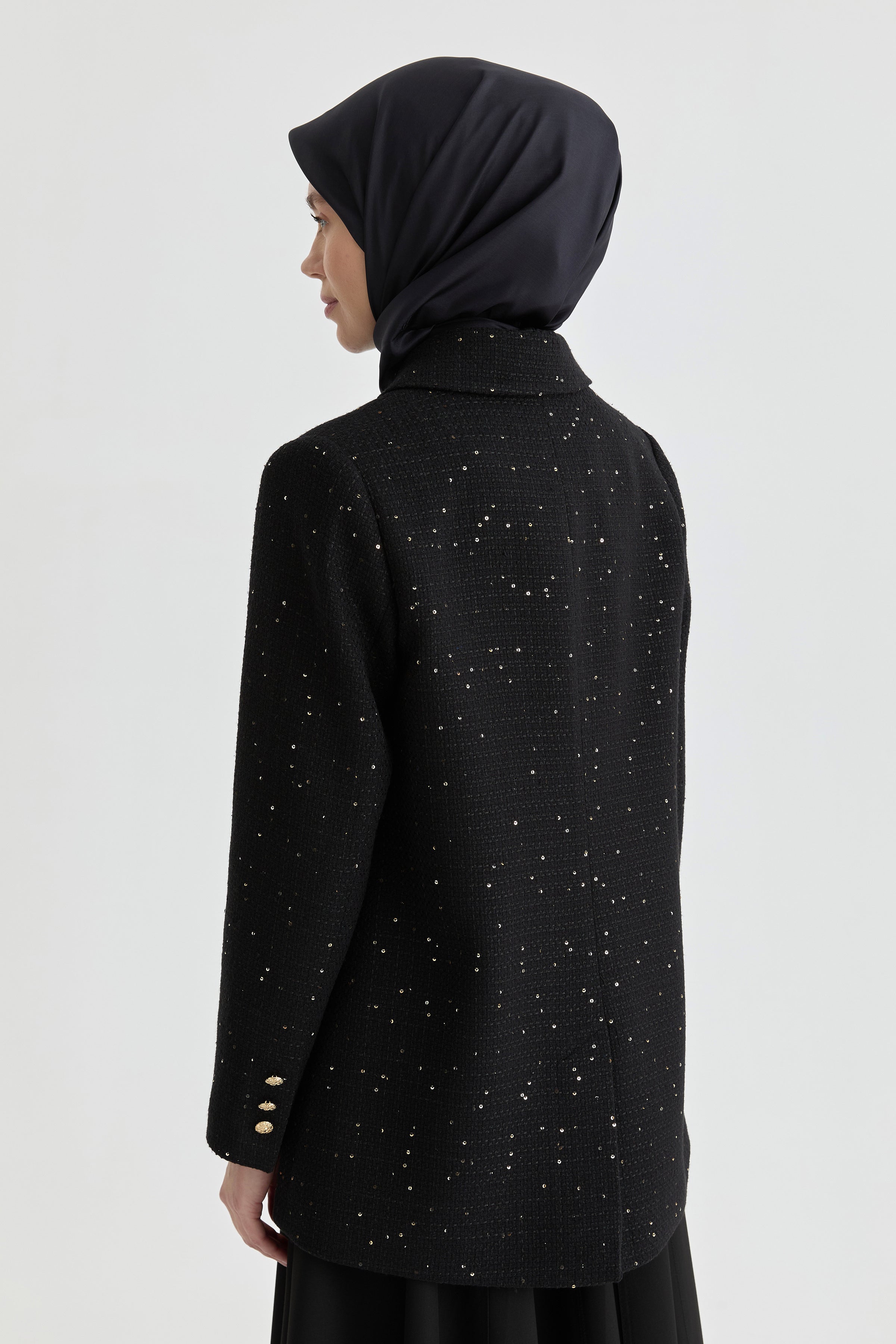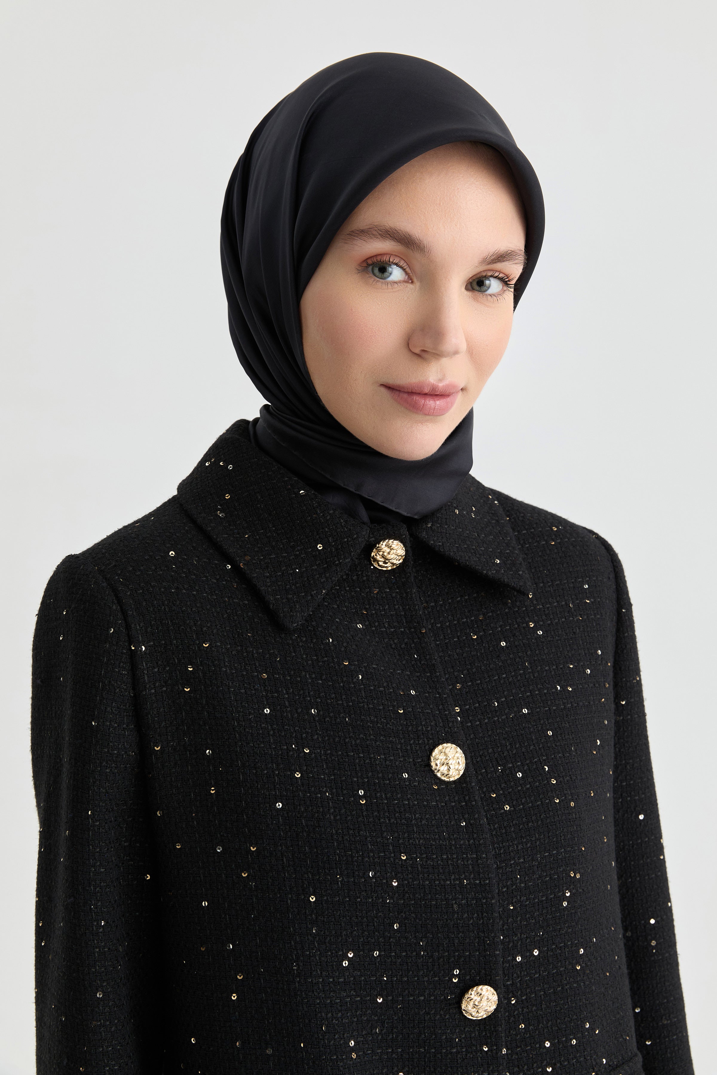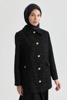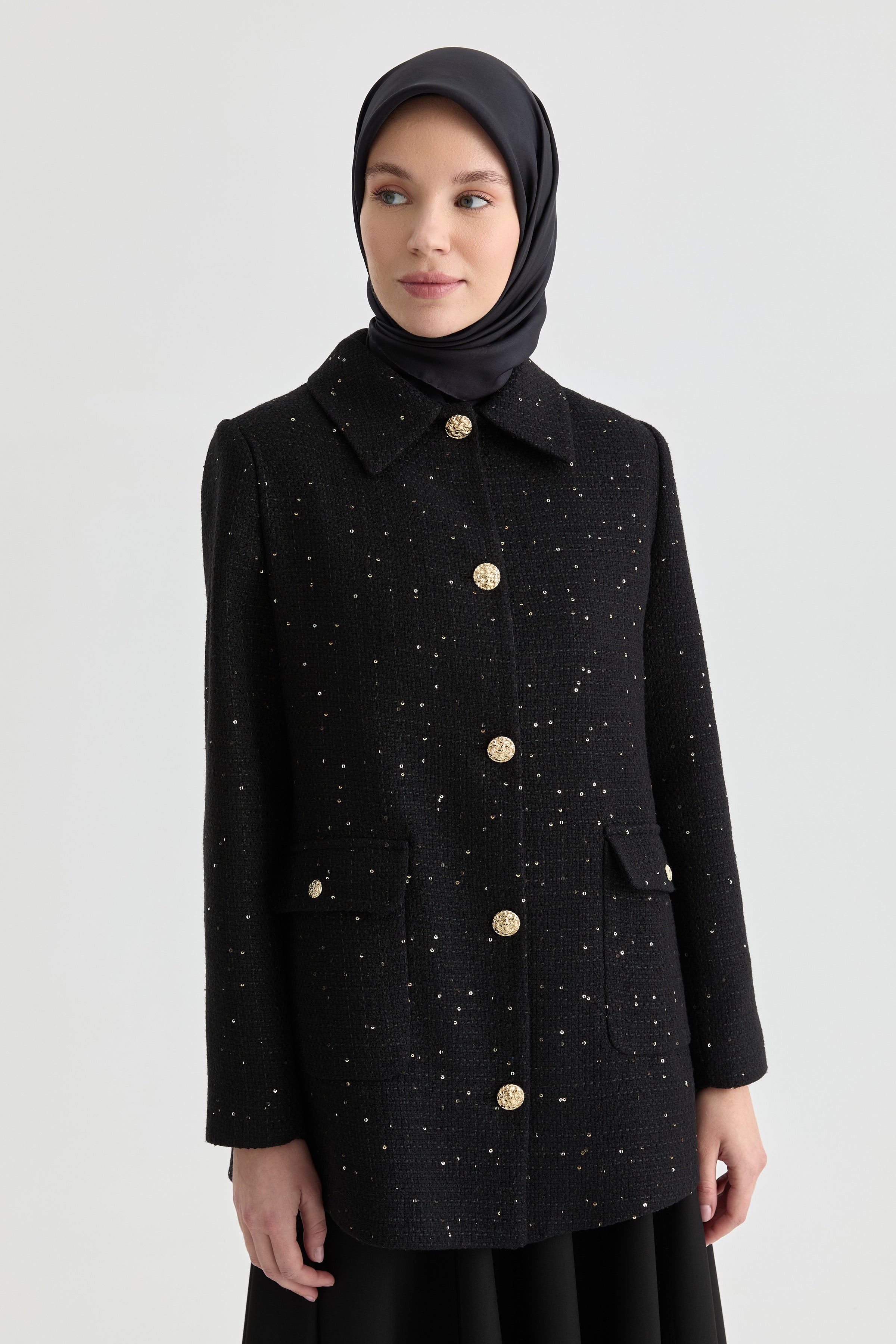 Ön kısmındaki gold düğmelerle öne çıkan bu ceket, sade tasarımına zarif bir ışıltı katar. Düğmelerin parlak dokusu modeli belirginleştirirken, düzenli kesimi silueti toplu ve şık gösterir.