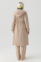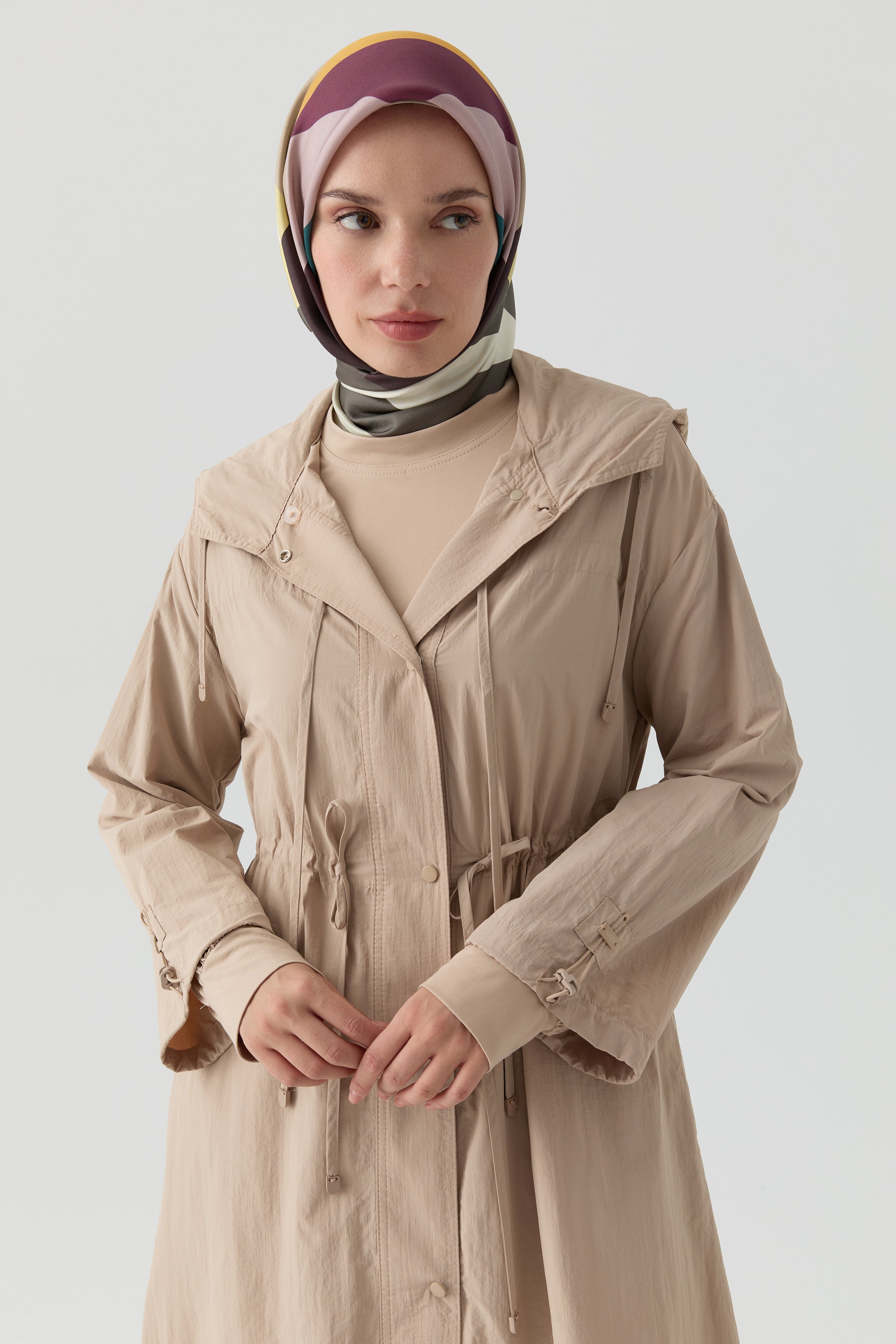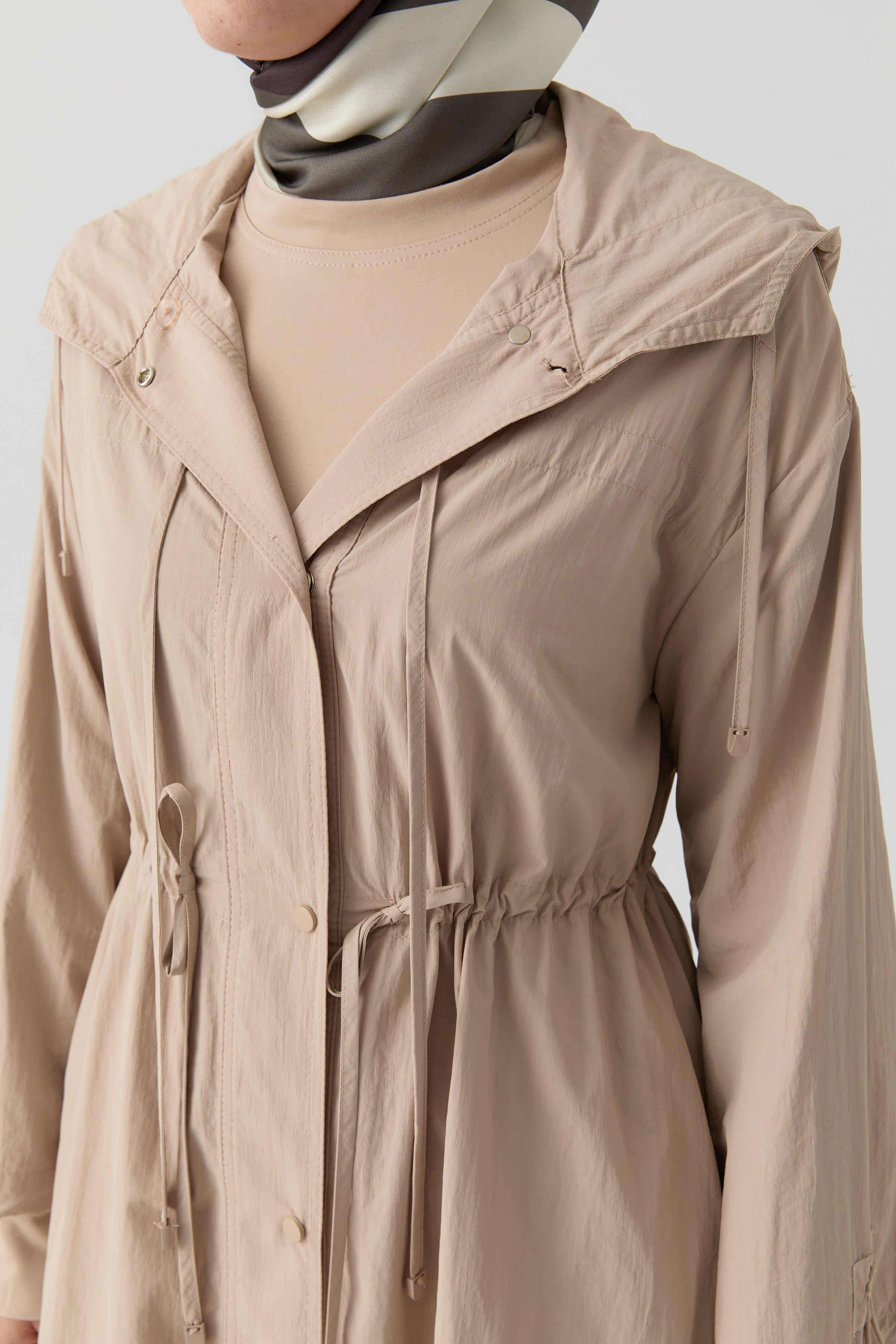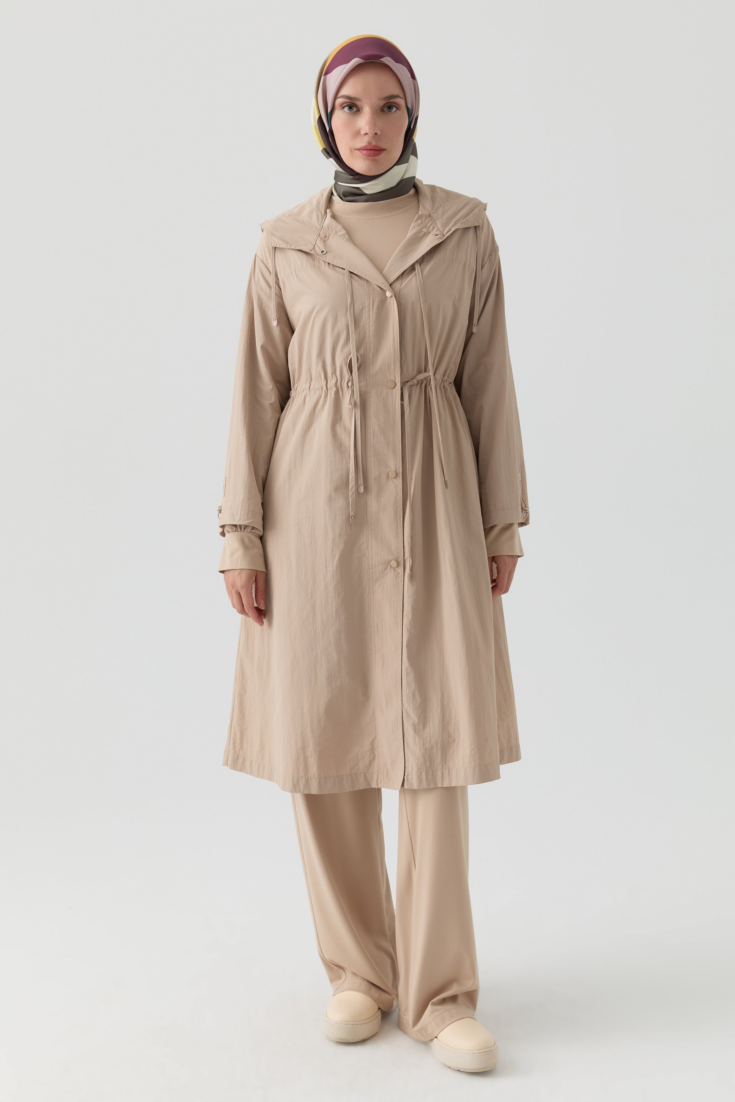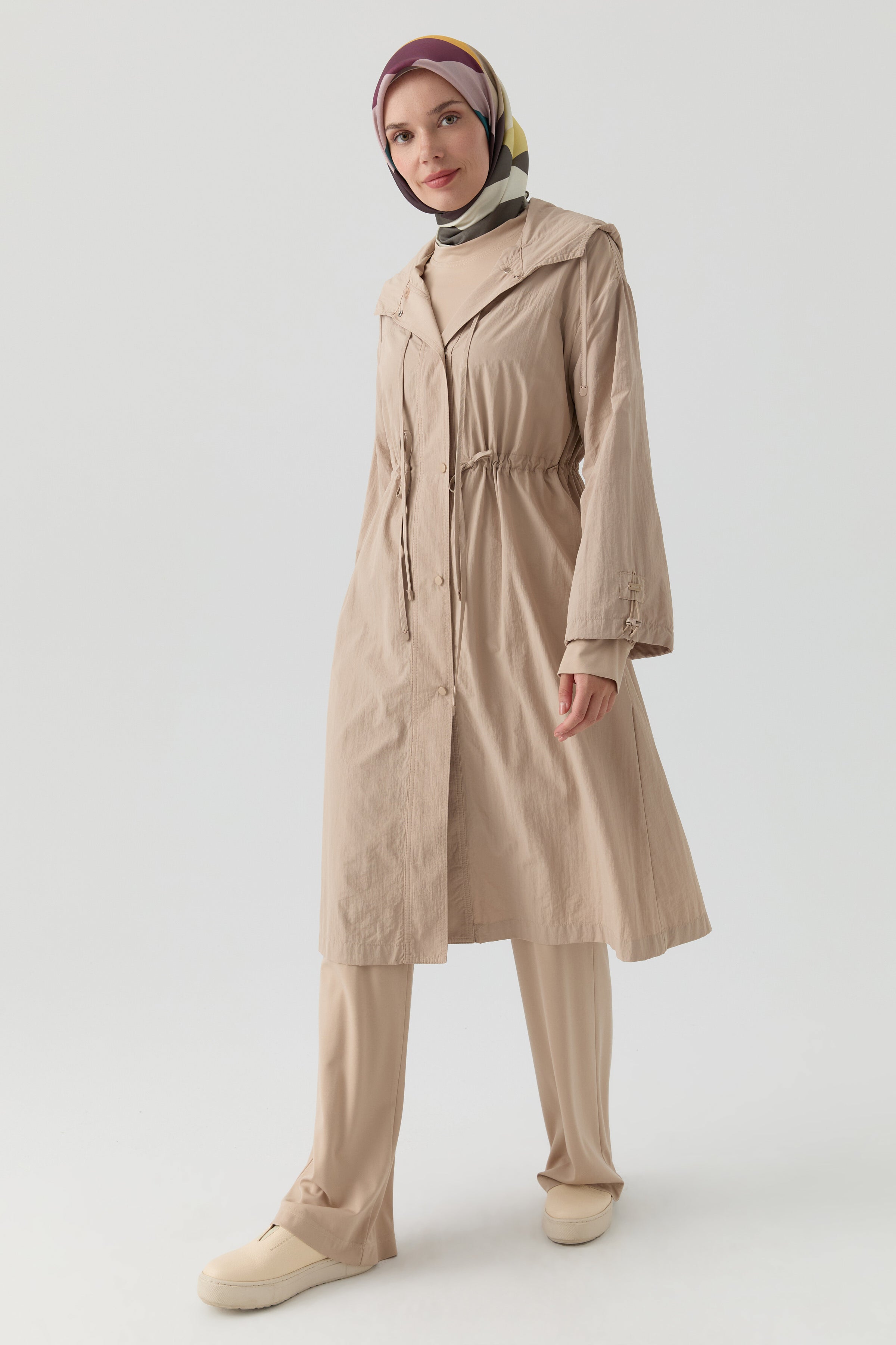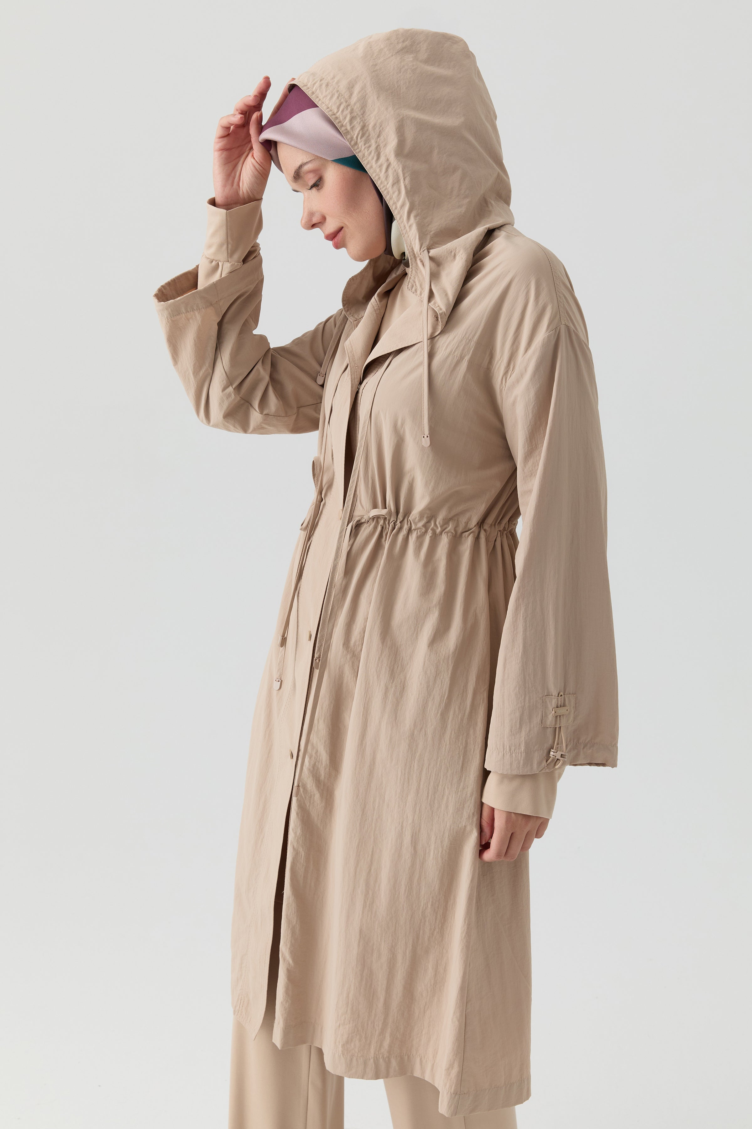 Hafif yapısıyla mevsim geçişlerinde ideal bir kullanım sunan bu yağmurluk, bel kısmındaki bağcık detayıyla silueti şekillendirerek modern bir görünüm kazandırır.