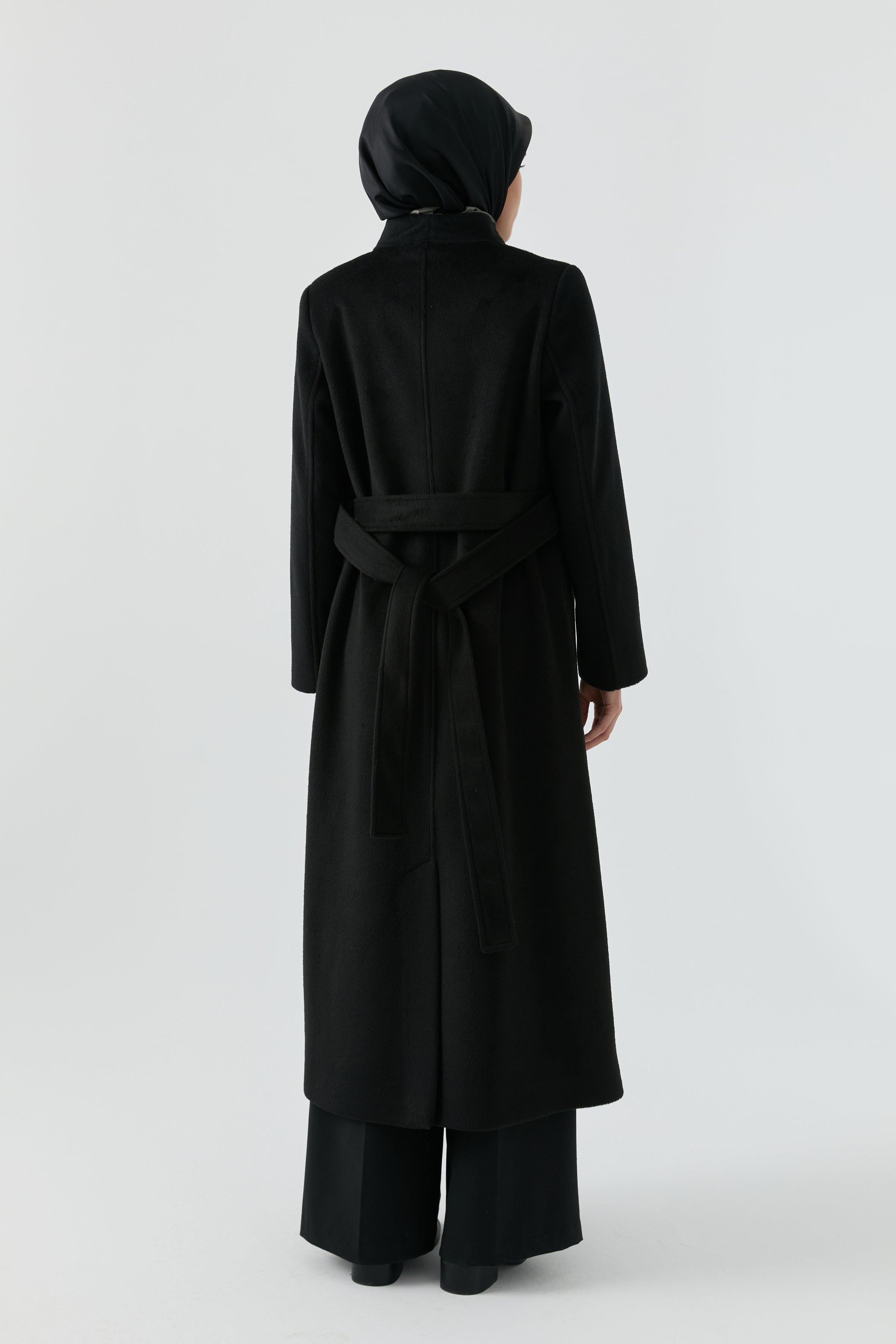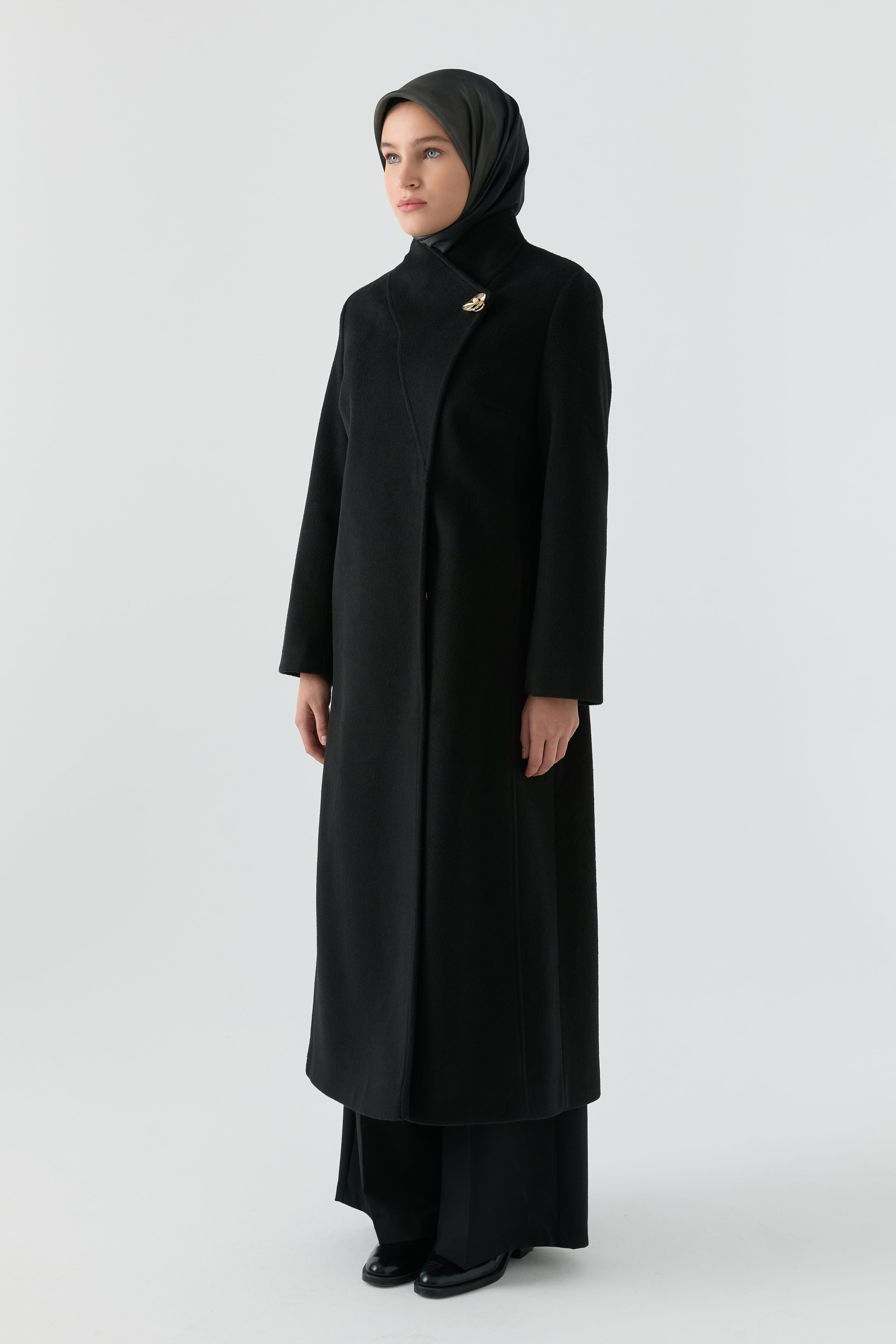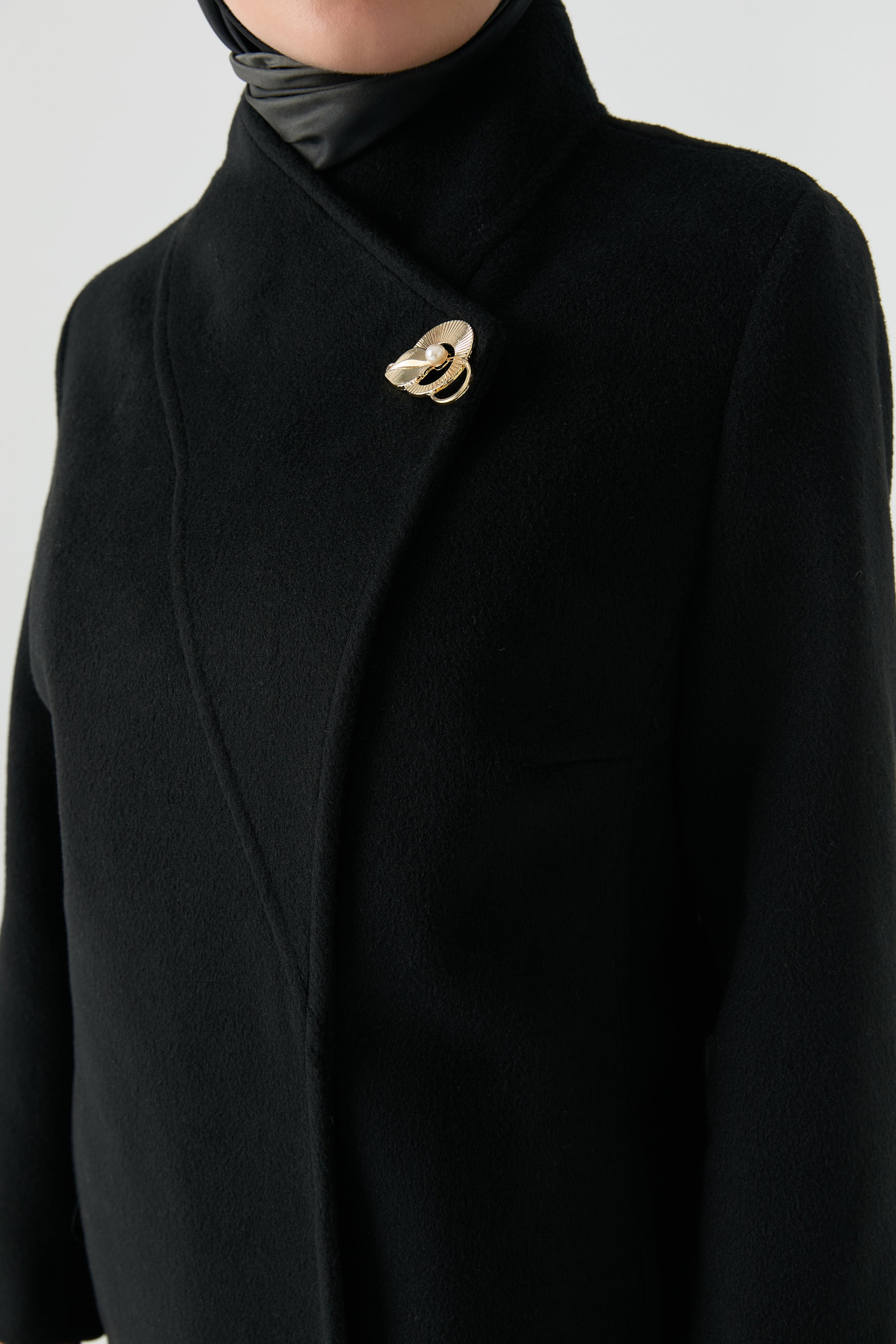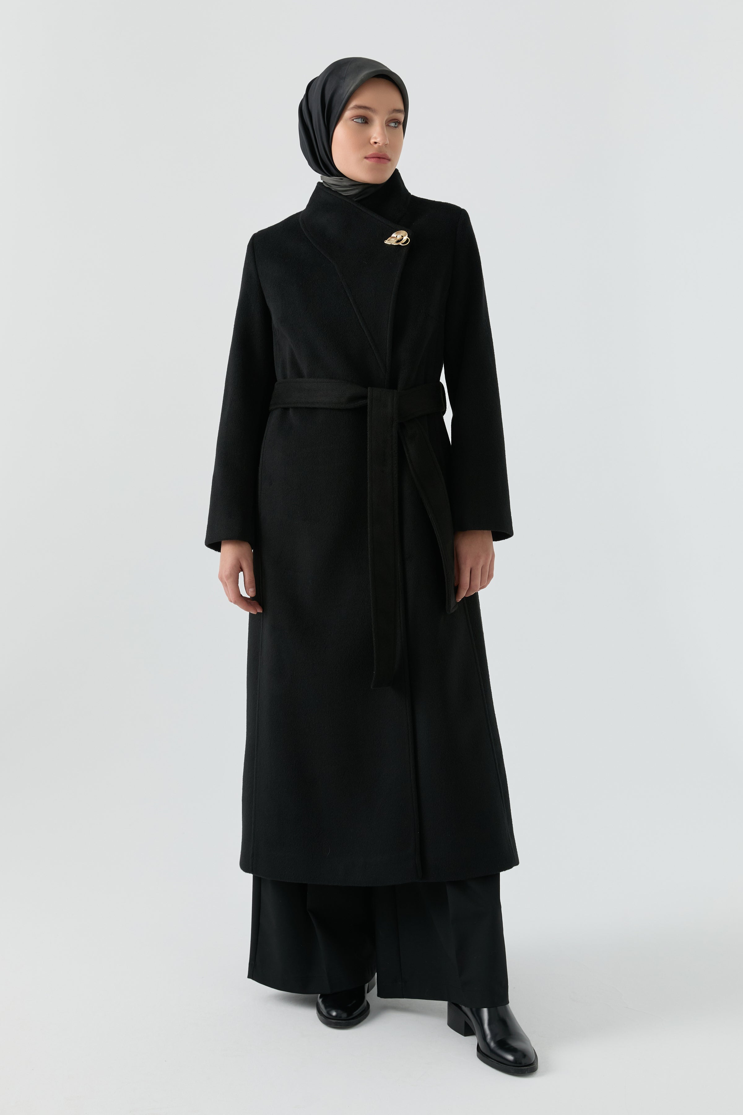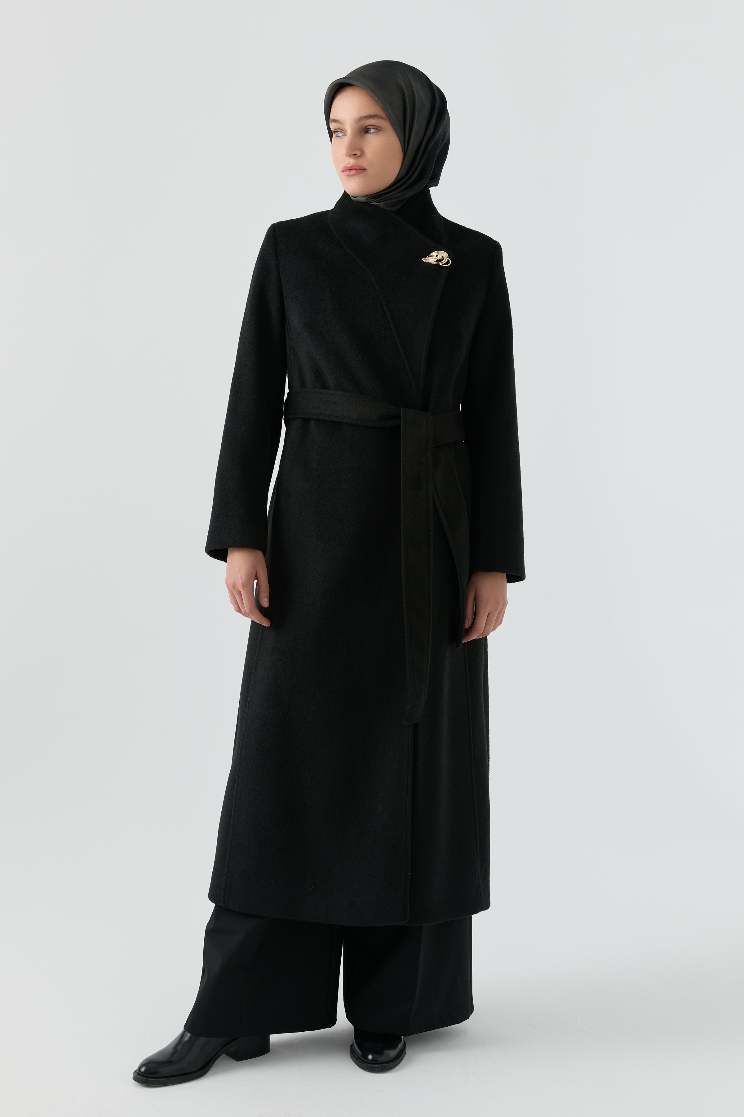 Bel kuşağıyla silueti zarifçe vurgulayan bu manto, ön kısmındaki broş detayıyla klasik dış giyime şık ve feminen bir dokunuş ekler. Yapısal formu şehir stiline güçlü bir duruş kazandırırken, akıcı kesimi gün boyu konfor sağlar.
