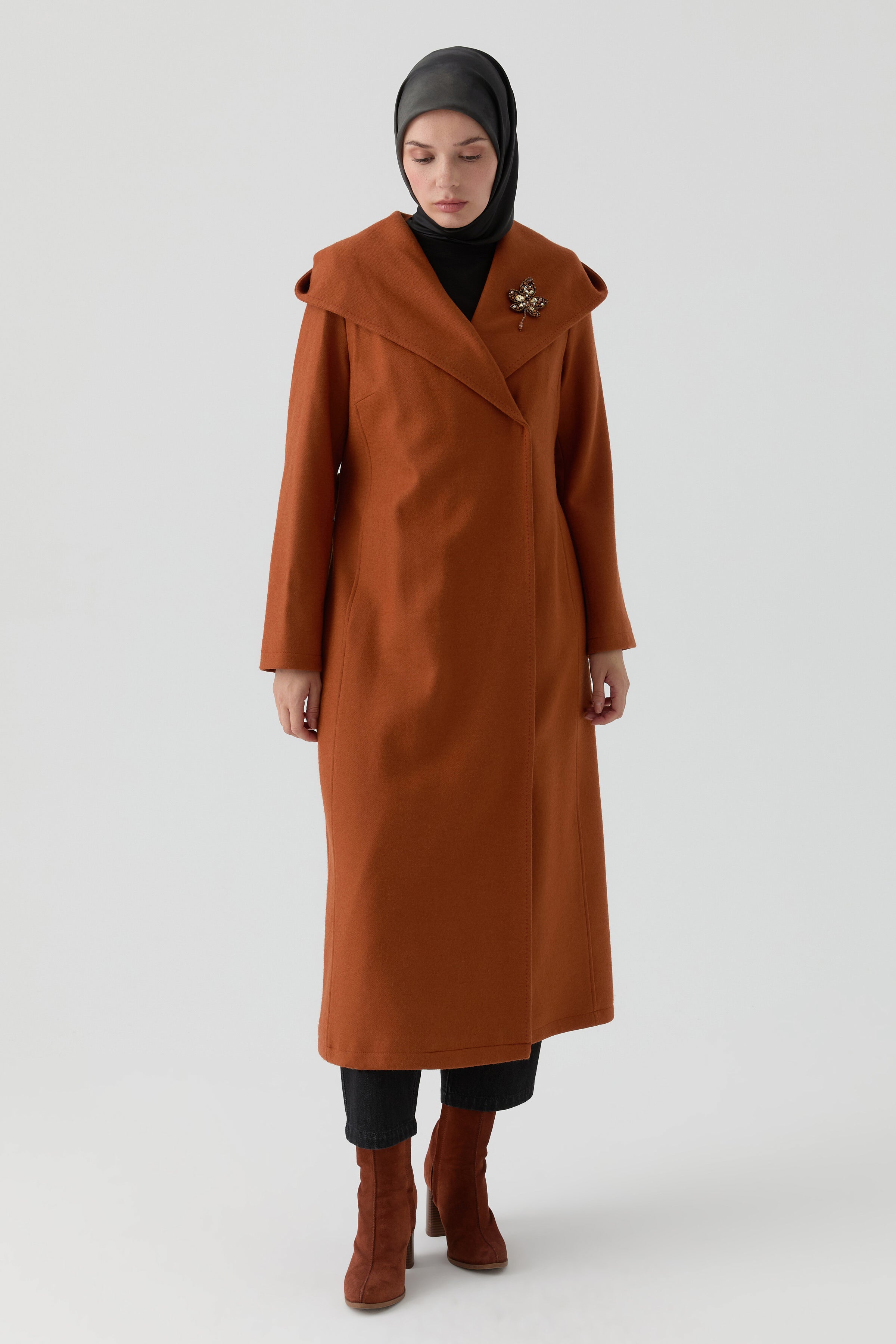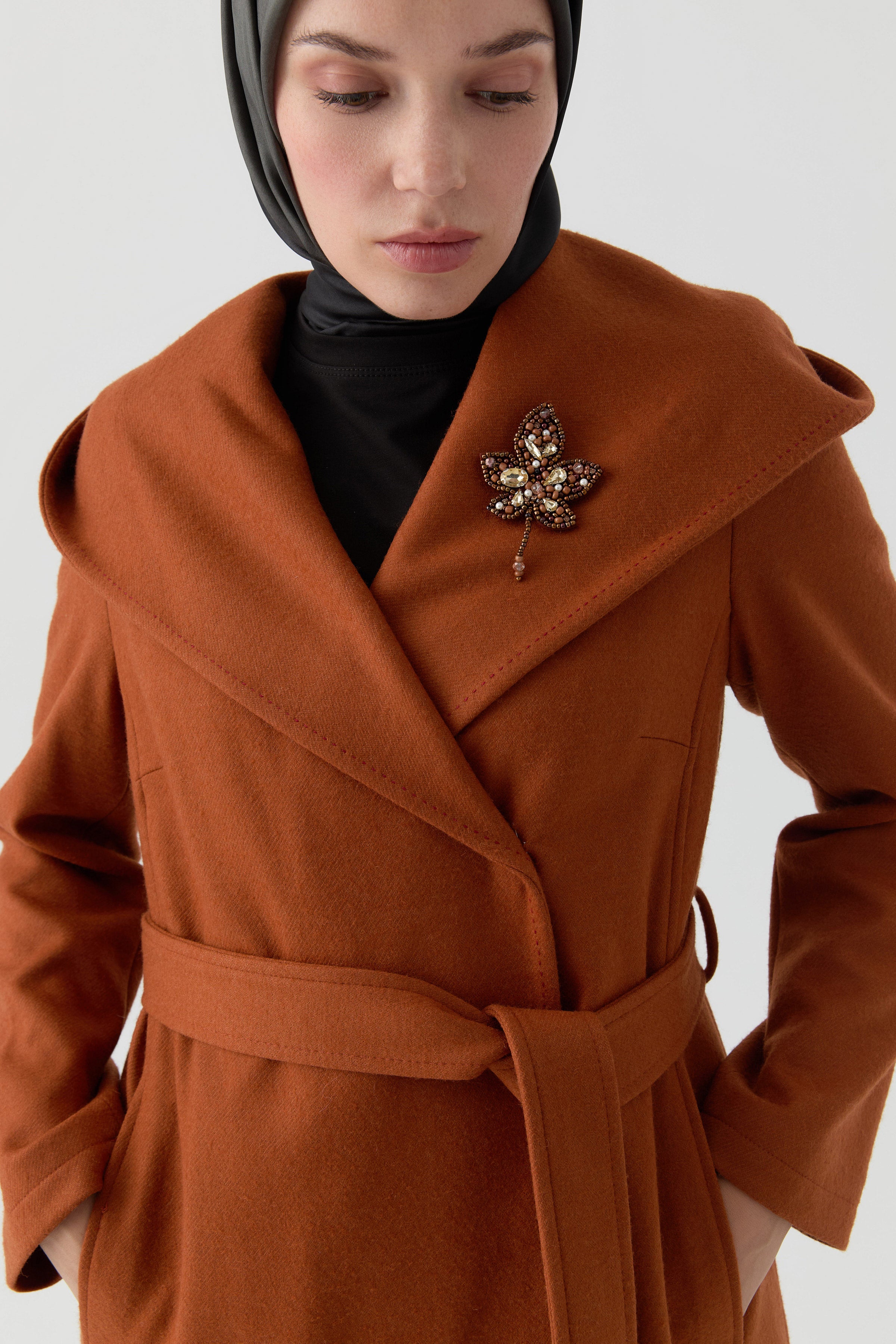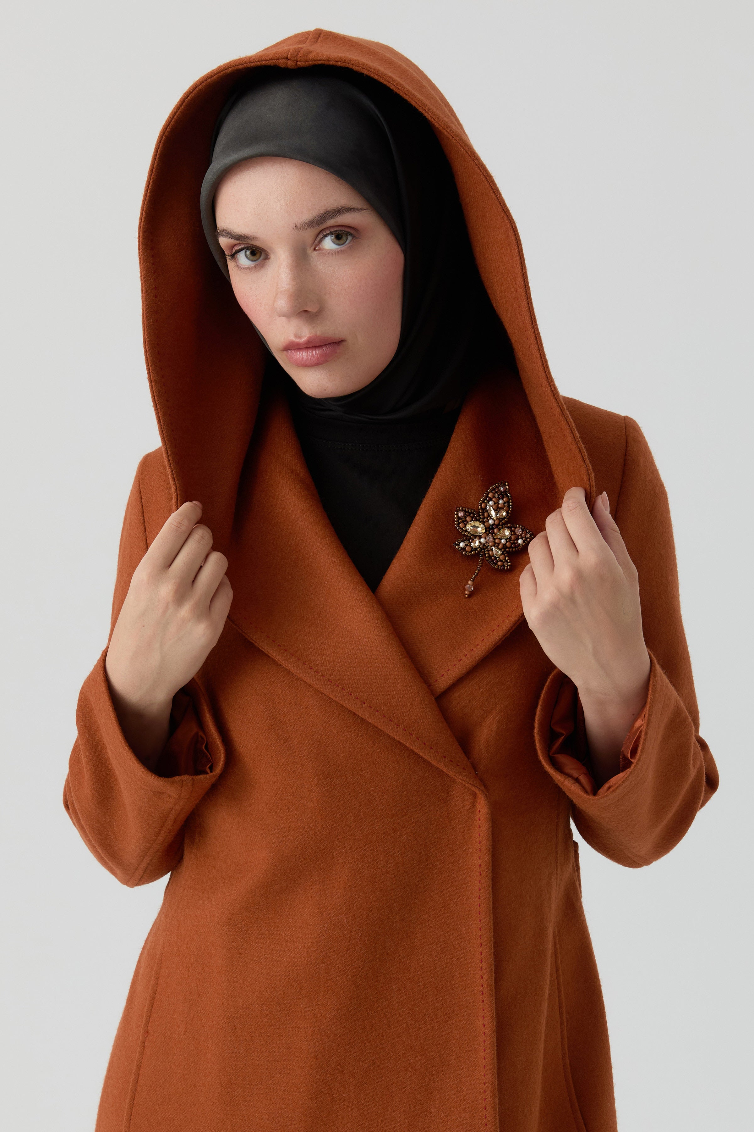 Kapüşonlu Broş Detaylı Keçe Kaban - Kiremit