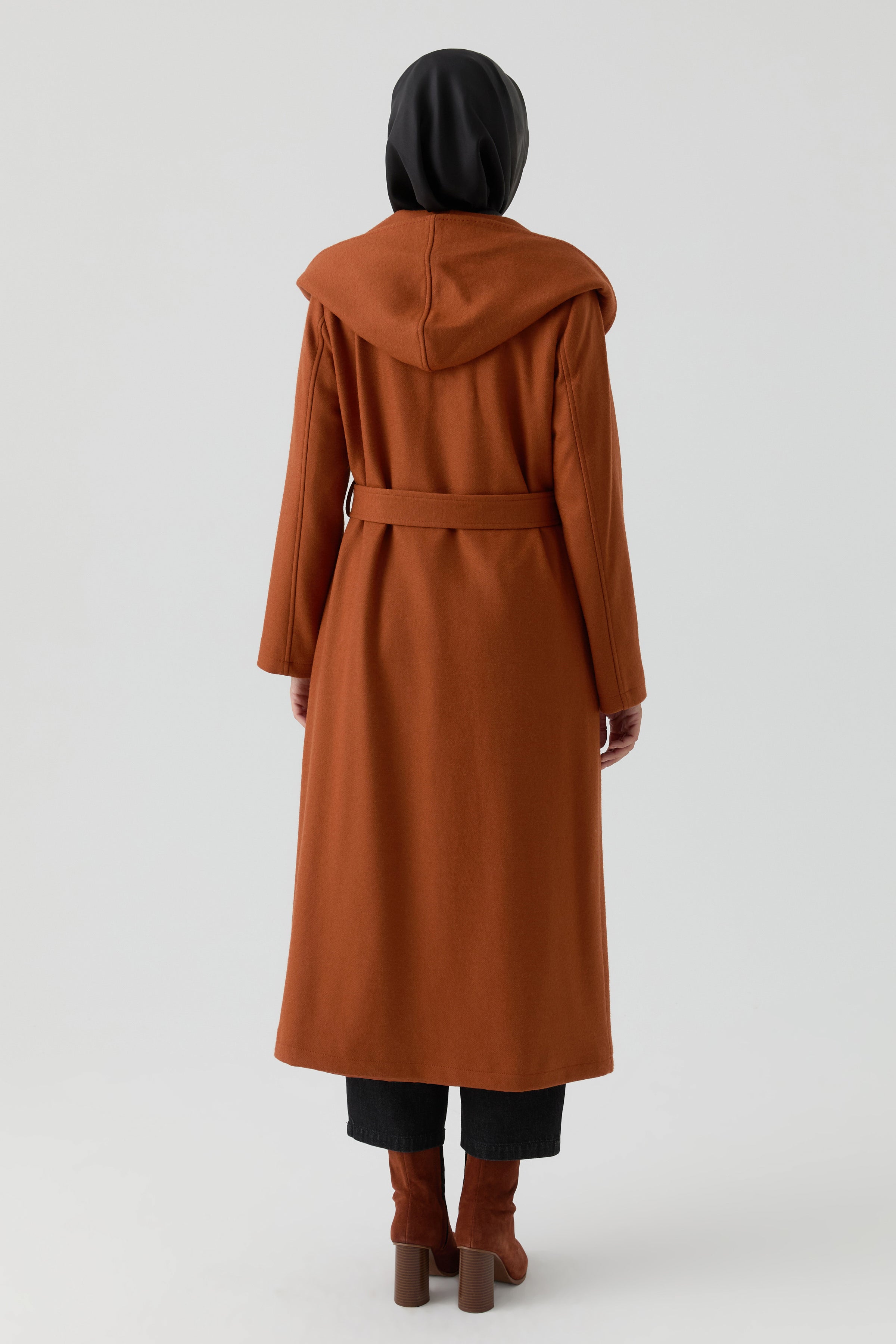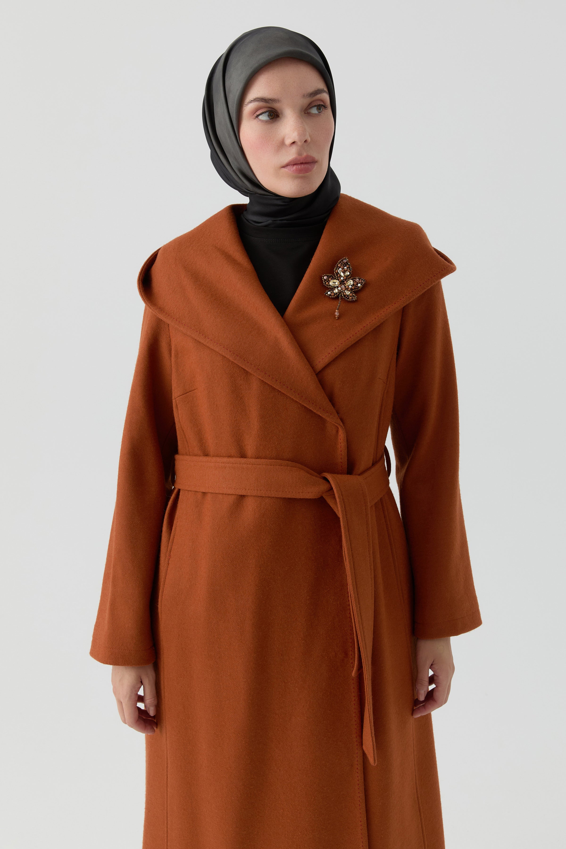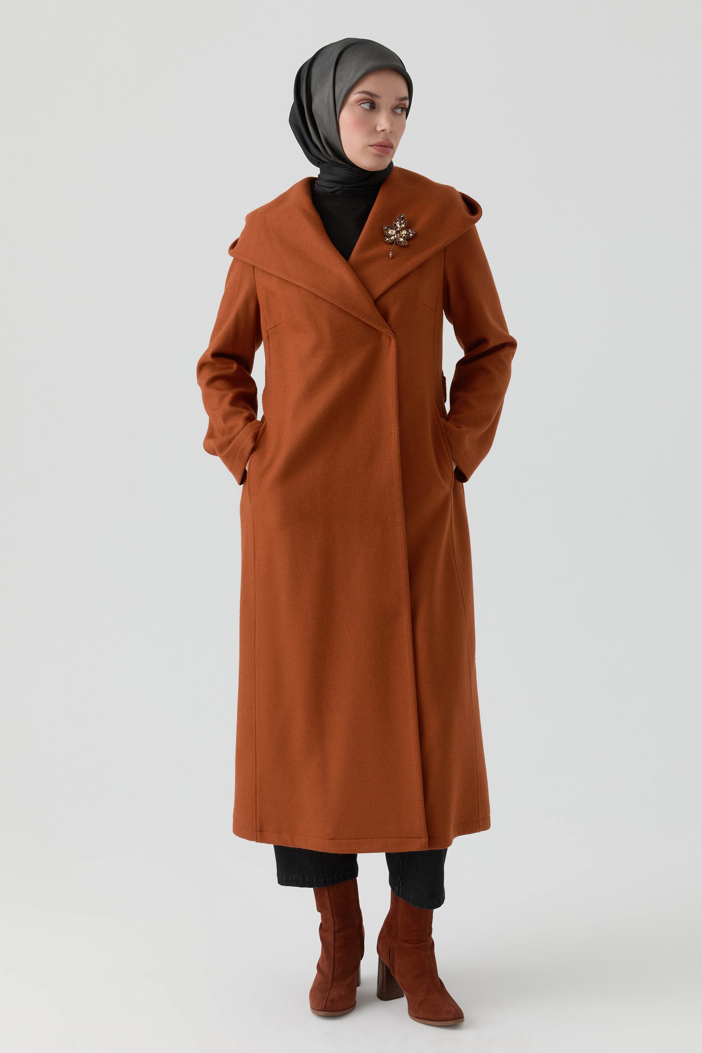 Kapüşonlu Broş Detaylı Keçe Kaban - Kiremit