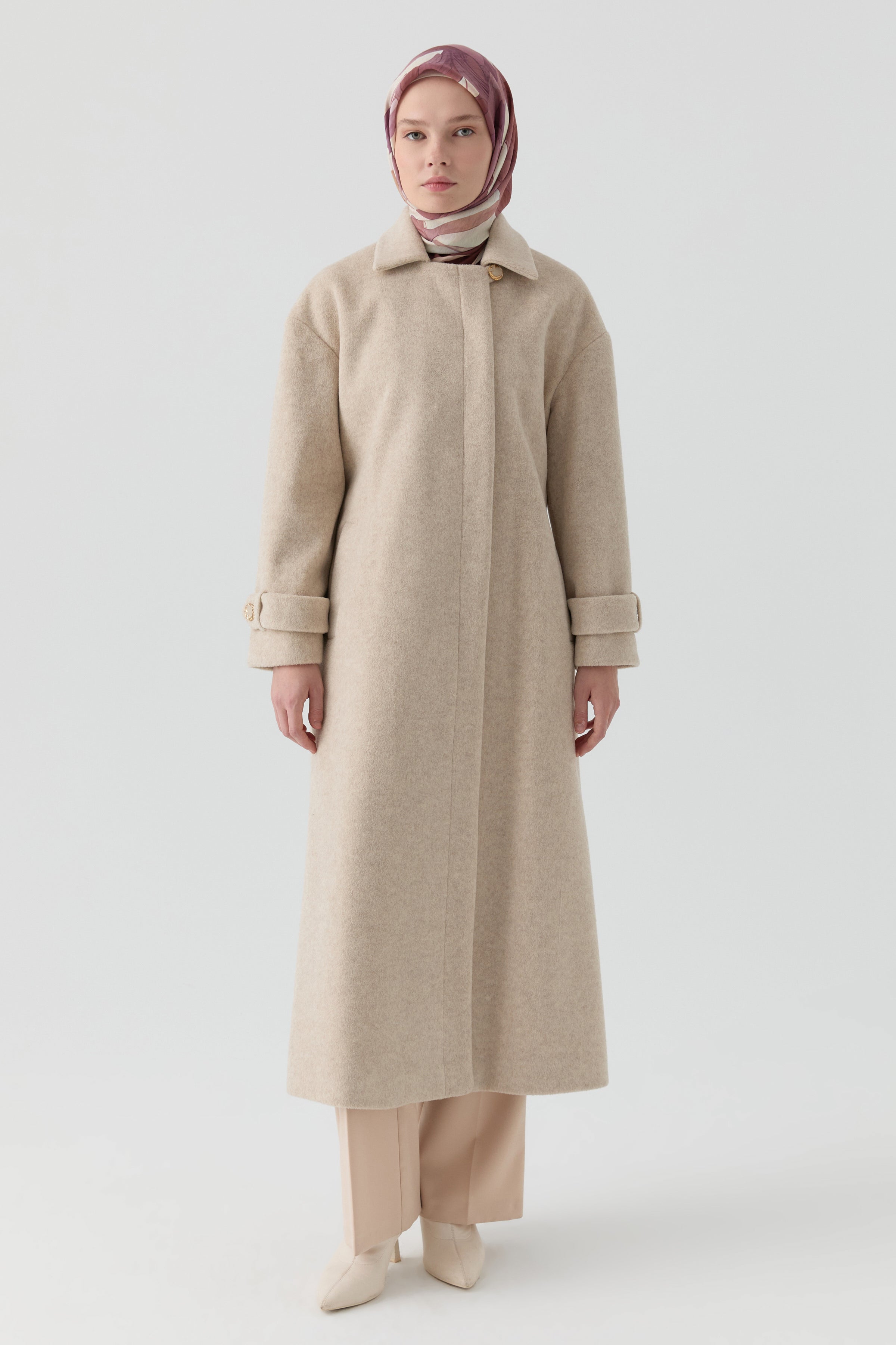 Kollarında yer alan bant detayıyla modern bir görünüm kazanan bu manto, minimalist tasarımıyla zamansız bir şıklık sunar. Uzun formu sayesinde elegan bir siluet oluştururken, rahat kalıbı gün boyu konfor sağlar.