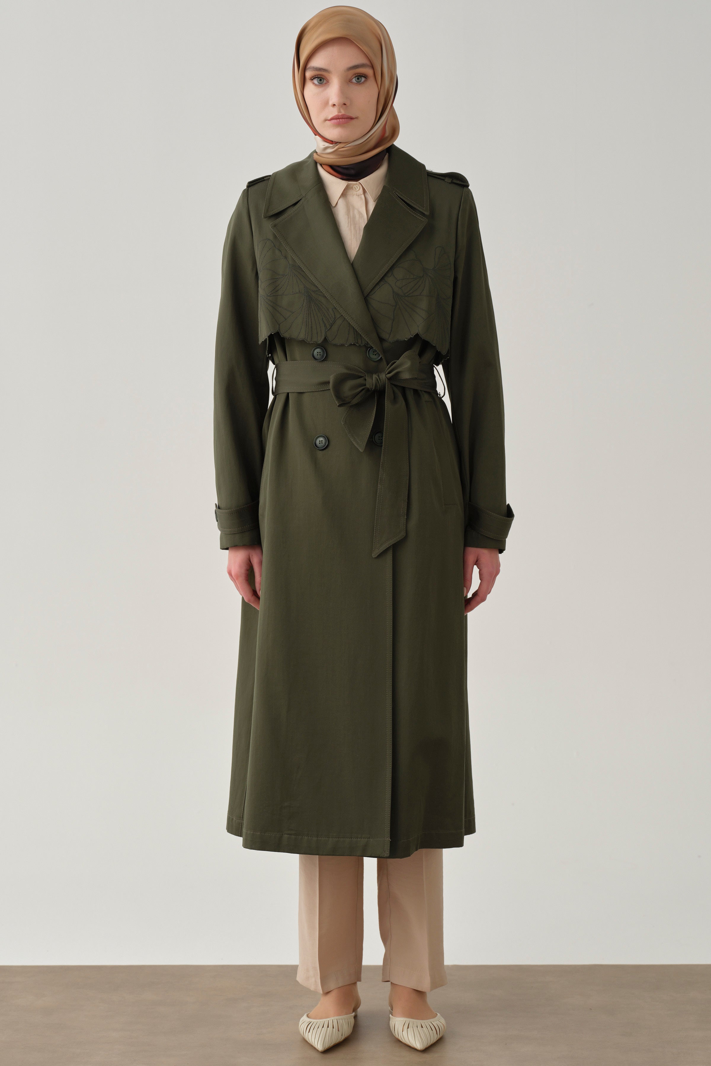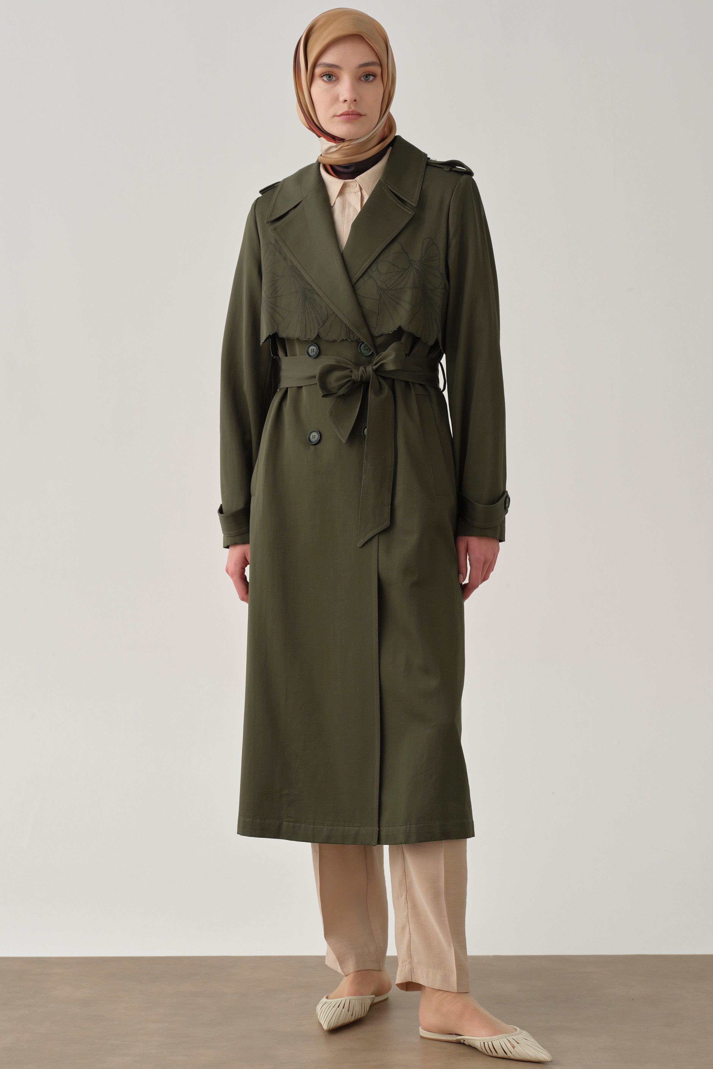 Rüzgarlık Nakış Detaylı Trençkot - Haki
