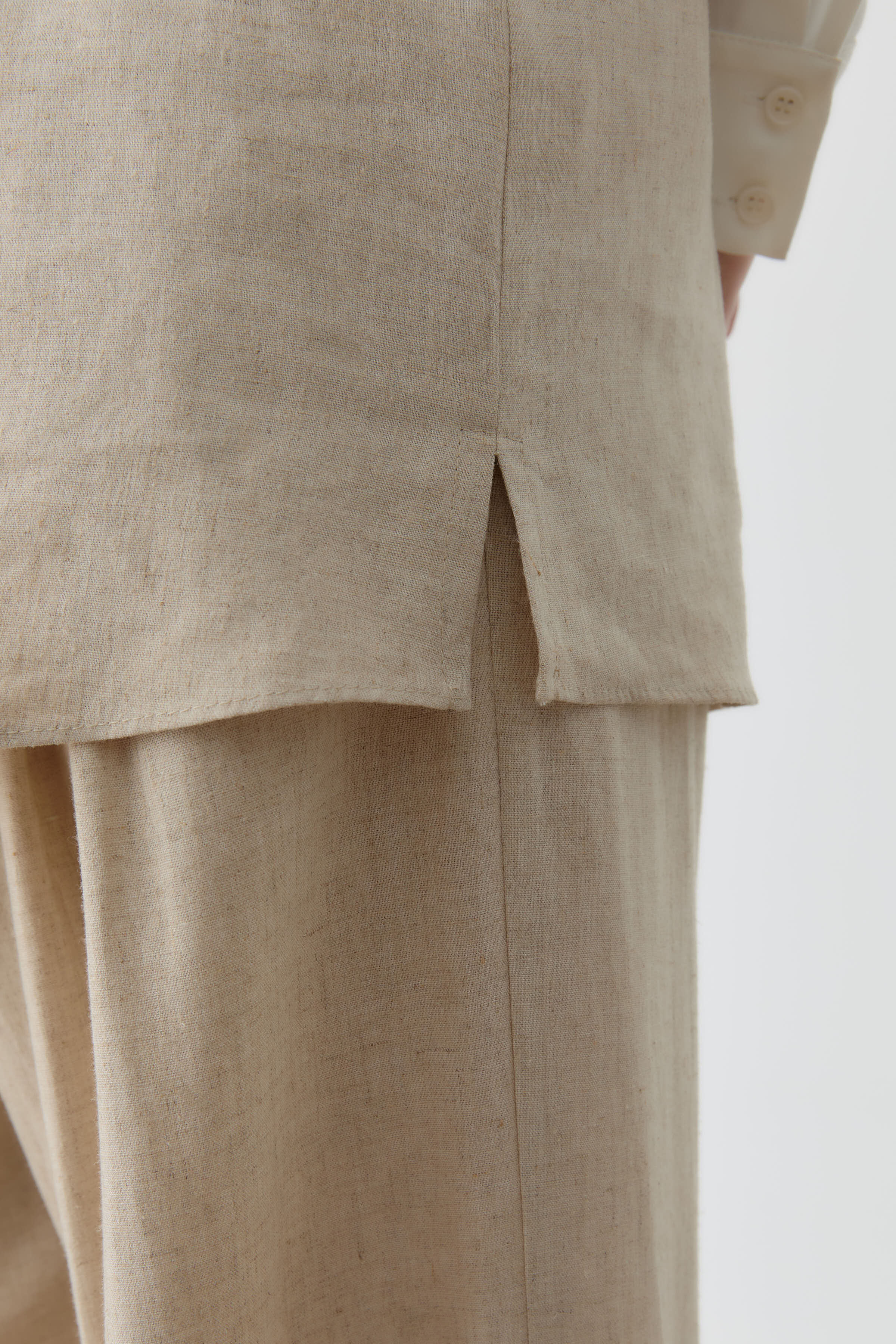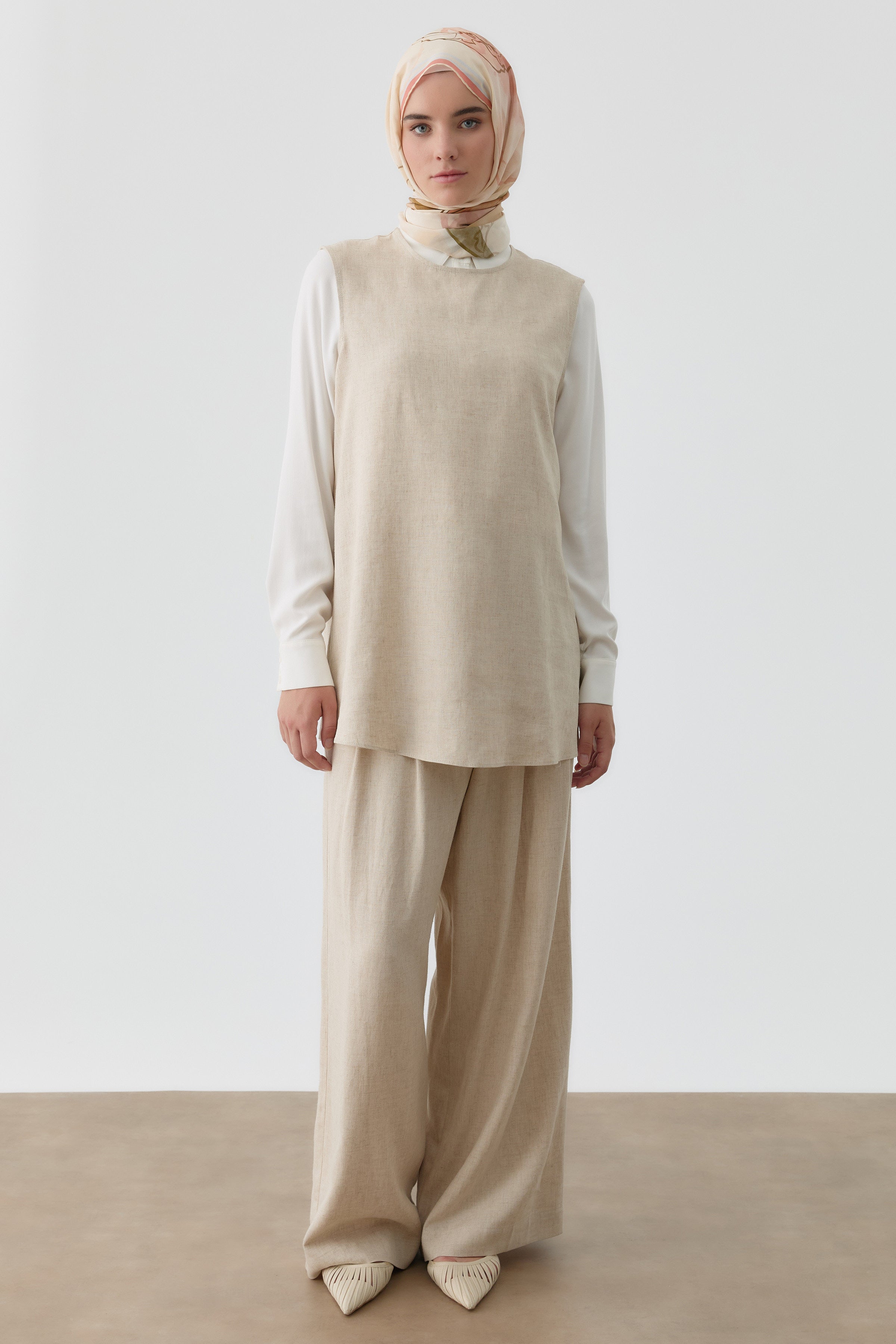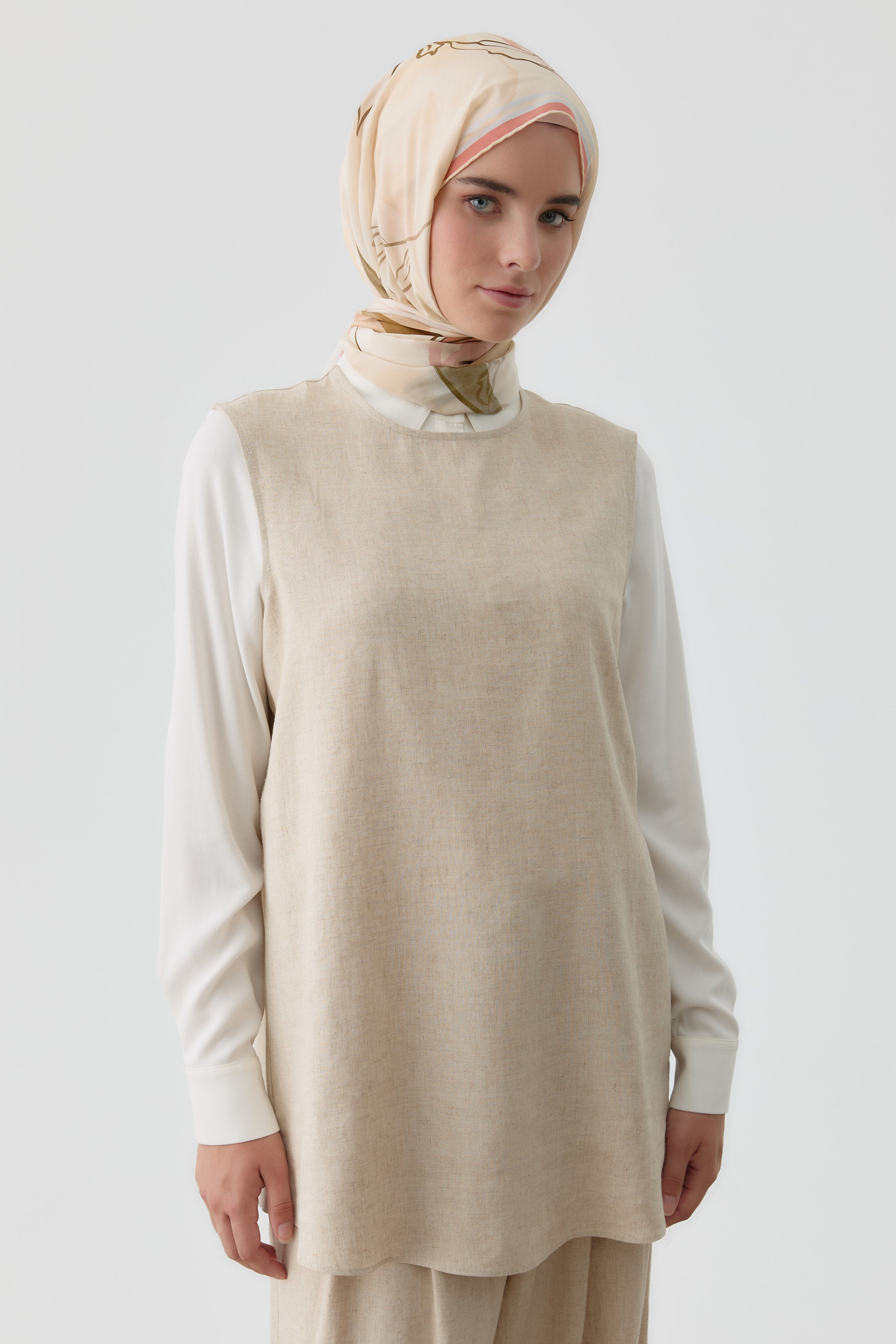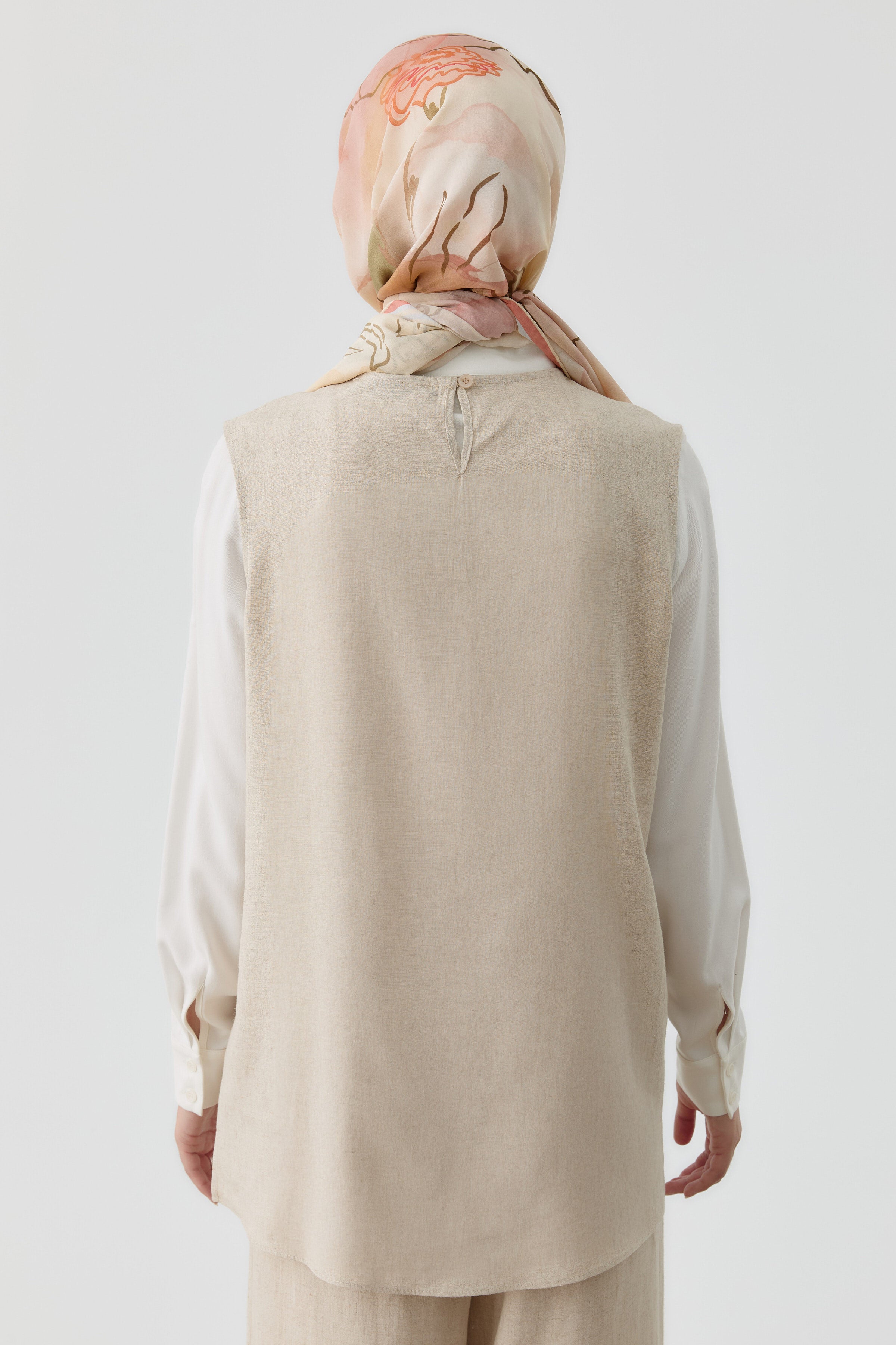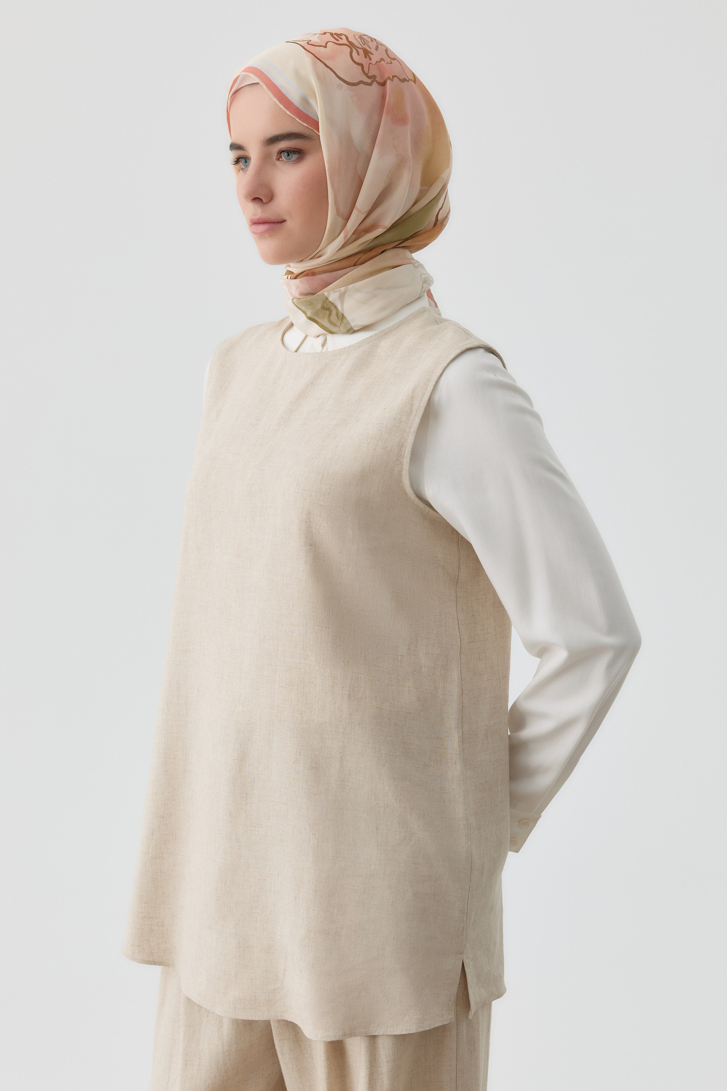 Doğal ketenin nefes alabilen dokusuyla tasarlanan bu sıfır kol bluz, sıcak havalarda serin ve rahat bir kullanım sunar. Minimalist çizgileri ve zamansız tasarımı sayesinde ister günlük kombinlerde sade bir şıklık, ister katmanlı görünümlerde modern bir stil elde edebilirsiniz.