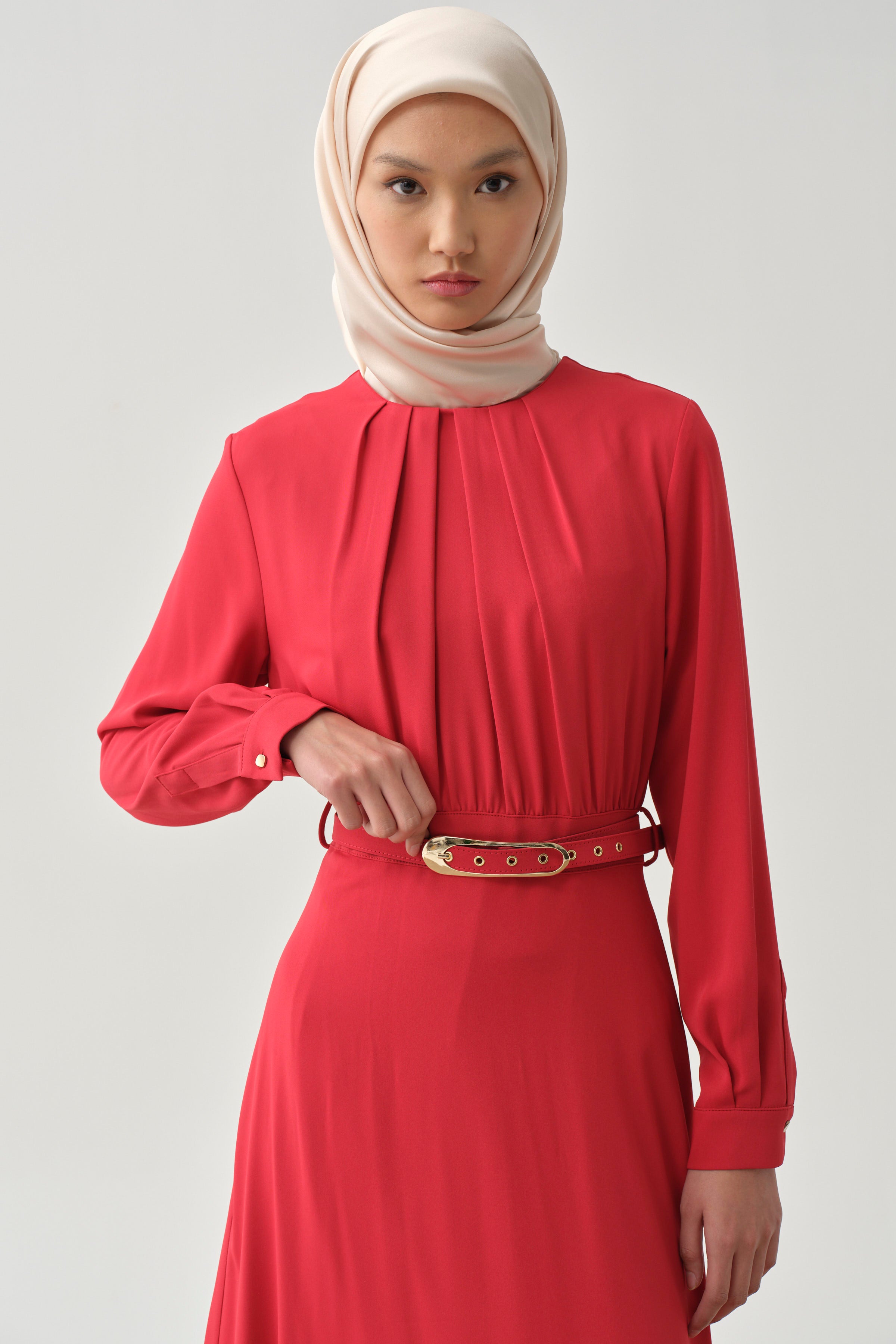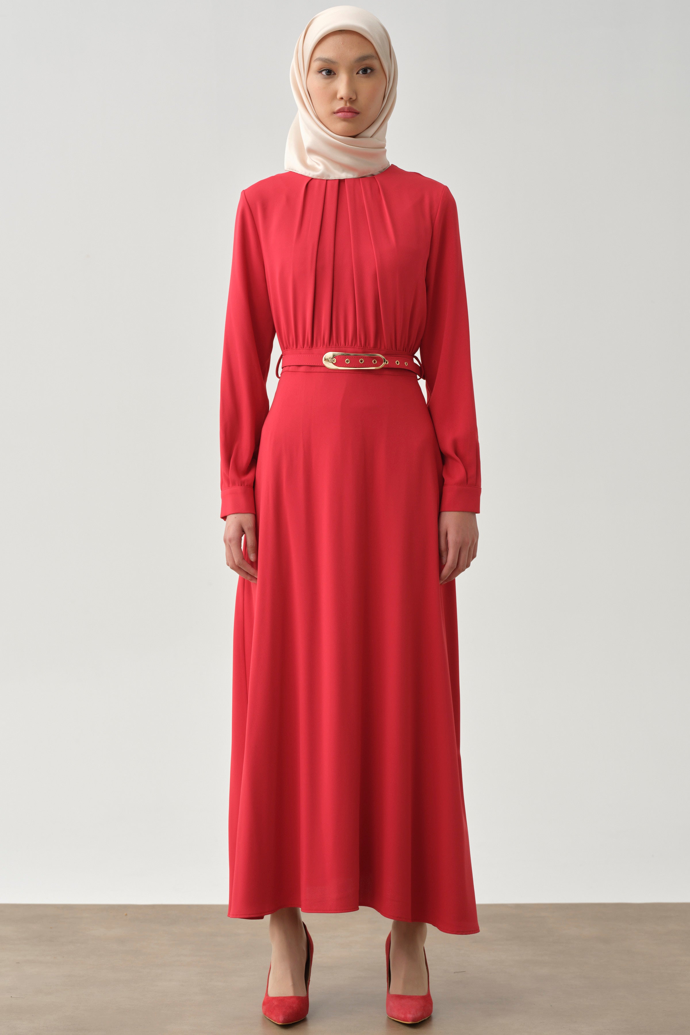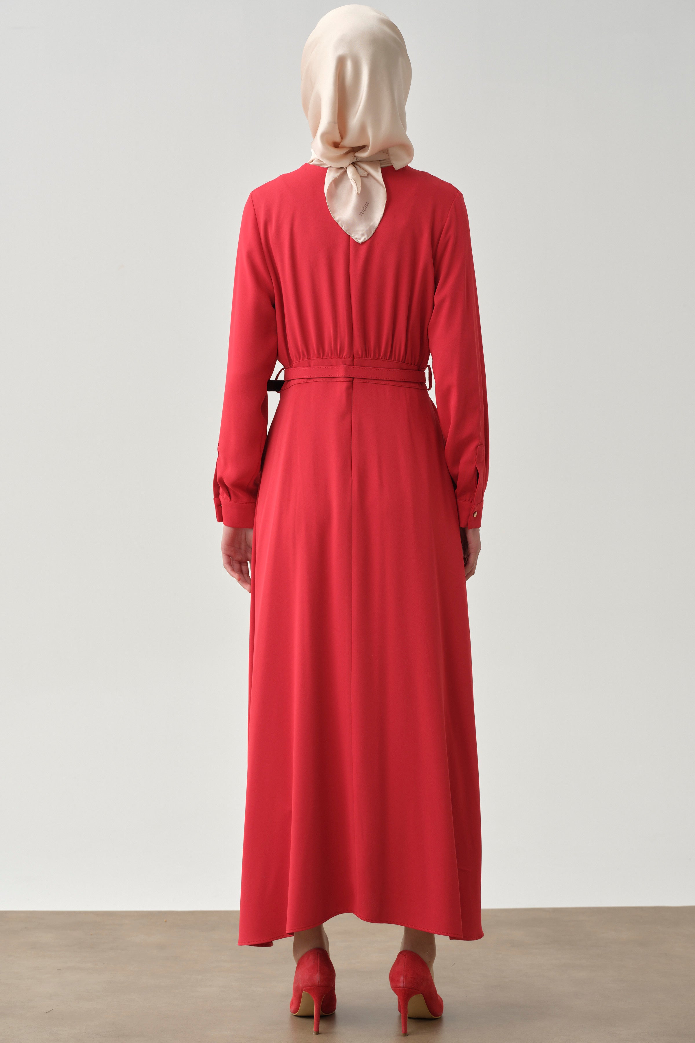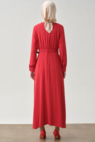 Büzgü Detaylı Kemerli Elbise - Kırmızı