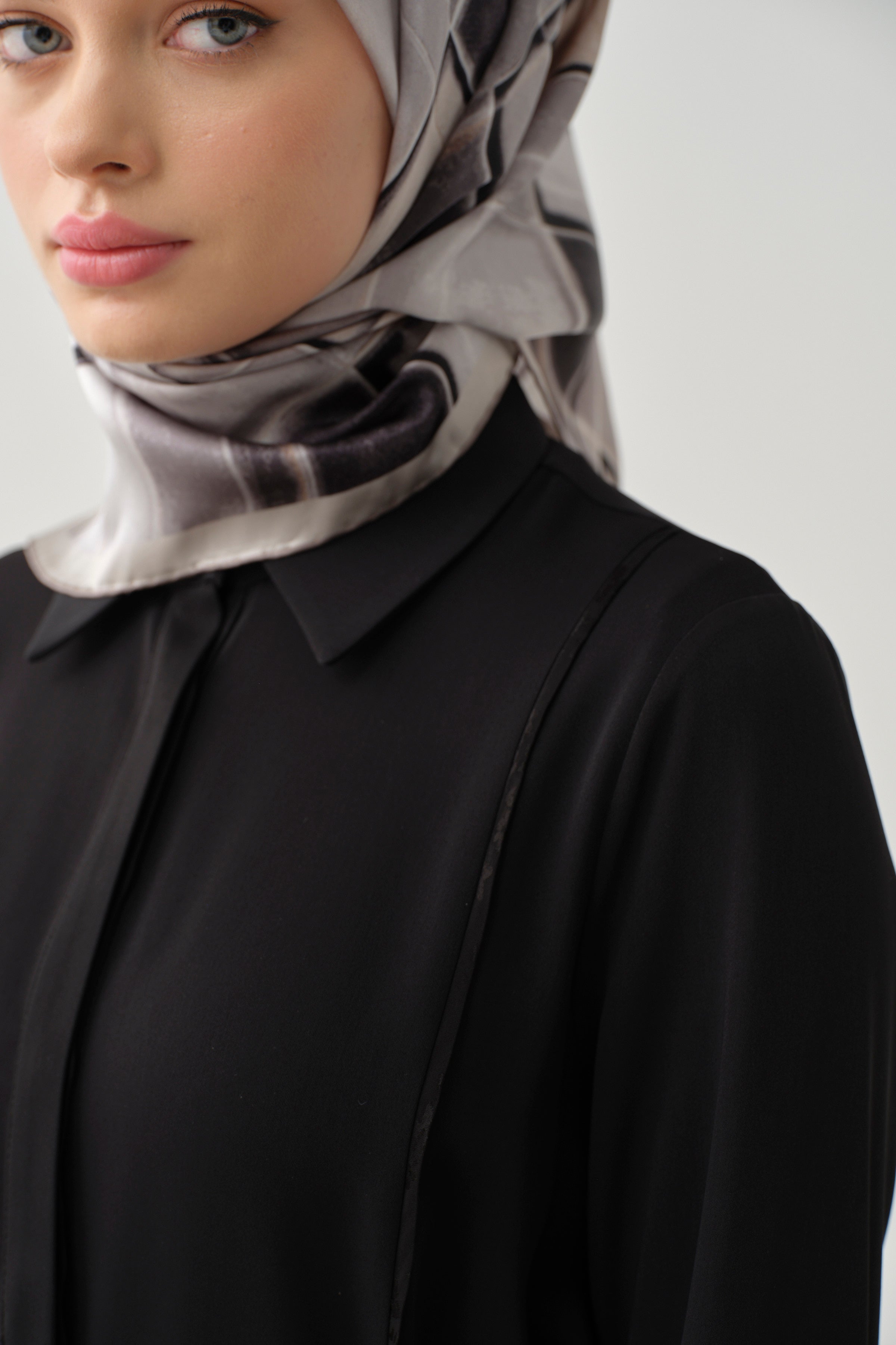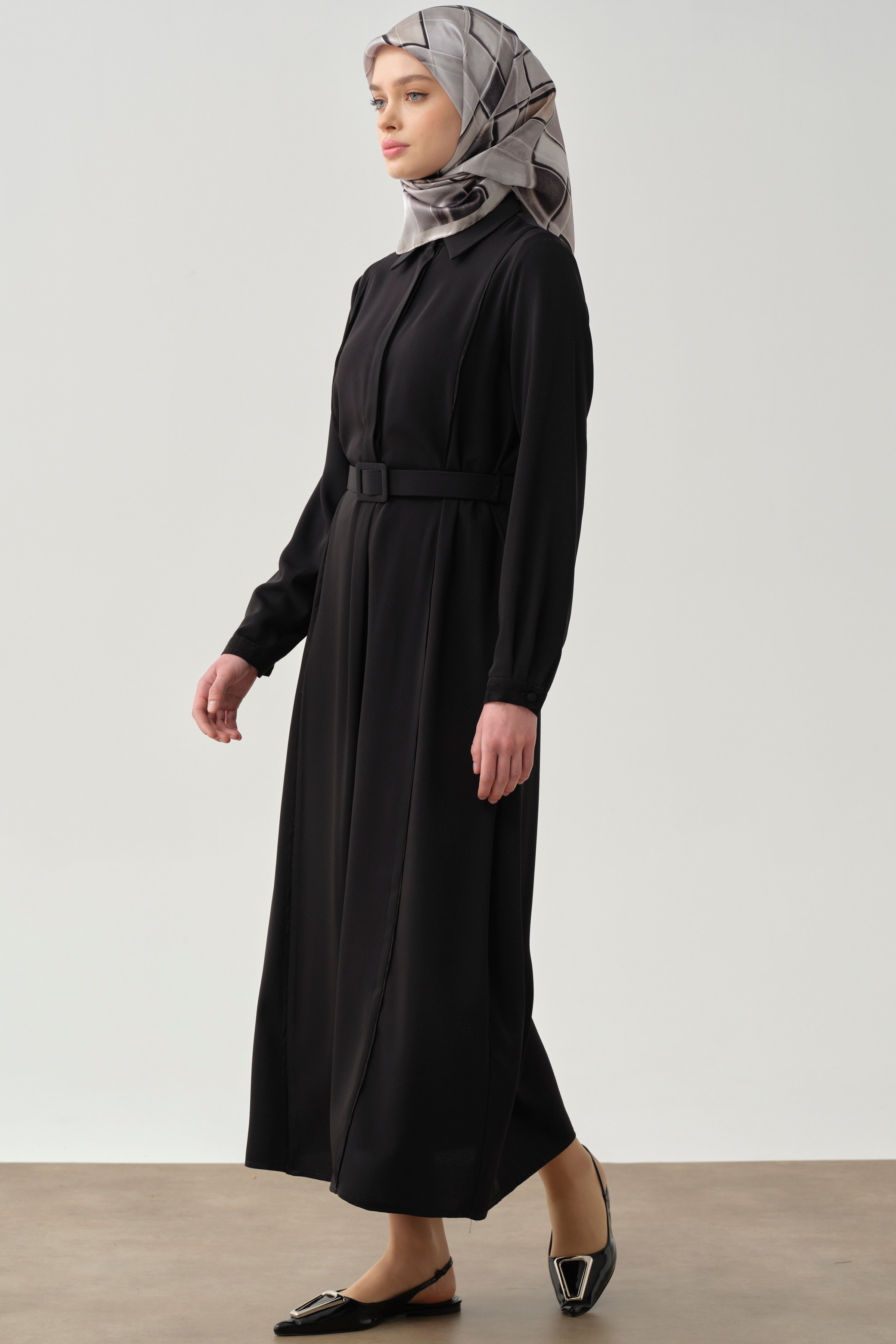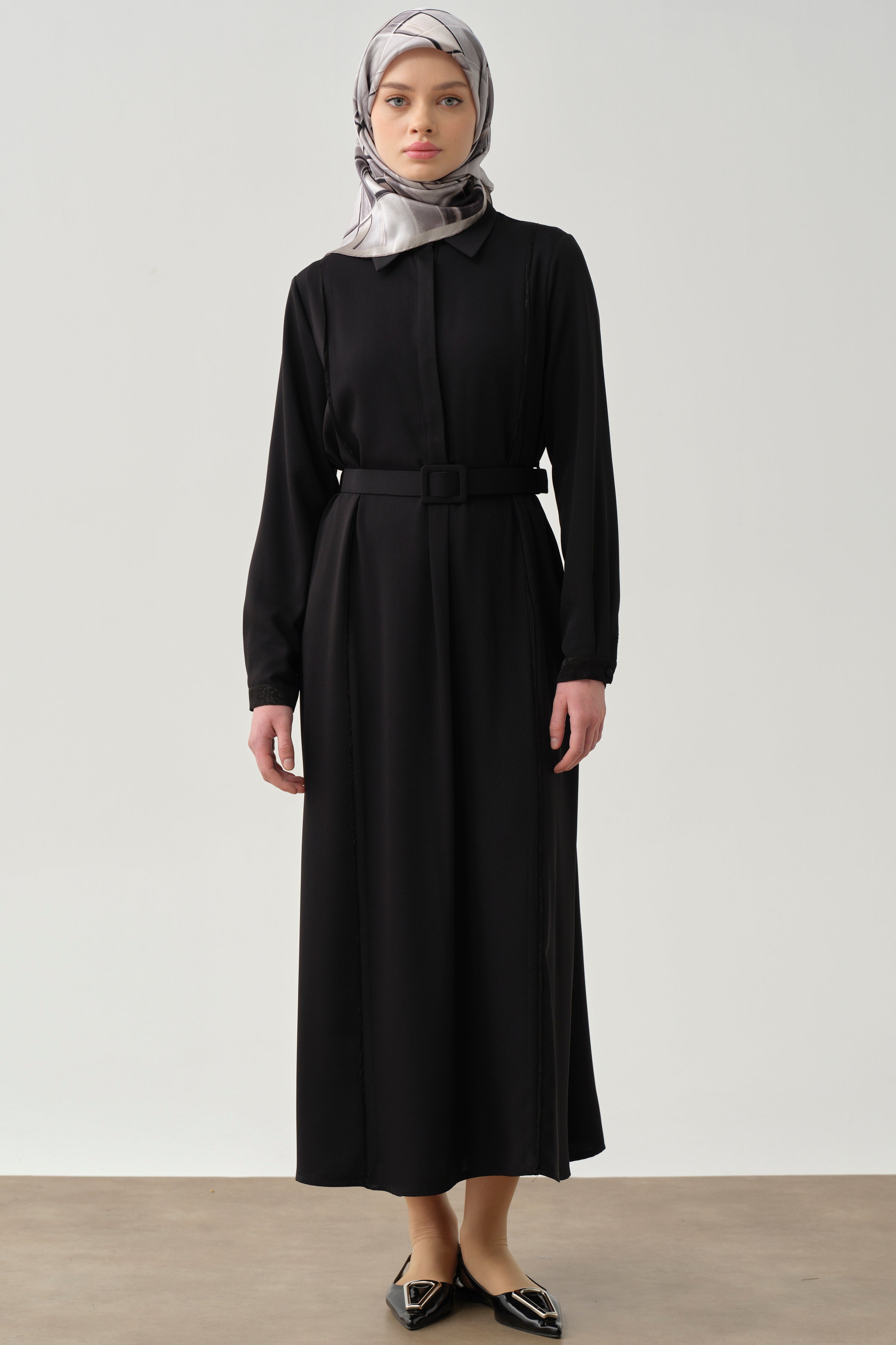 Gömlek yaka detayı, klasik şıklığı ve zarafeti bir araya getirirken, garnili detaylar ise elbiseye hareketli ve dinamik bir görünüm katıyor. Hem günlük şıklık hem de özel davetler için ideal bir seçenek.