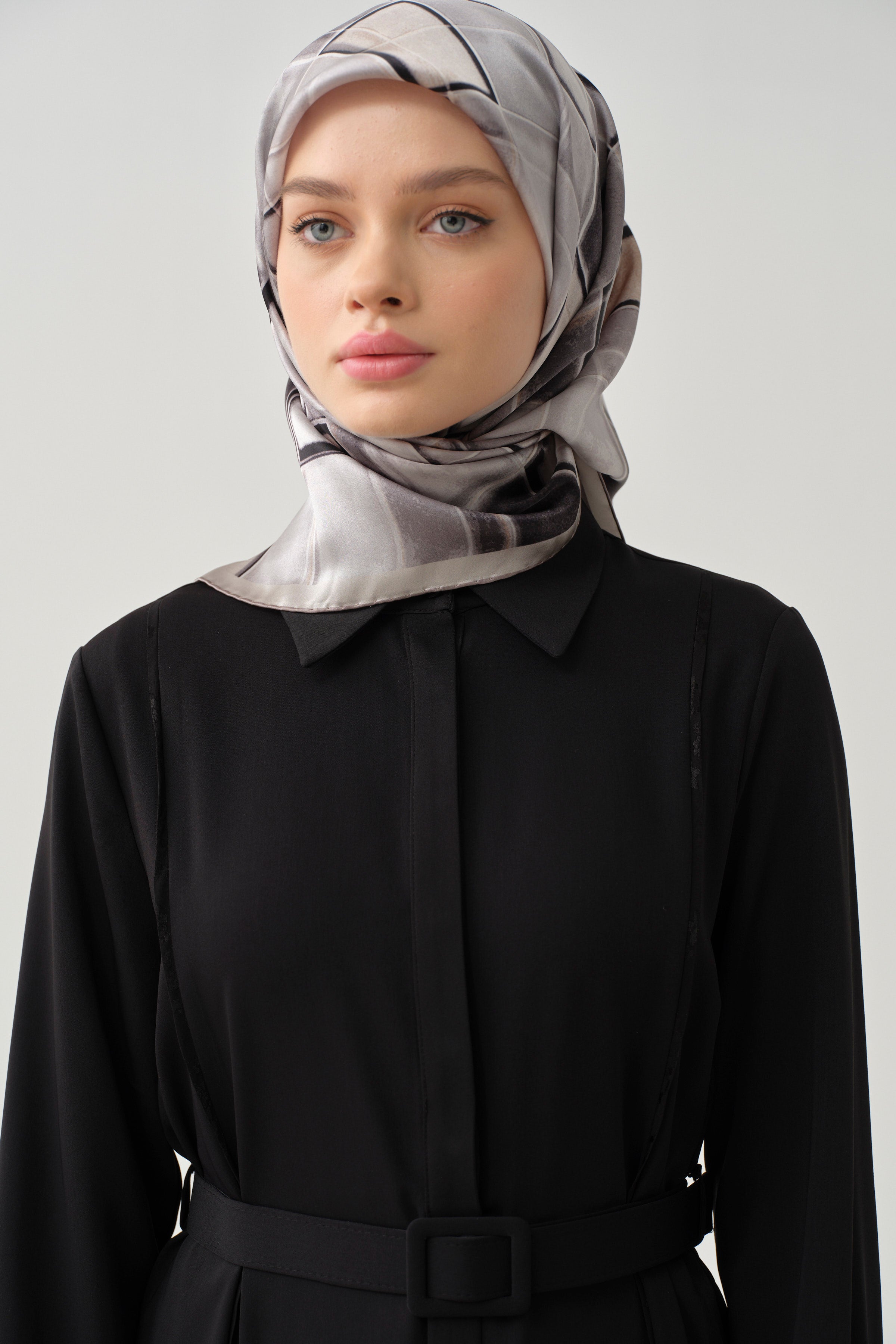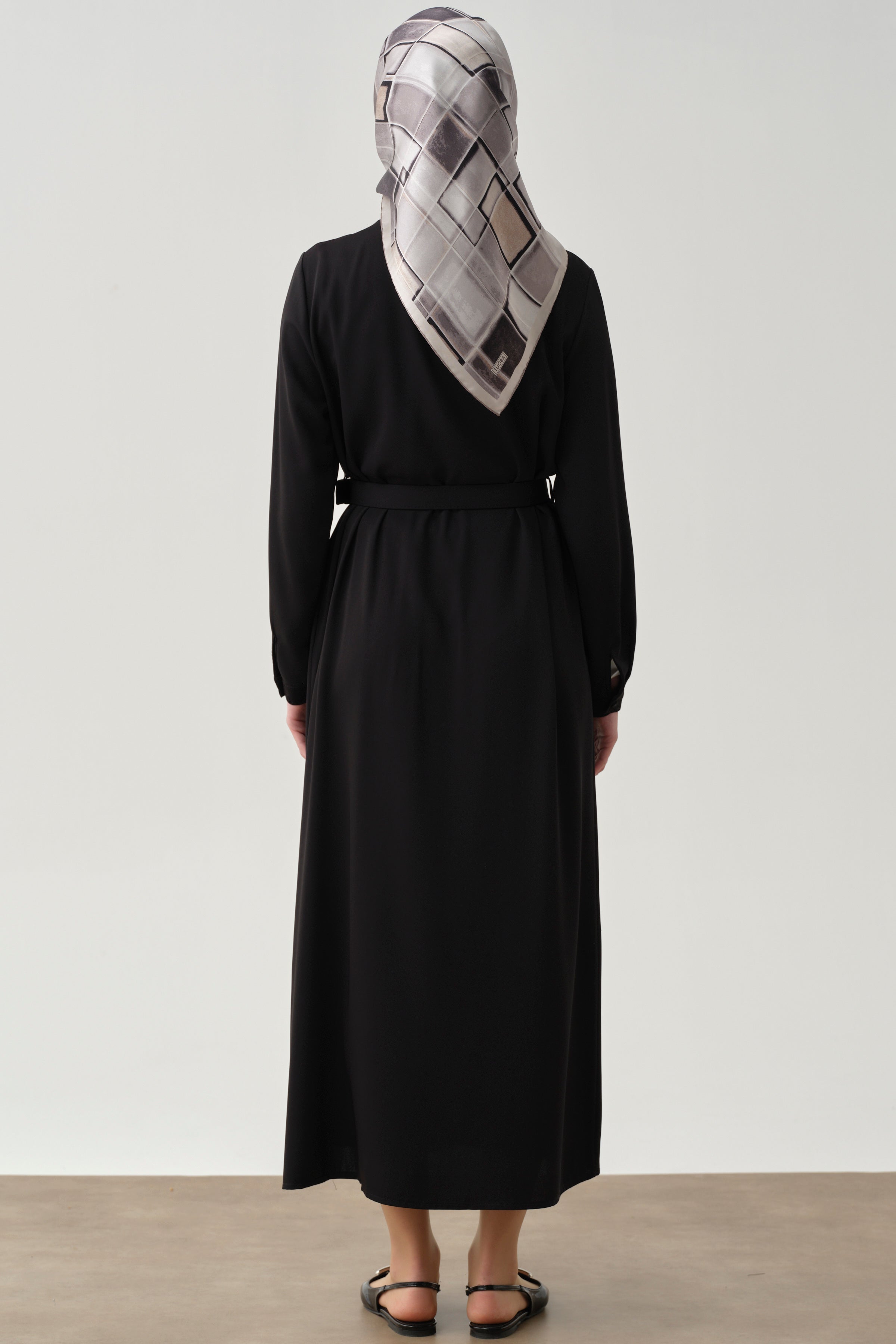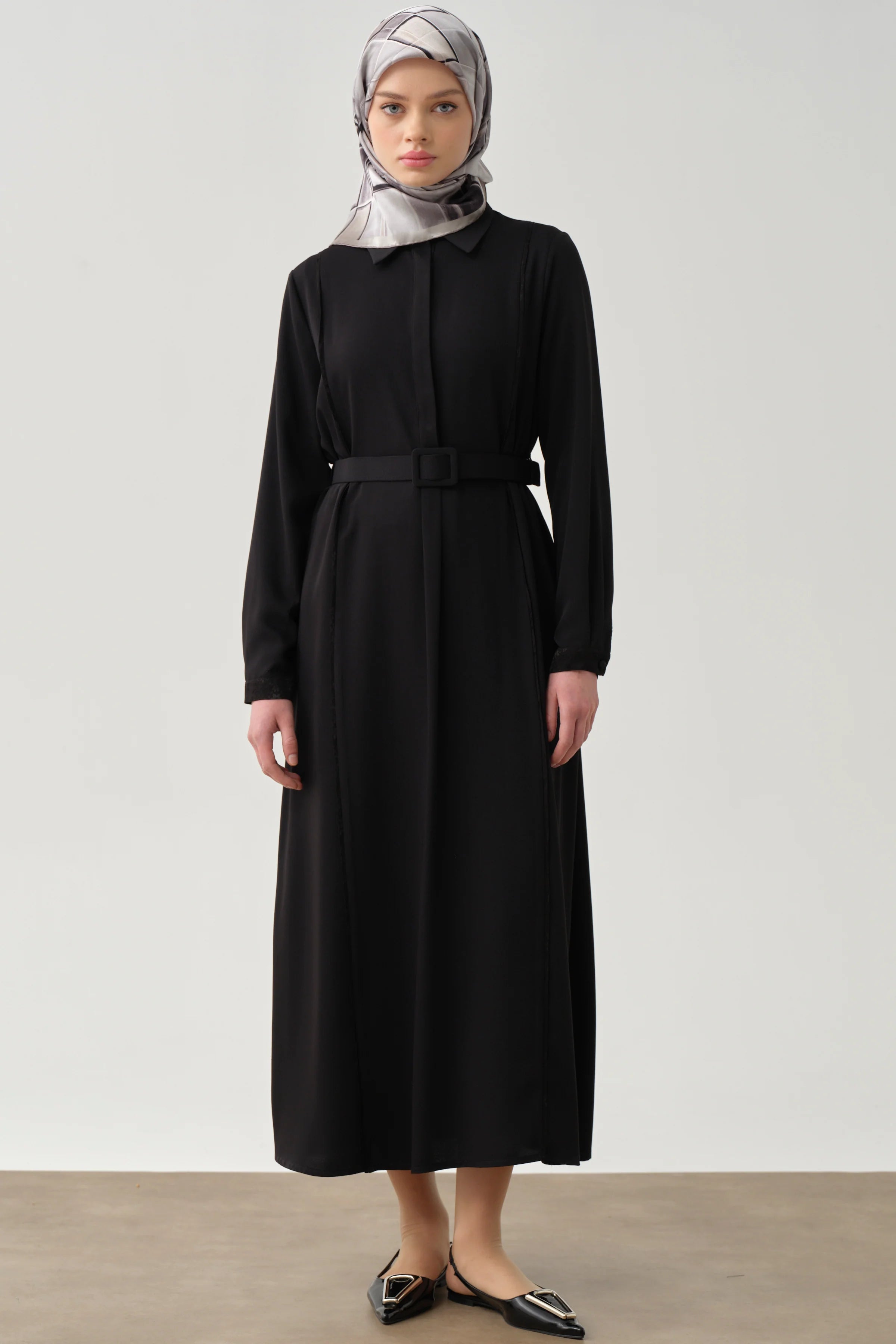 Gömlek yaka detayı, klasik şıklığı ve zarafeti bir araya getirirken, garnili detaylar ise elbiseye hareketli ve dinamik bir görünüm katıyor. Hem günlük şıklık hem de özel davetler için ideal bir seçenek.
