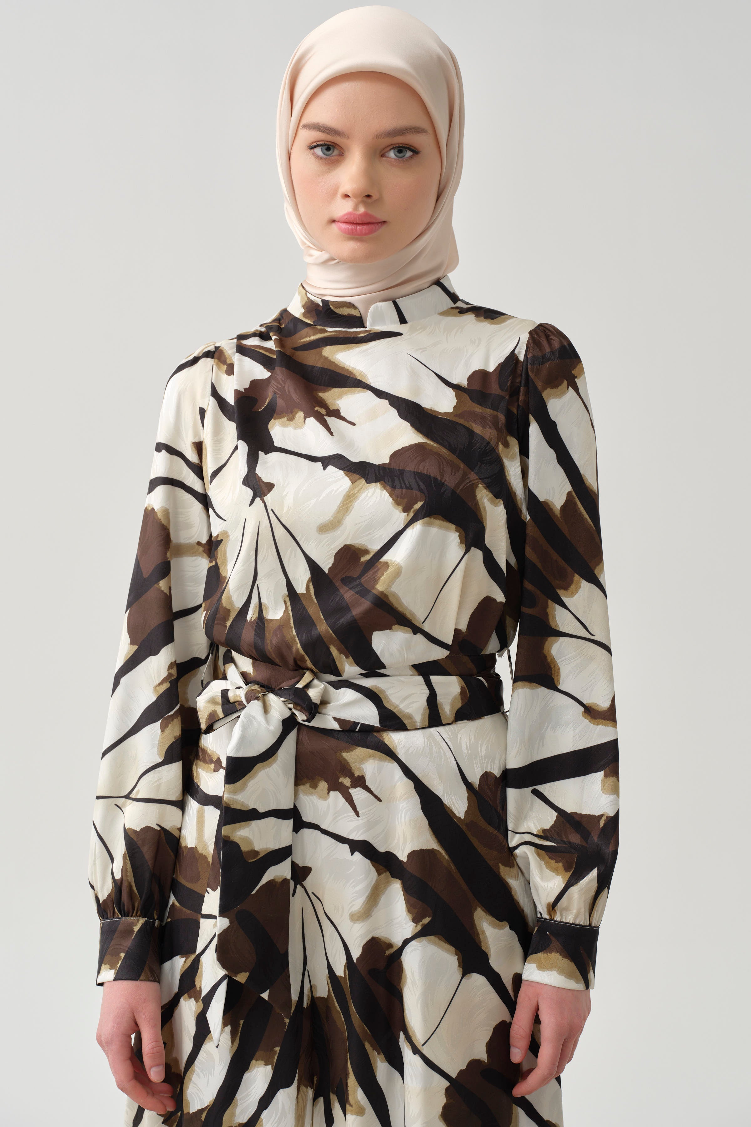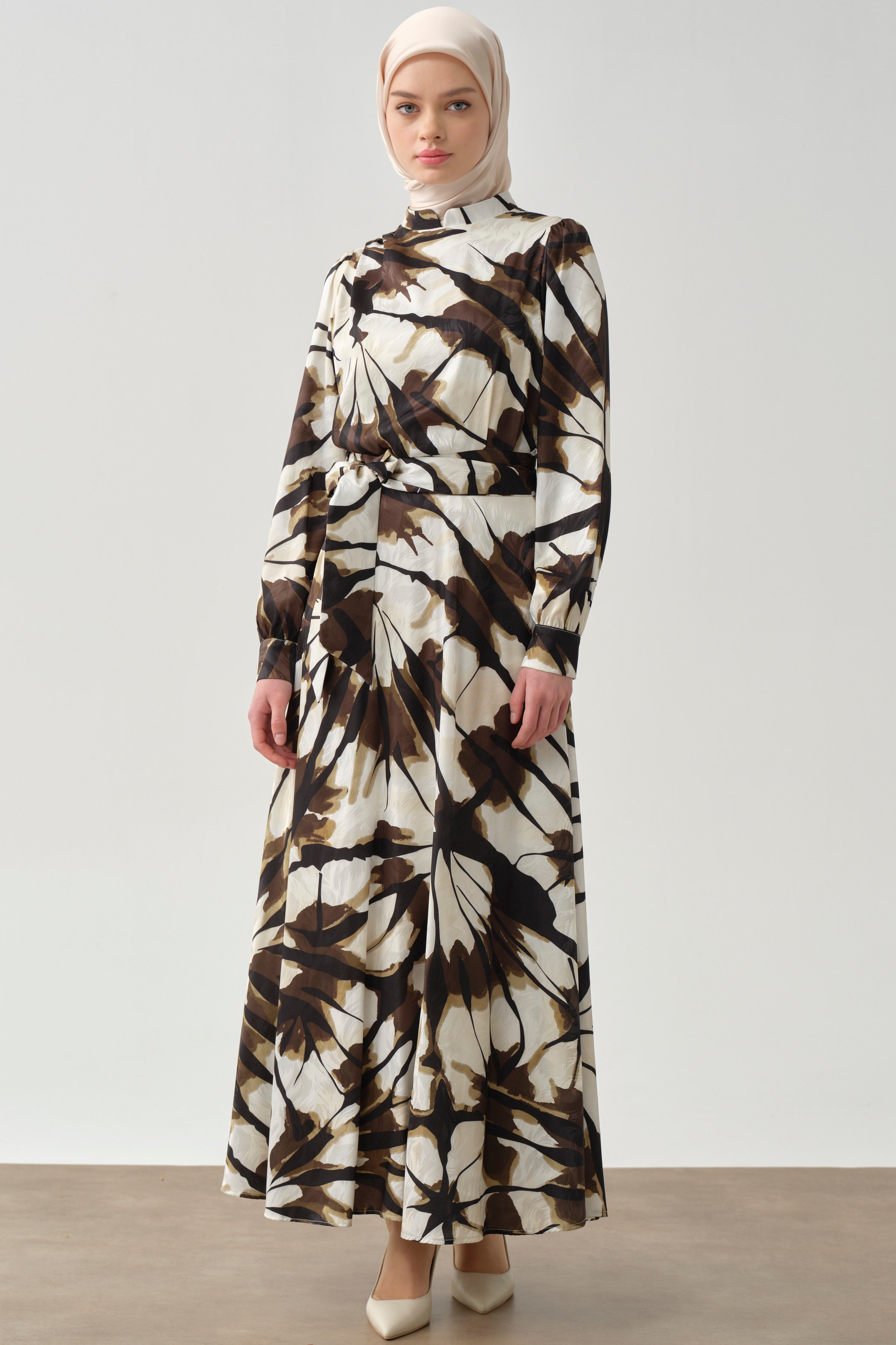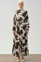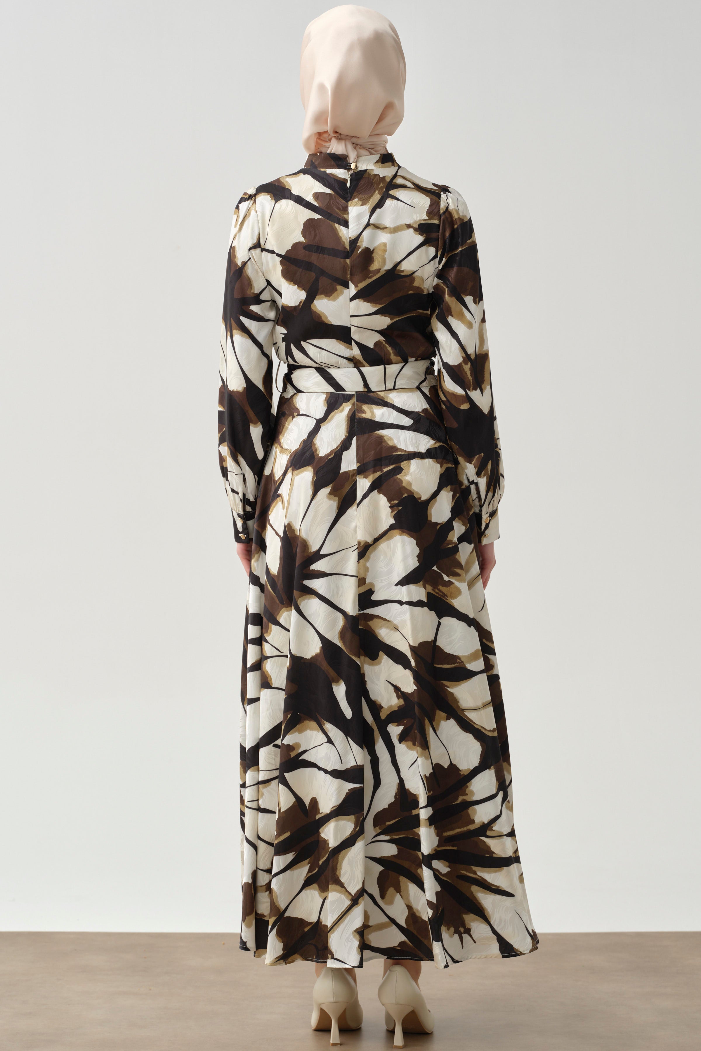 Pile Ve Büzgü Detaylı Desenli Elbise - Siyah