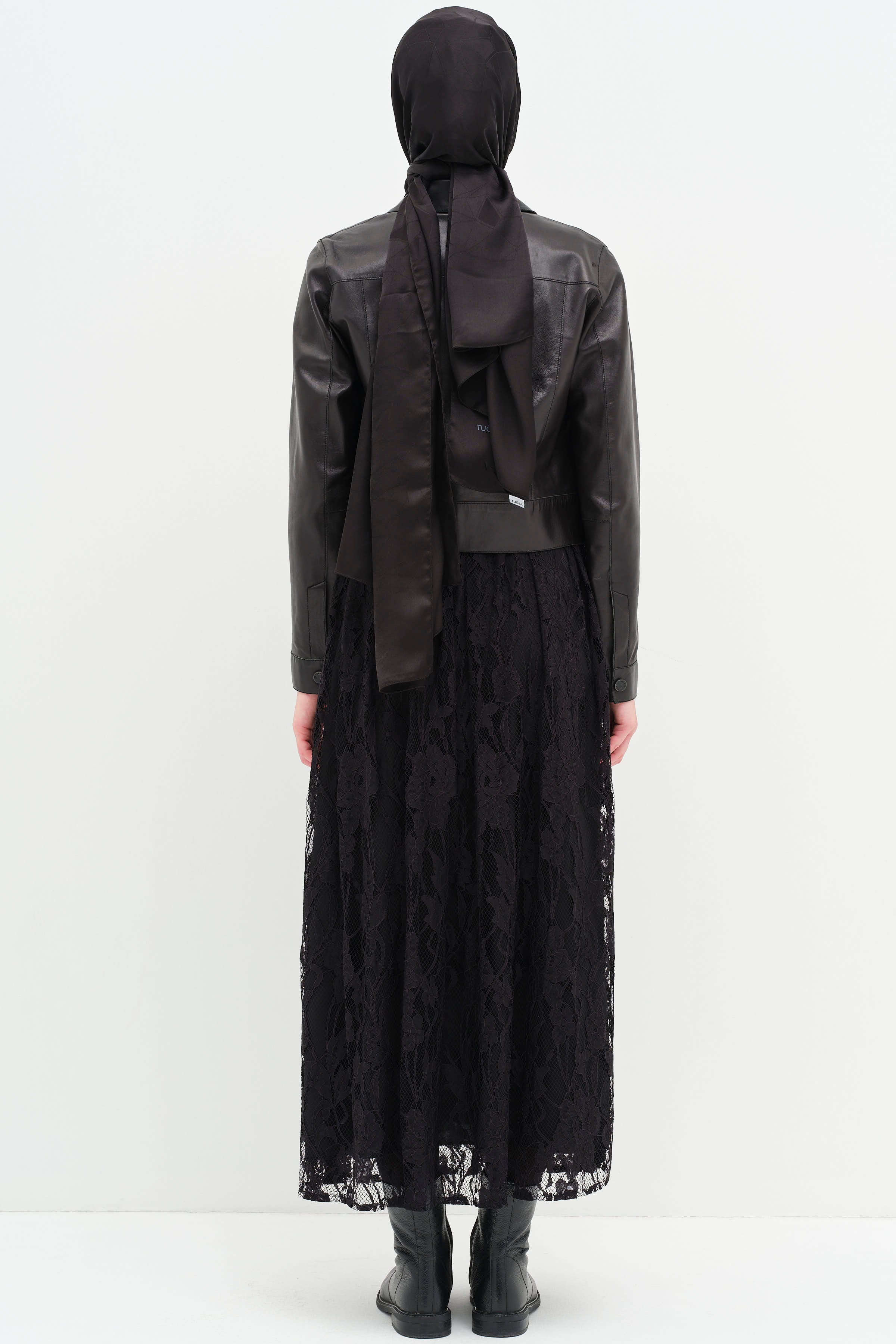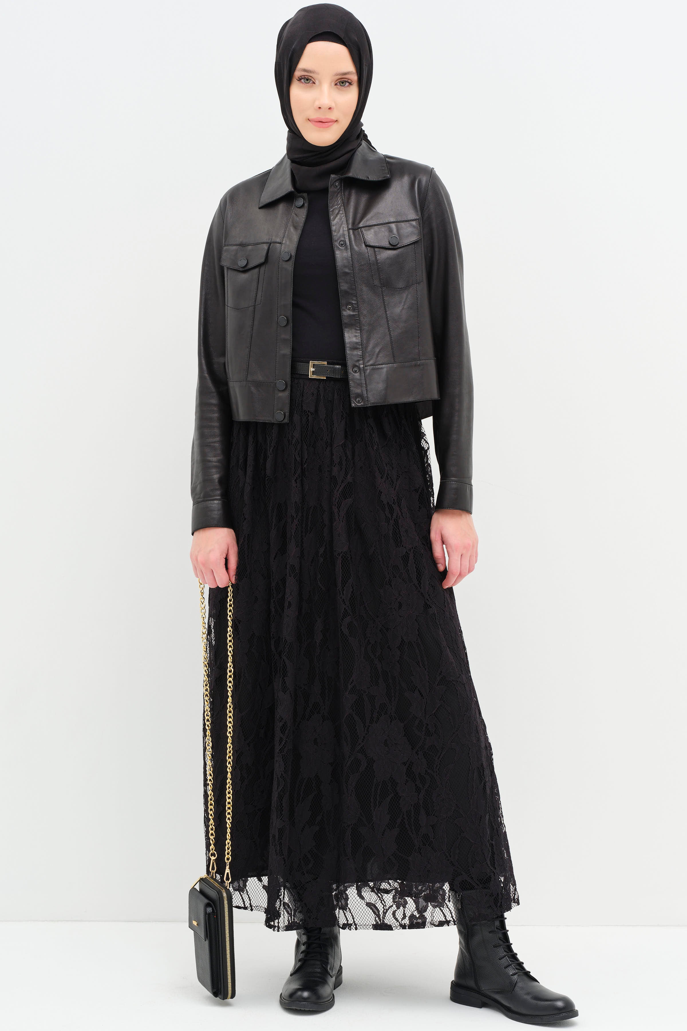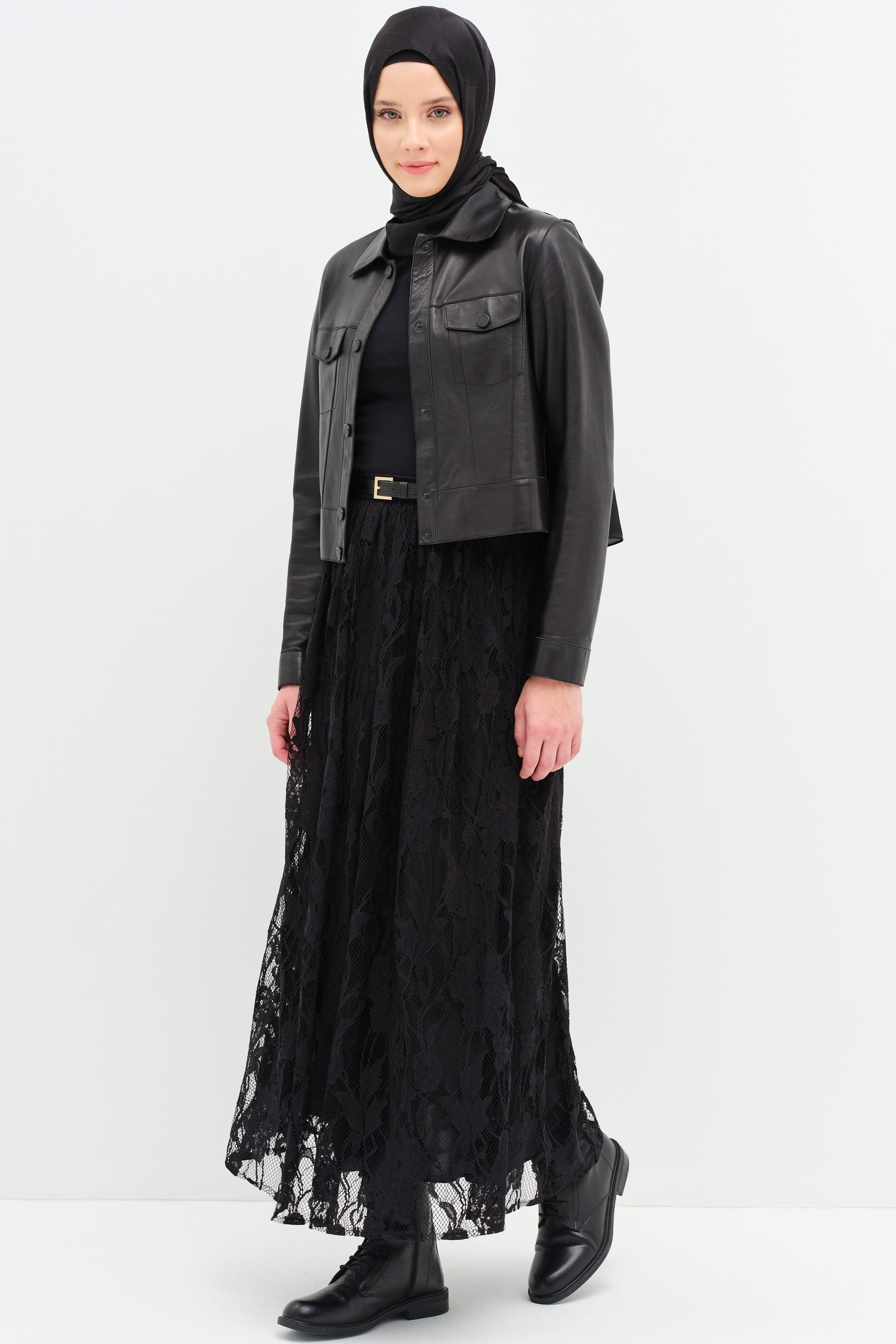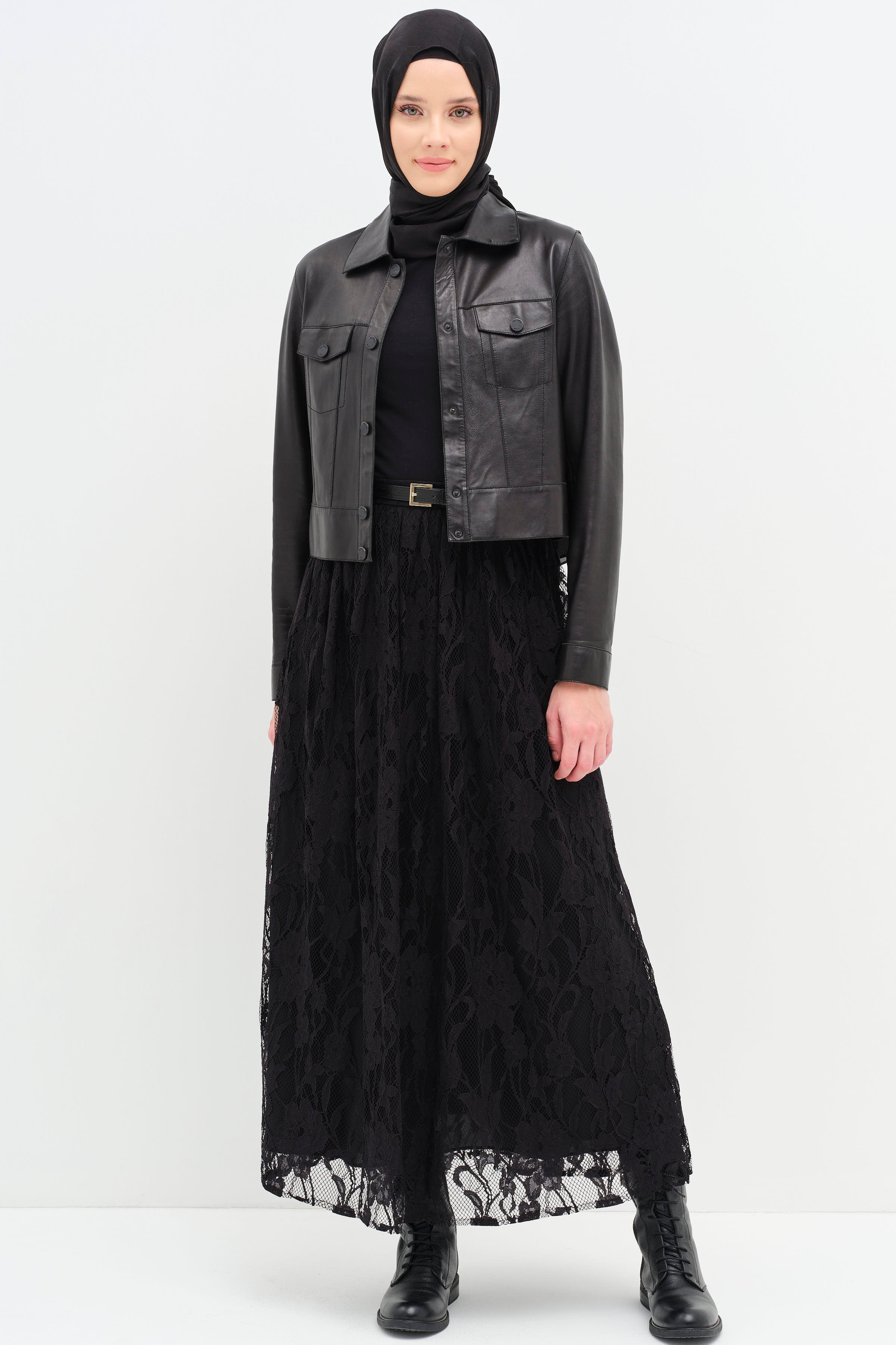 Hazır Deri Kemerli Dantel Etek - Siyah