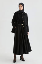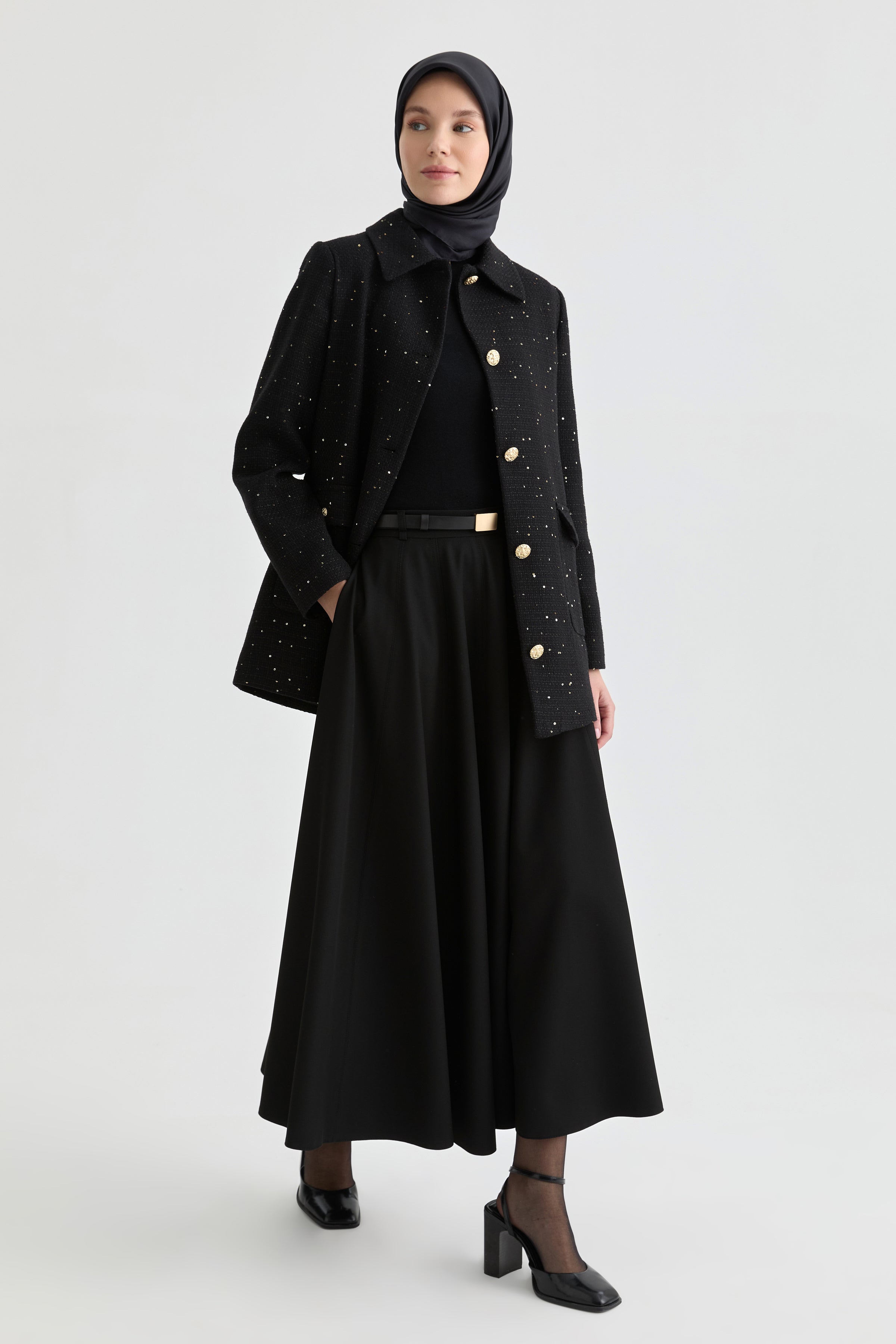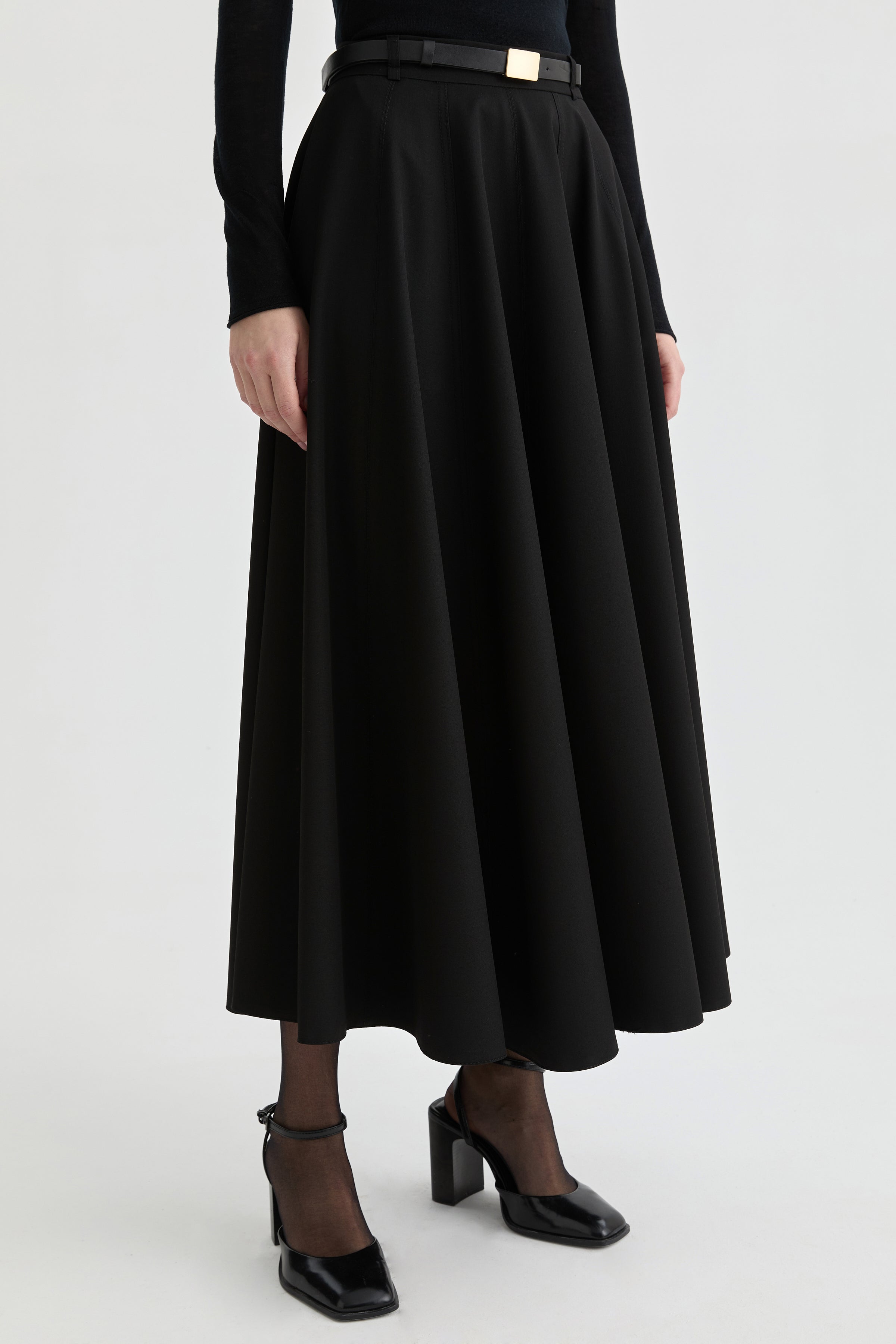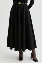 Kemerli godeli etek, hareket kazandıran genişleyerek açılan formu ile feminen bir siluet sunar. Bel kısmındaki kemer, duruşu toparlarken aynı zamanda modele zarif bir vurgu ekler.