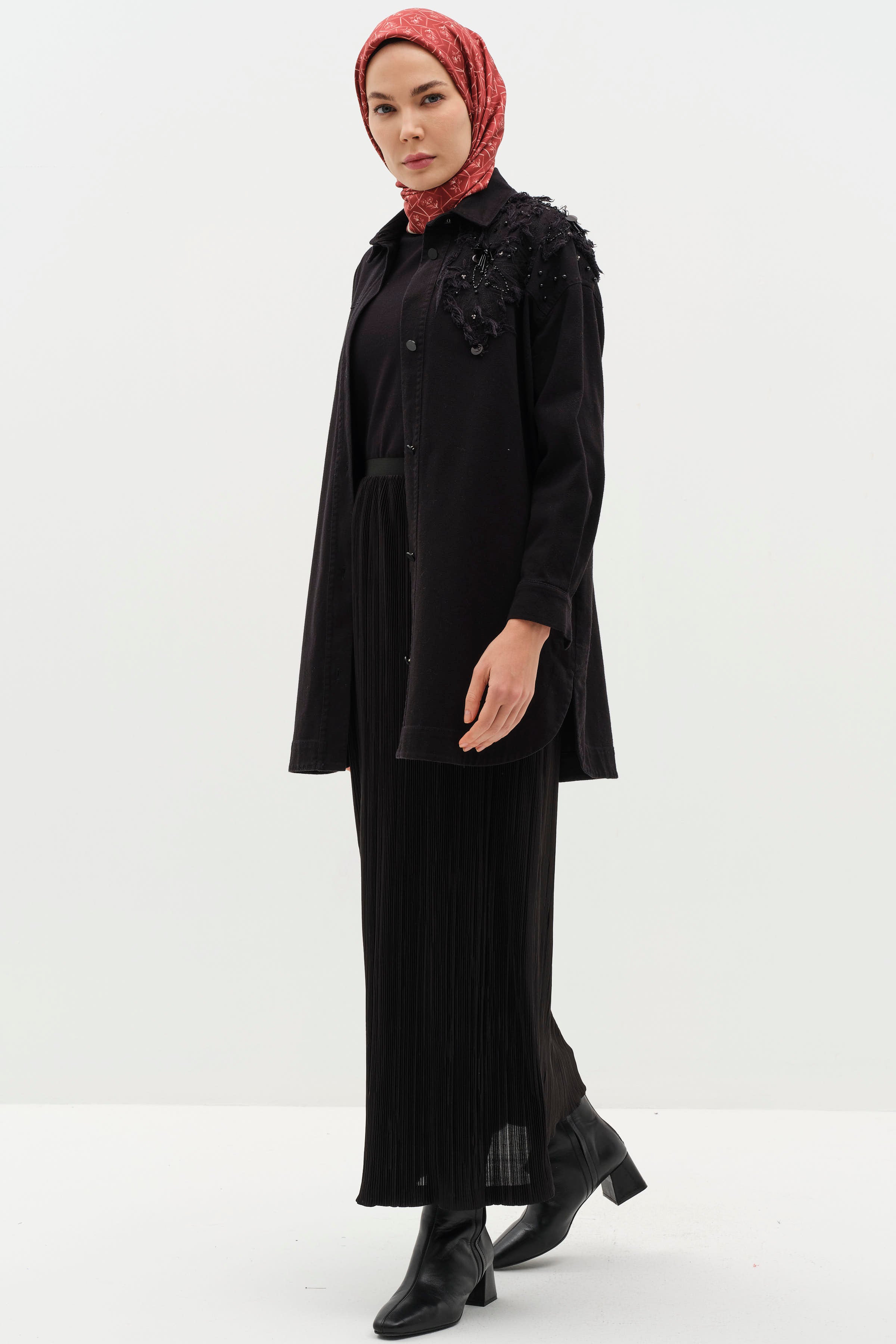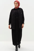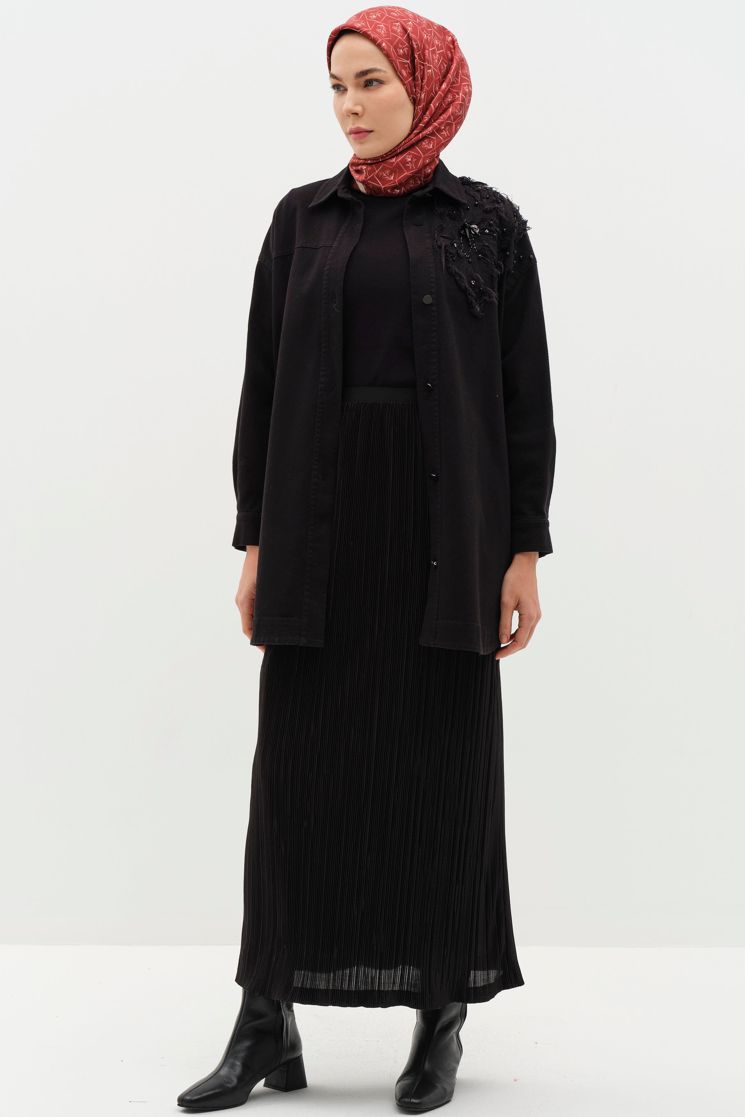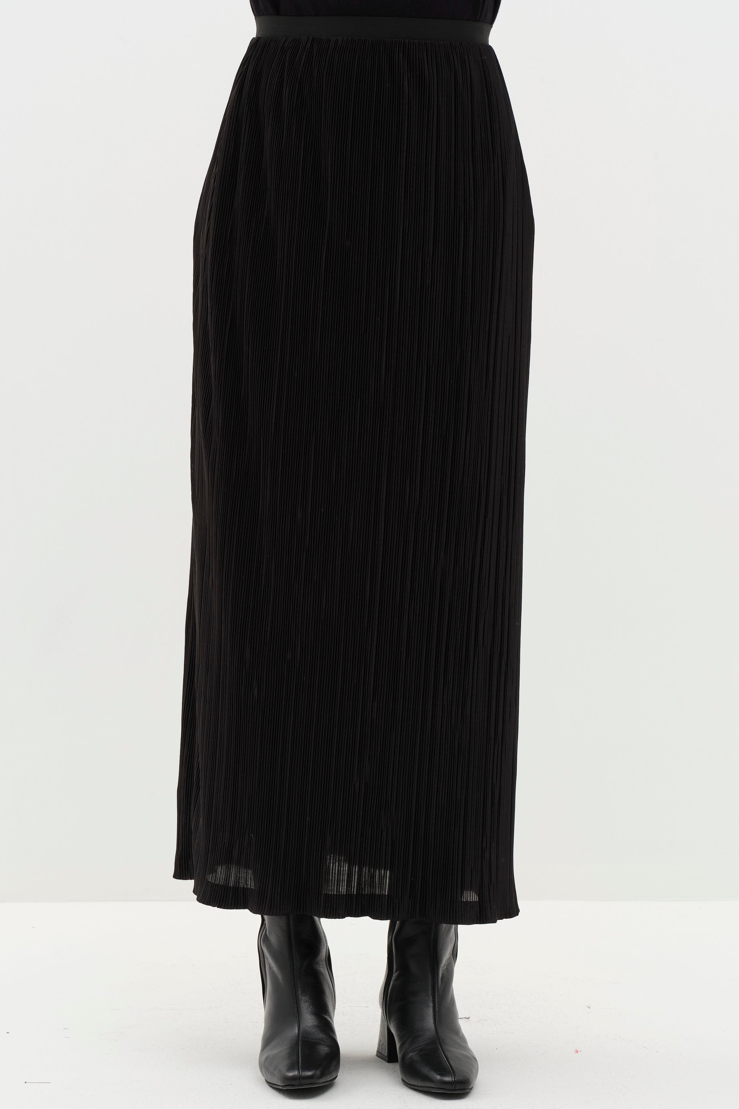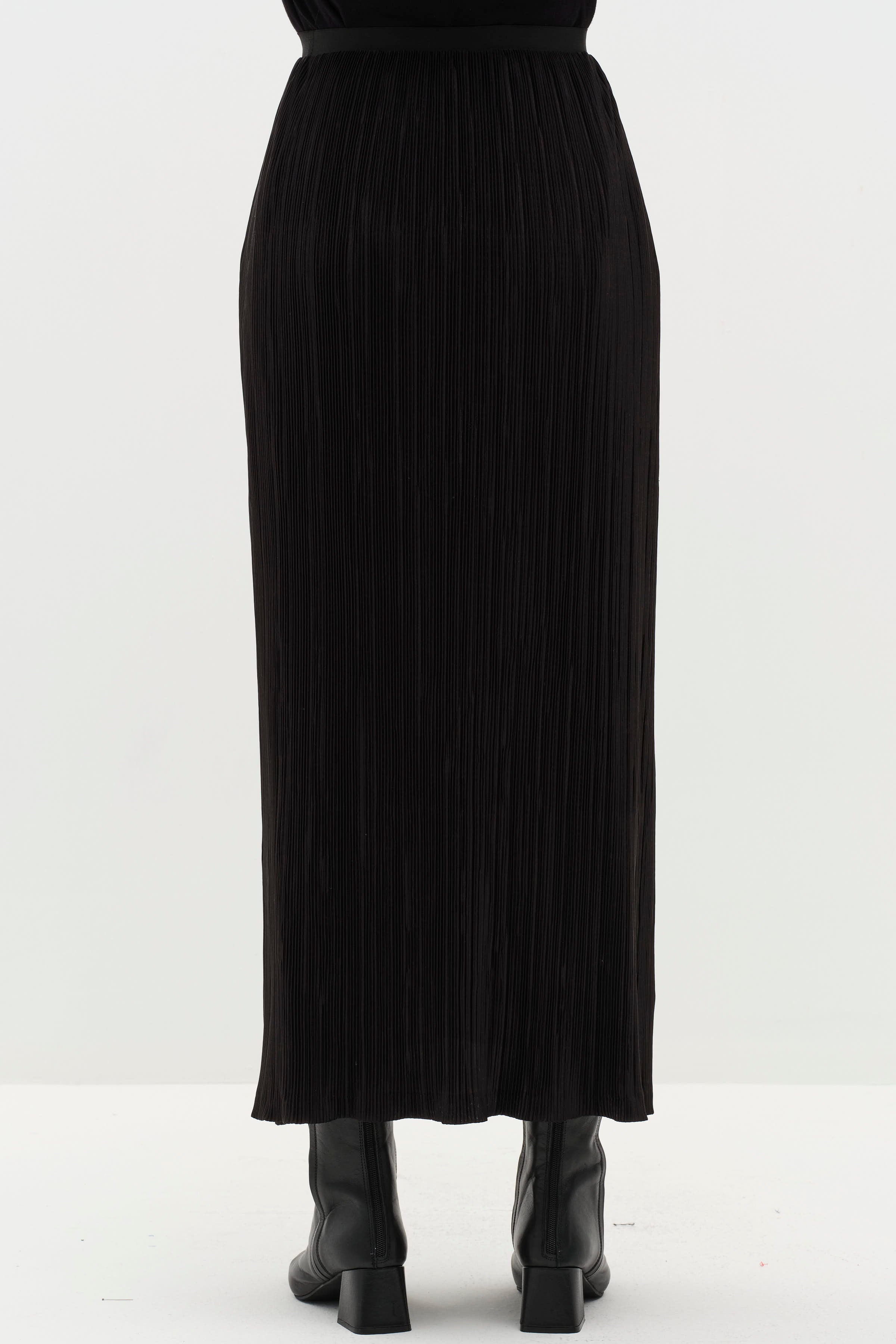 Bel Lastikli Plisoley Etek, rahat ve şık bir stil sunar. Belindeki lastik detayı konfor sağlarken, plisoley dokusu eteğe zarif bir hareket katar.