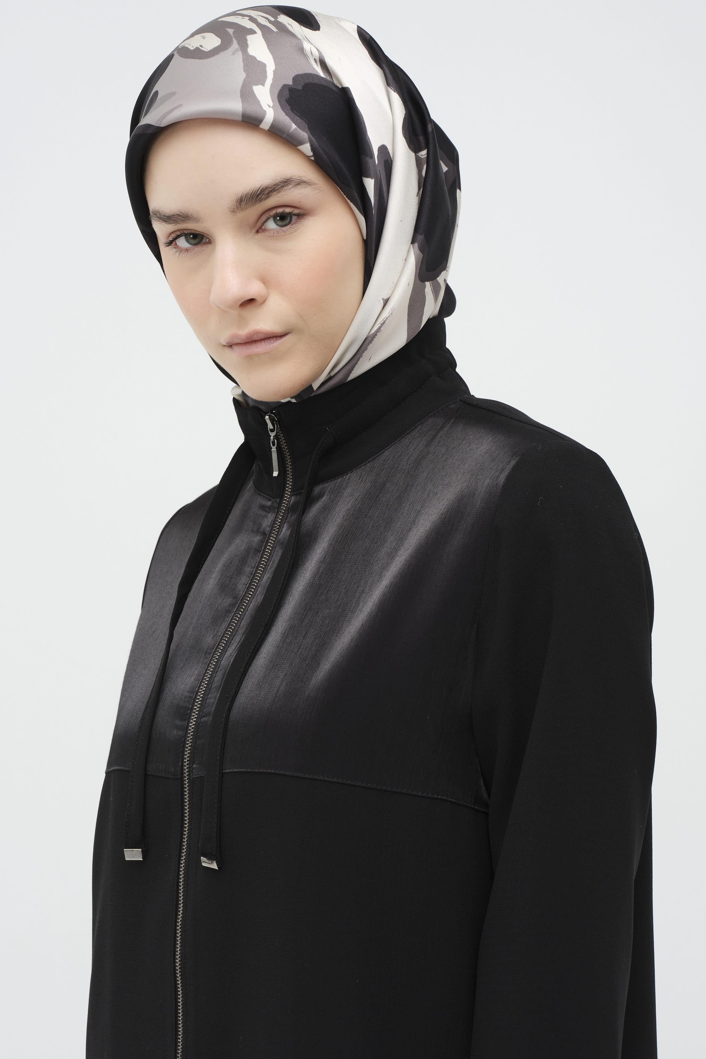 Modern çizgiler taşıyan bu ferace, fermuar kapama ve şık garnil detaylarıyla zarafeti buluşturuyor. Gün boyu rahatlık ve şıklık arayanlar için ideal bir tercih.