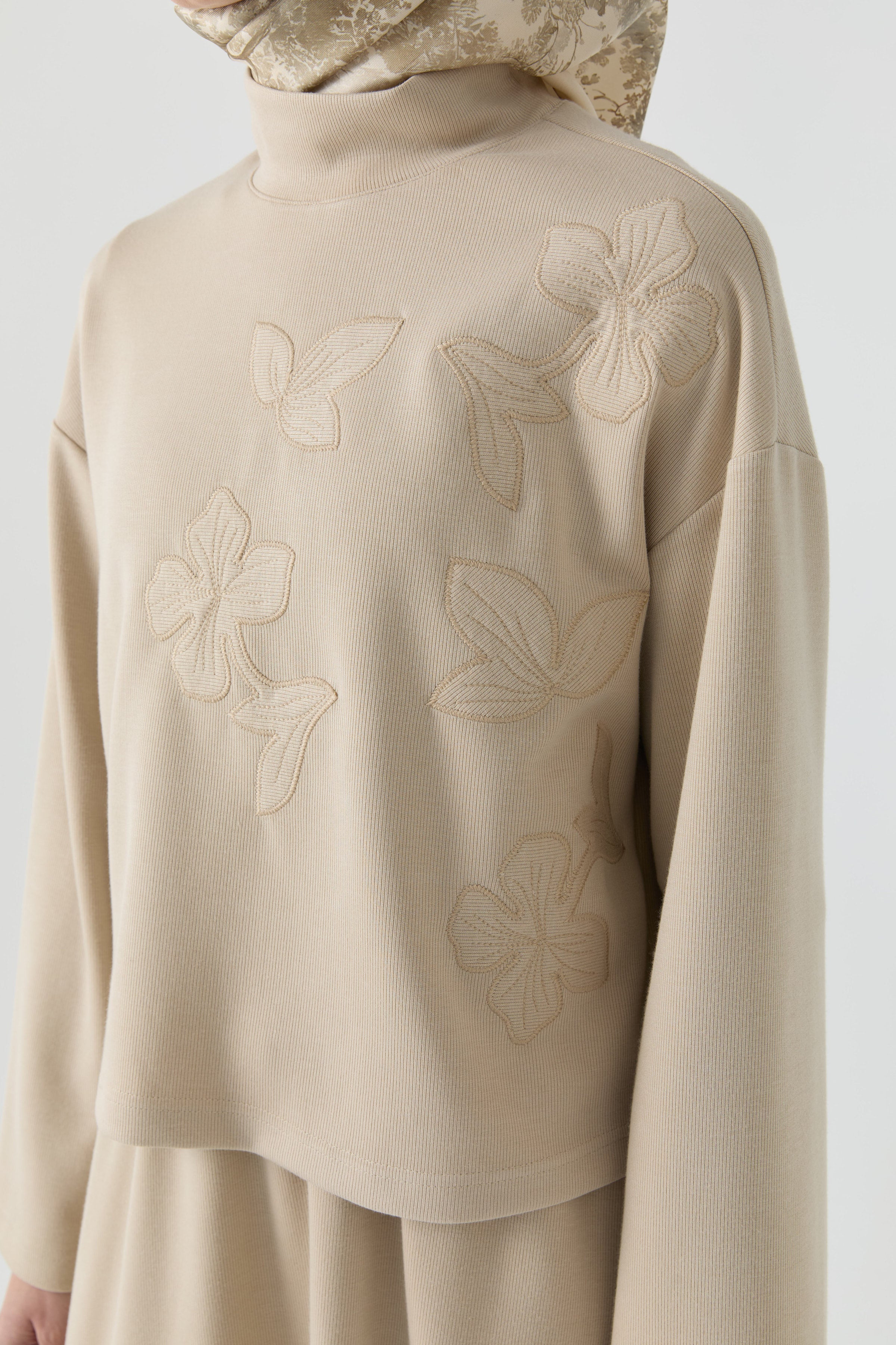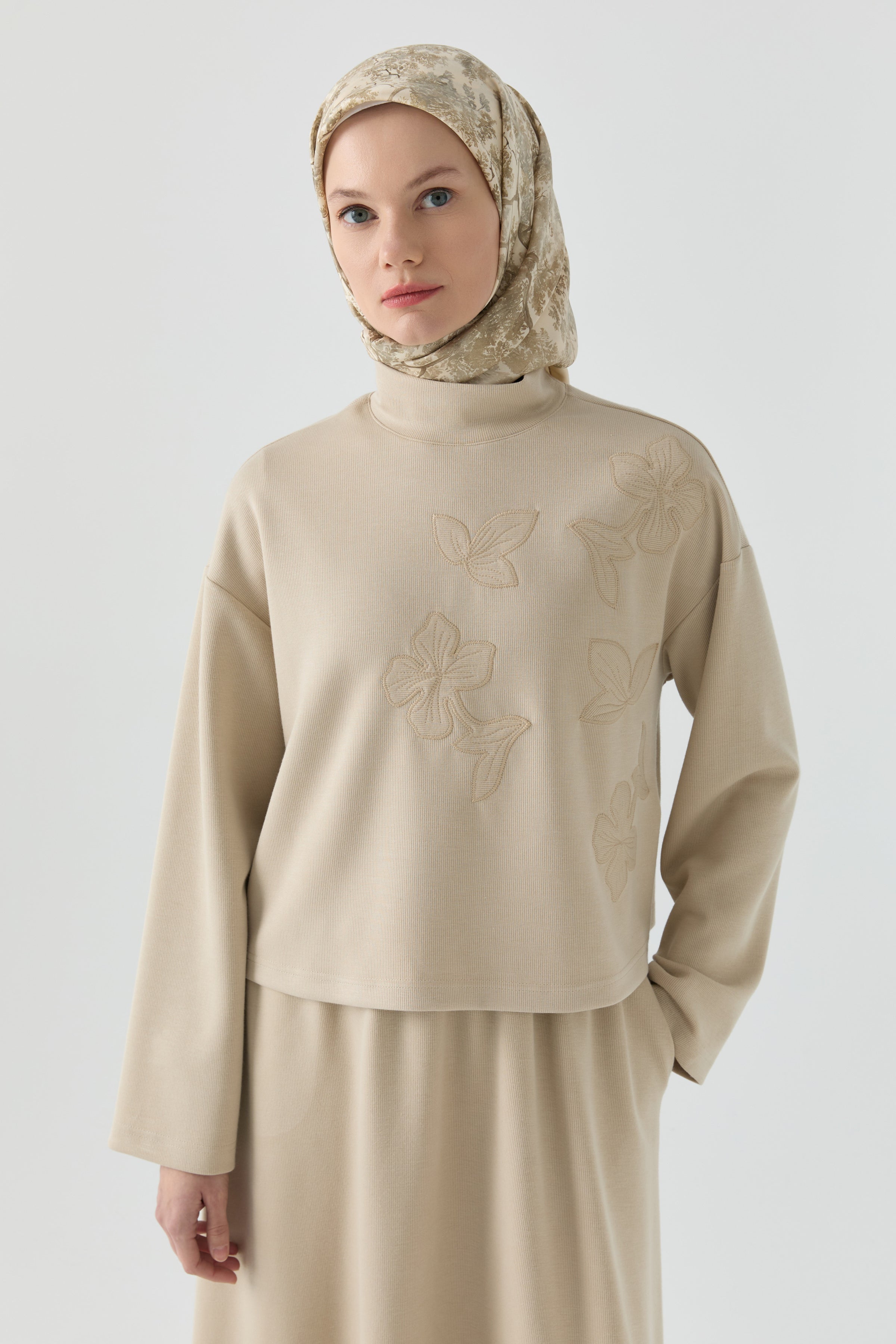Üst ve alt parçanın uyumunu zarif çiçek nakışlarıyla bütünleyen bu takım, modern çizgileri hafif bir feminenlikle birleştirir.
