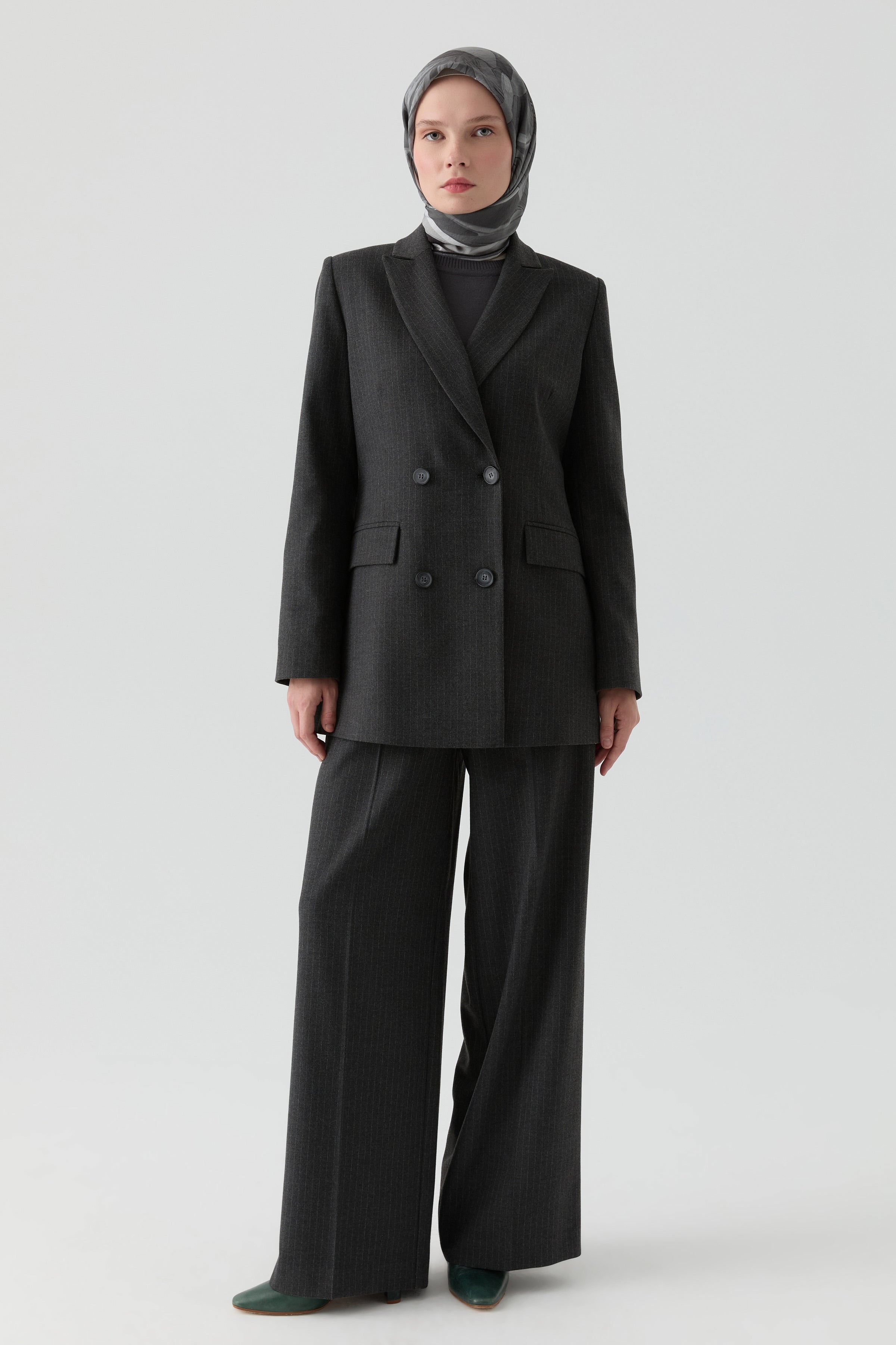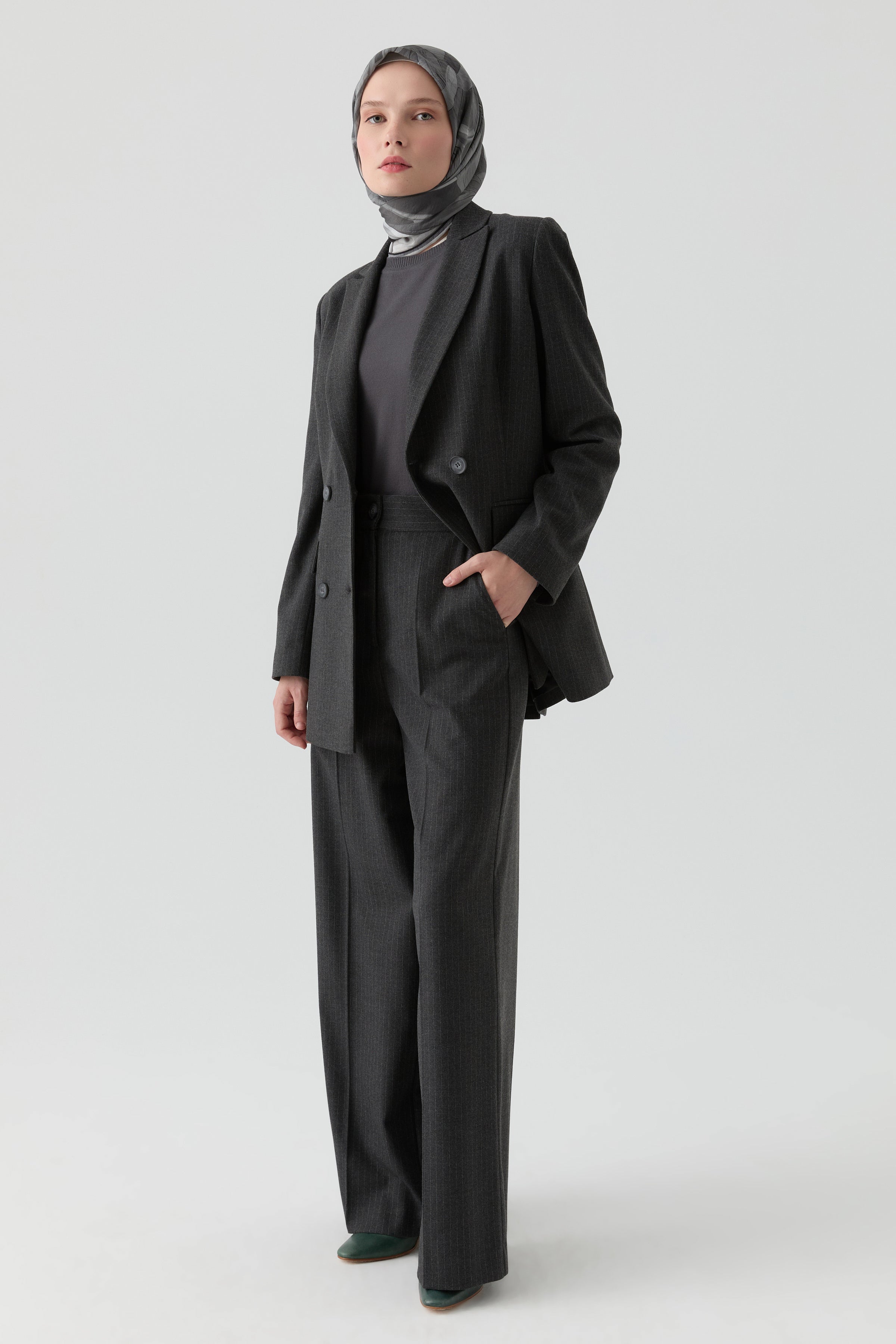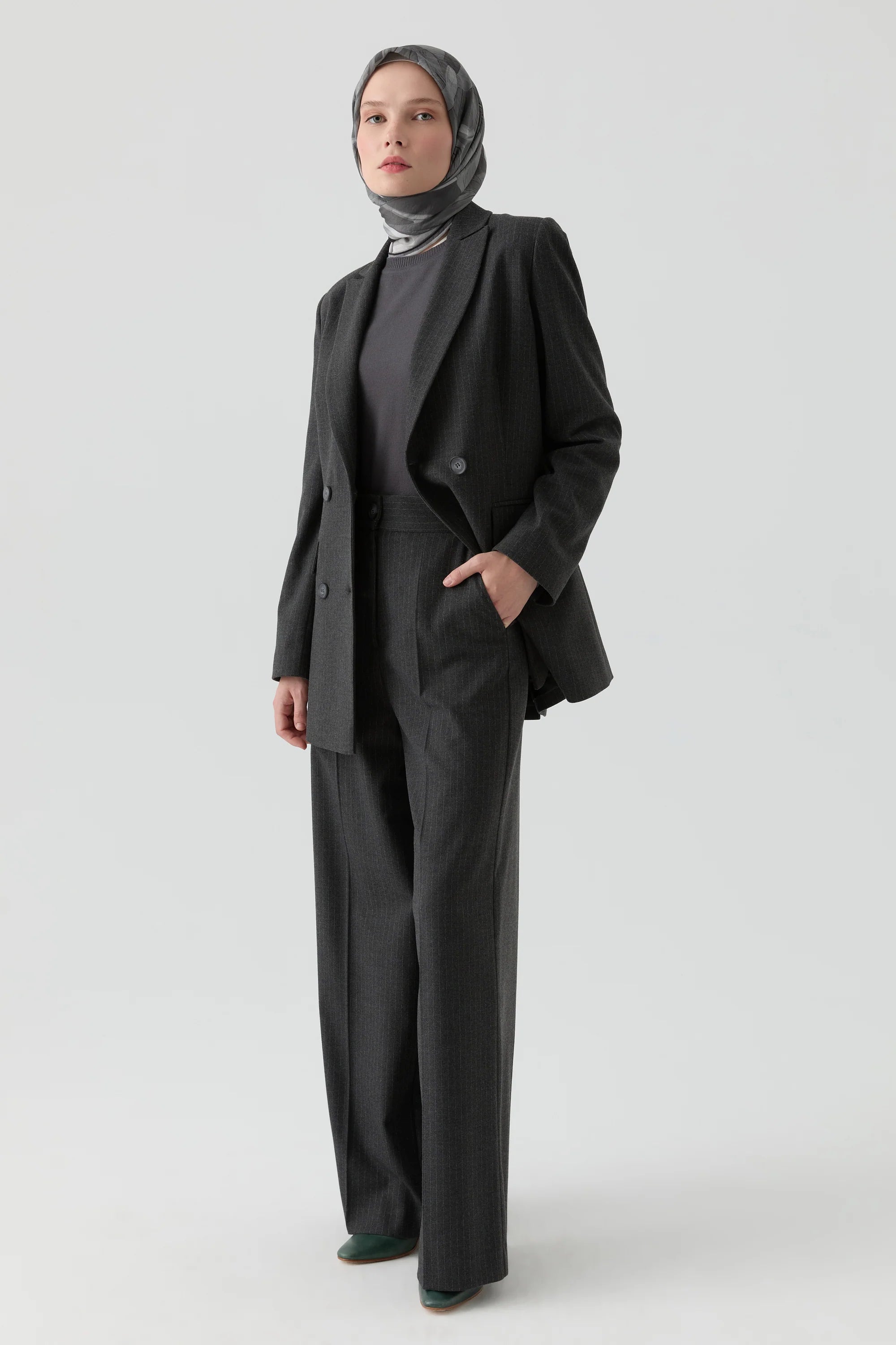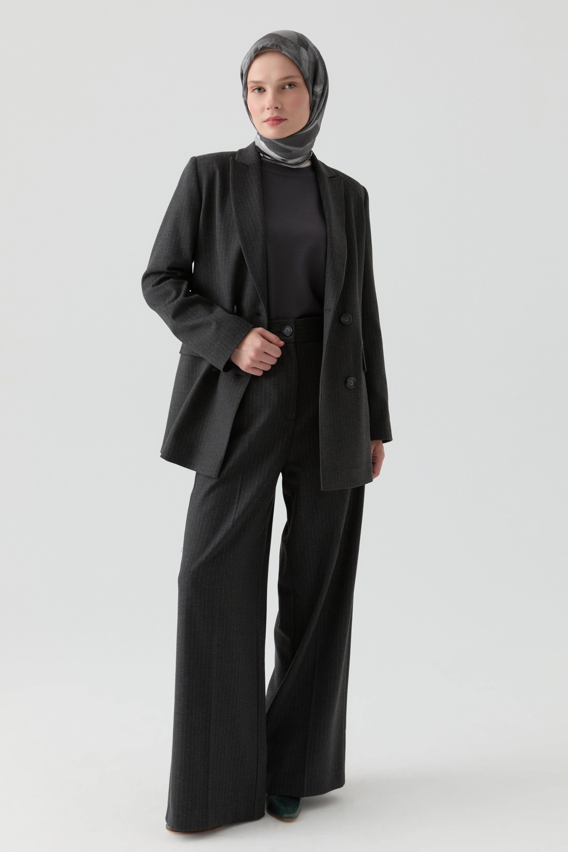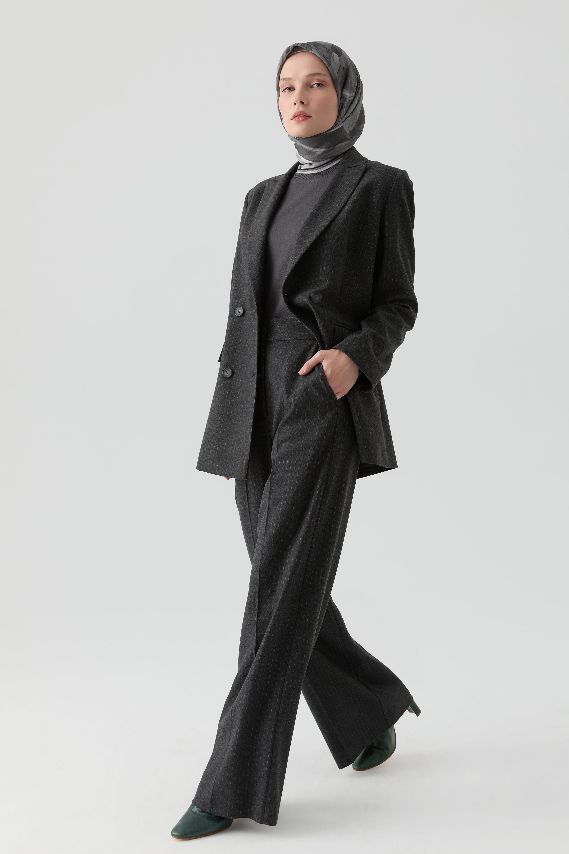 Çizgi Desenli Pantolon, ince çizgi detayları ve şık kesimiyle stilinize sofistike bir hava katıyor. Günlük kombinlerden ofis stiline kadar her anınıza uyum sağlayan çok yönlü bir parça.