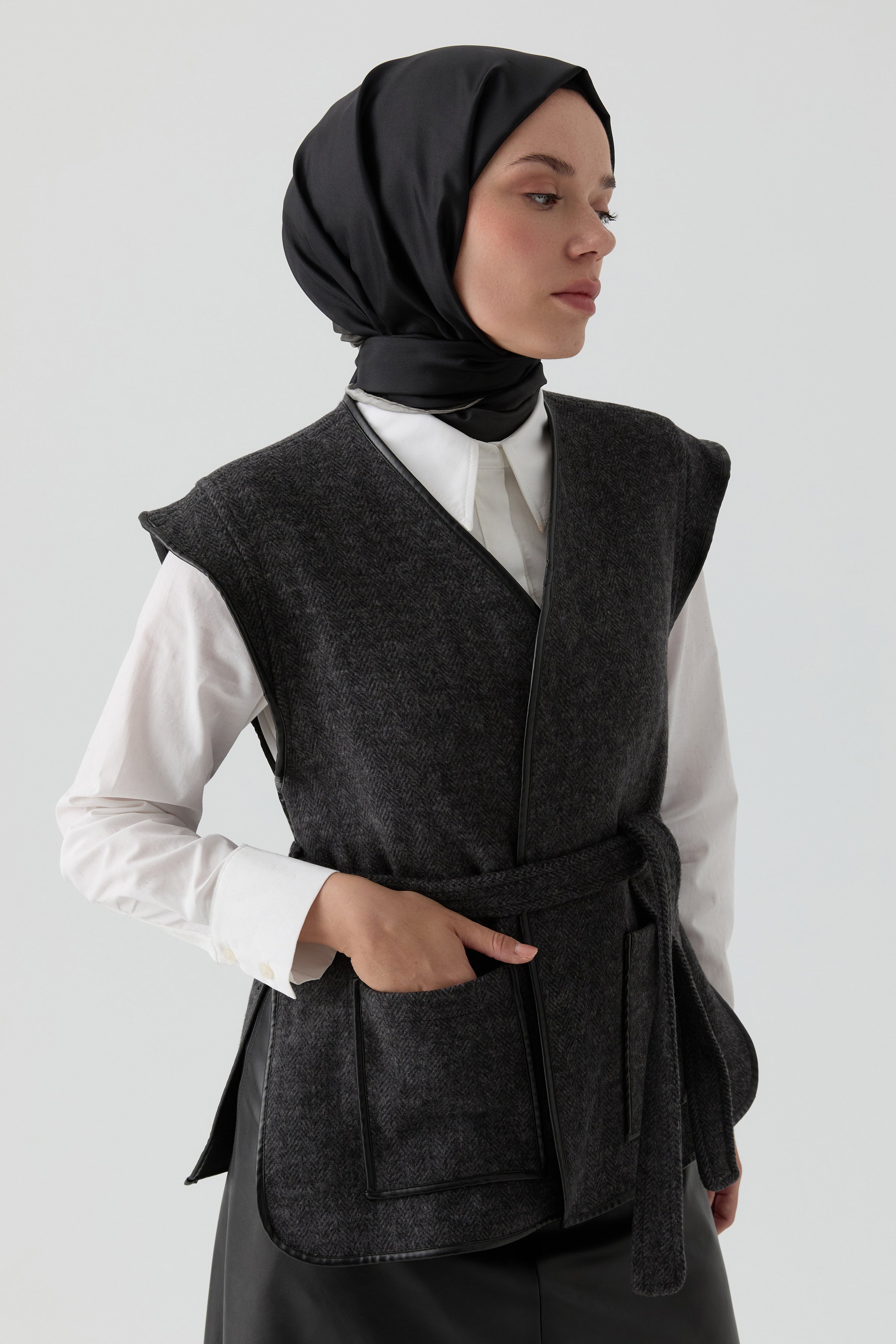 Modern çizgileriyle öne çıkan Deri Biye Detaylı Cepli Yelek, işlevselliği şıklıkla buluşturan bir tasarıma sahip. Minimal görünümünü güçlendiren deri biye detayları, parçaya sofistike bir dokunuş katarken, cepleriyle pratiklik sunuyor.