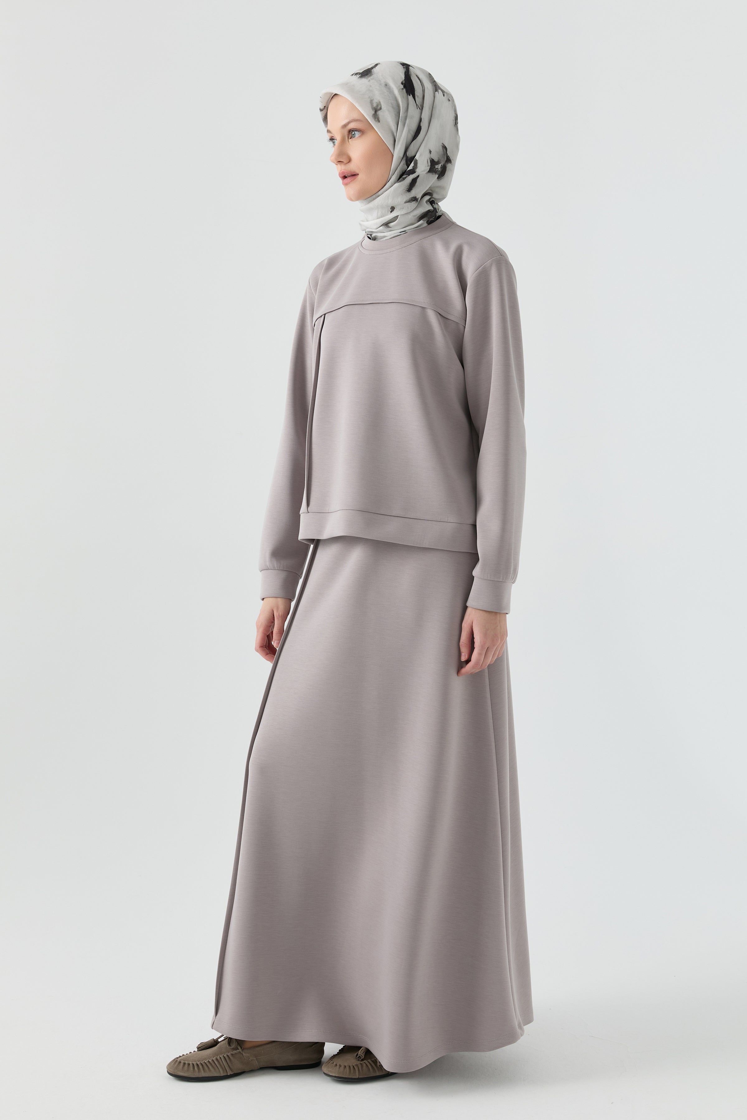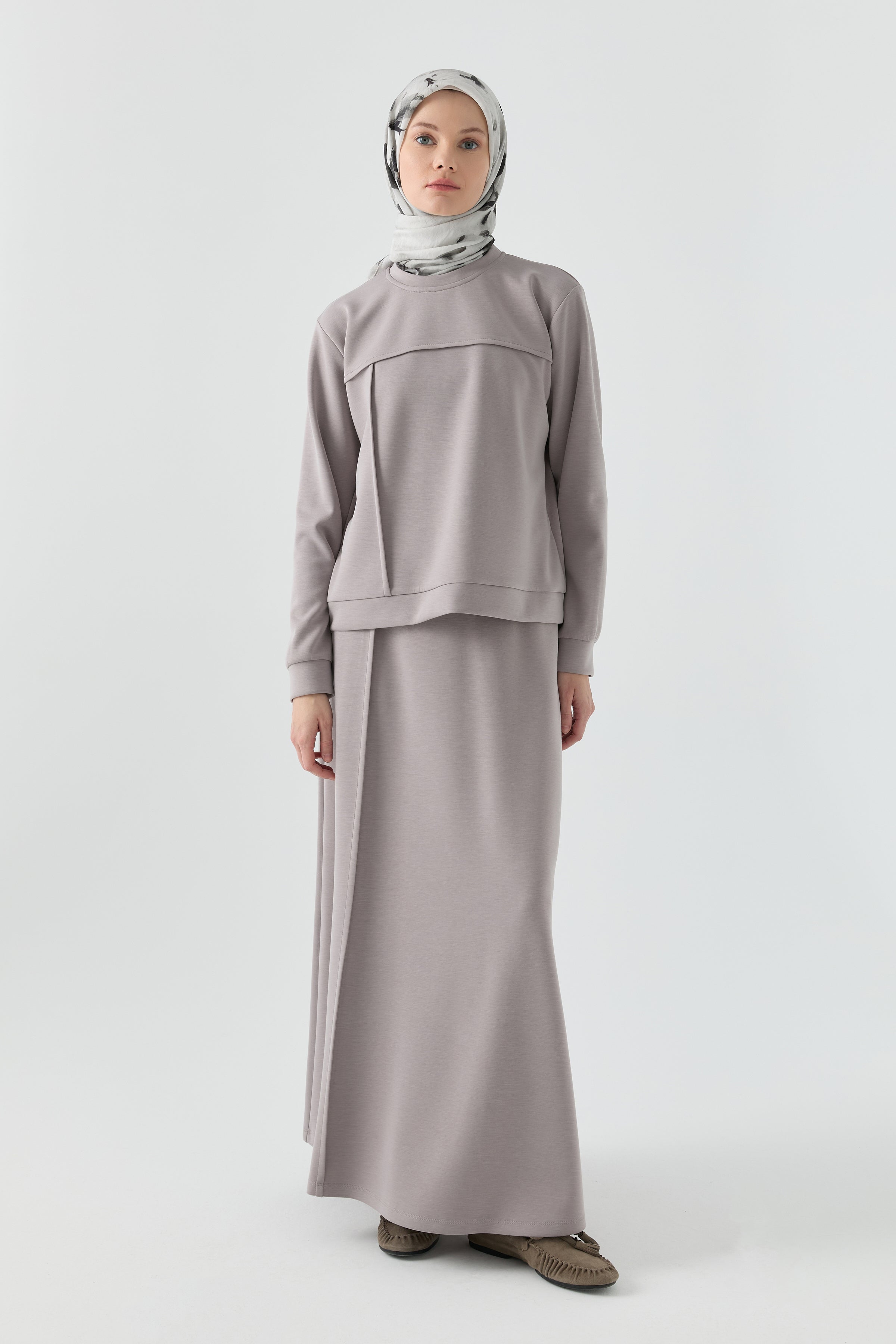 Modern çizgileri öne çıkaran bu takım, belirgin dikiş detaylarıyla tasarıma karakter ve derinlik kazandırır. Üst ve alt parçanın uyumlu formu, silueti net ve dengeli bir görünüme taşırken, kaliteli kumaşı gün boyu konfor sunar.