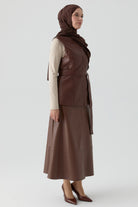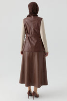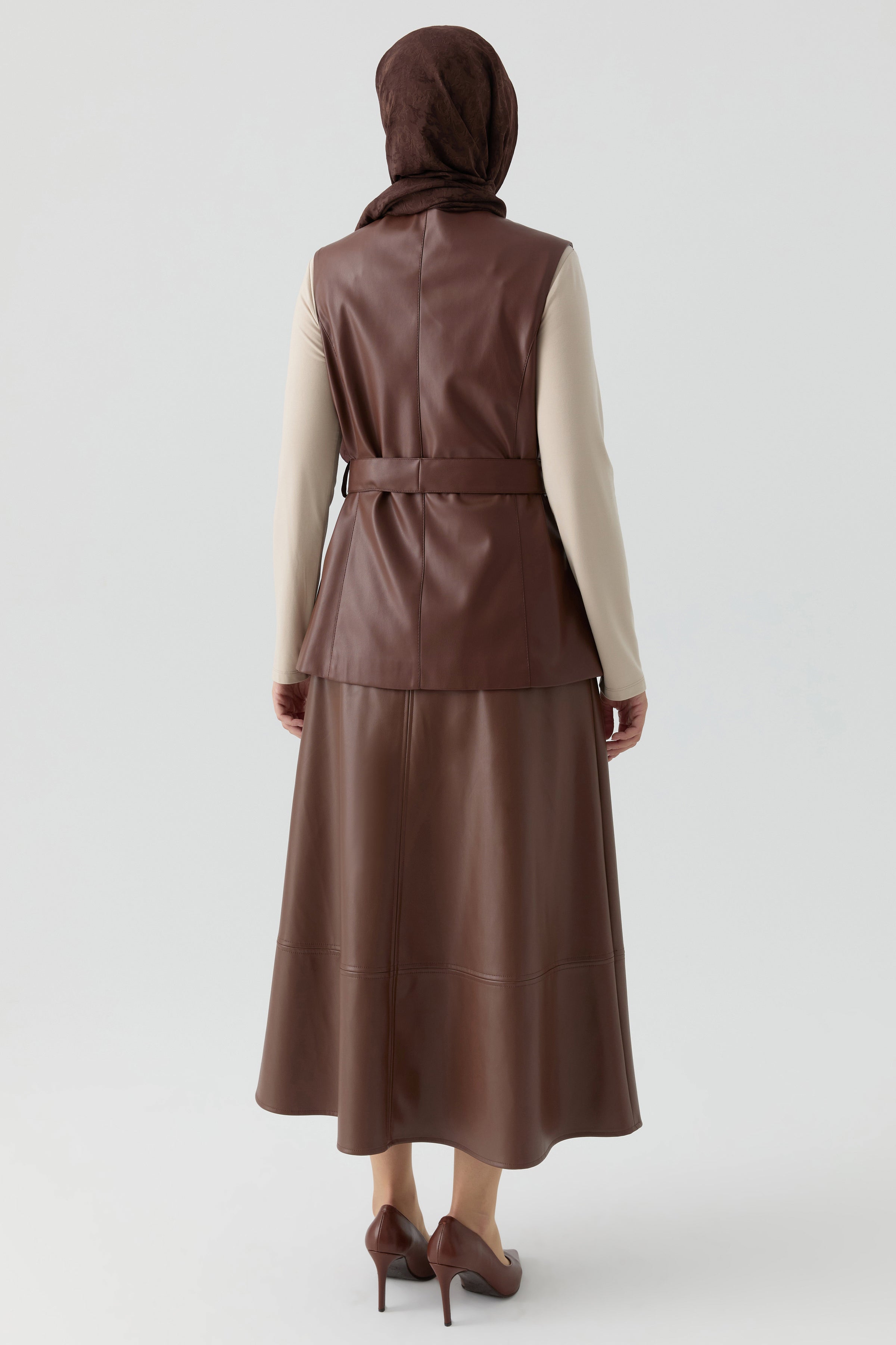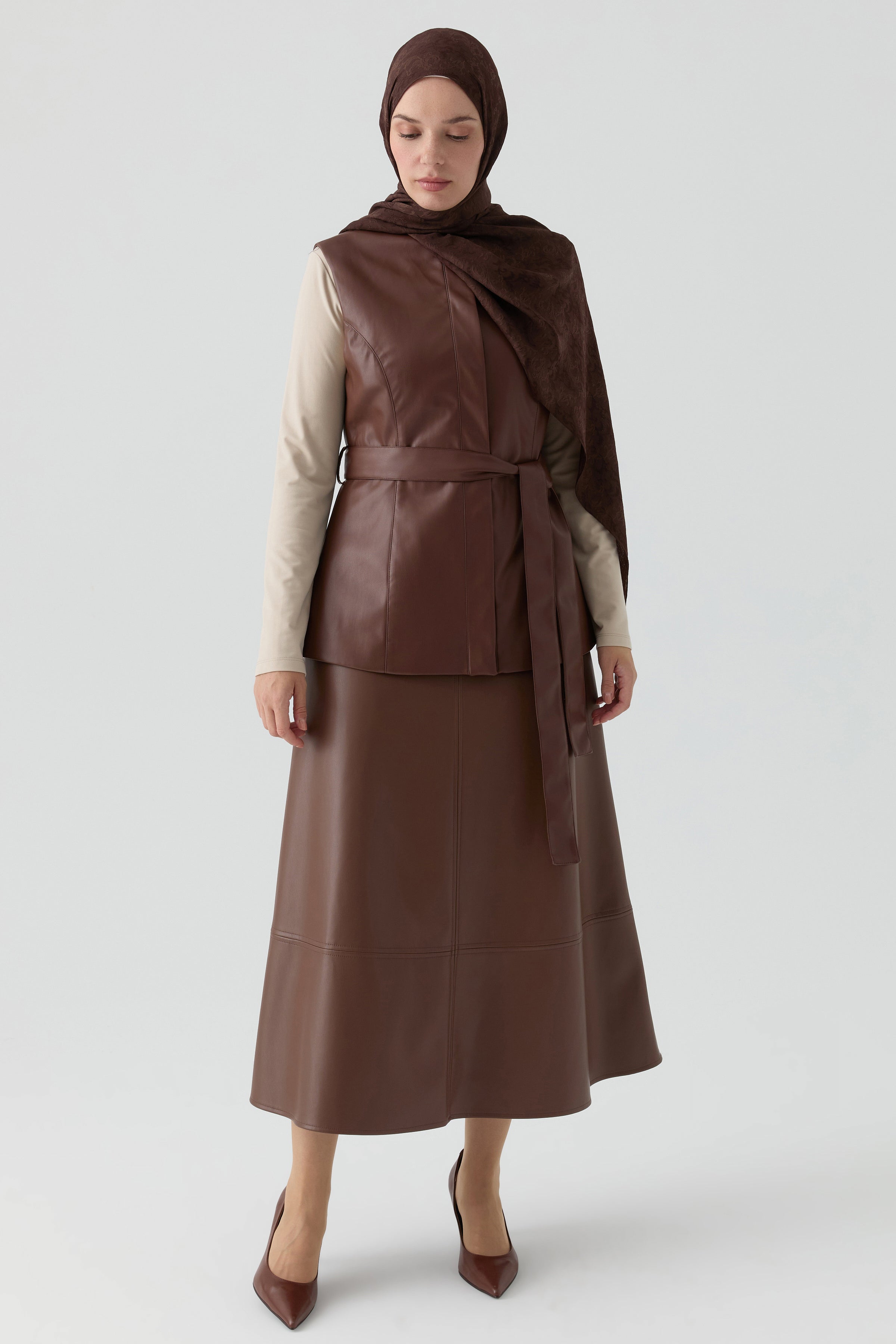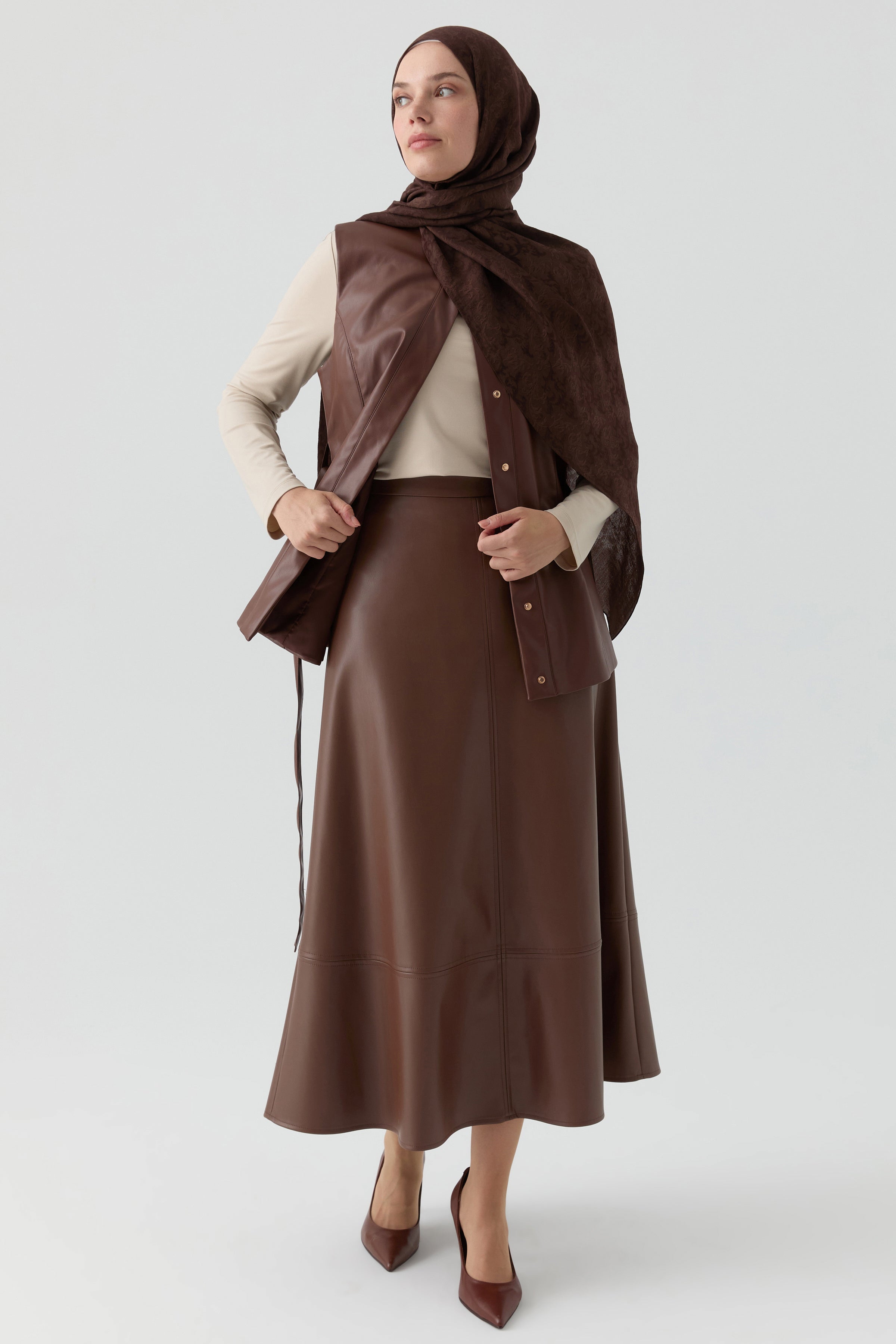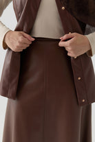 Kesik Detaylı Suni Deri Çan Etek - Kahve