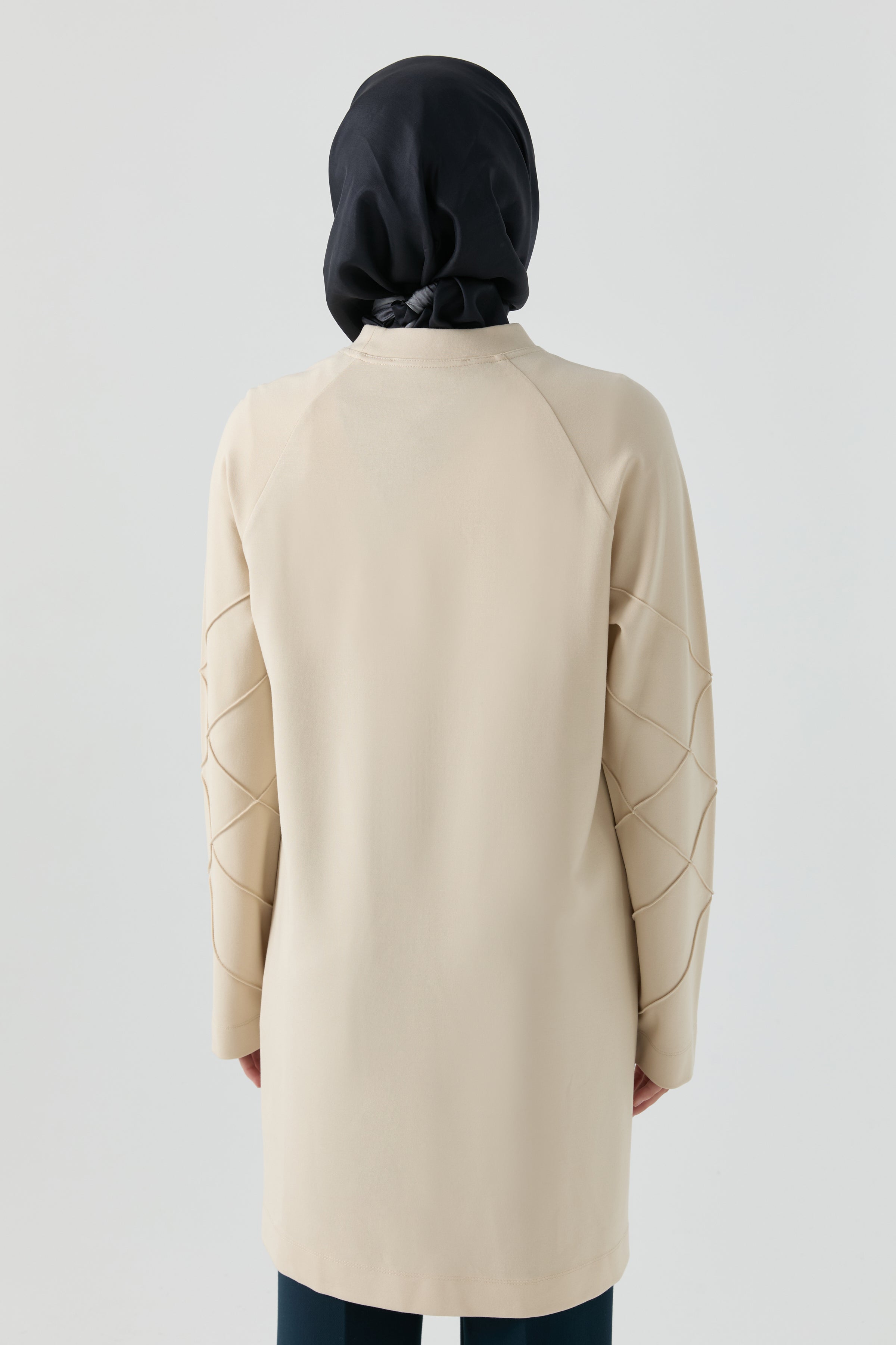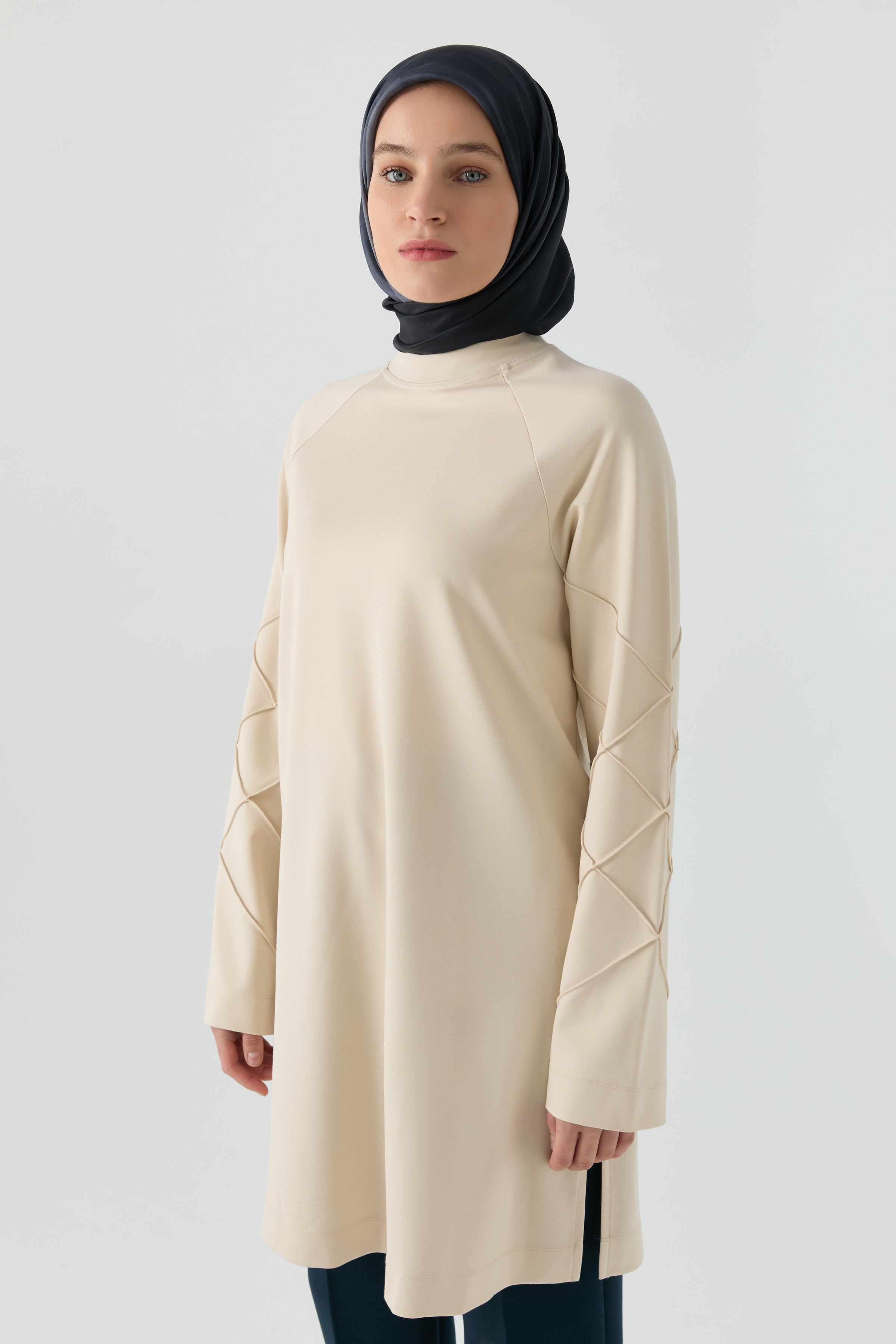 Kollarındaki ince dokunuşlarla öne çıkan bu tunik, sade tasarımına zarif bir hareket katar. Rahat kesimi gün içinde kolay kullanım sağlarken, detaylı kol yapısı görünümü yumuşak bir şekilde zenginleştirir.