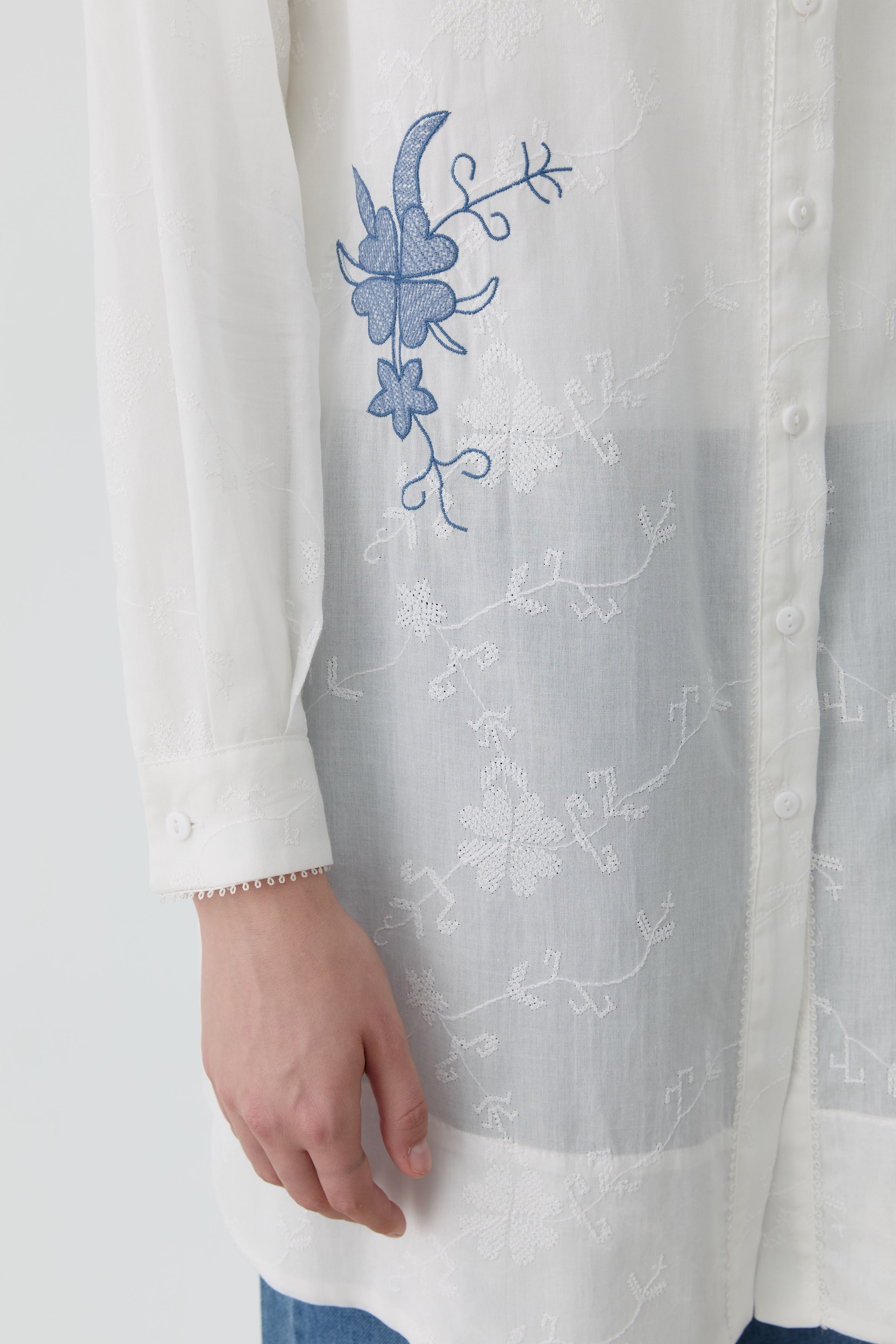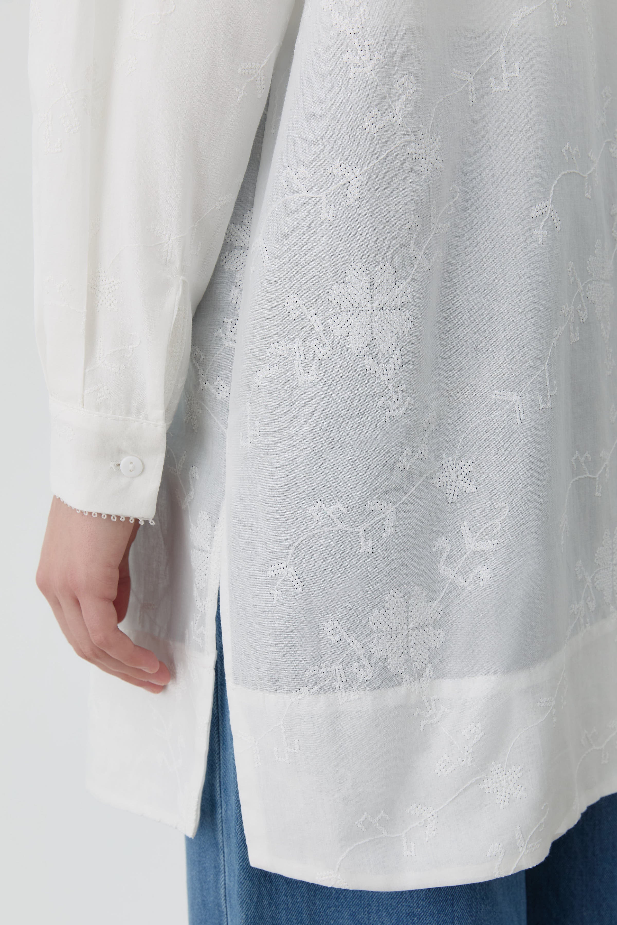 Brode kumaşın ince işçiliği ve nakış detaylarının şıklığıyla öne çıkan bu tunik, feminen ve doğal bir stil sunuyor.