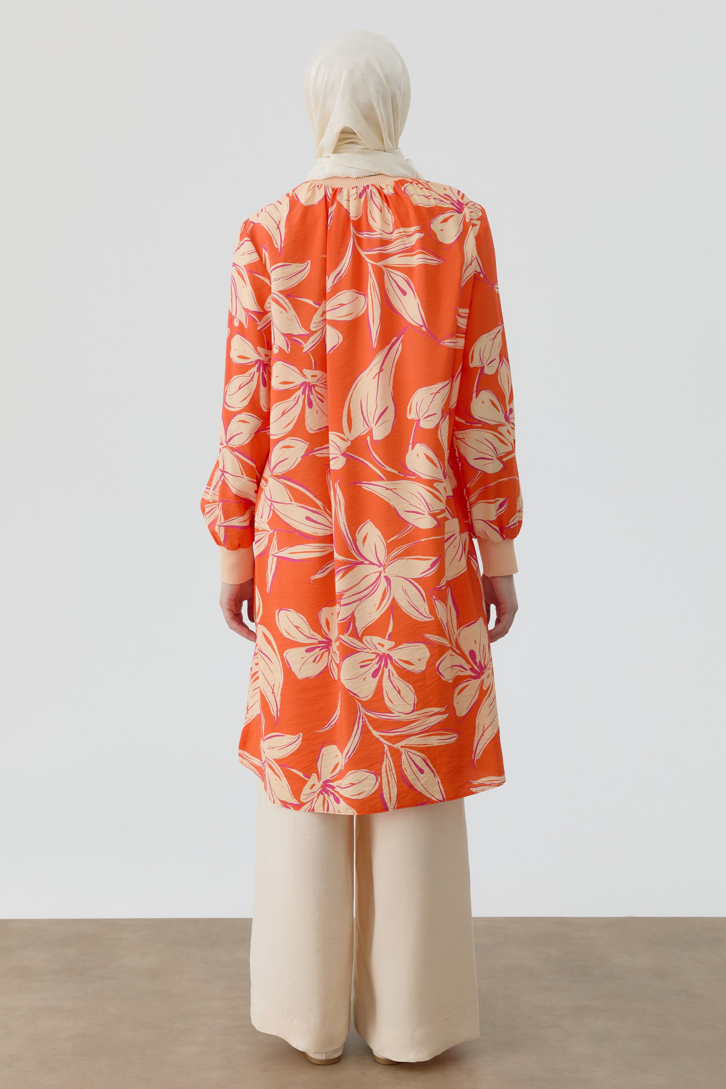 Ribanalı Çiçek Desenli Tunik - Oranj