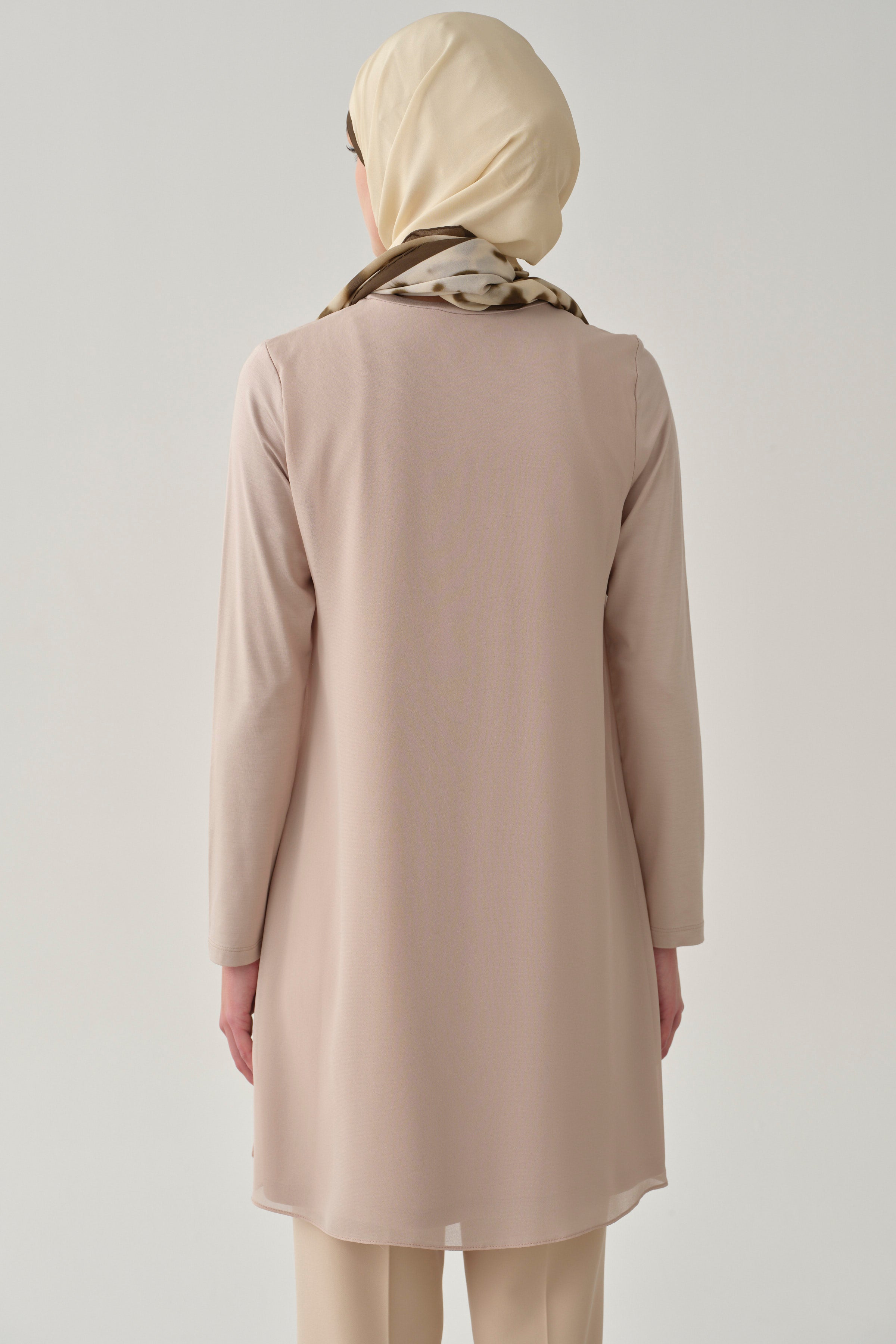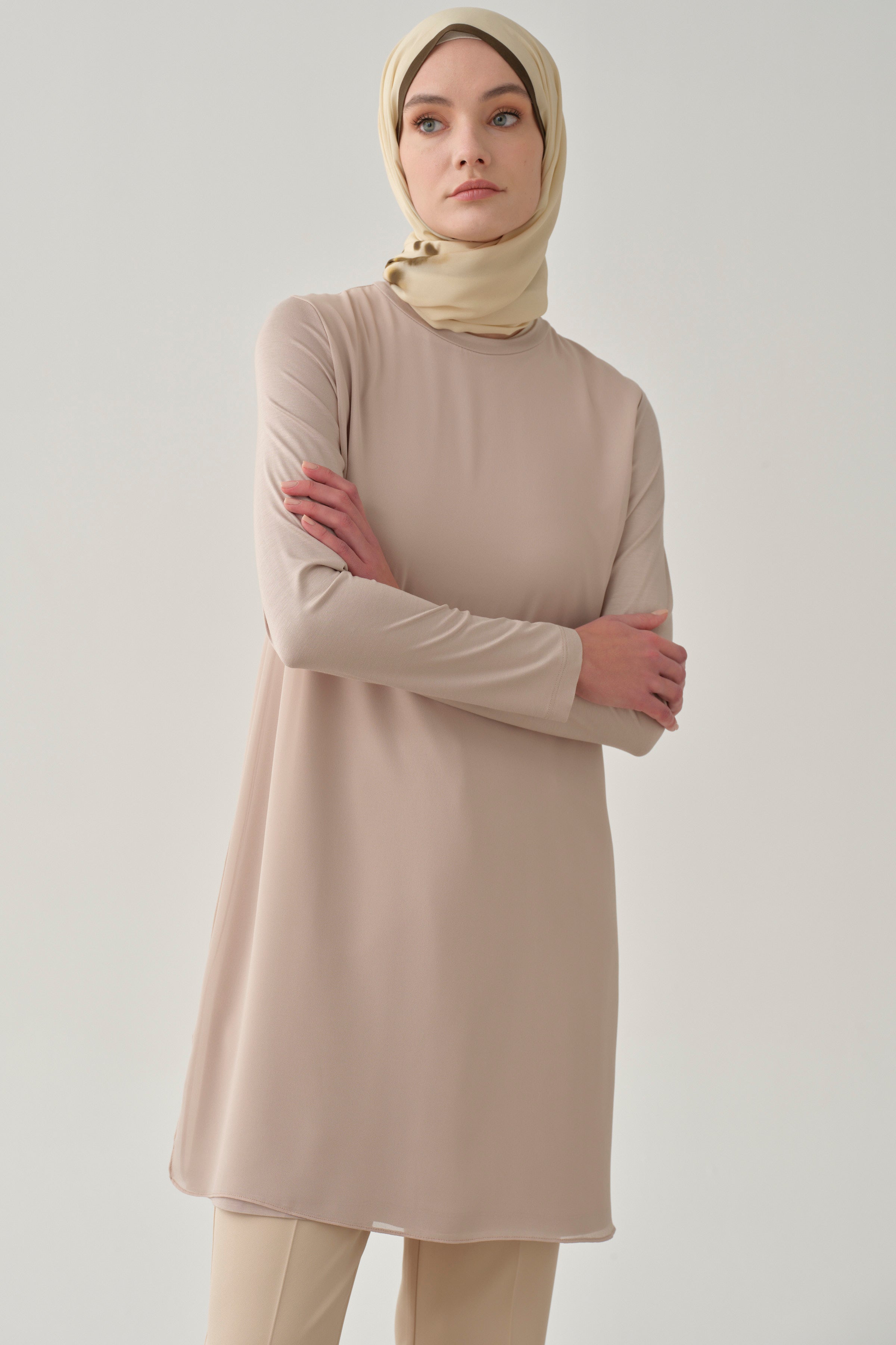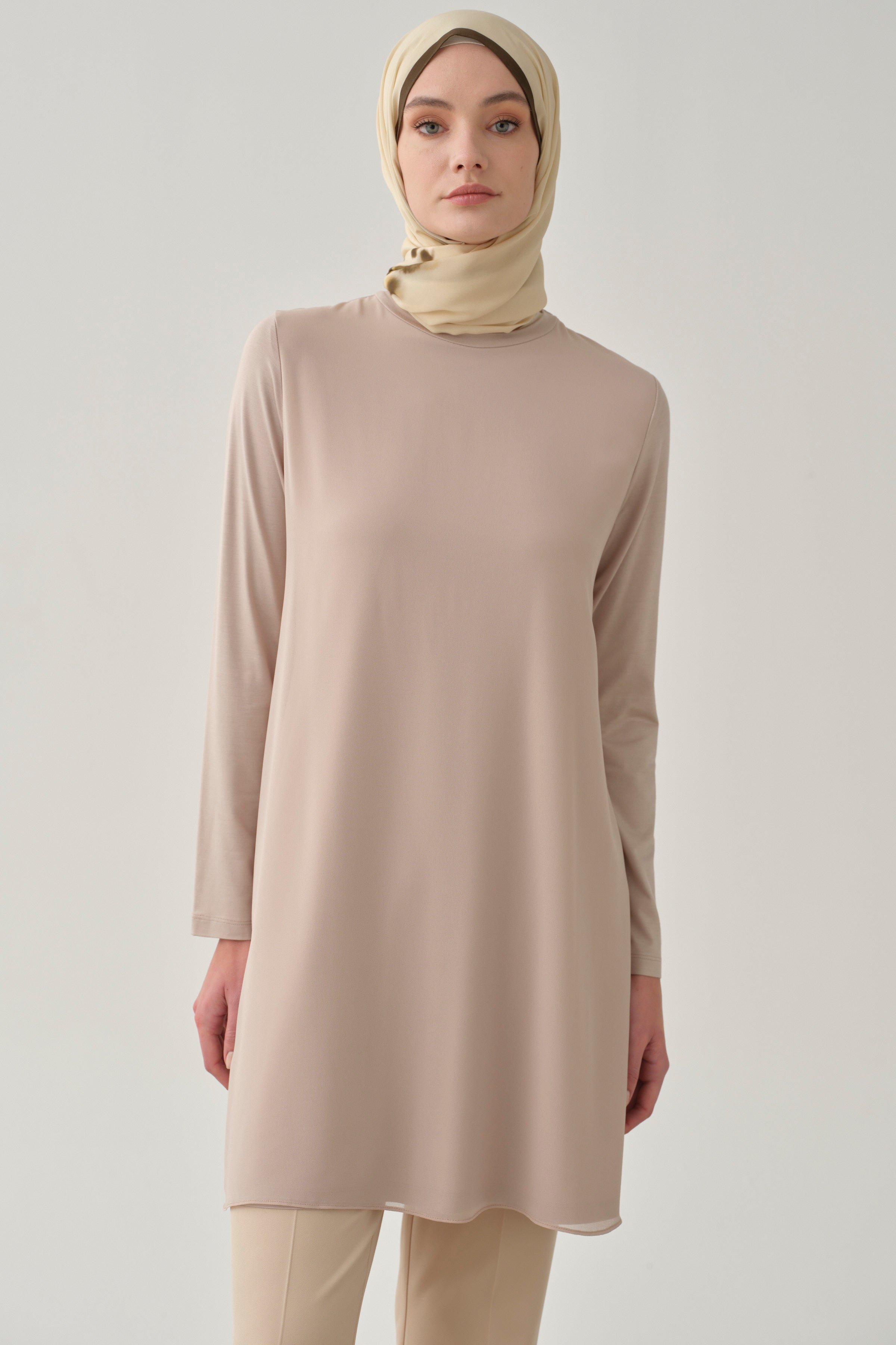 Şifon Garnili Yırtmaçlı Penye Tunik - Taş