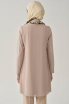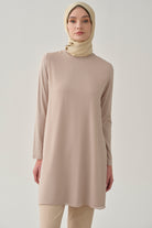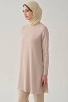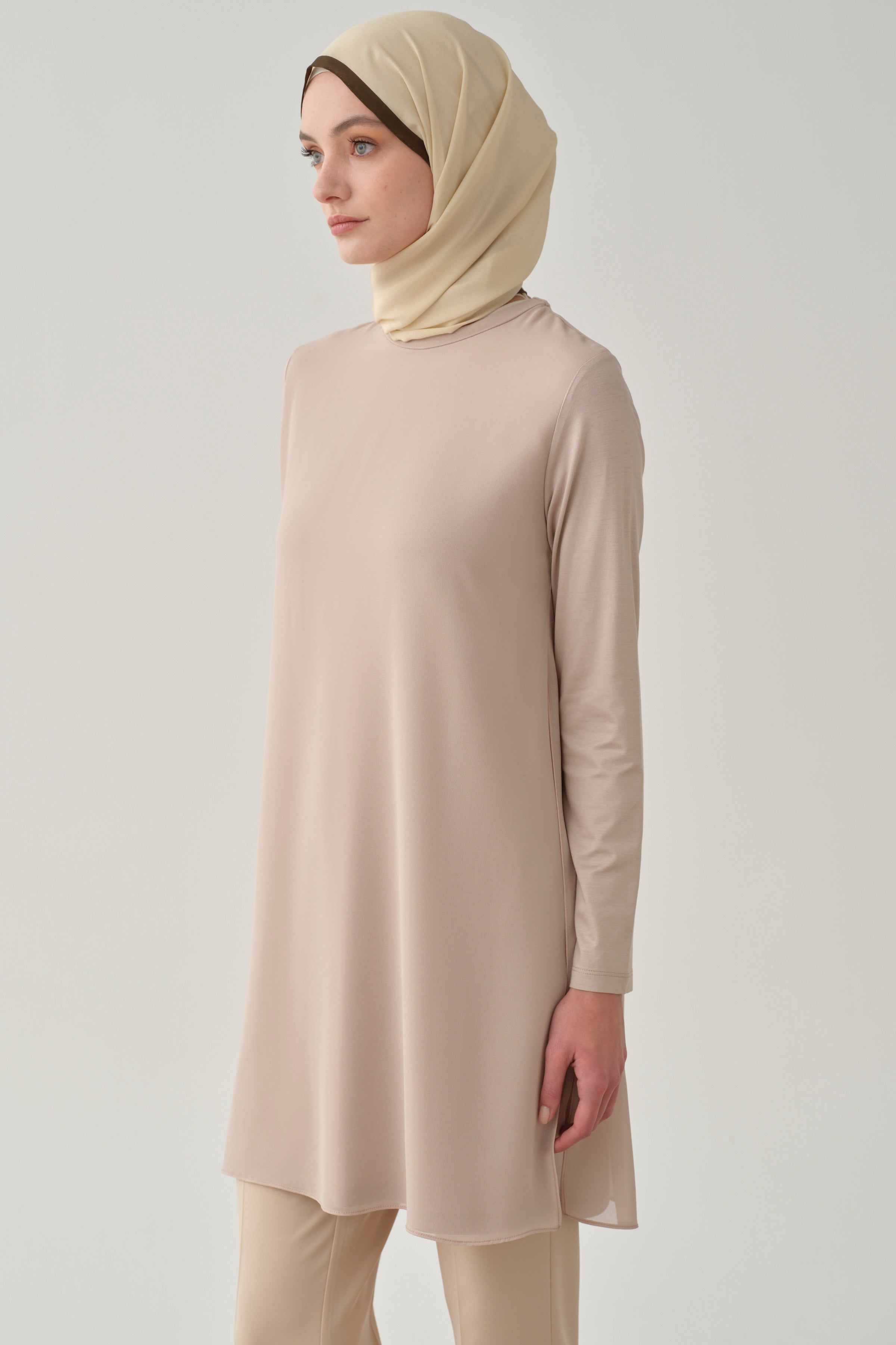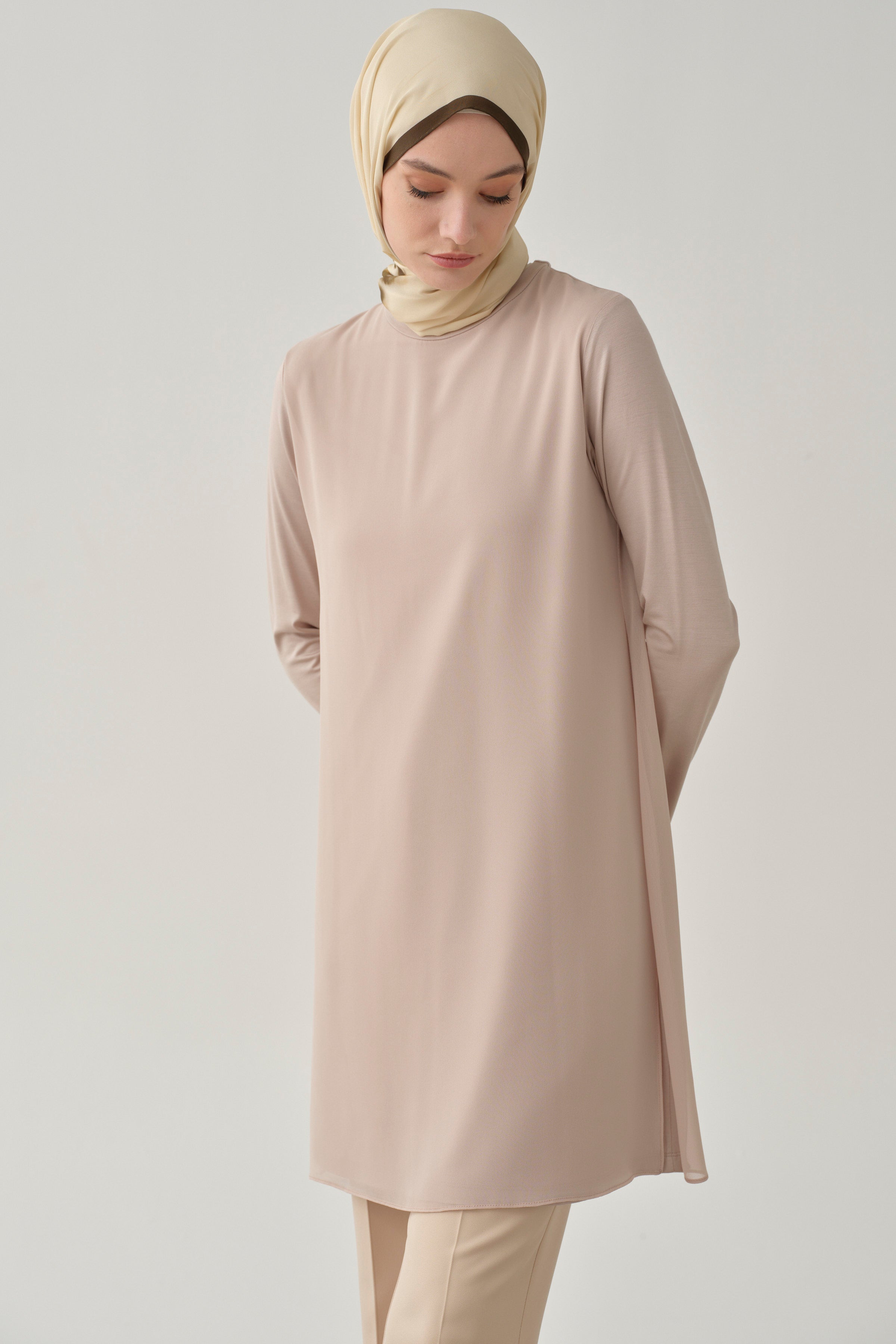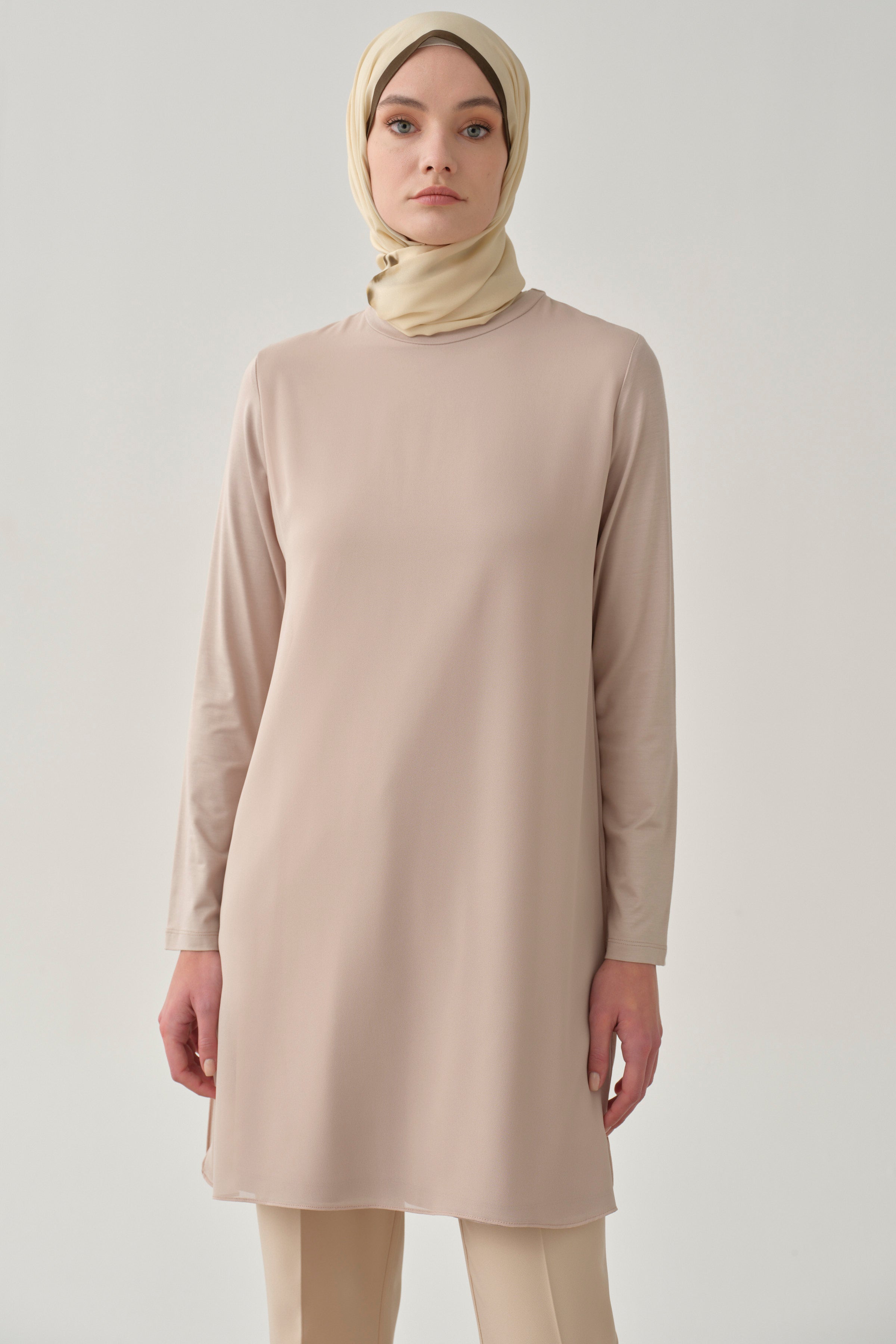 Şifon Garnili Yırtmaçlı Penye Tunik - Taş