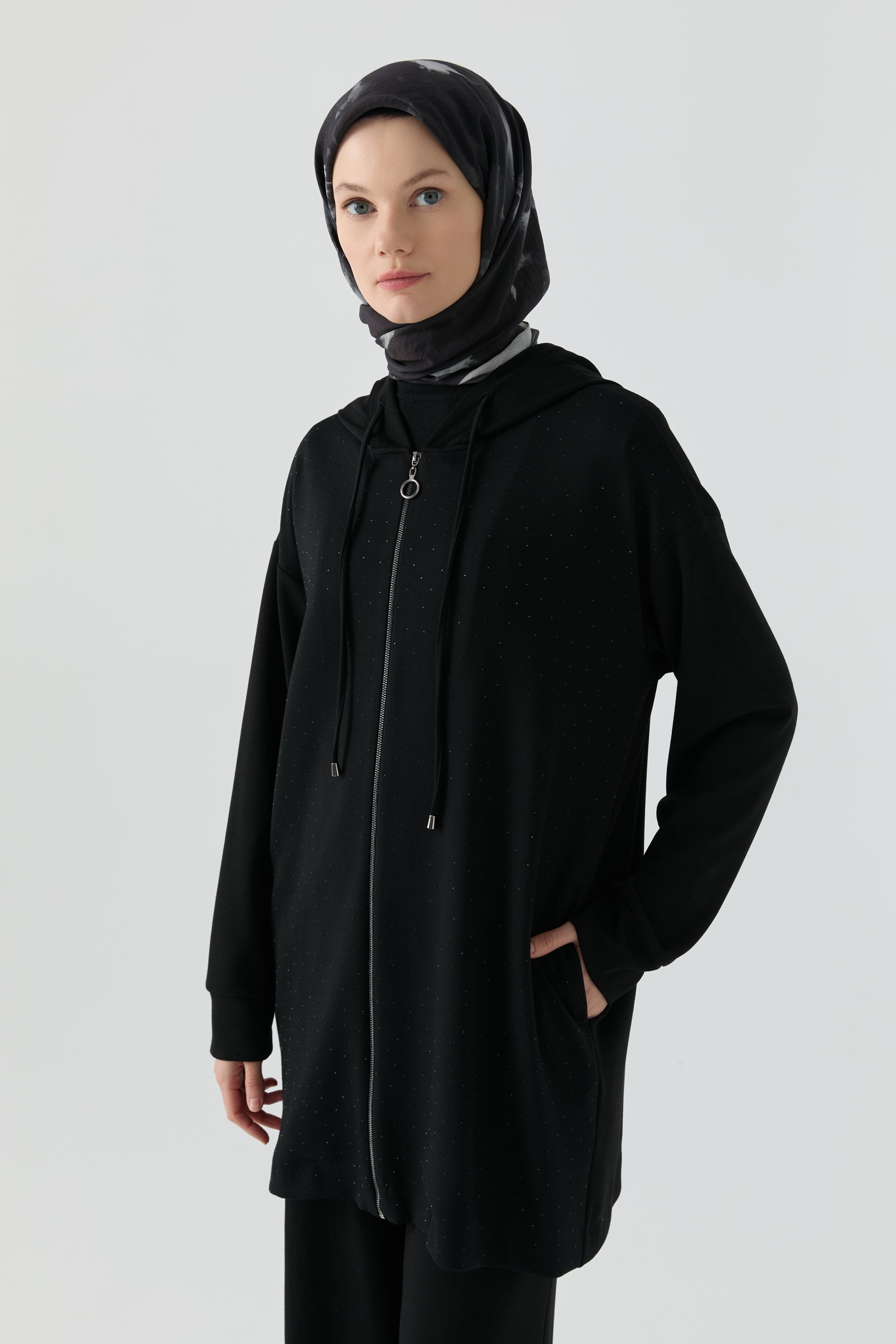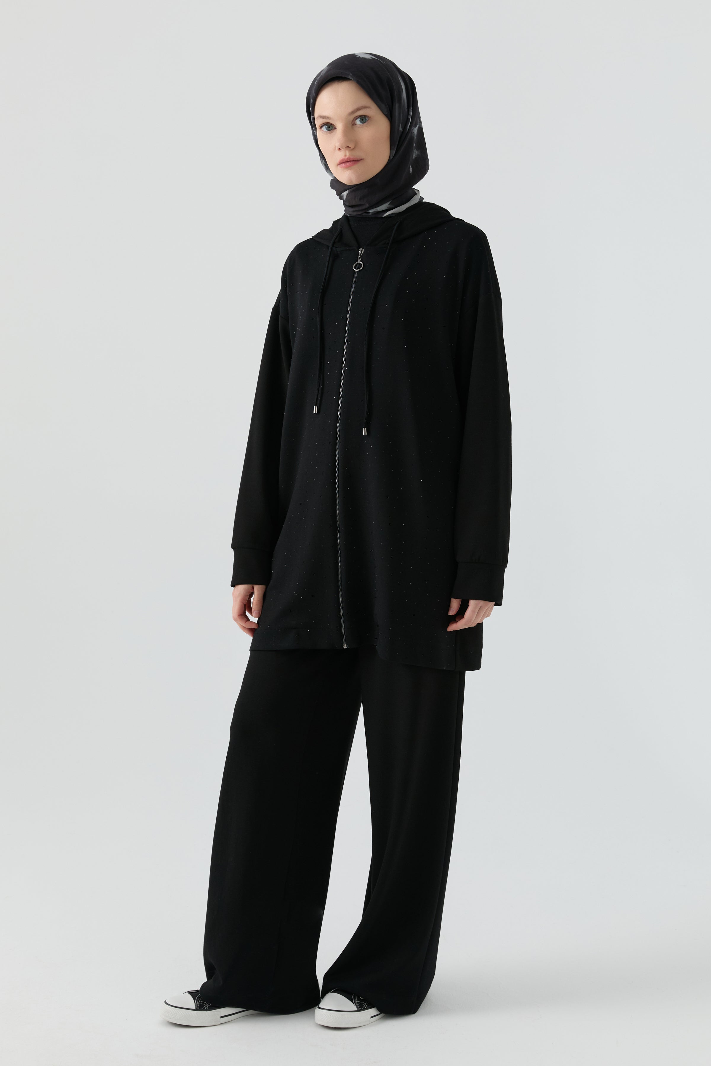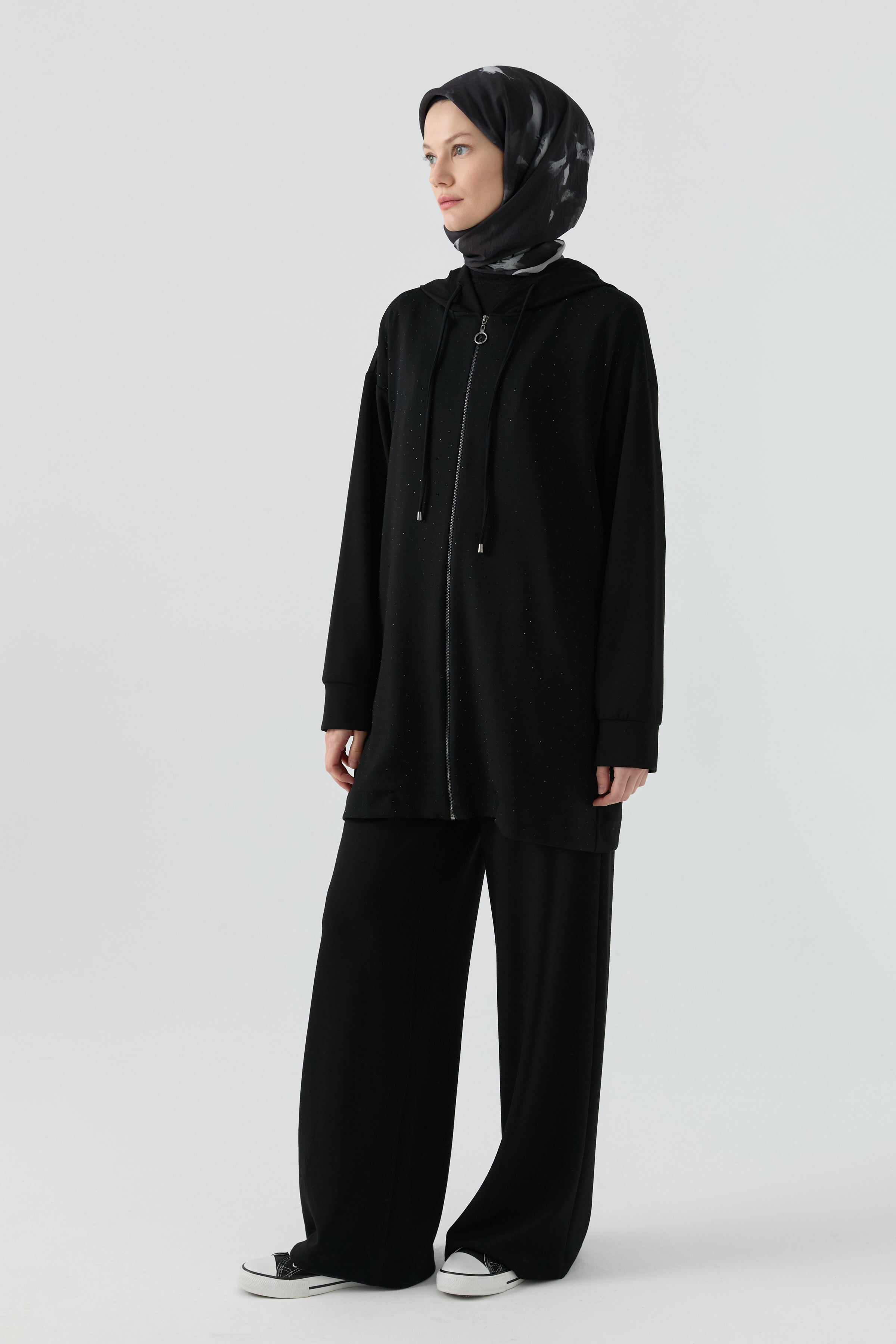Zarif taş işlemeleriyle ışıltı kazanan bu takım, modern çizgileriyle şıklığı kusursuz bir şekilde dengeler. Parlak detaylar tasarıma sofistike bir hava katarken, uyumlu üst ve alt formu feminen bir siluet oluşturur.