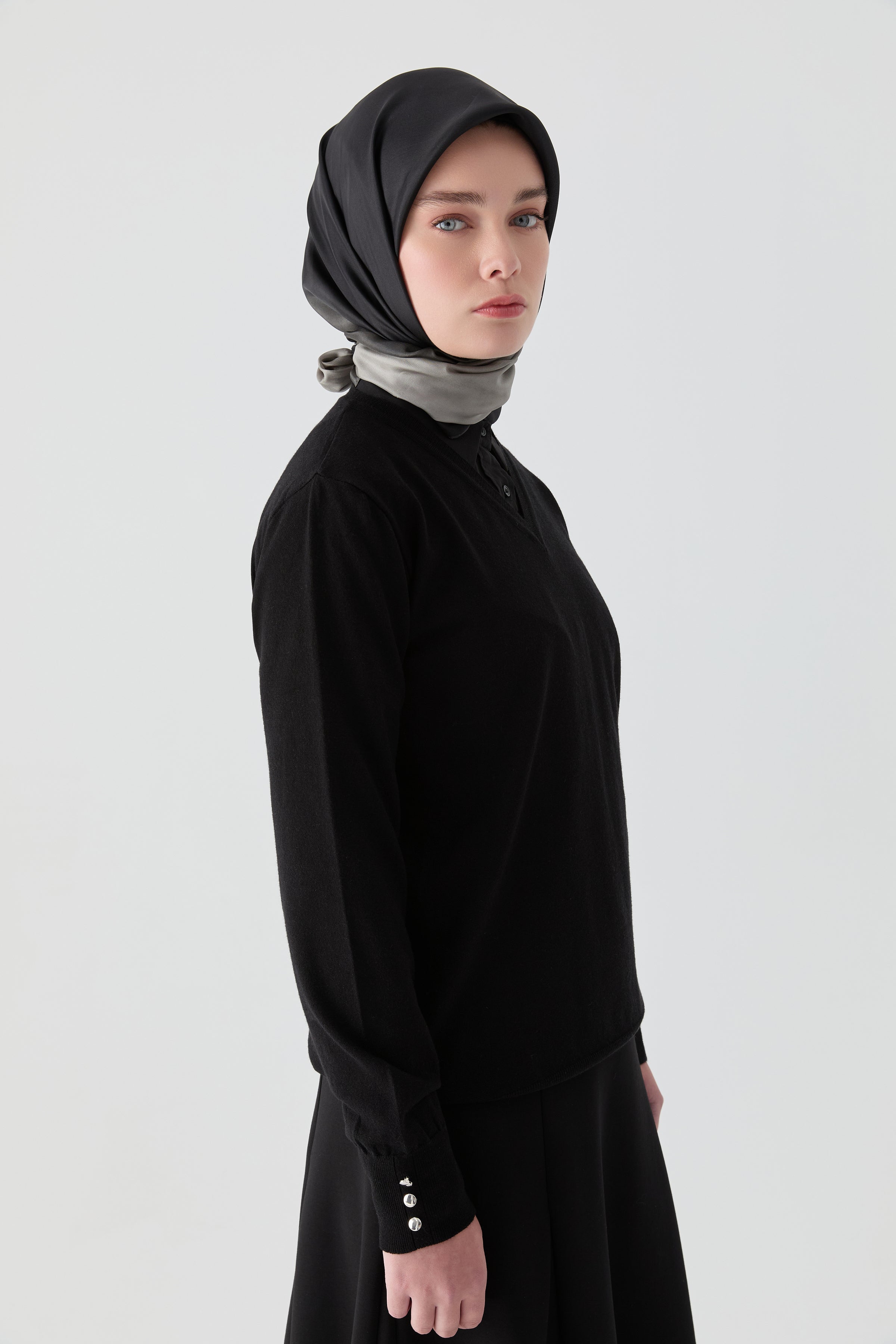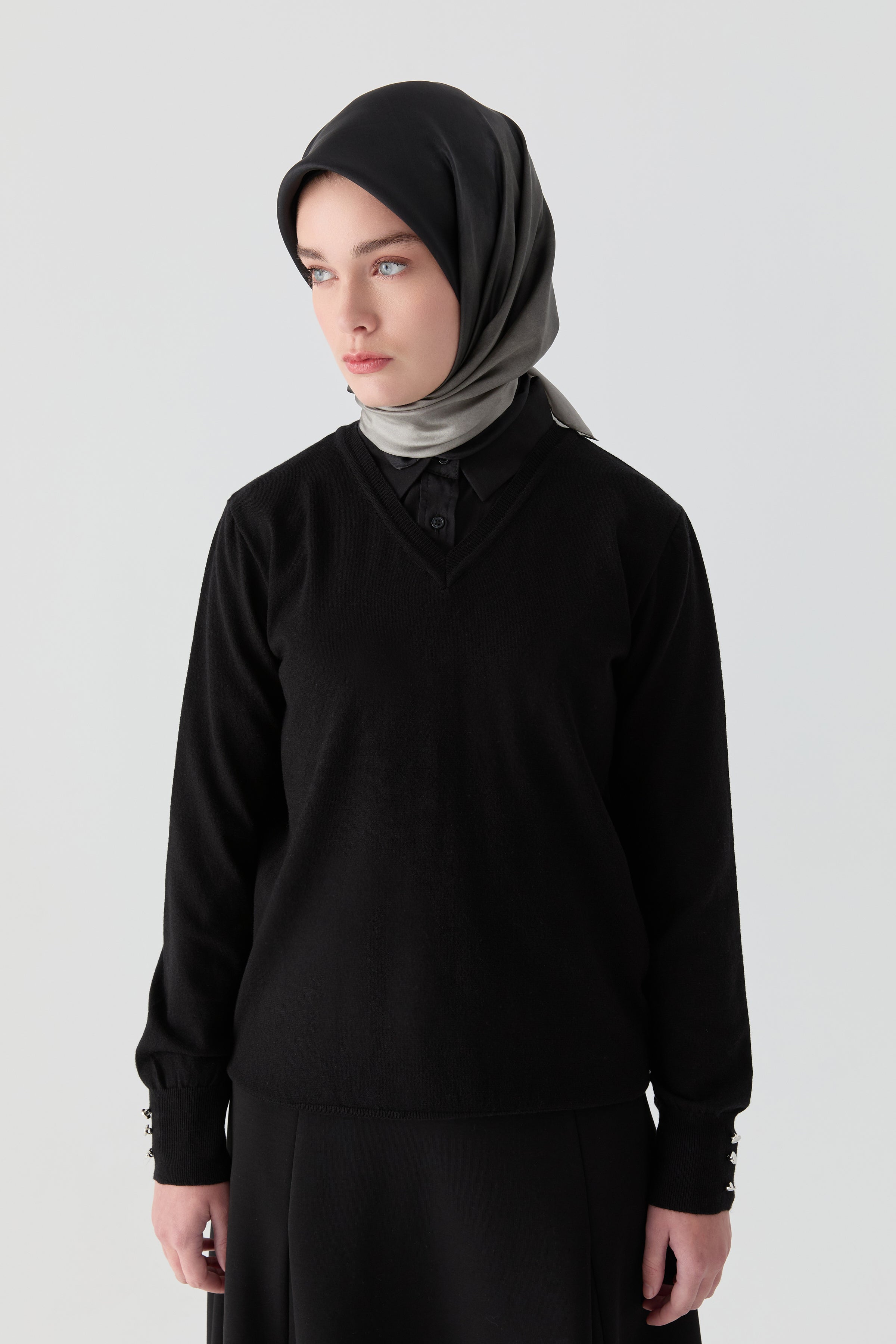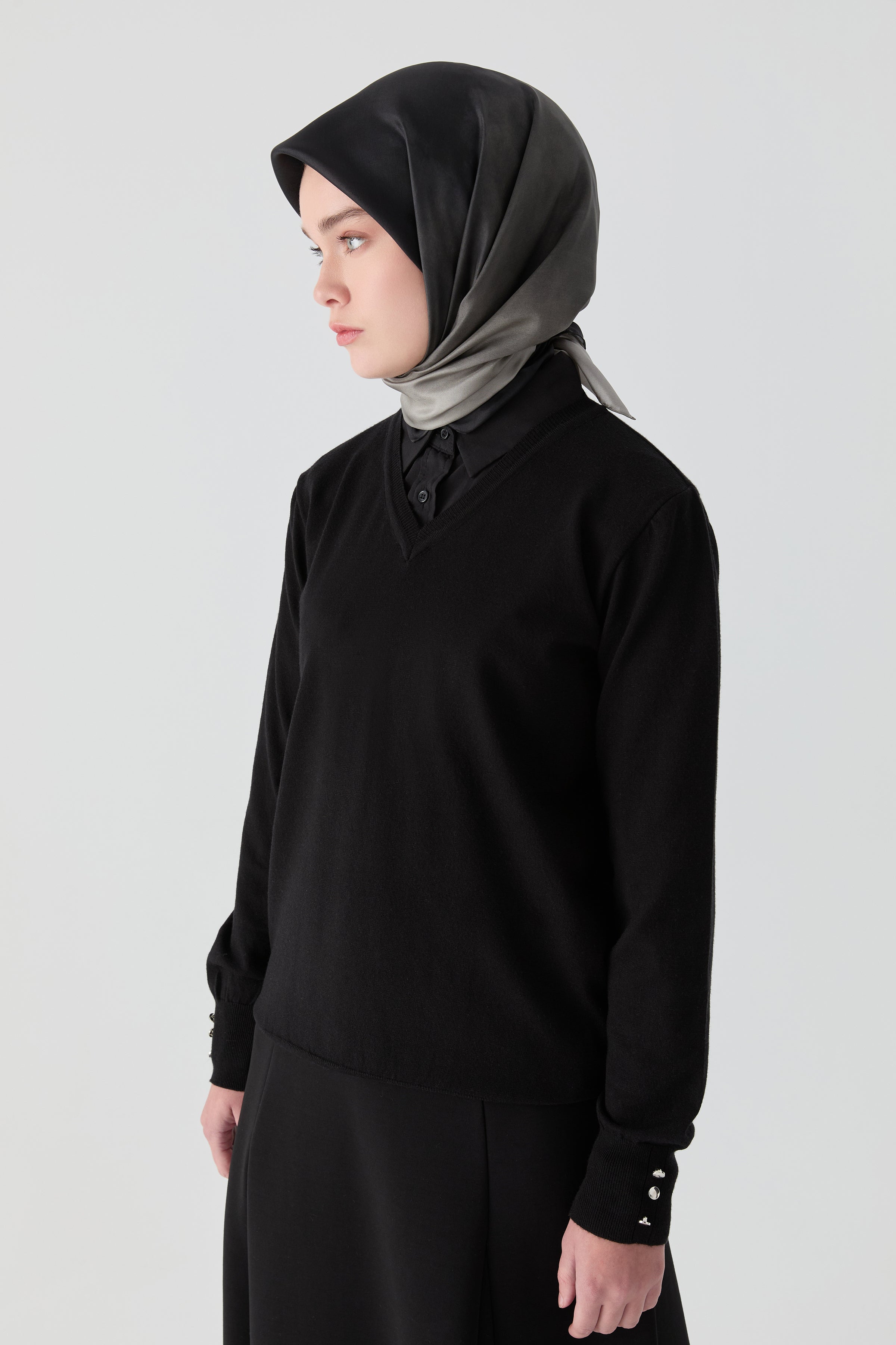 V Yaka Kol Düğme Detaylı Kazak, şık ve modern bir triko modelidir. V yakası sayesinde boyun bölgesini zarifçe vurgular, kol kısımlarındaki düğme detayları ise kazak tasarımına farklı bir dokunuş katar.