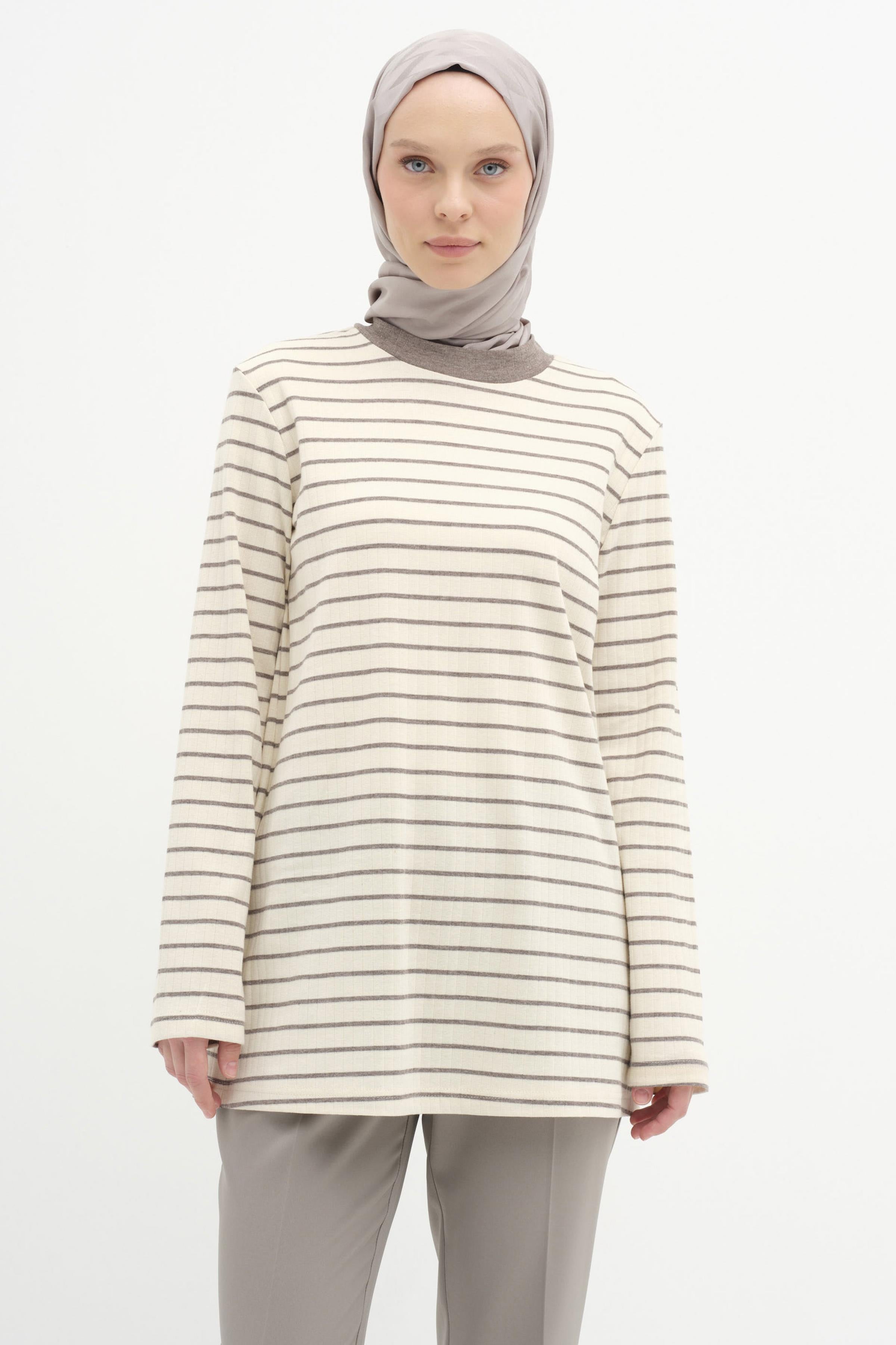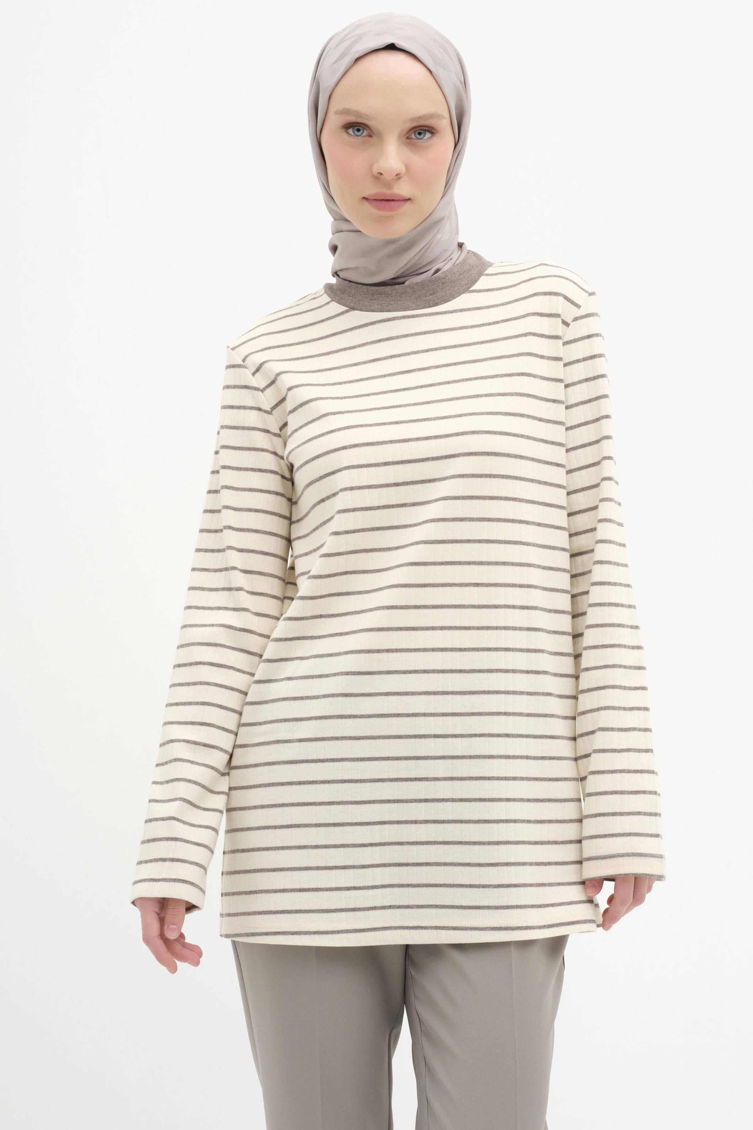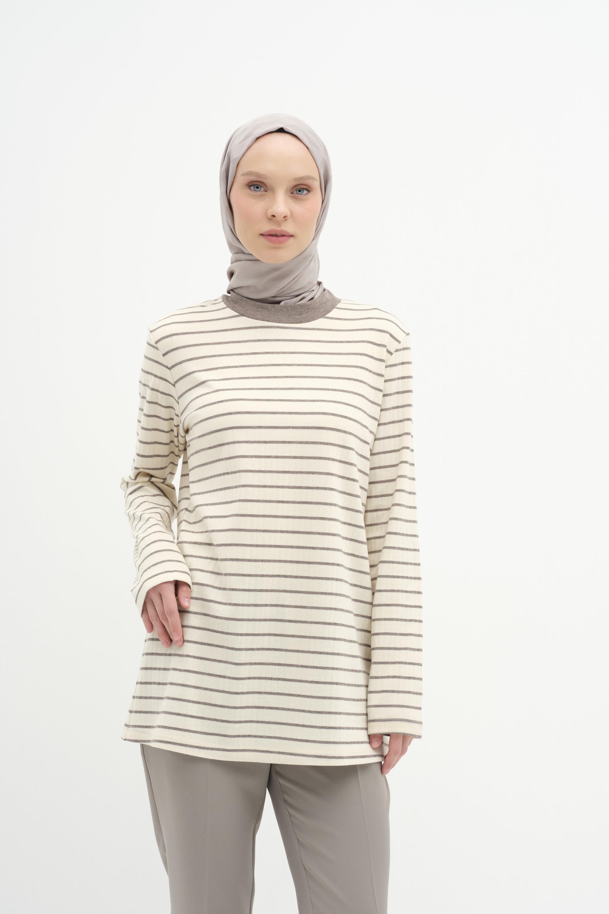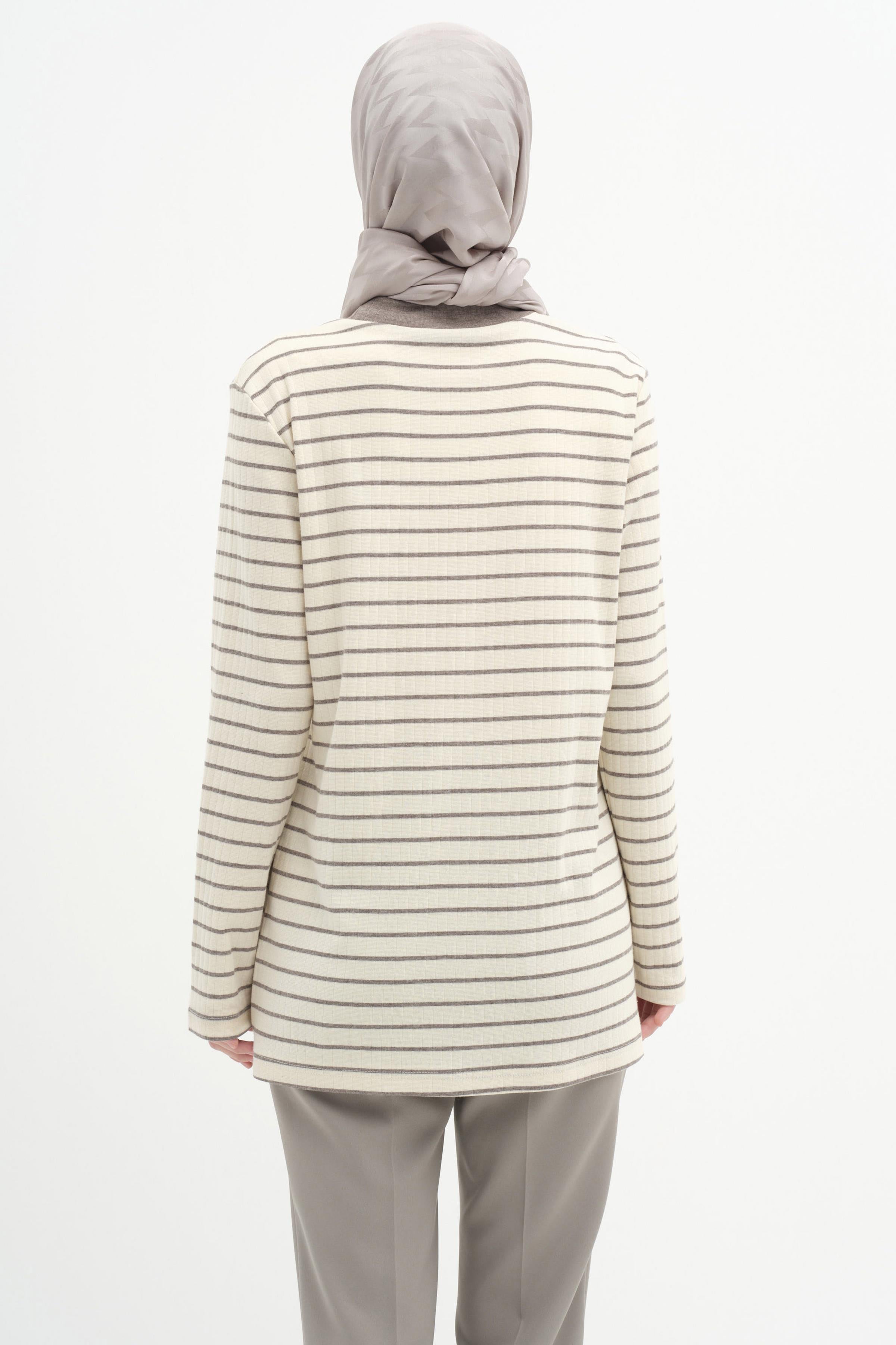 Çizgili Örme Bluz - Vizon