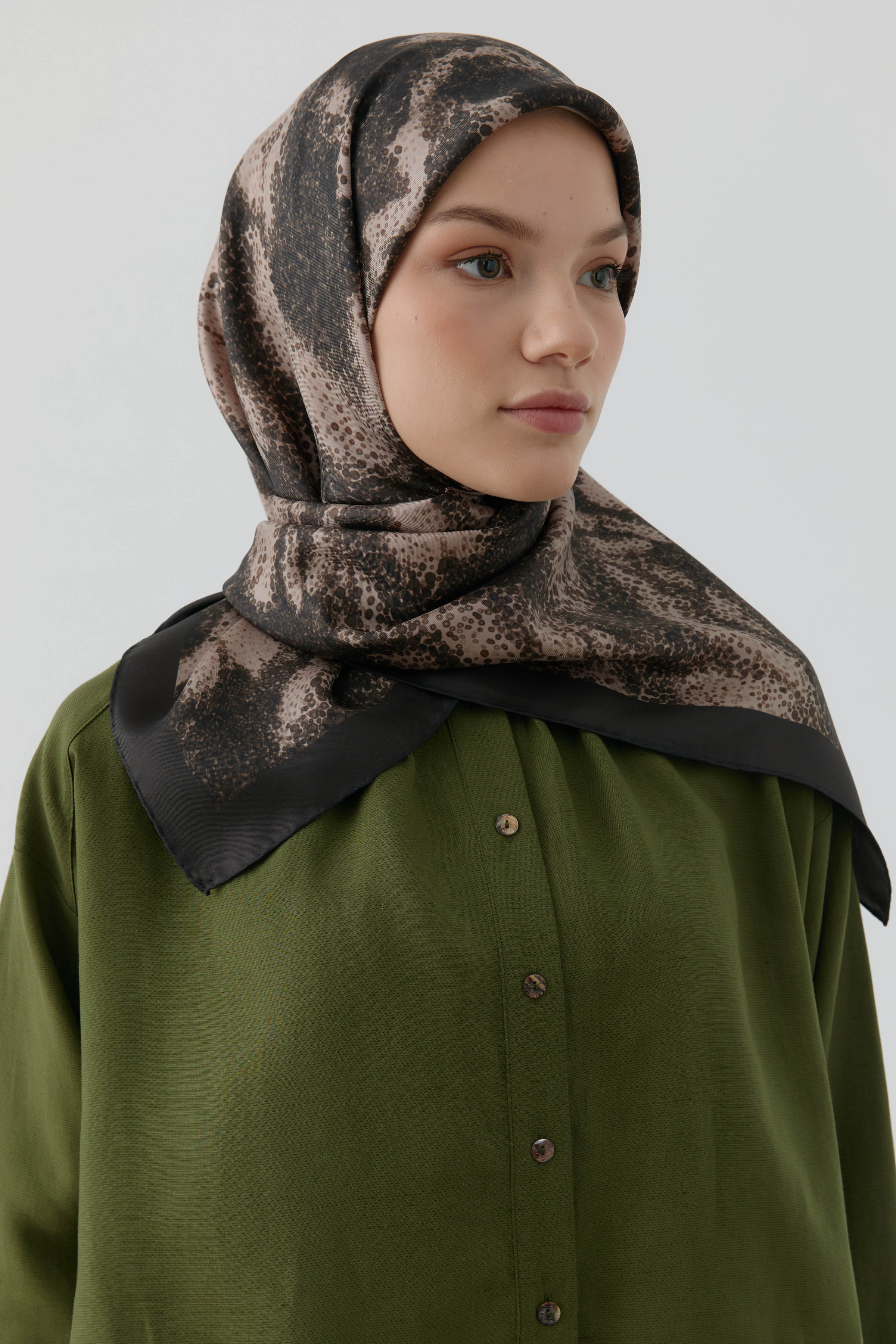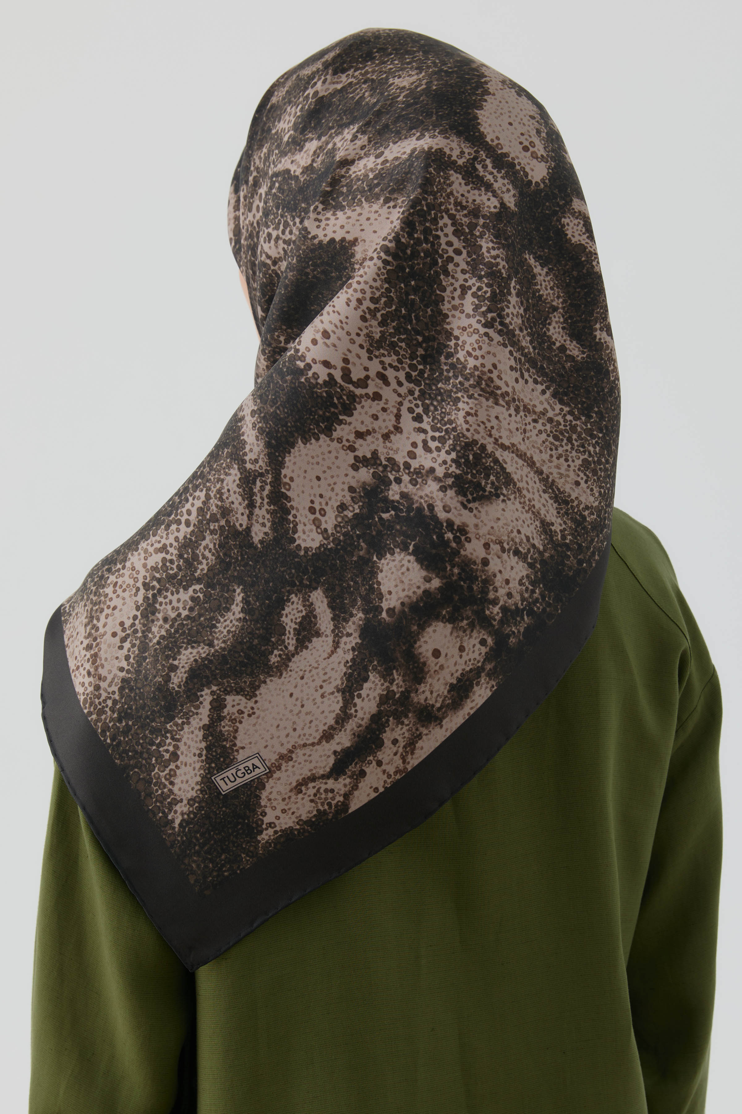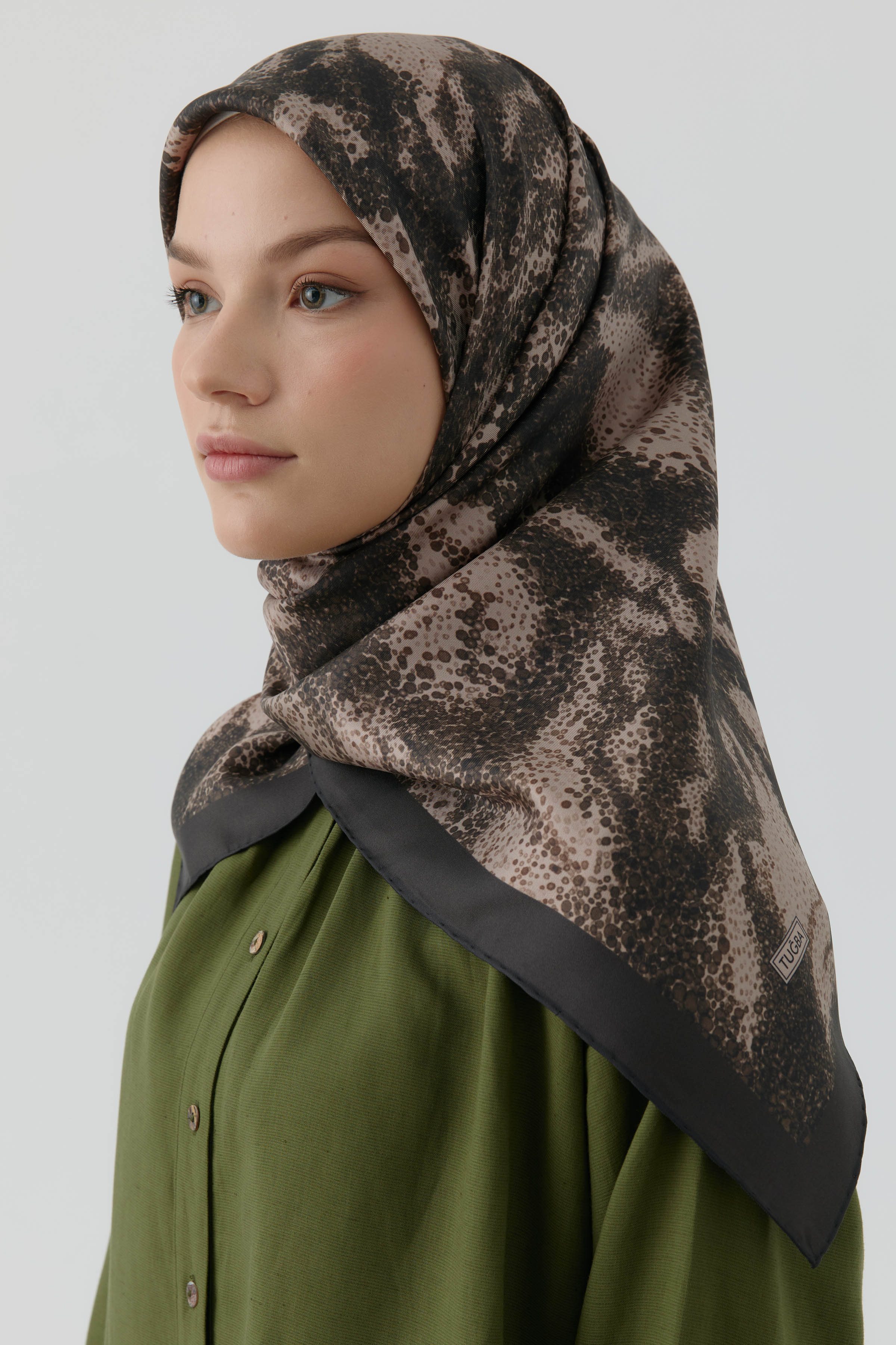 Lekesel puantiyeli twill ipek eşarp, modern desen anlayışını klasik zarafetle buluşturan şık bir parça.