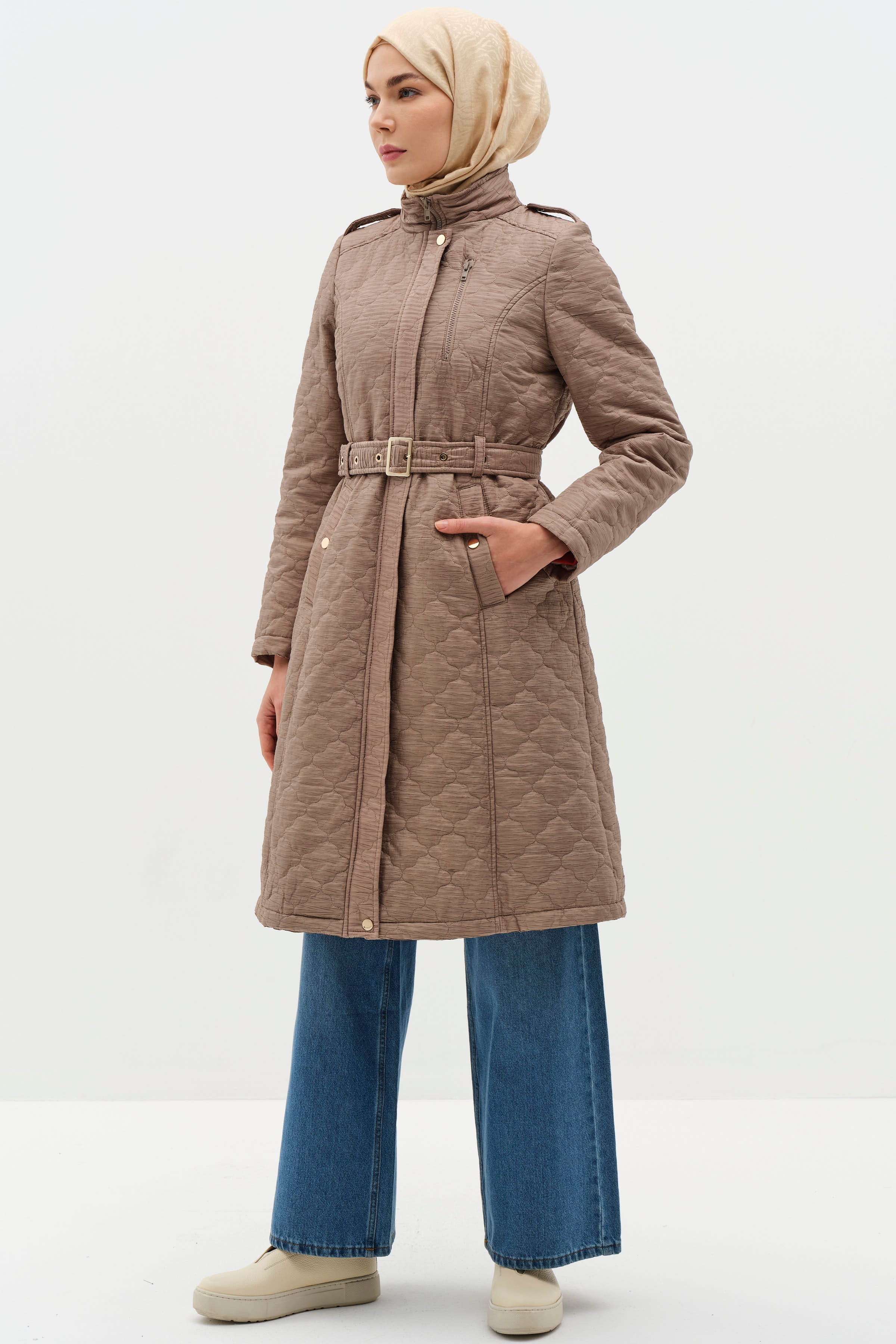 İnce kapitone dokusuyla hafiflik sunan bu kemerli kaban, şıklık ve işlevselliği bir araya getiriyor. Ayarlanabilir kemer detayı, zarif bir siluet oluştururken vücut hatlarınızı ön plana çıkarır.