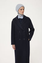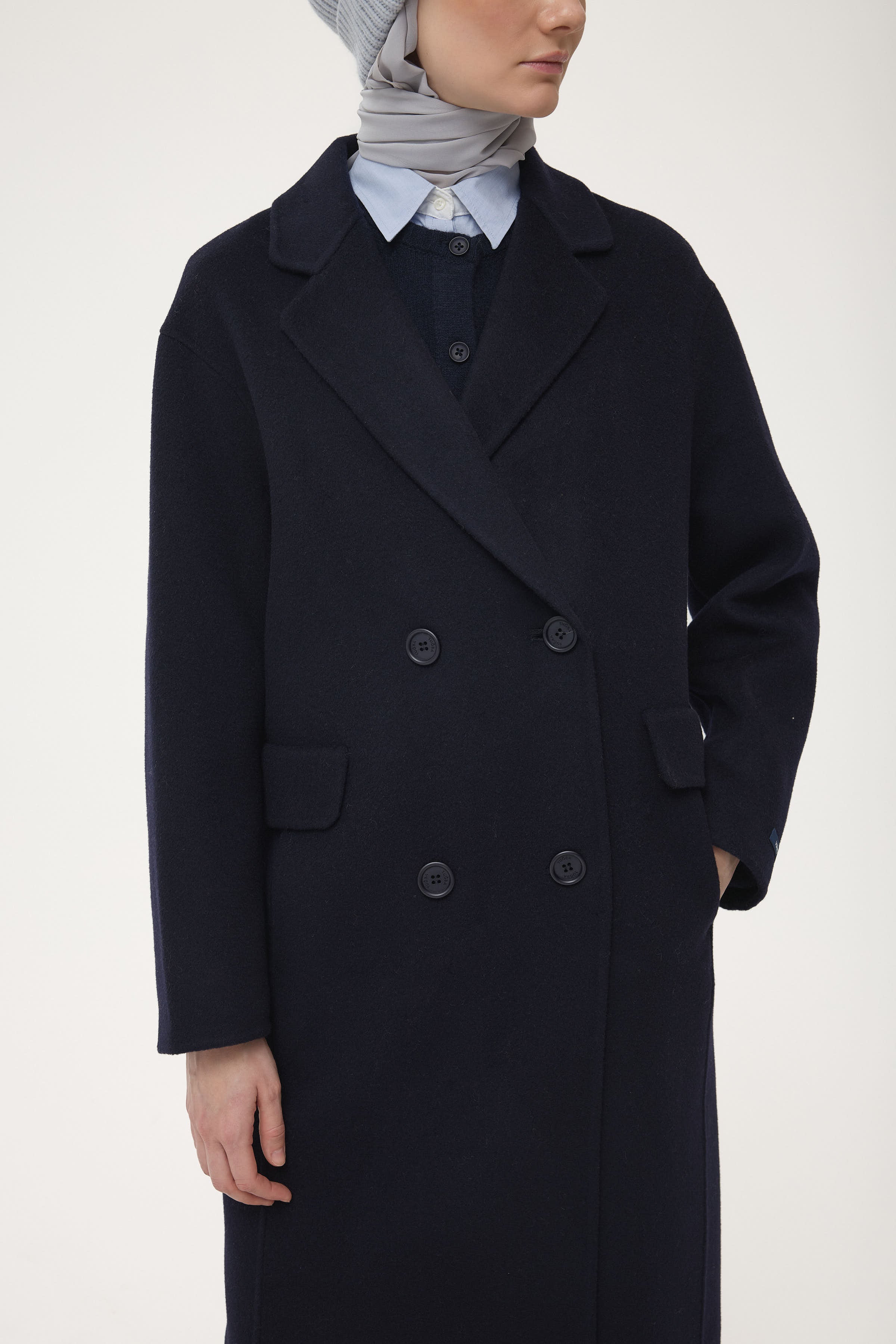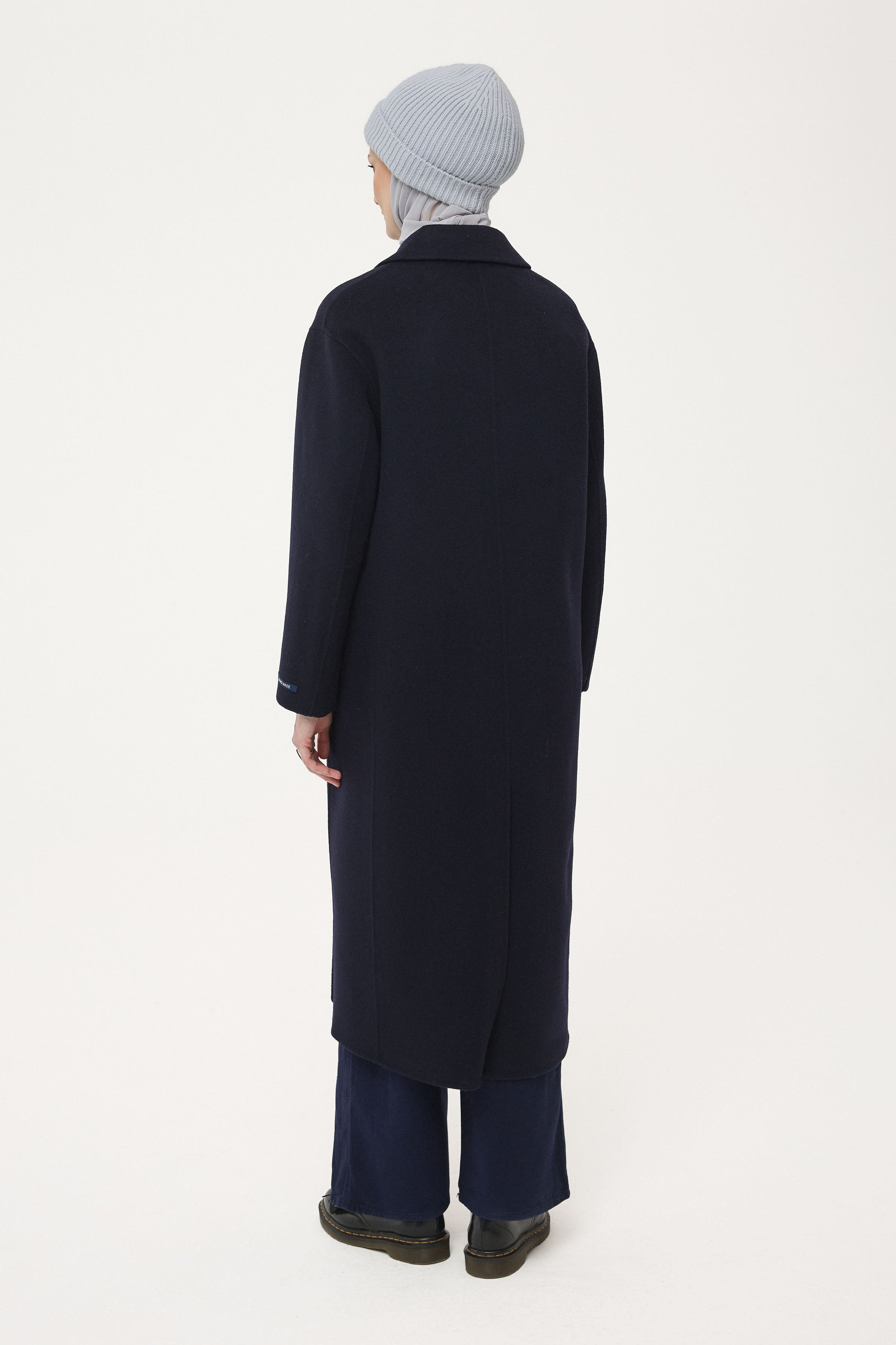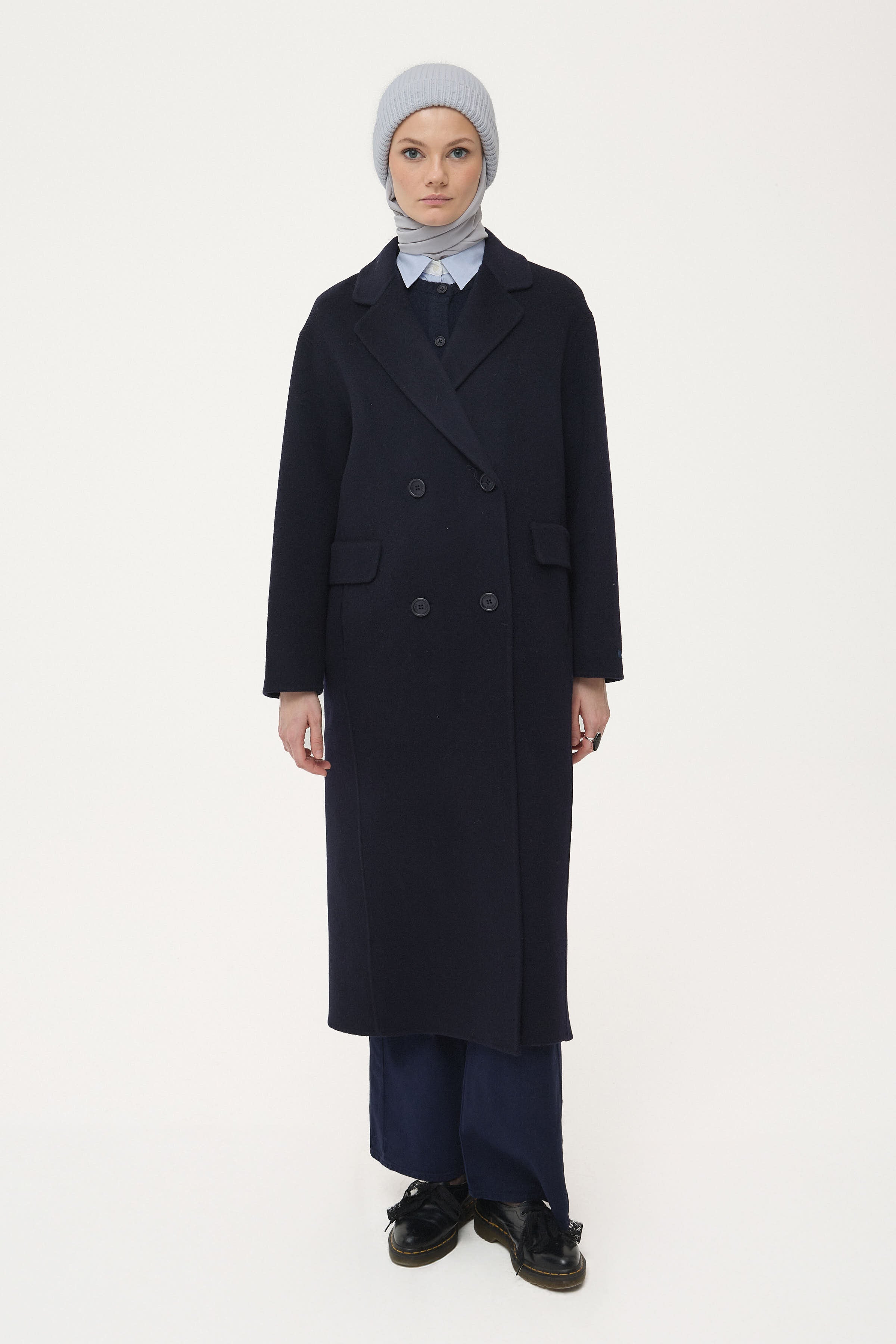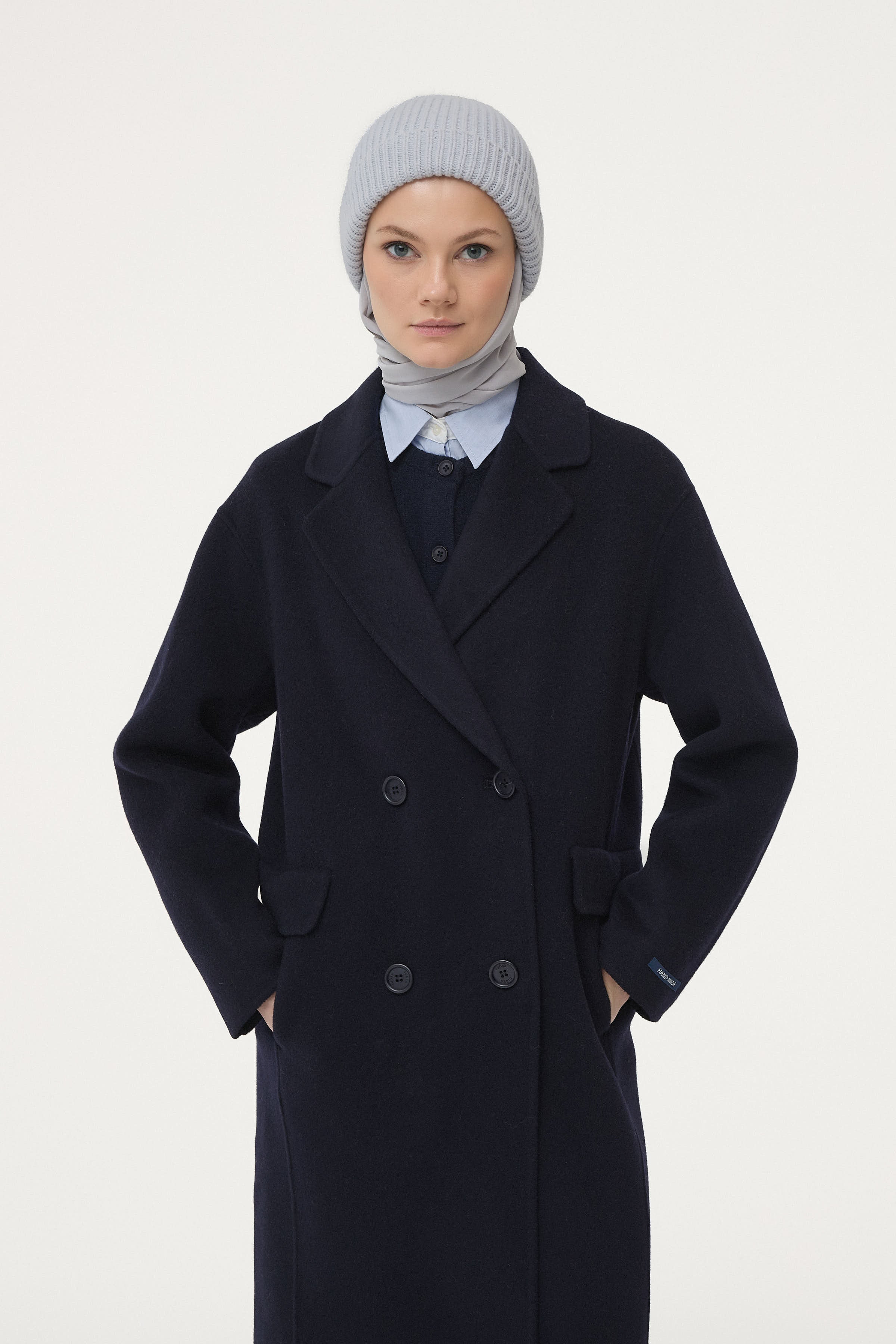 El Yapımı %100 Yün Kruvaze Kaban - Lacivert
