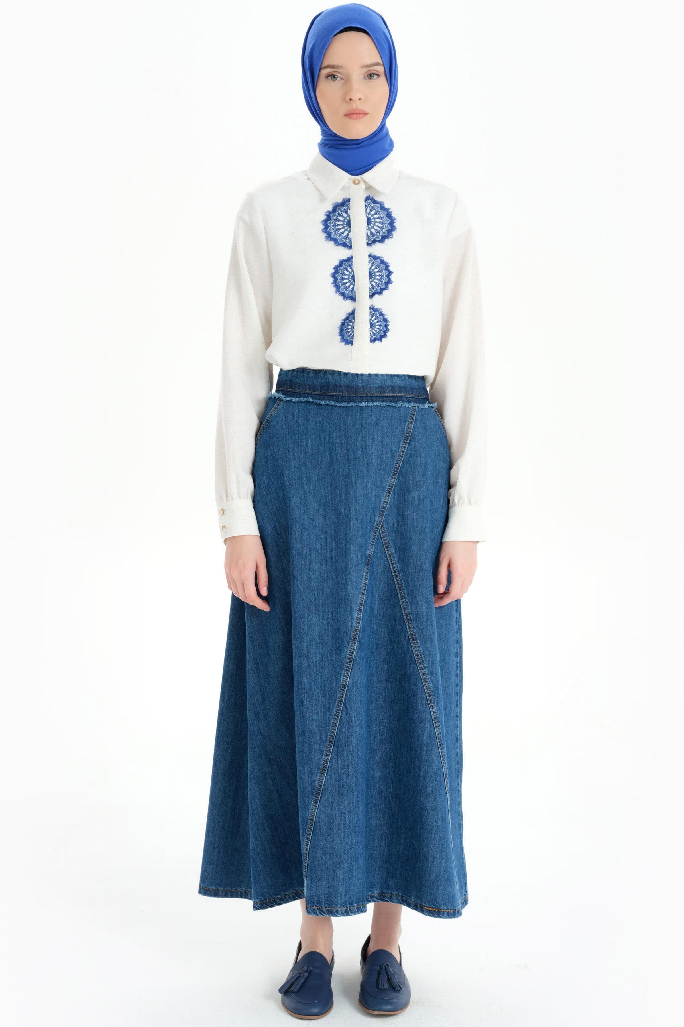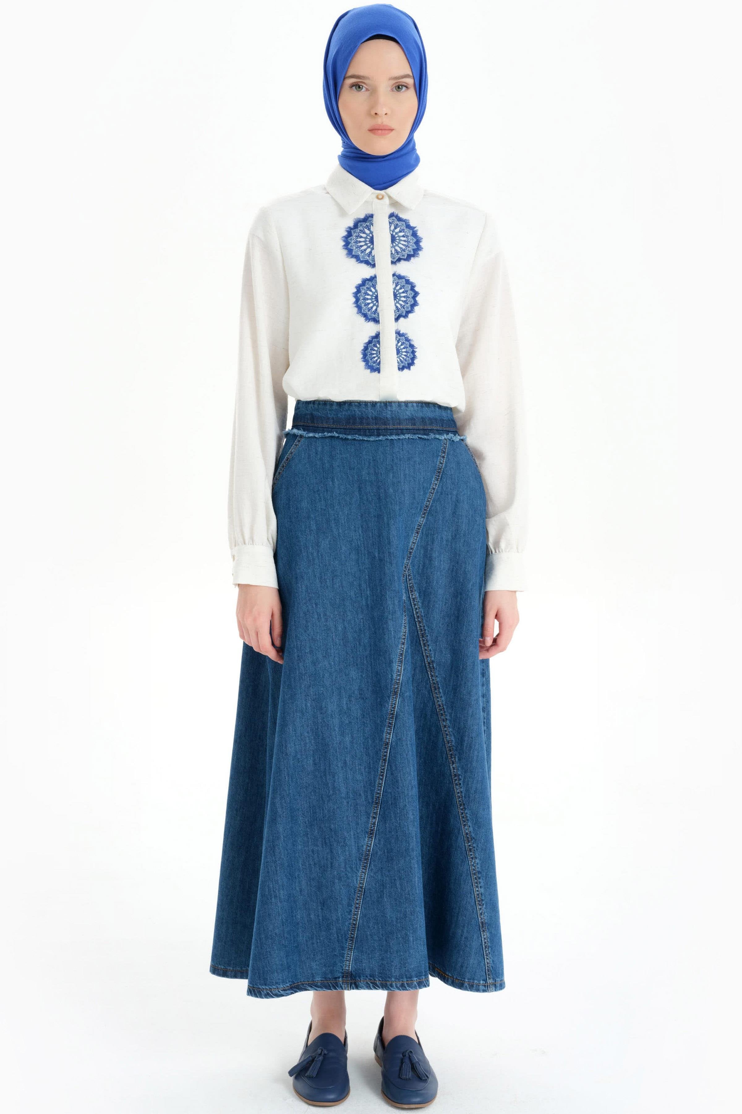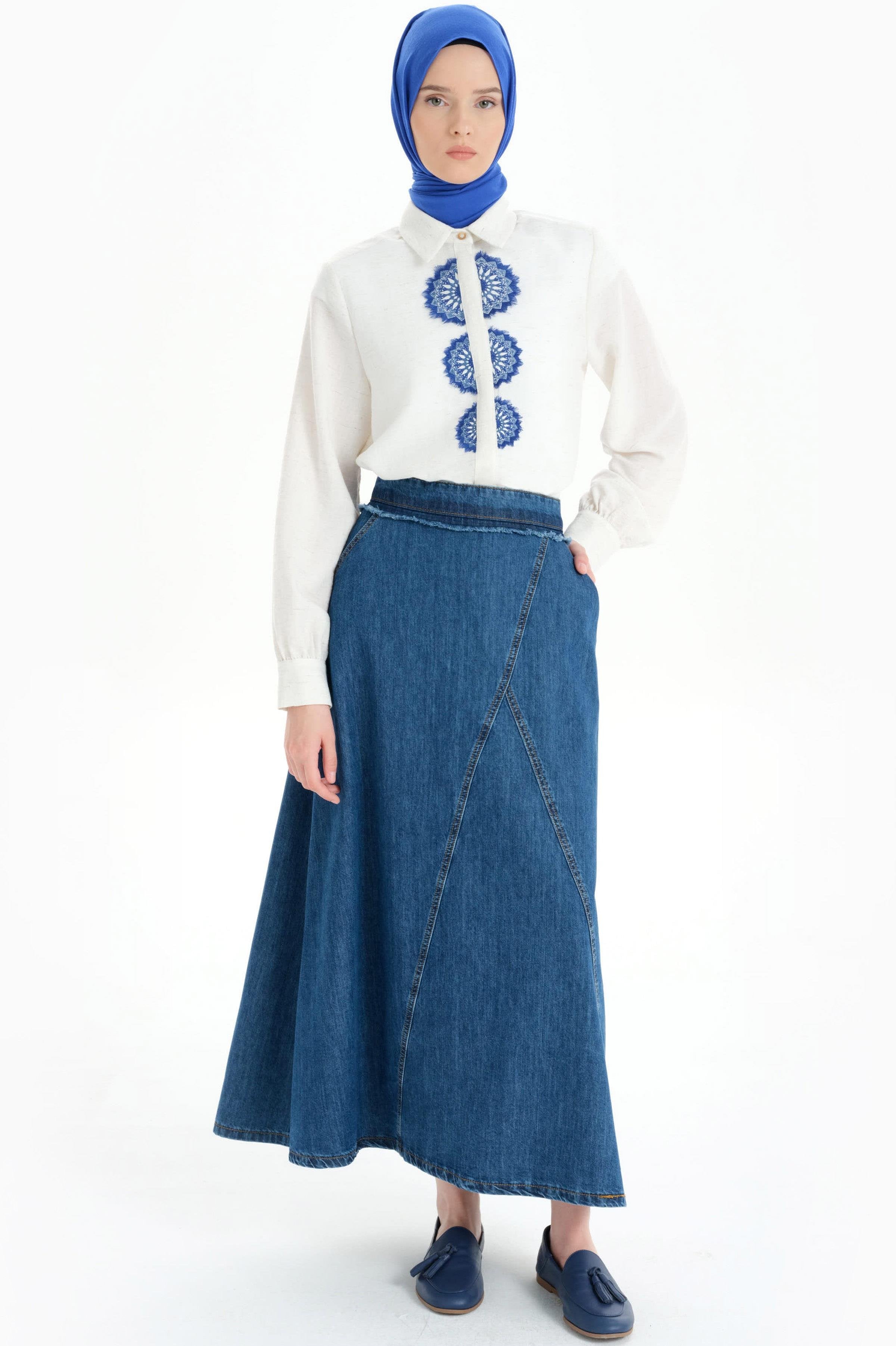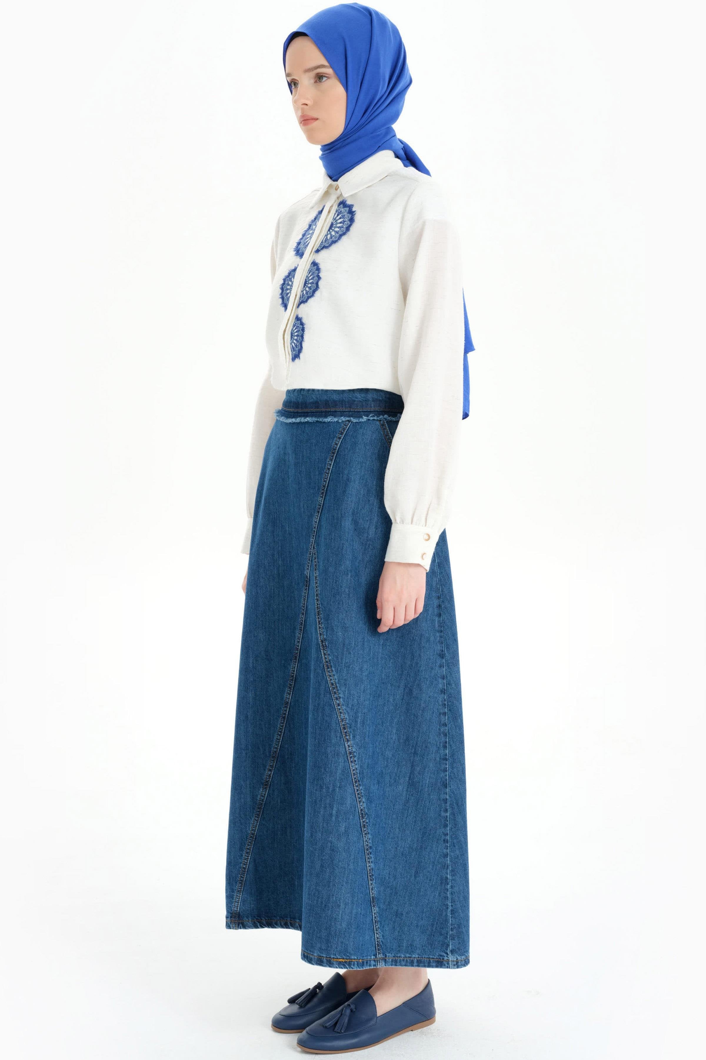 Cepli denim çan etek, klasik ve modern tasarımı bir araya getiriyor. Çan kesimi sayesinde rahat ve şık bir siluet sunarken, denim kumaşı ile her mevsim gardırobunuzun vazgeçilmez parçası olacak.