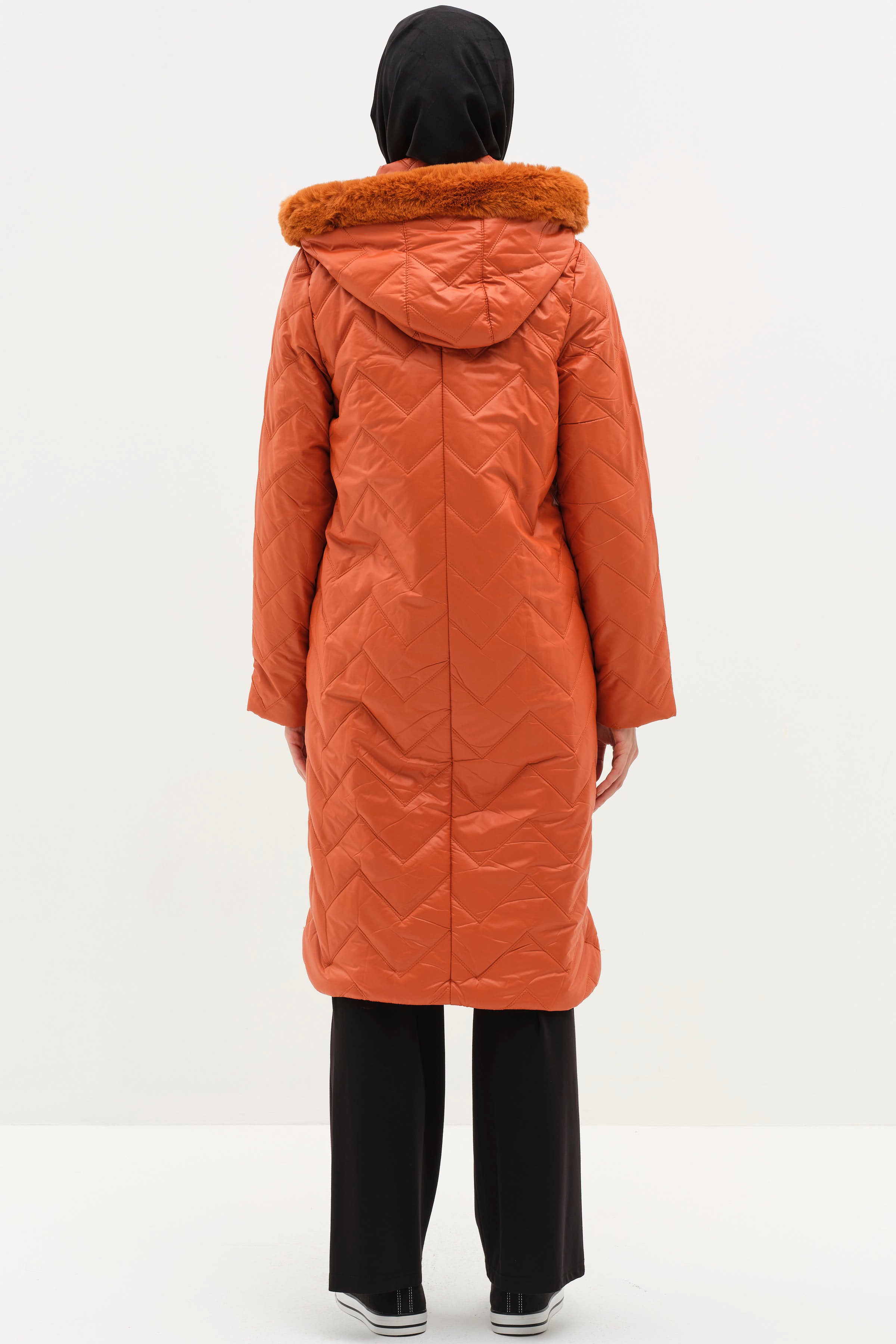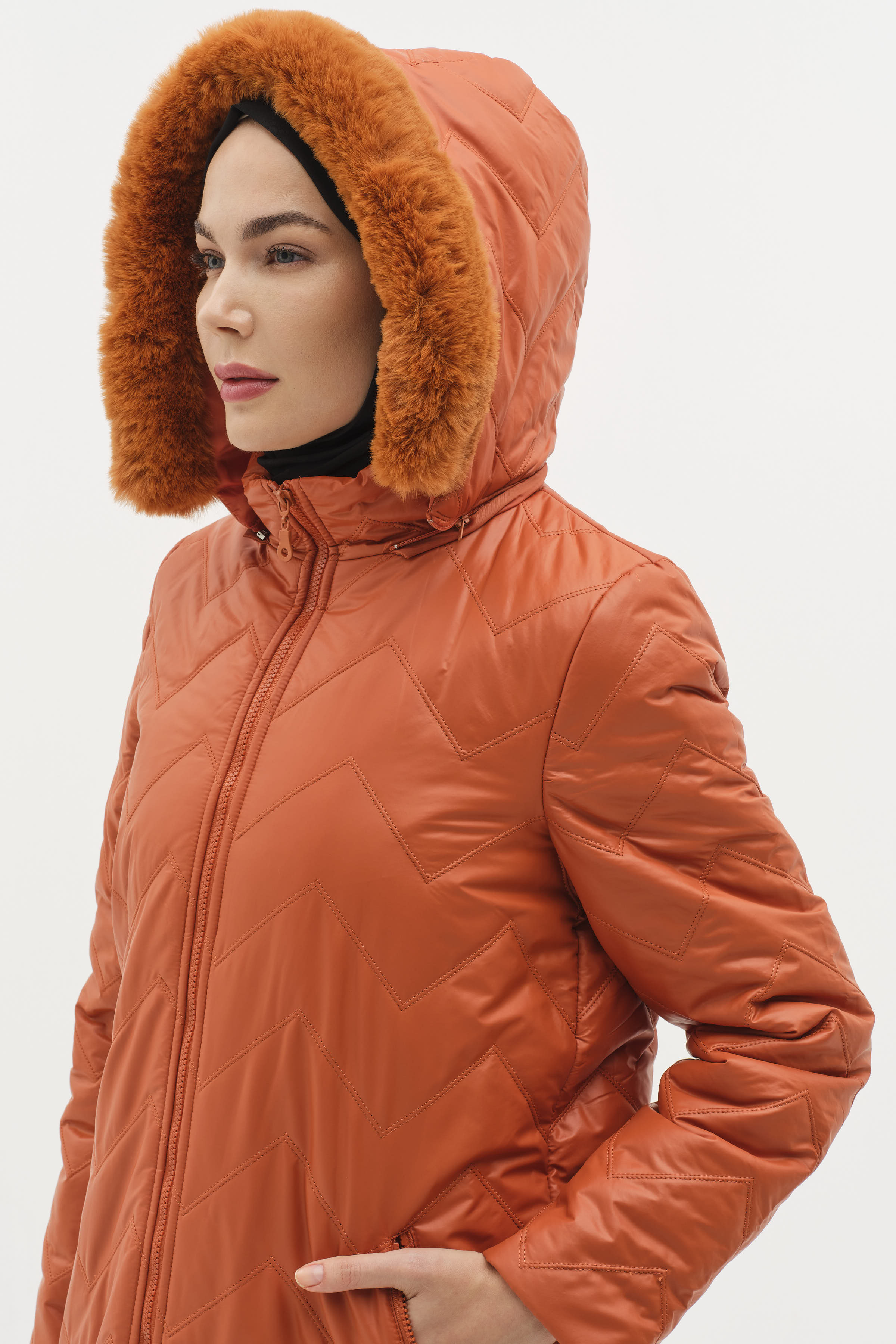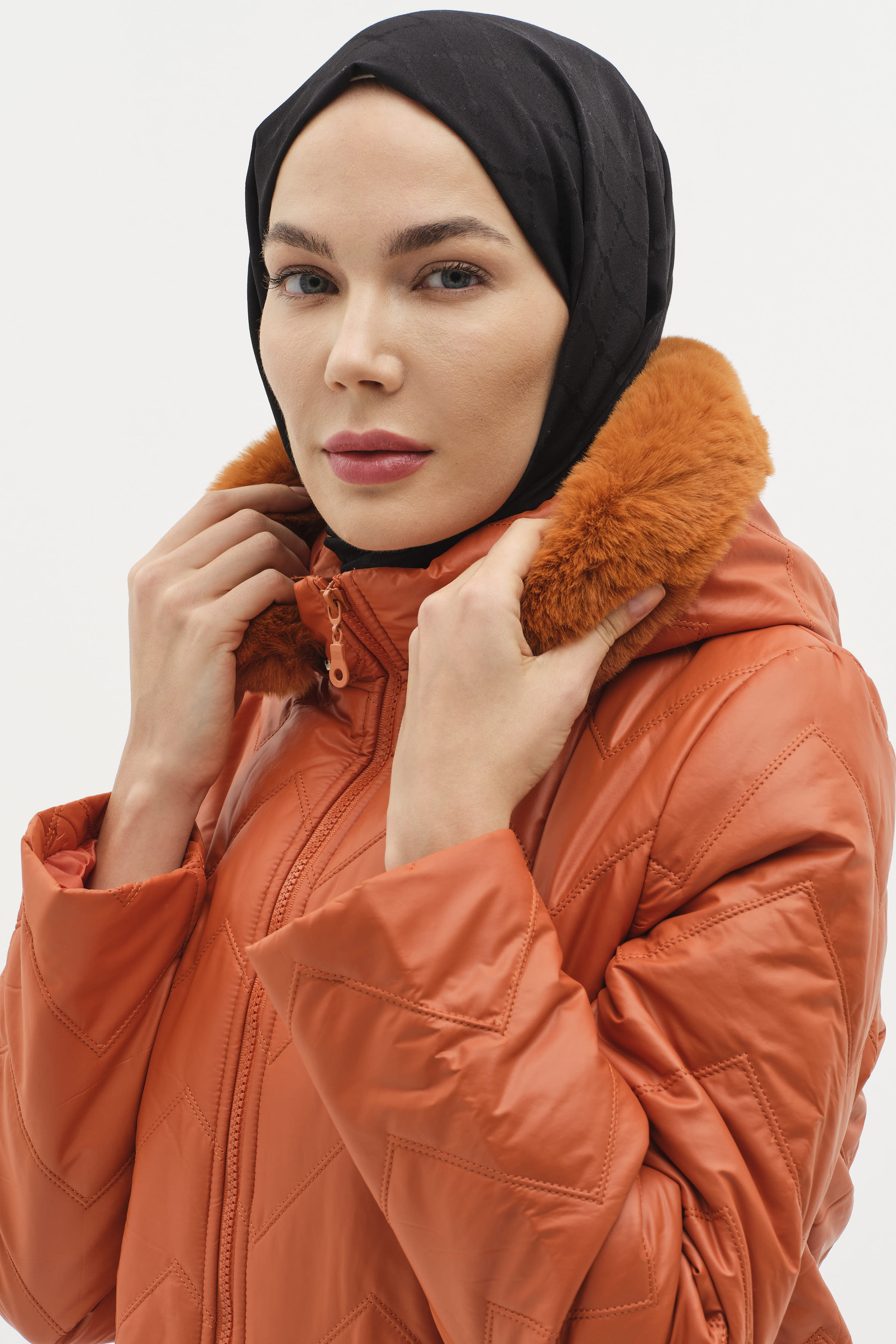 Kapüşonu Kürklü Kapitone Kaban - Oranj