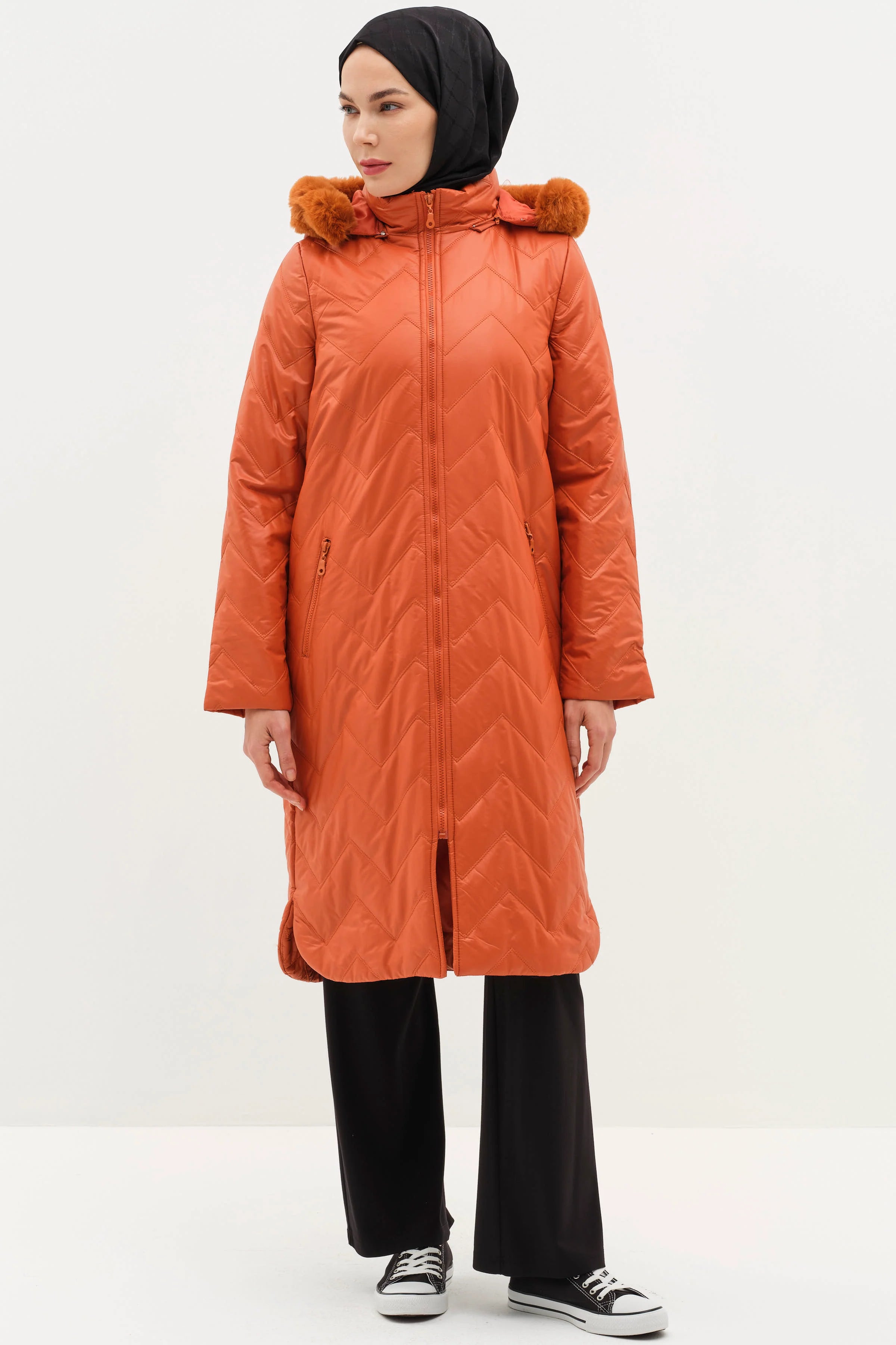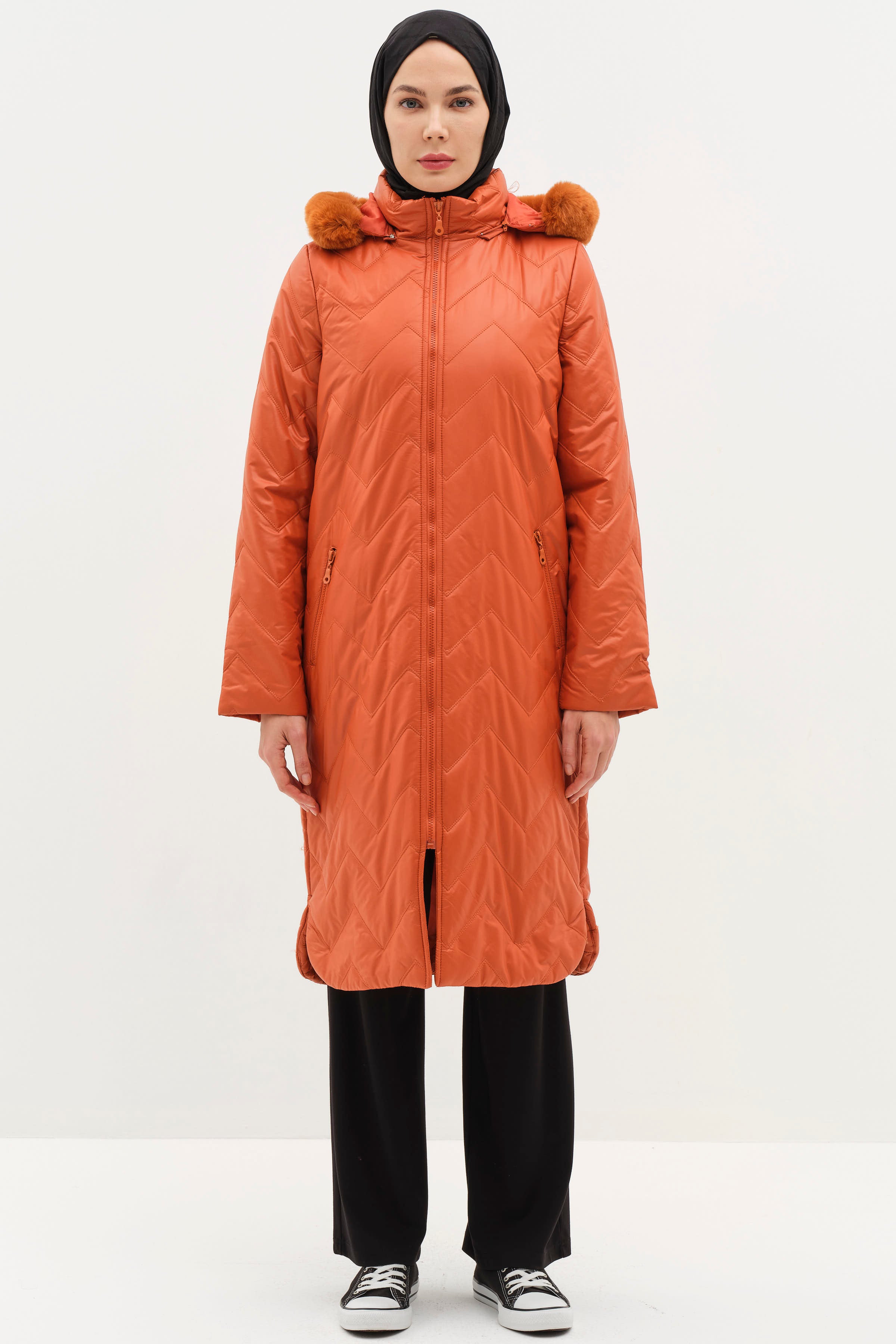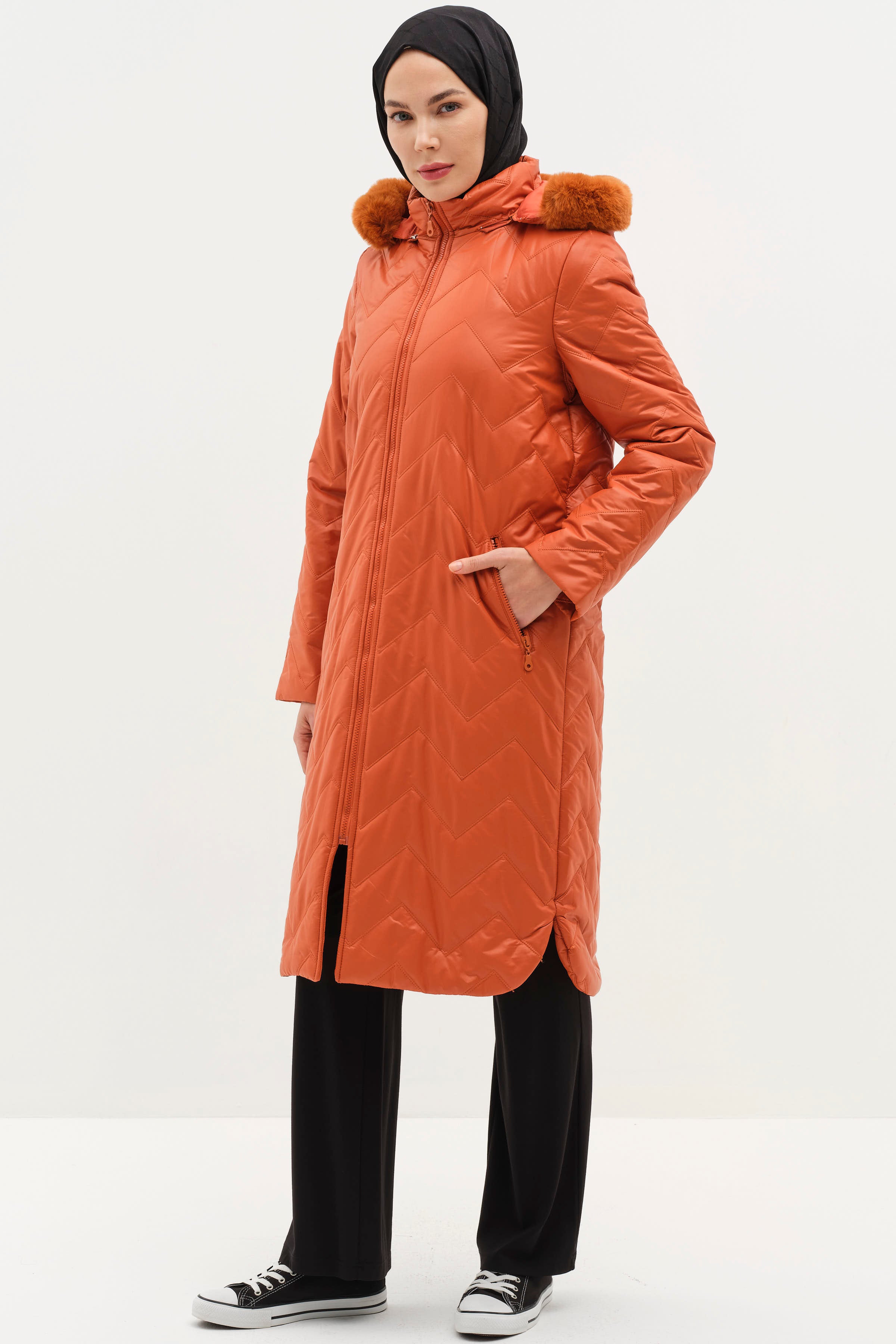 Kapüşonu Kürklü Kapitone Kaban - Oranj