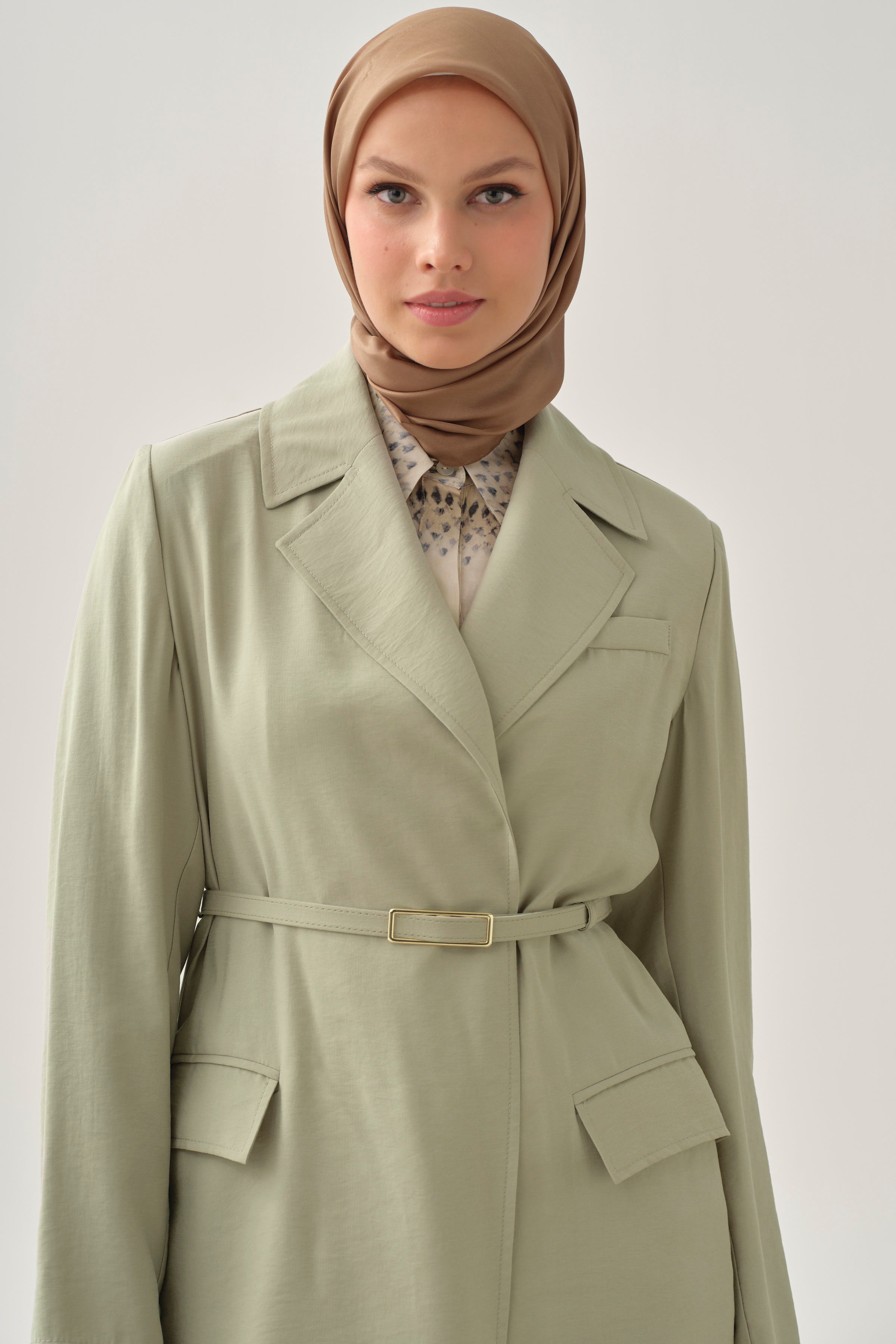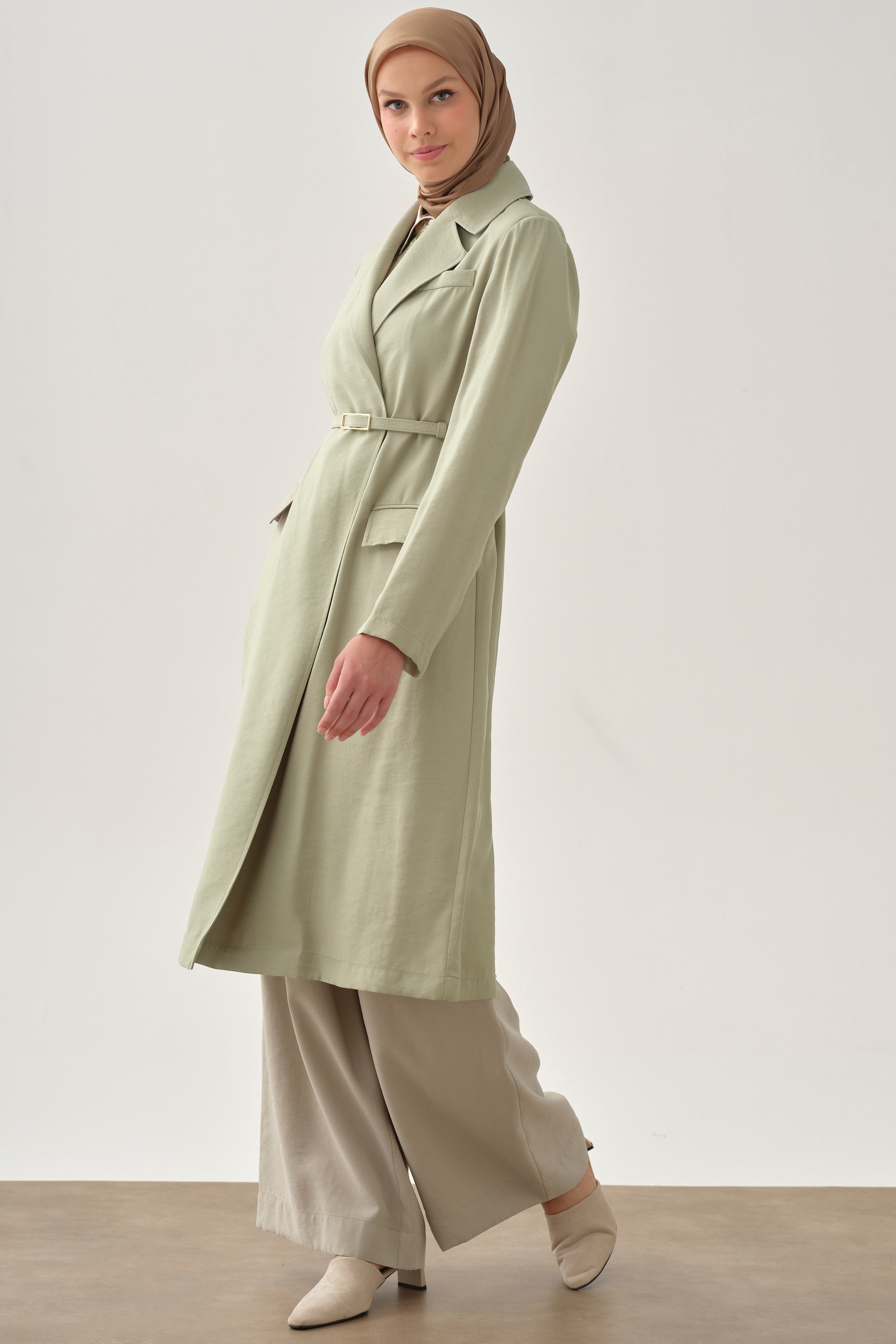 Belindeki kemer detayıyla silueti zarifçe vurgulayan bu uzun ceket, sade tasarımıyla şıklığı öne çıkarır. Hem klasik hem modern kombinlerle kolayca uyum sağlar. Mevsim geçişlerinde stilinizi tamamlayan güçlü bir parçadır.
