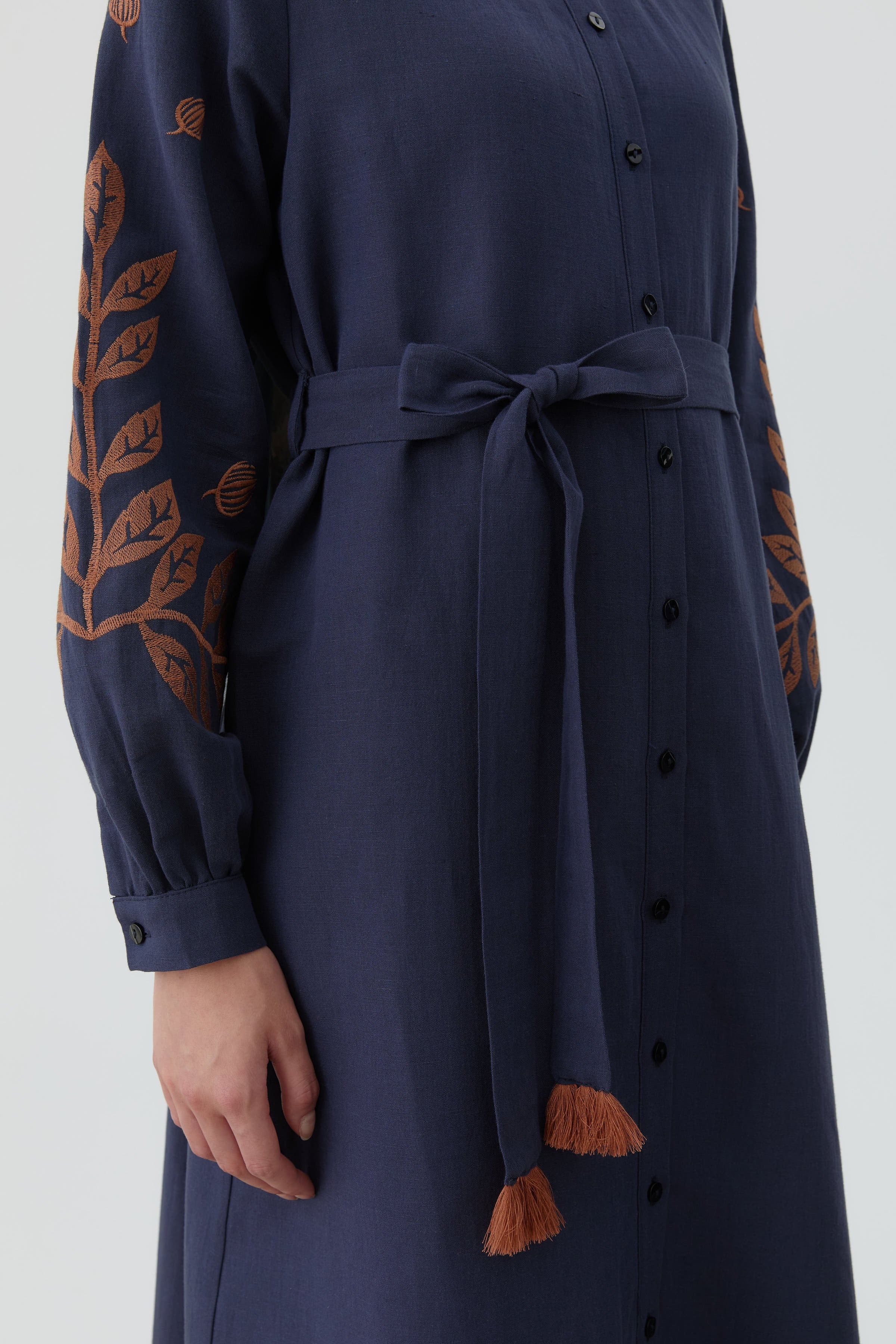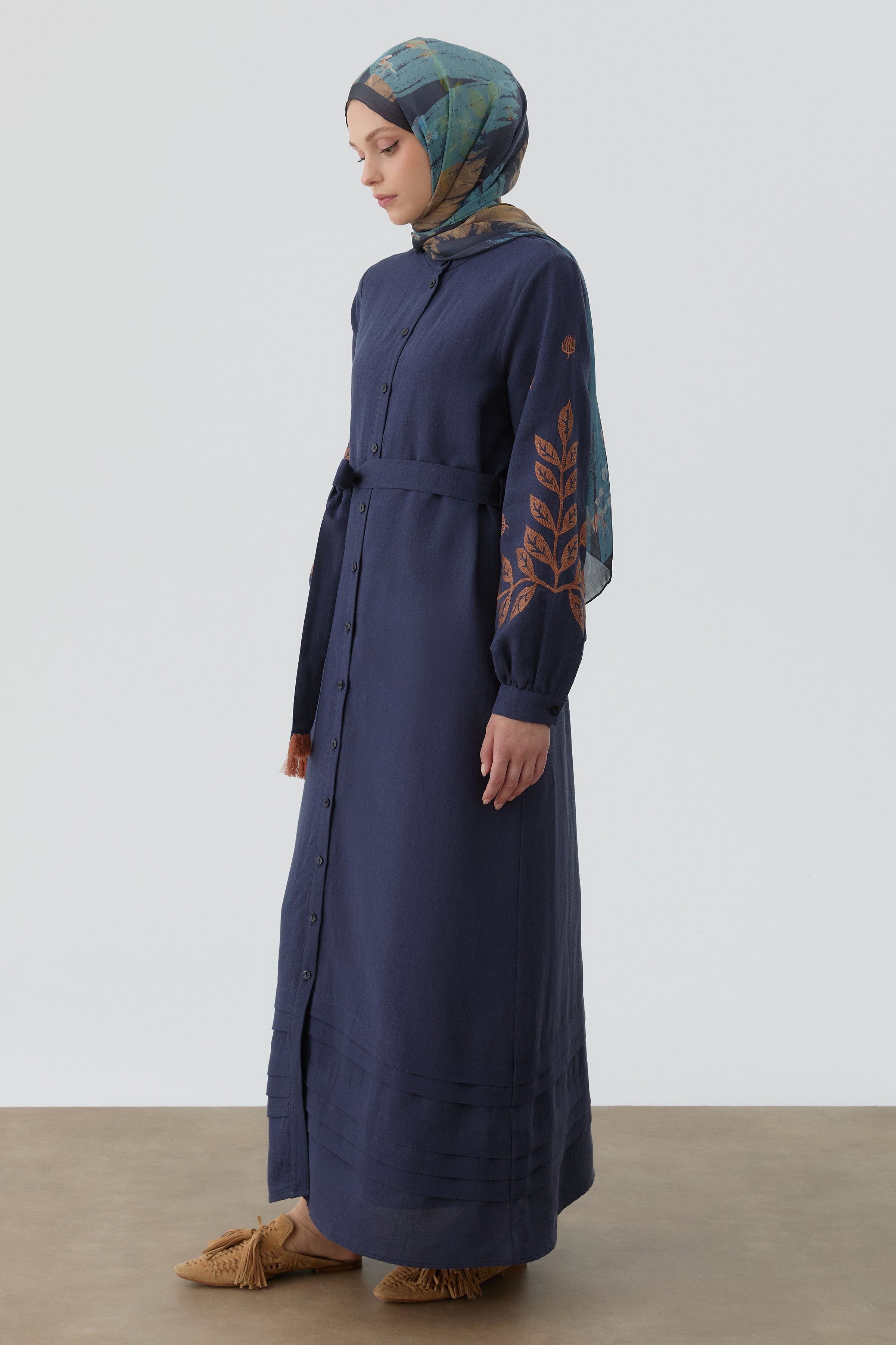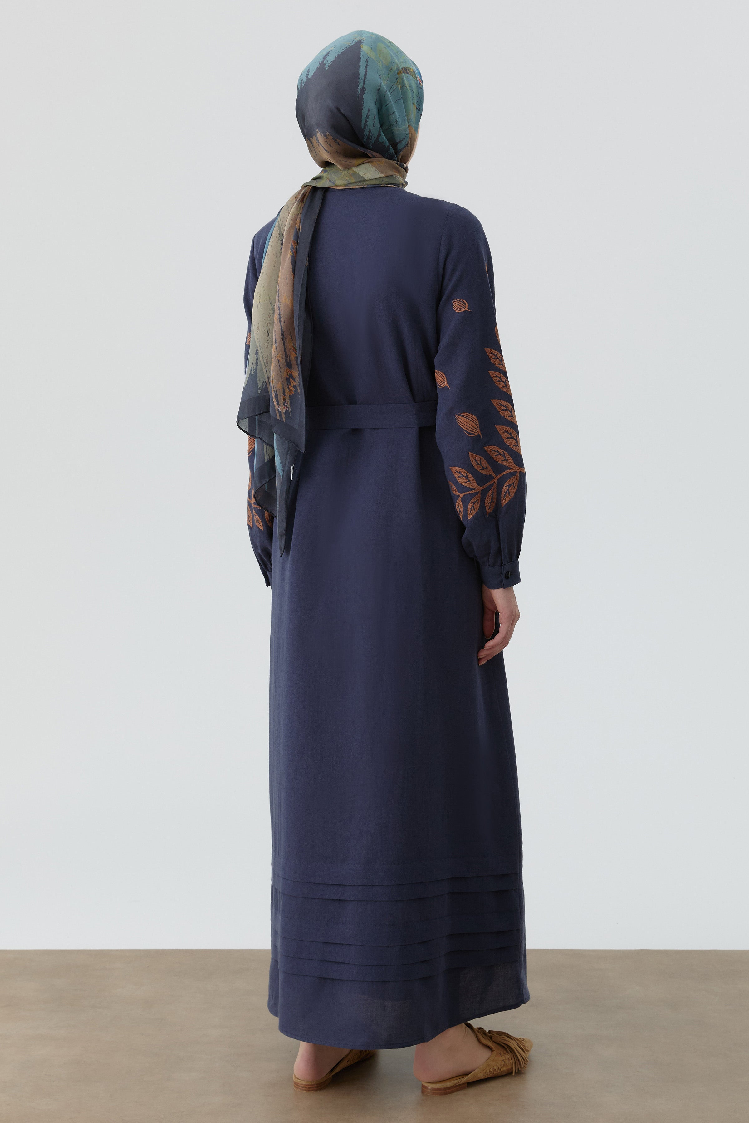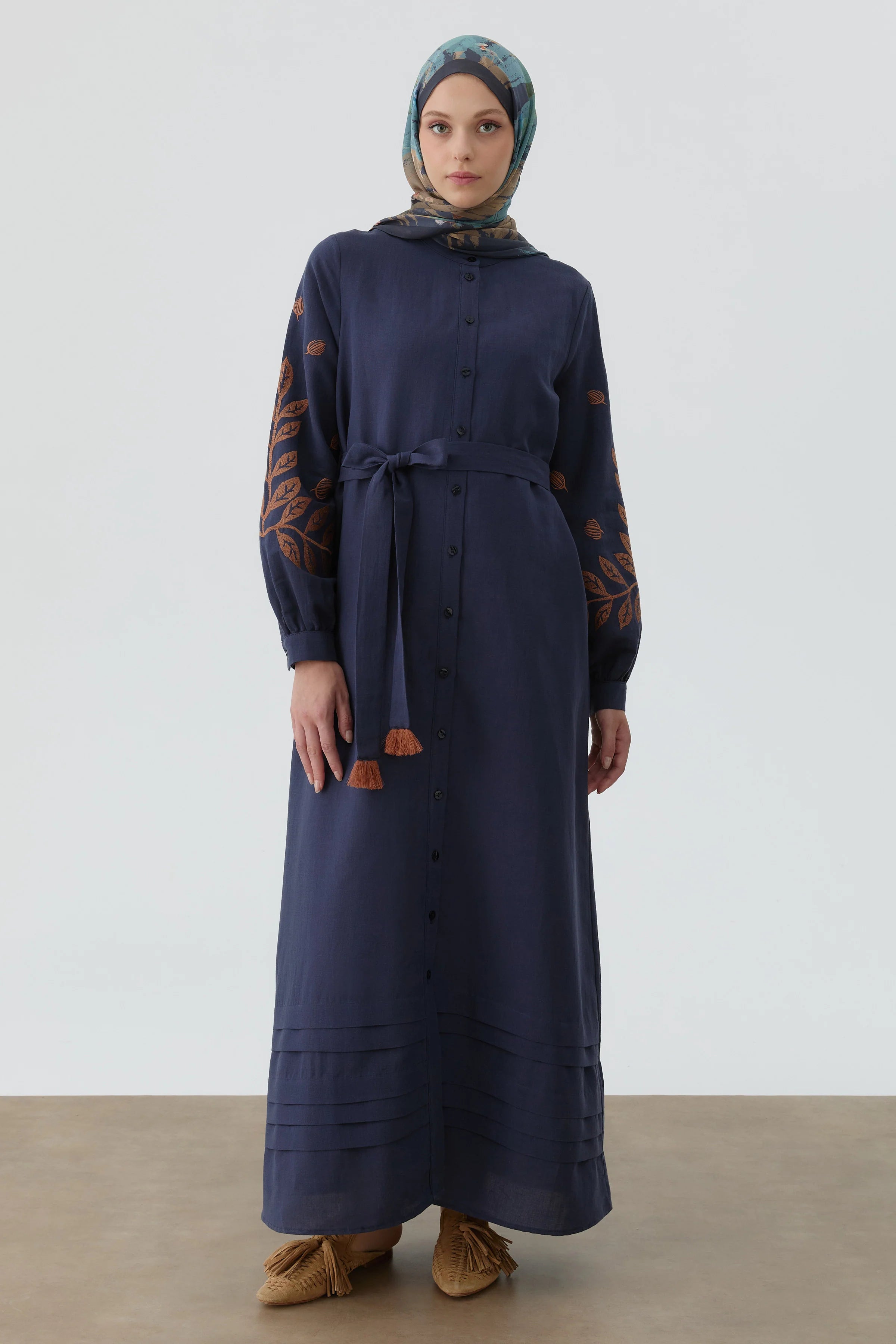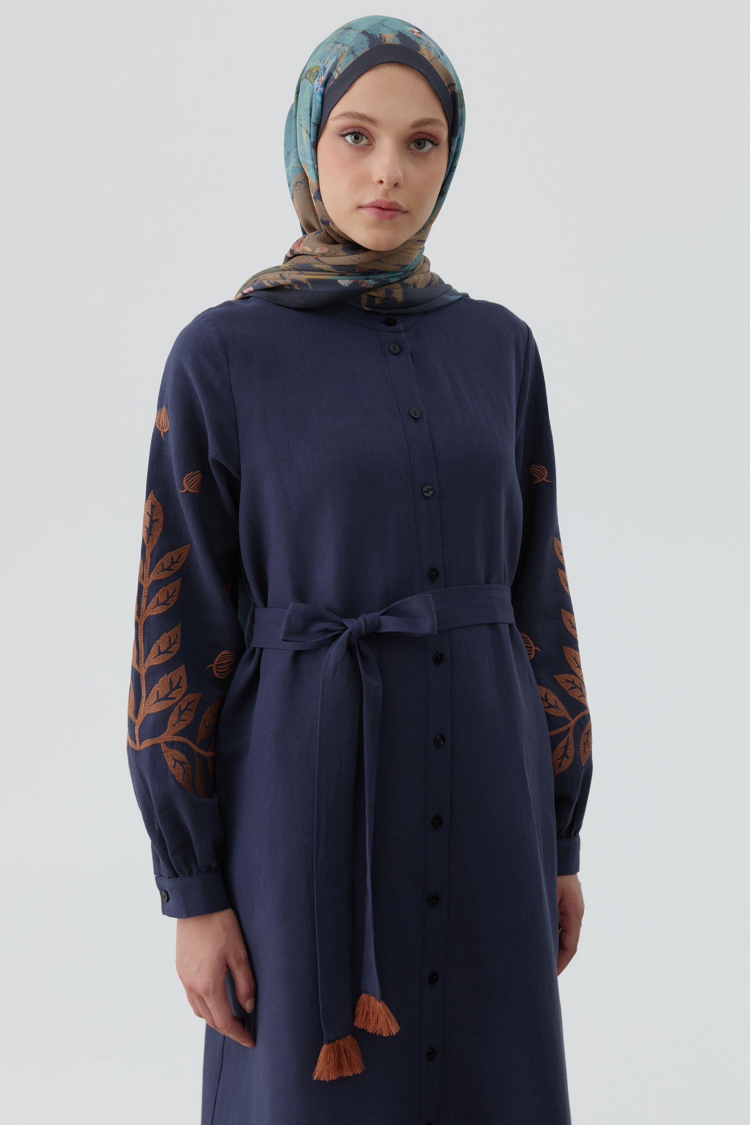 Minimal tasarımını kol bölümündeki ince nakış işlemeleriyle zenginleştiren bu elbise, hem klasik hem romantik bir stil sunar.